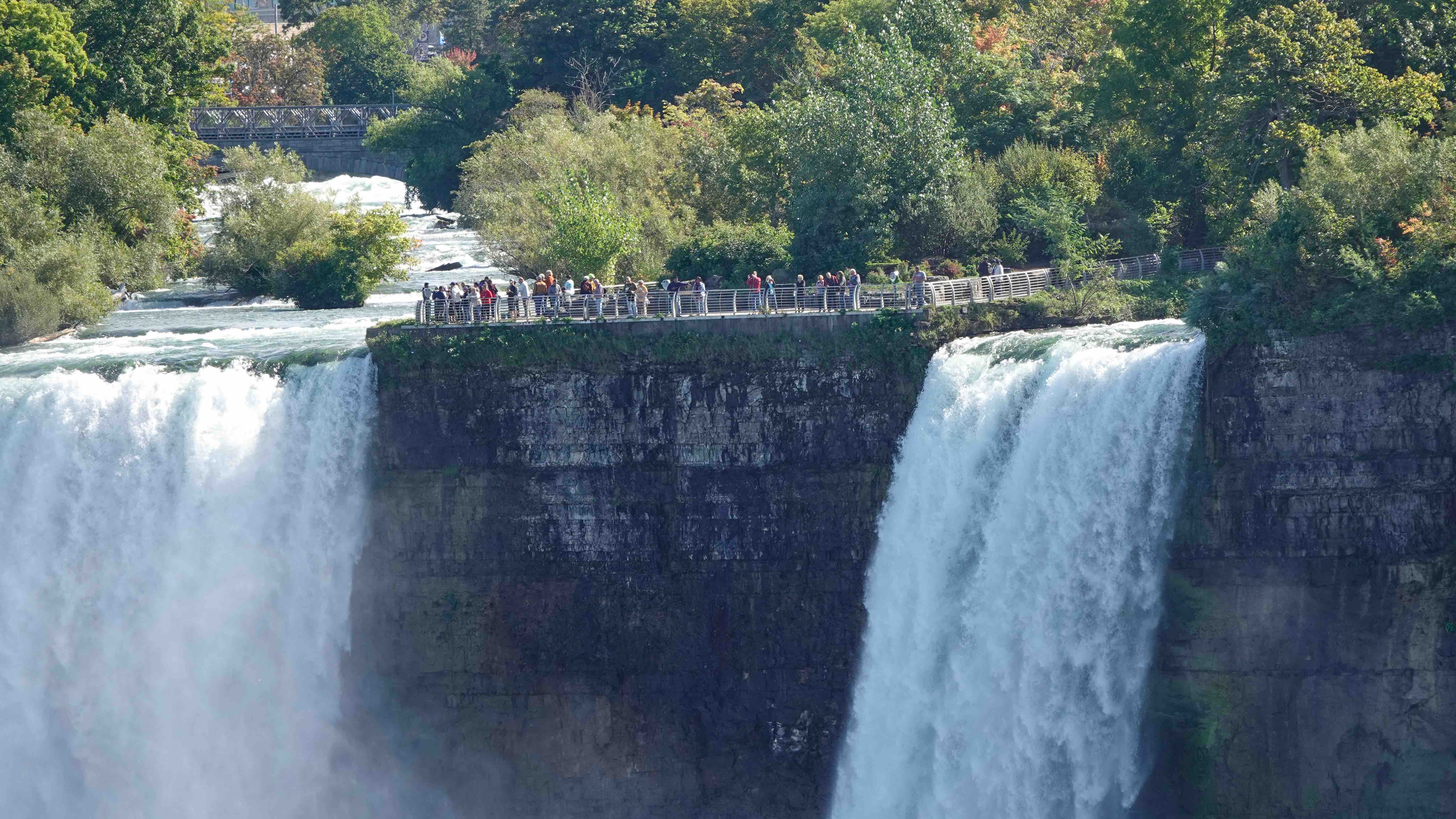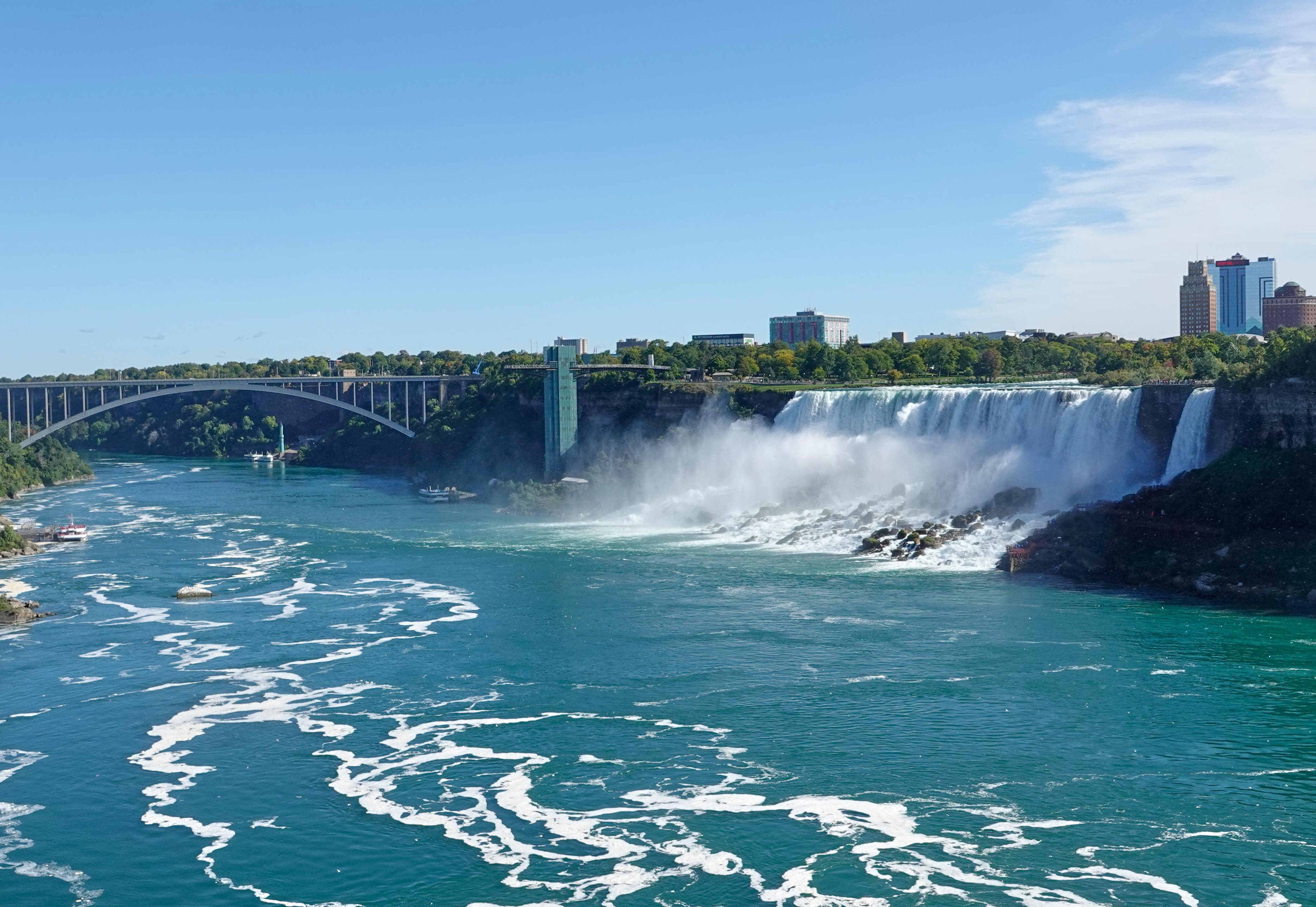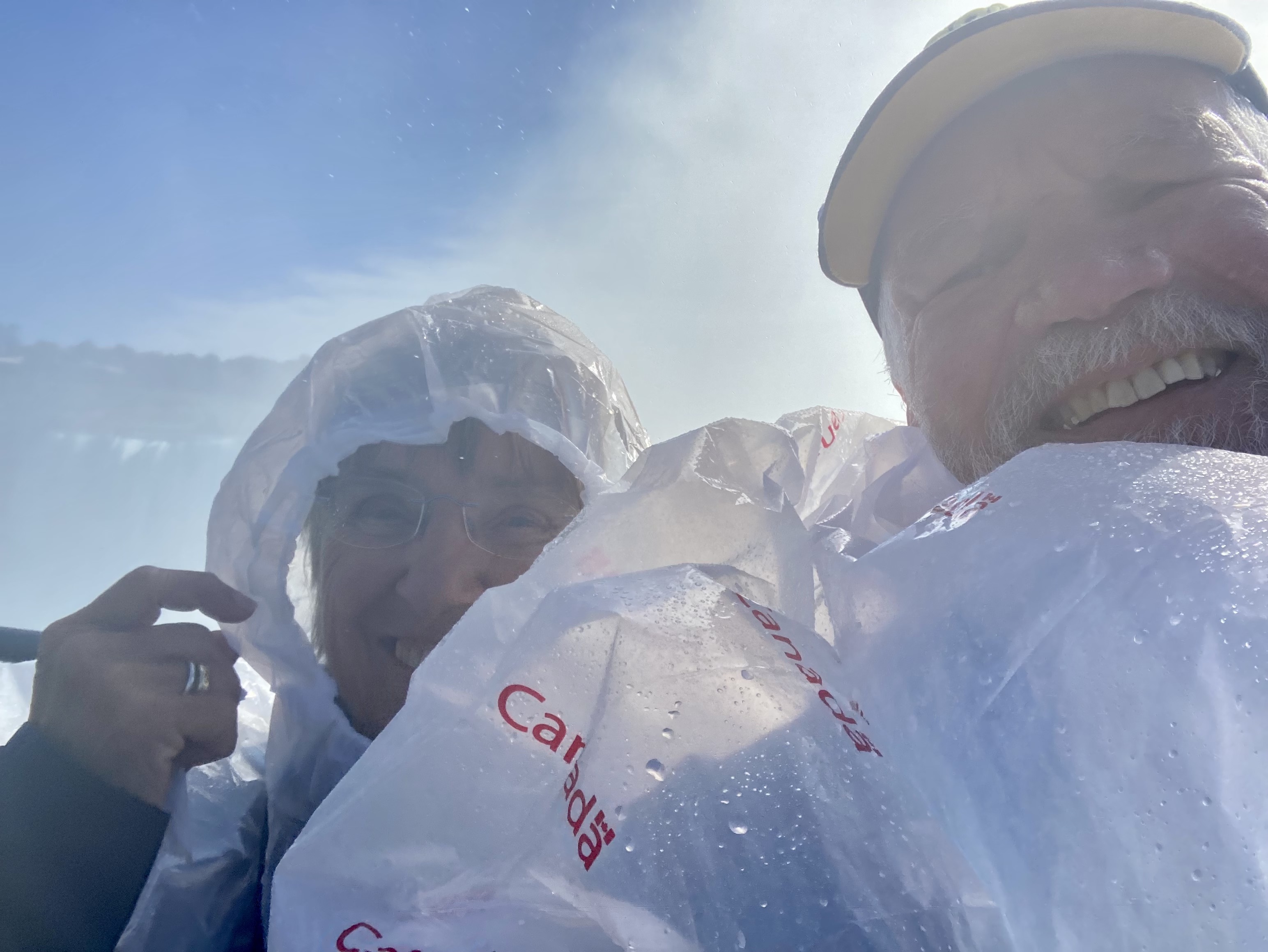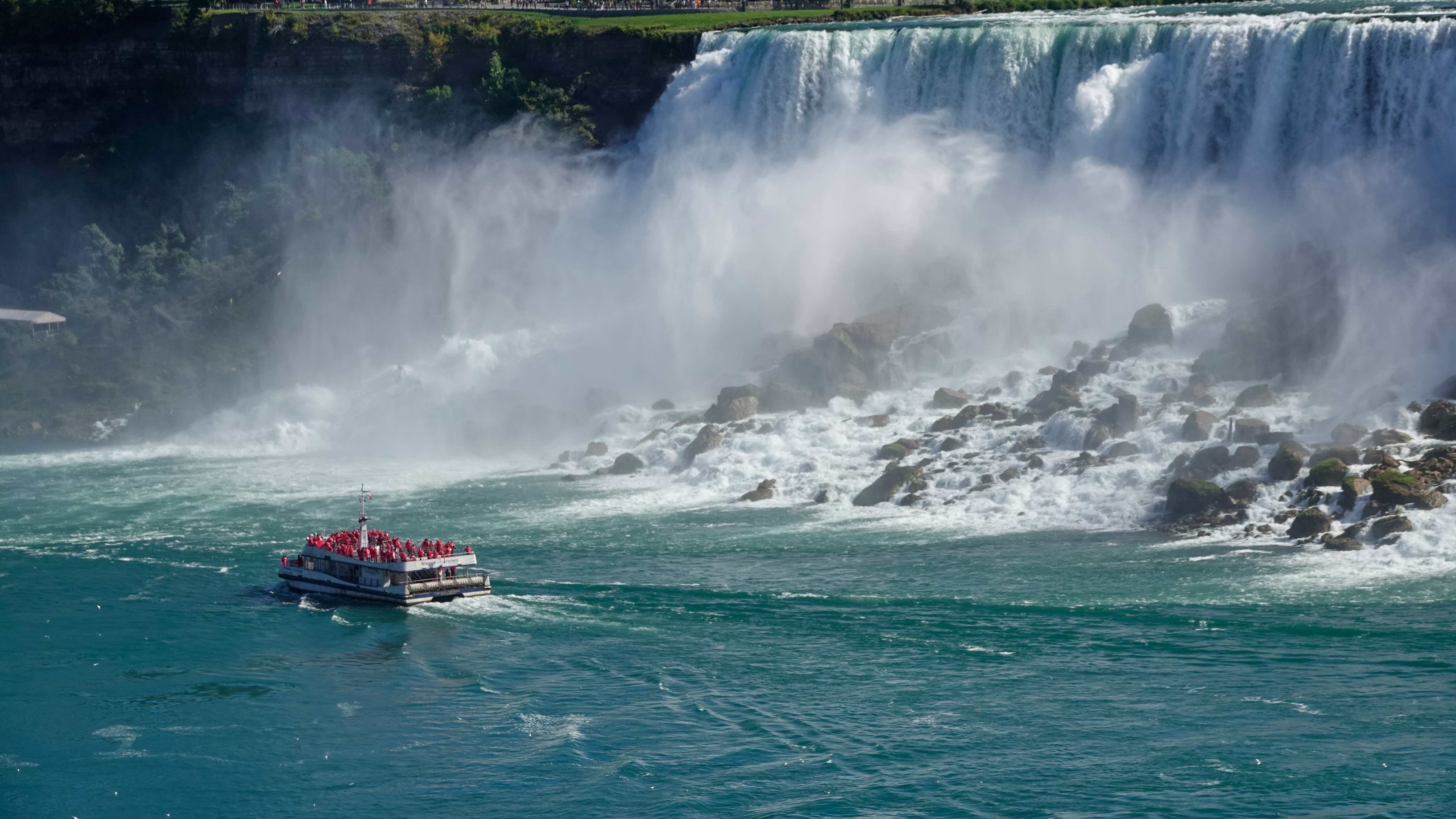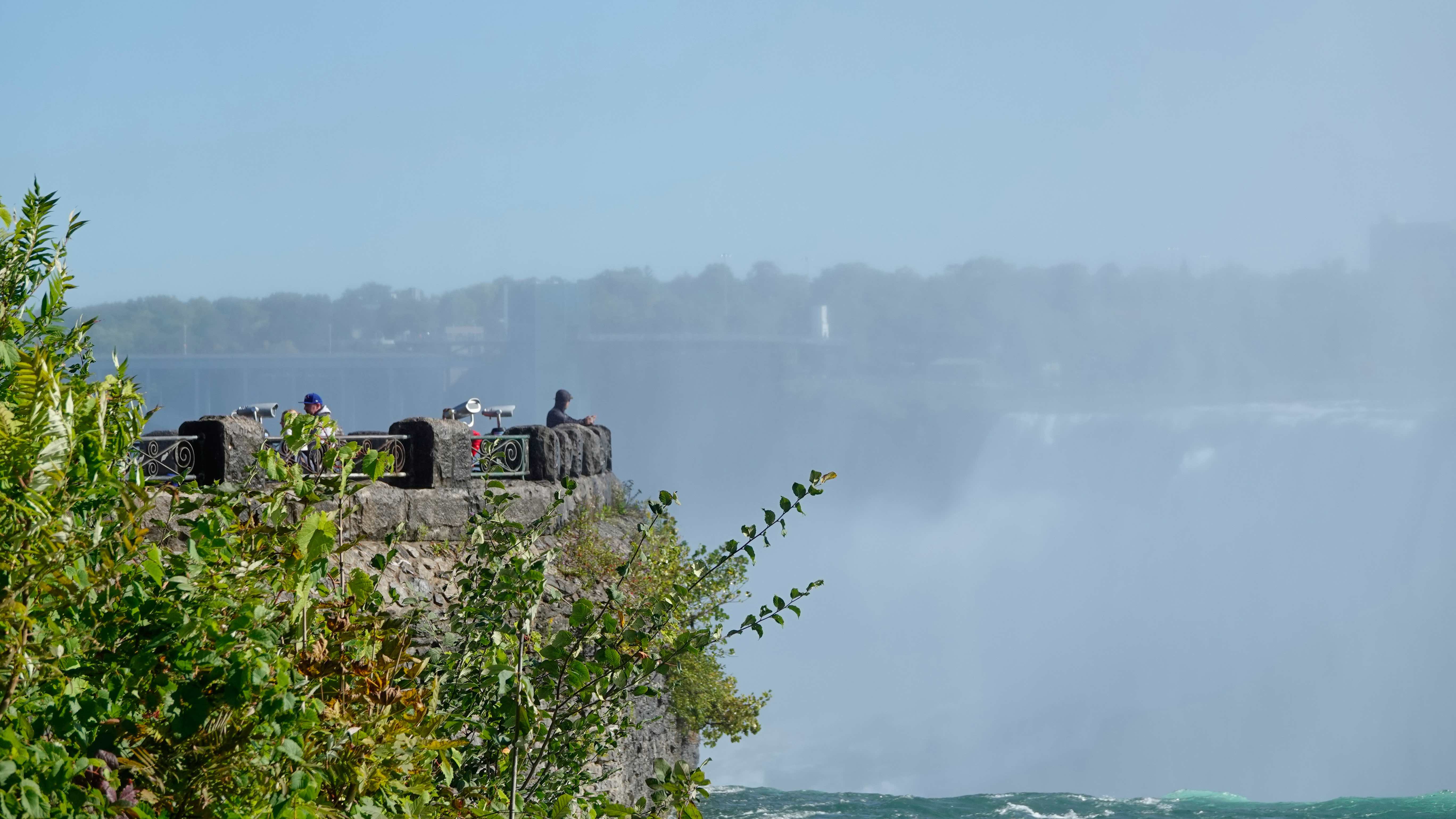 Auf der amerikanischen Seite sieht man die Menschen auf Plattformen dicht am Wasserfall stehen. Auf beiden Seiten fahren Ausflugsboote zum Maid of the Mist Pool und lassen sich von der Gischt durchnässen. Die Touristen auf den amerikanischen Booten sind in blaue, die auf den kanadischen in rote Regenumhänge gehüllt, was sehr lustig aussieht. Wir wählen neutrales weiß für unseren Regenponcho auf unserem Weg zum Table Rock.