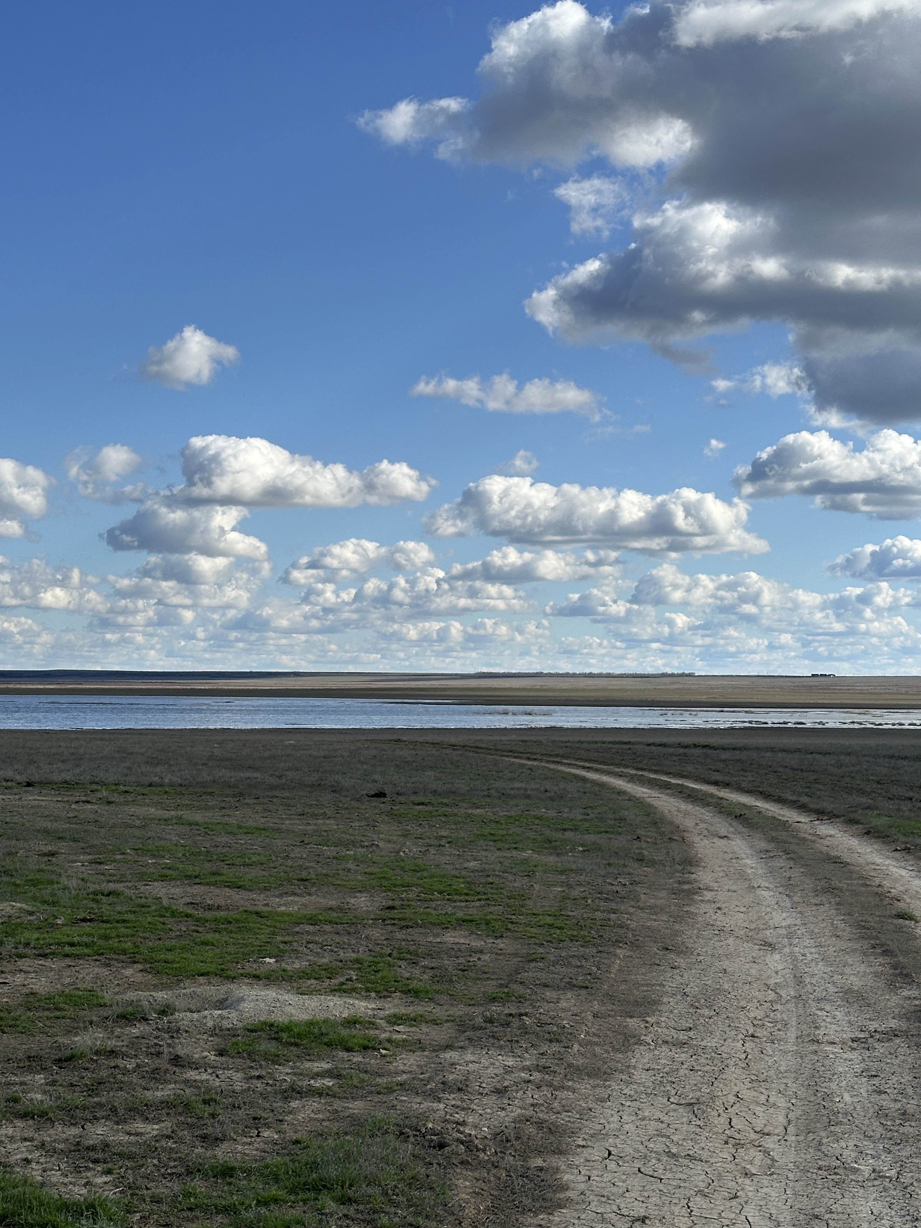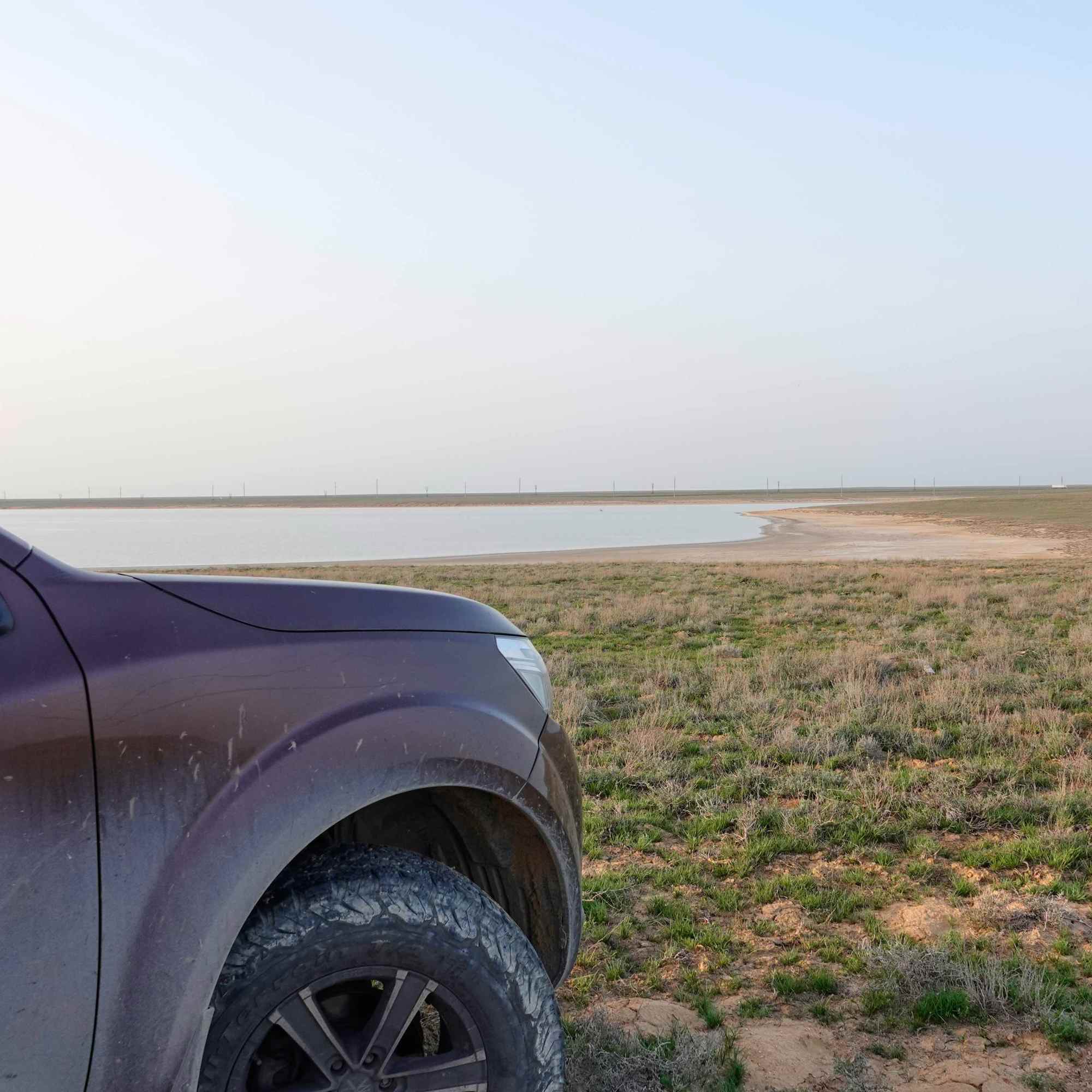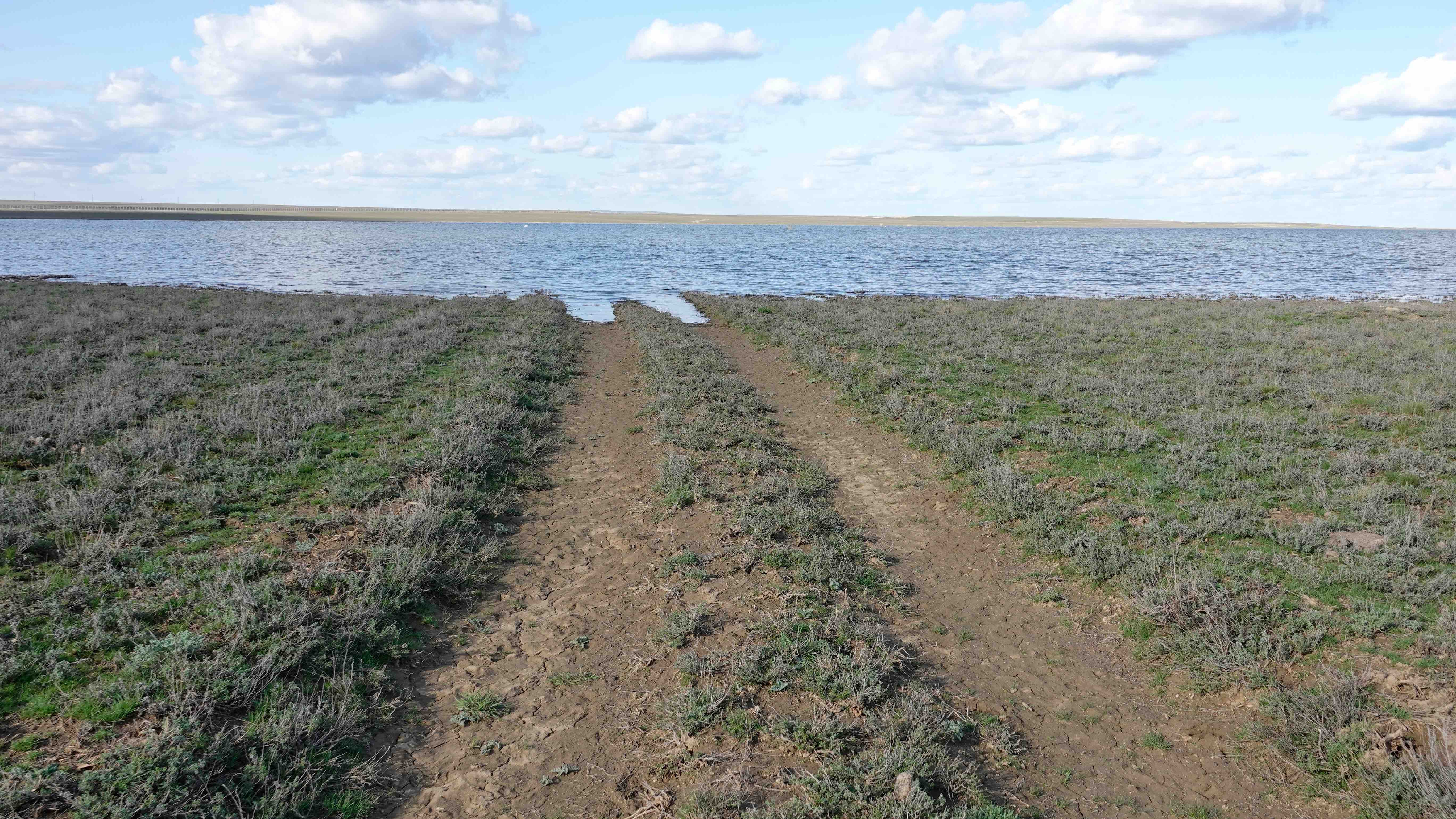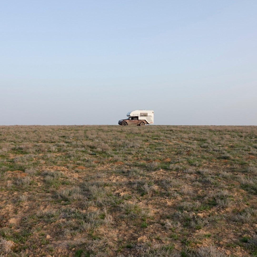 Leider ist die Straße in Dossor nach Süden Richtung Aktau gesperrt, eine Brücke ist zusammengebrochen und es besteht Hochwassergefahr. Viele LKW stehen an der Straße und kommen nicht weiter. Wir biegen kurz entschlossen nach Norden ab. Die nächsten 2 Tage verbringen wir viel im Auto auf der Fahrt durch die schier endlose kasachische Steppe. Abends finden wir jeweils ein schönes Plätzchen an einem kleinen See. Noch ist der Untergrund trocken, auch wenn viele Straßen ins Wasser führen – und wir können die langen Pisten durchs Gelände problemlos bewältigen.