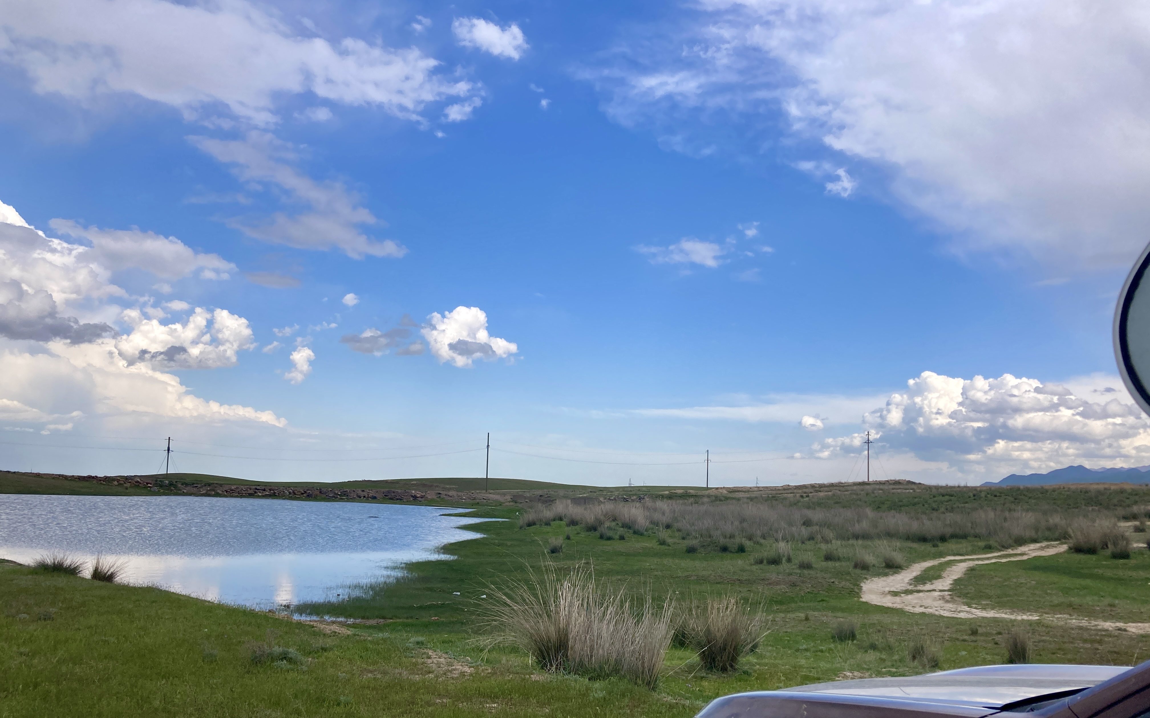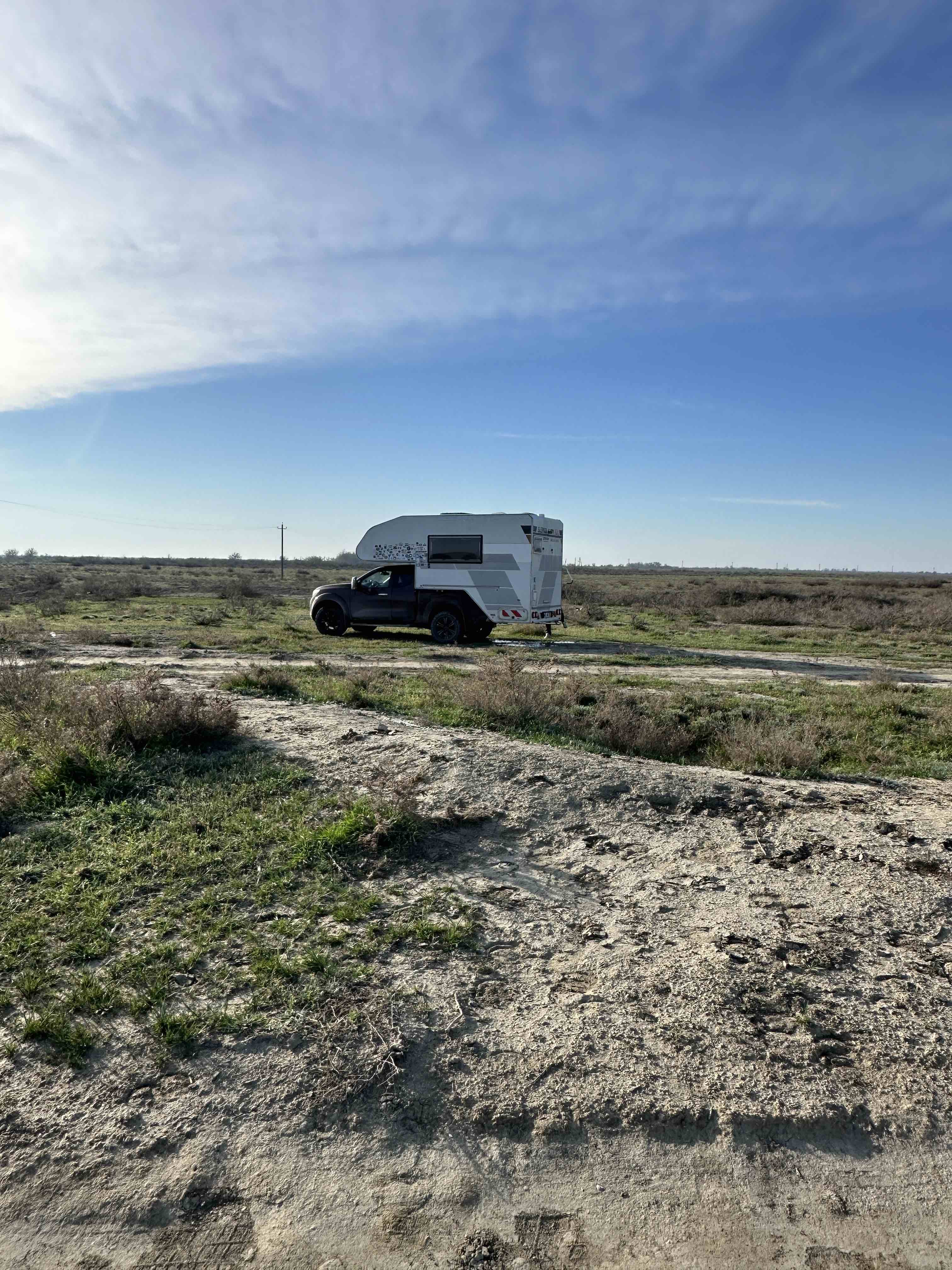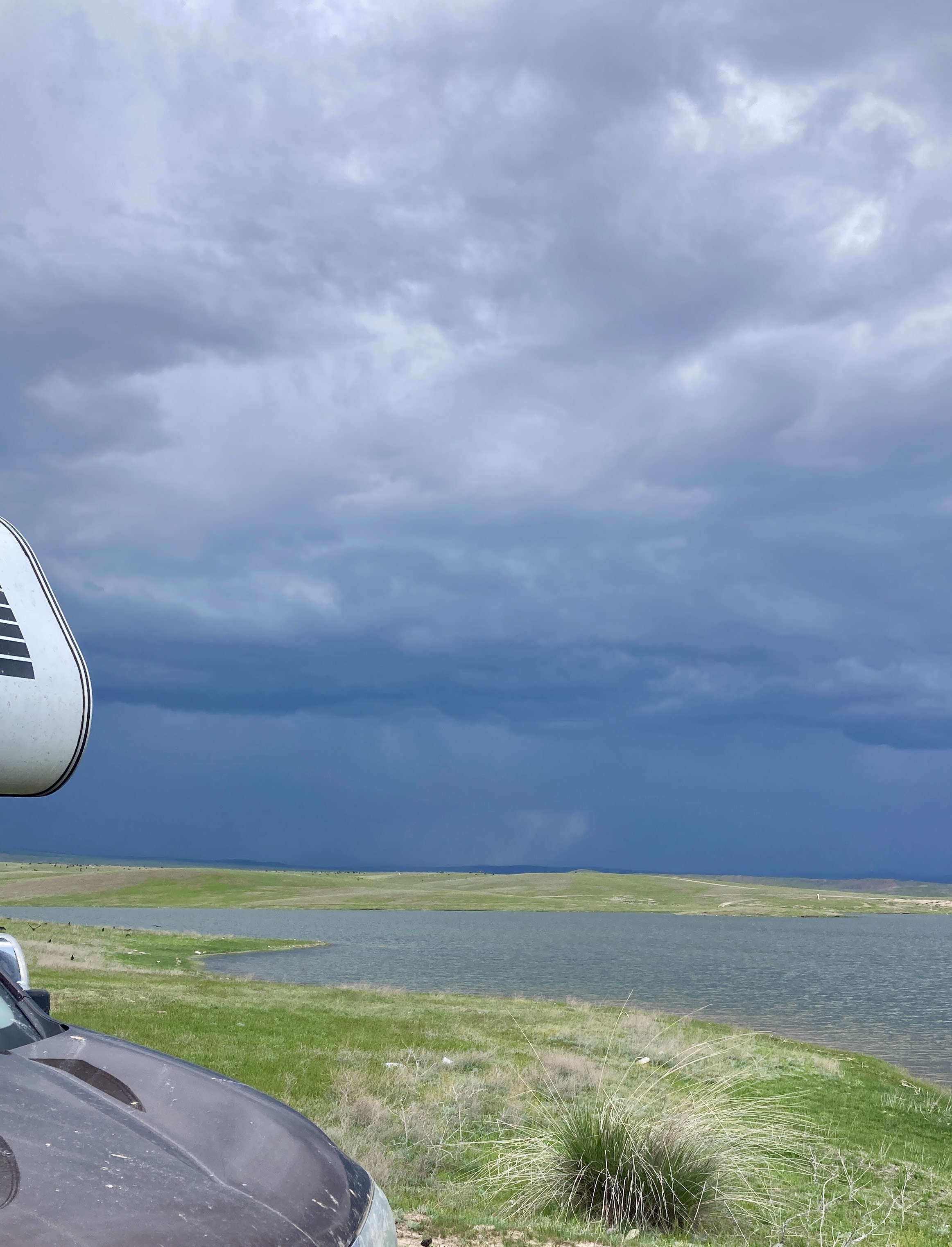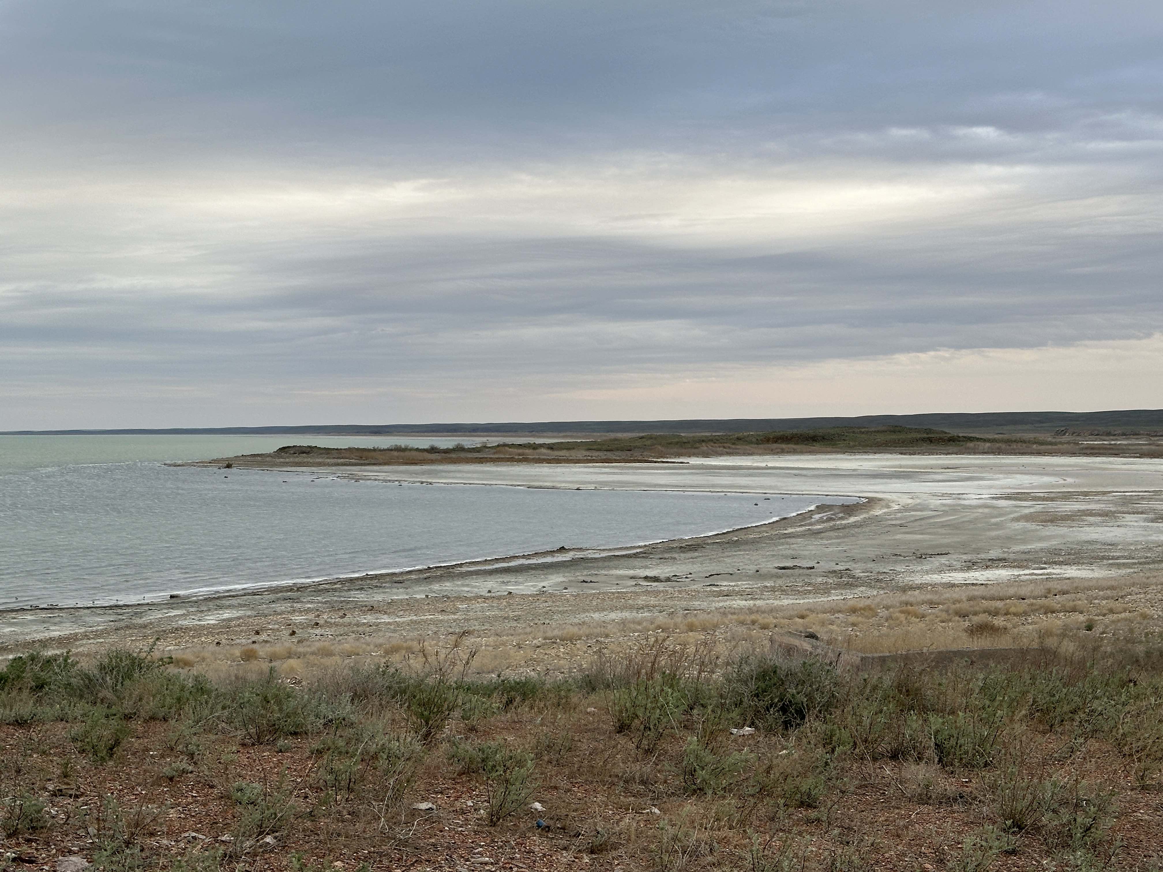 Leider ist die Straße in Dossor nach Süden Richtung Aktau gesperrt, eine Brücke ist zusammengebrochen und es besteht Hochwassergefahr. Viele LKW stehen an der Straße und kommen nicht weiter. Wir biegen kurz entschlossen nach Norden ab. Die nächsten 2 Tage verbringen wir viel im Auto auf der Fahrt durch die schier endlose kasachische Steppe. Abends finden wir jeweils ein schönes Plätzchen an einem kleinen See. Noch ist der Untergrund trocken, auch wenn viele Straßen ins Wasser führen – und wir können die langen Pisten durchs Gelände problemlos bewältigen.