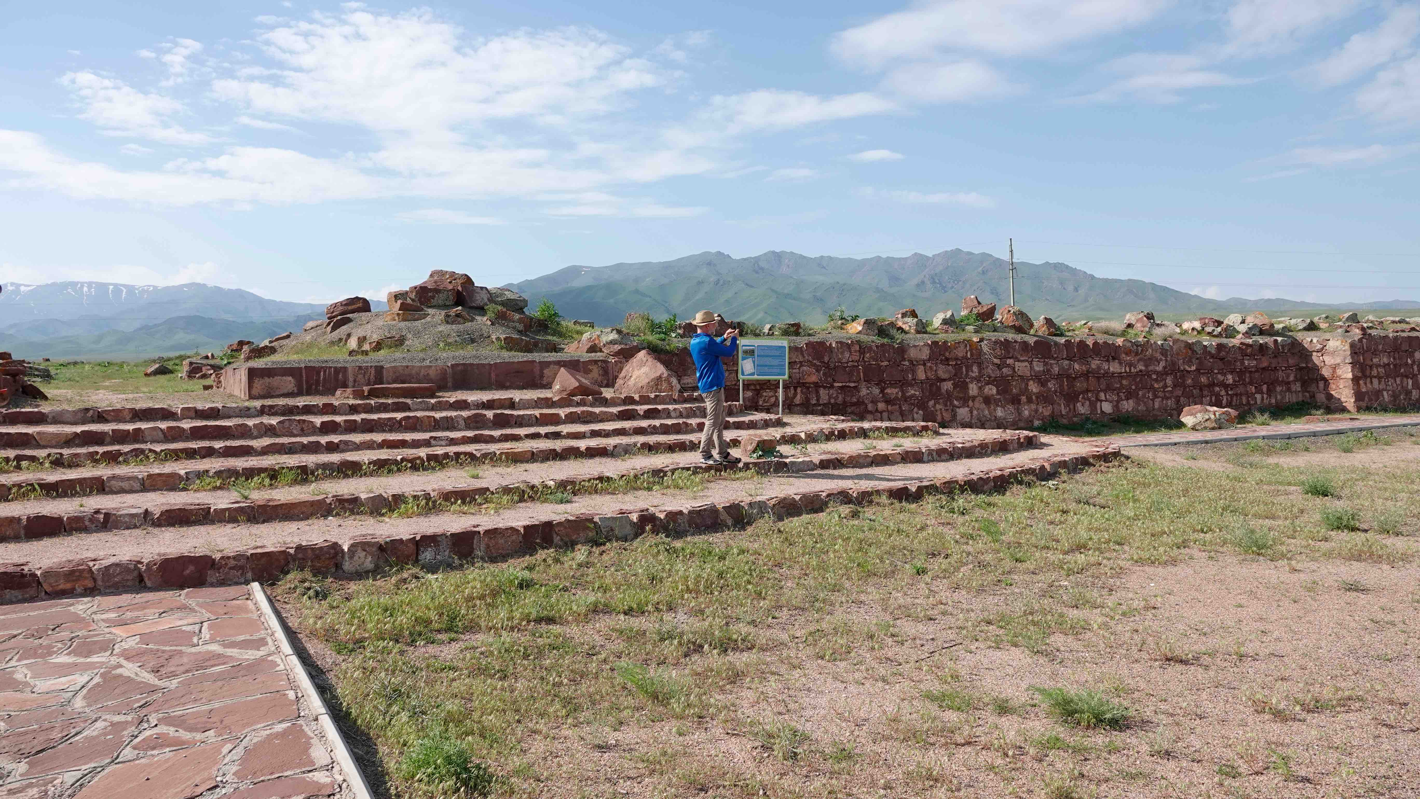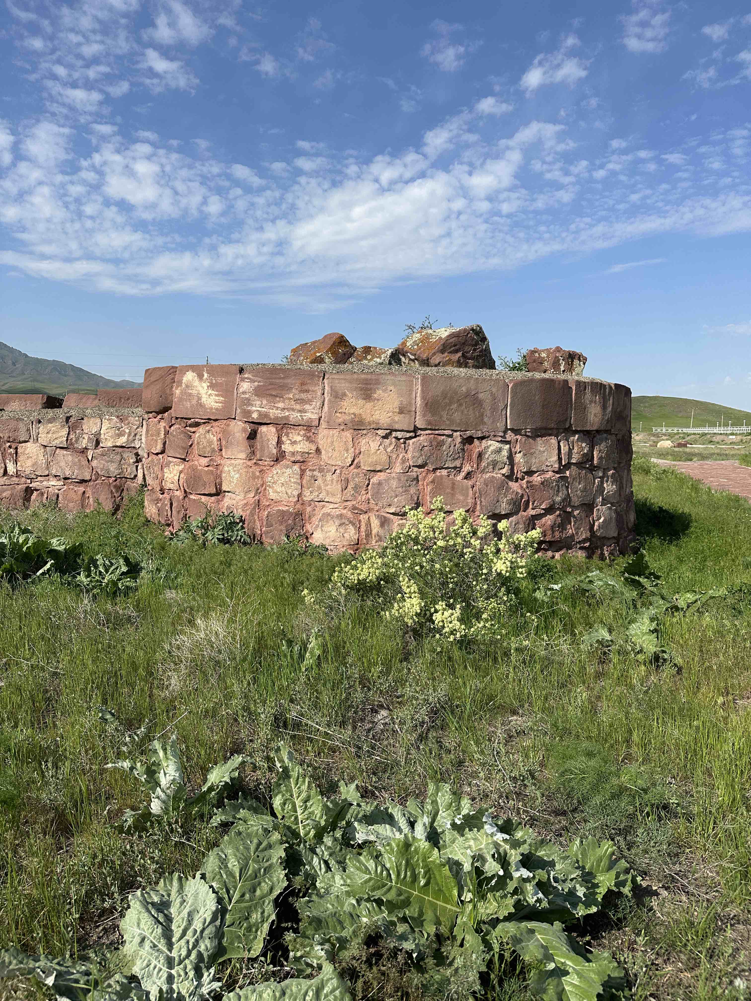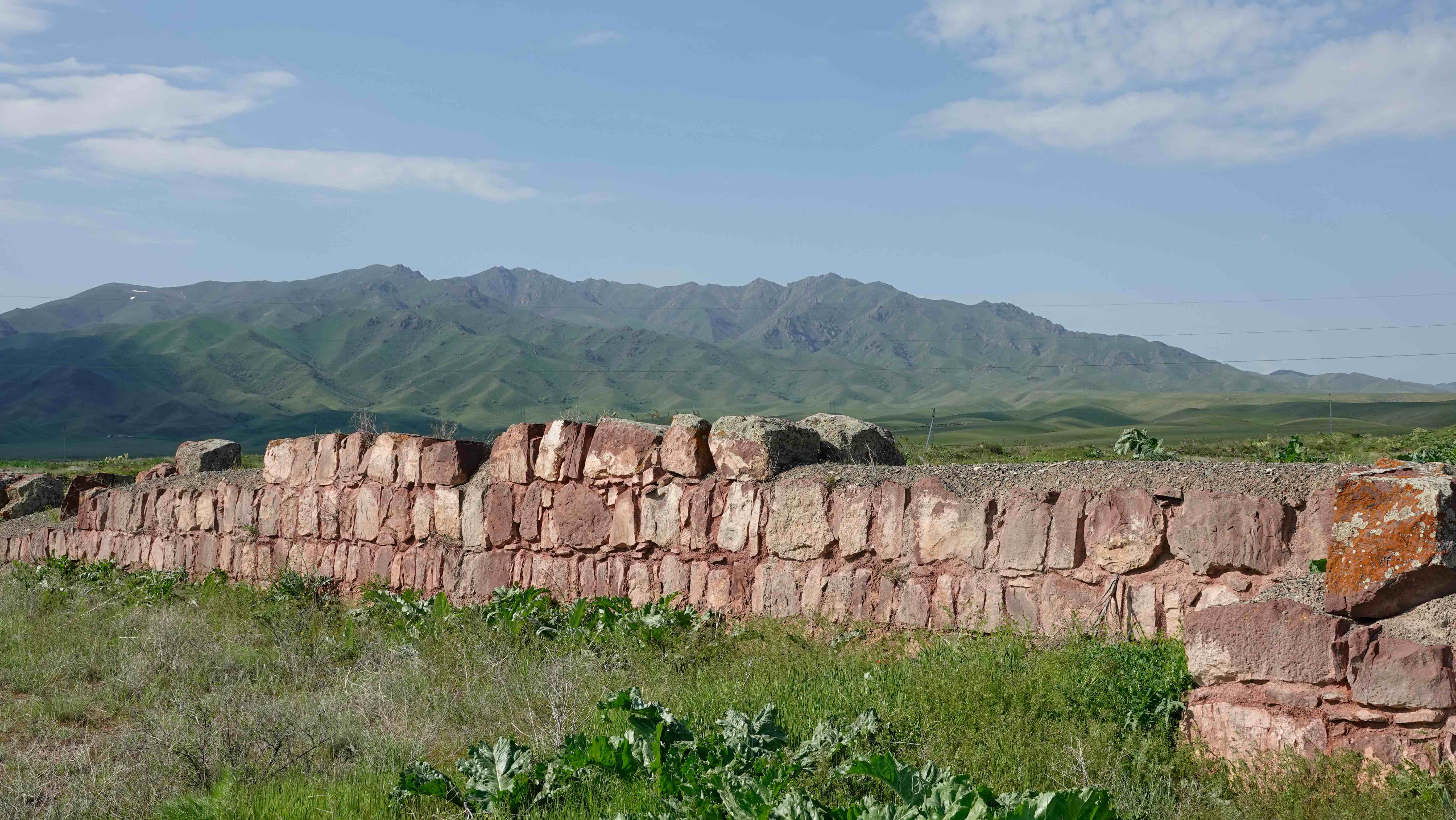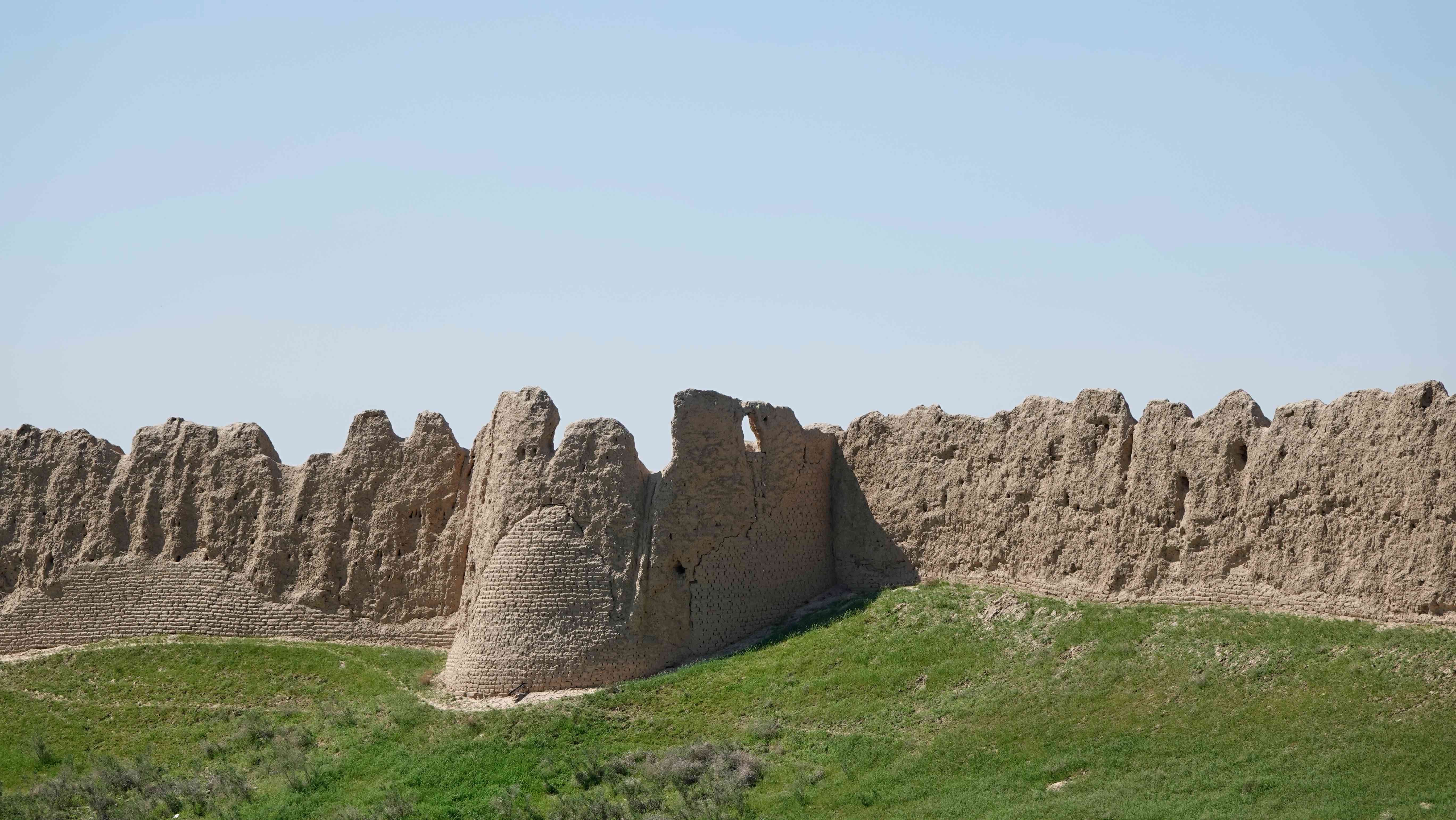 Auf der Weiterfahrt machen wir einen kurzen Stopp am Mausoleum von Aisha Bibi und besichtigen die Ruinen von Akyrtas. Gewaltige rote Steinquader sollten hier im 8. Jahrhundert zu einer Festungsanlage ausgebaut werden, die aber nie fertig gestellt wurde.