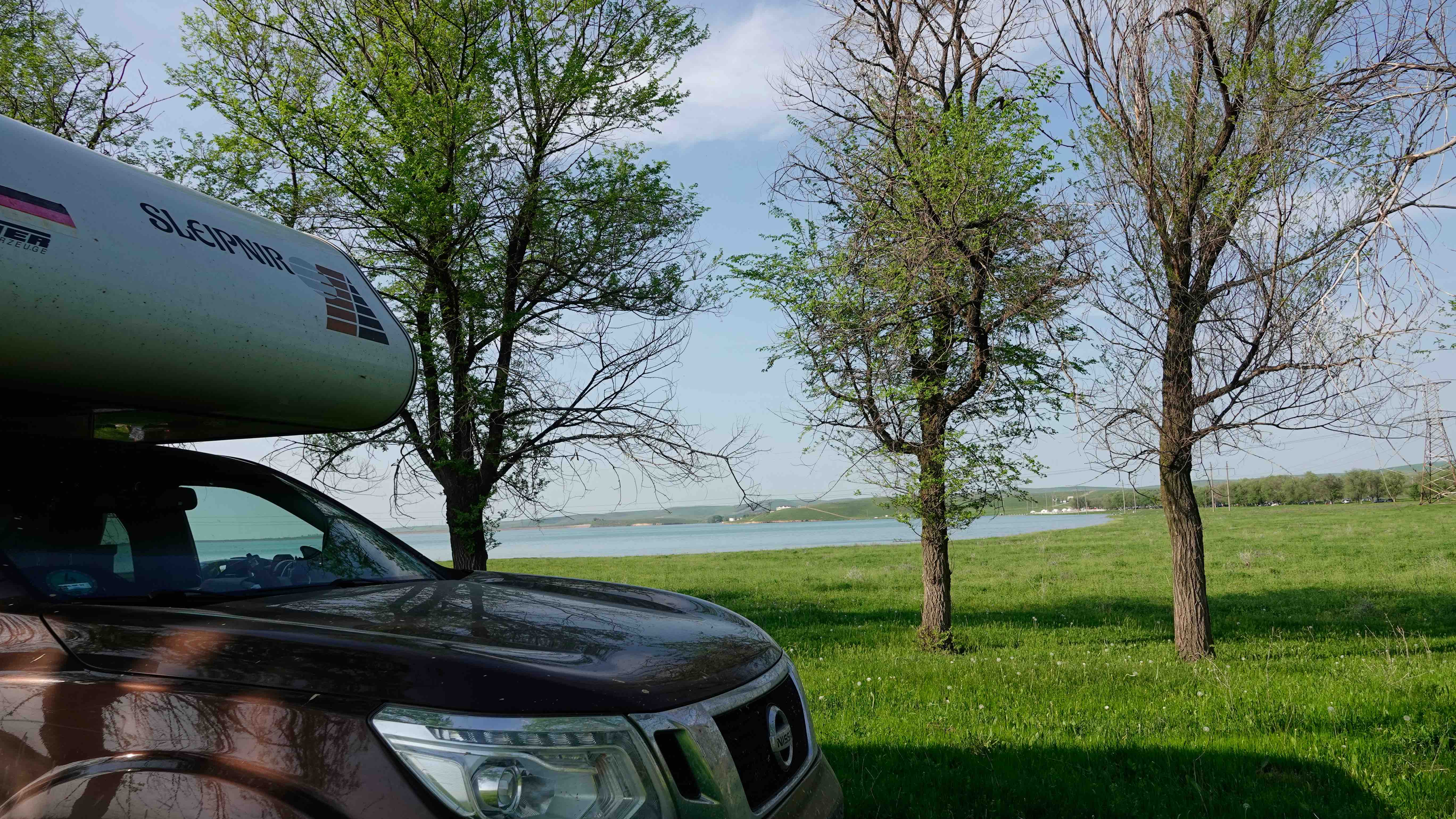 Deshalb können wir weder eine Fahrzeugversicherung abschließen, noch eine neue SIM-Karte kaufen. Was solls, wir wollen sowieso nicht lange bleiben und den Transit in 1 ½ Tagen bewältigen. Wir fahren zunächst durch Tschetchenien, welches deutlich muslemisch geprägt ist. Die Straßen sind gut und wir schaffen die ersten 300 km bis zum Abend und suchen uns einen Stellplatz etwas abseits der Straße an einem kleinen Flüsschen.