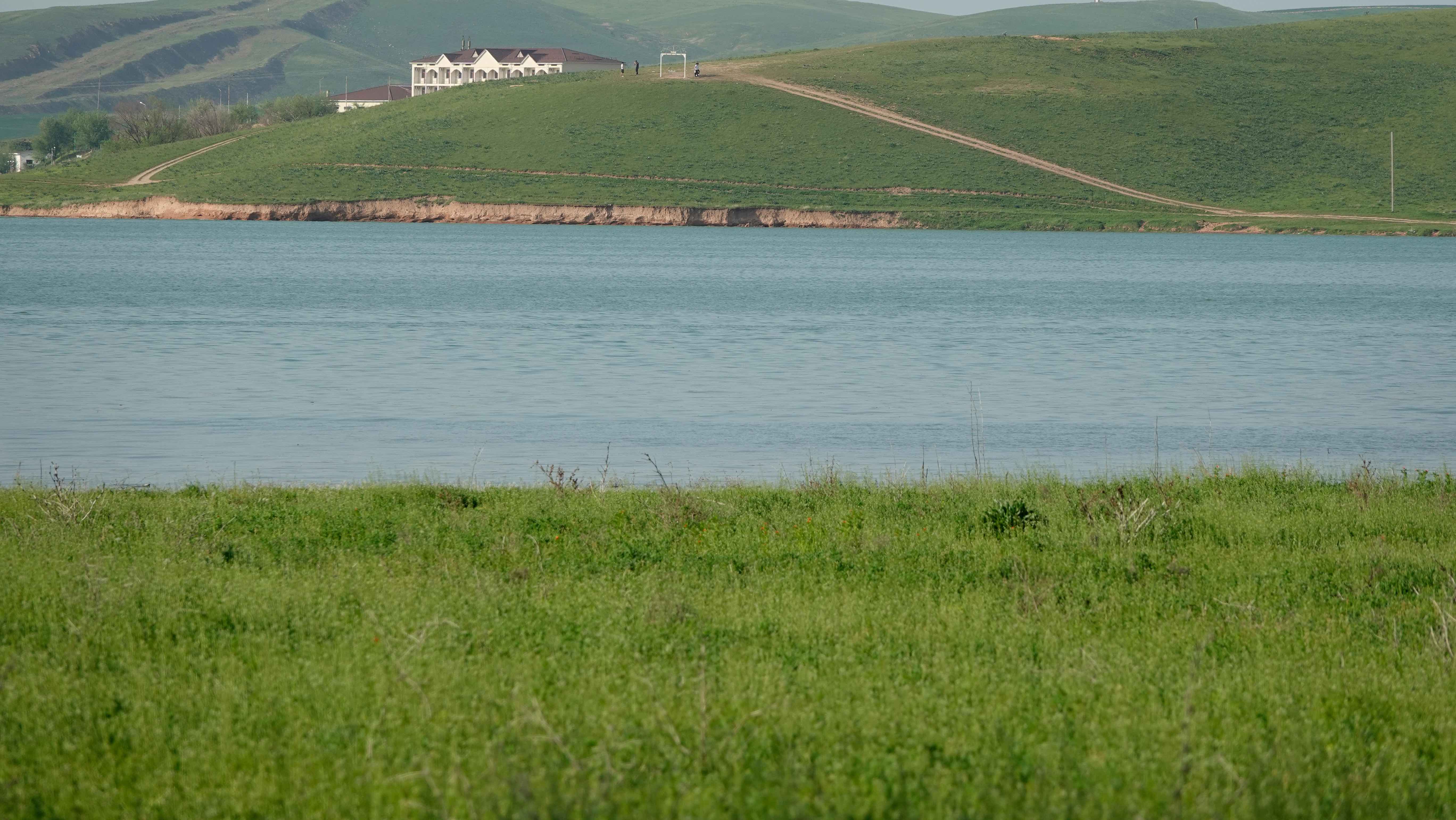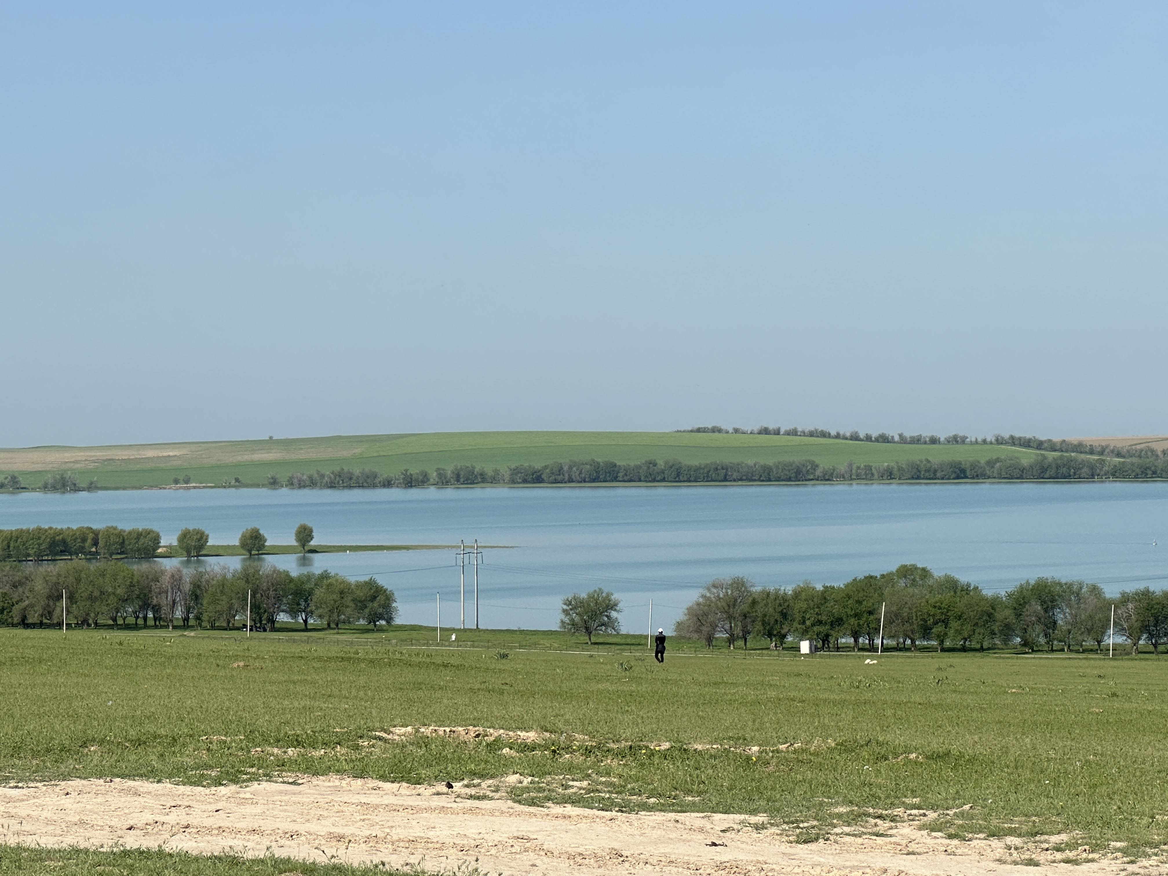 An Schymkent vorbei fahren wir weiter zum Badamiskoye Wasserreservoir. Der schöne Platz am See ist eigentlich als Campingplatz ausgewiesen, wir bekommen die Erlaubnis, ohne Gebühr als Gäste eine Nacht zu bleiben. Da es Wochenende ist, ist das Seeufer von vielen Familien bevölkert, die sich jedoch sehr gut auf dem weitläufigen Gelände verteilen. Walter muss mit einem Kleinkind posieren, der Bart fasziniert. Abends ist Party angesagt und es wird bis Mitternacht gefeiert.