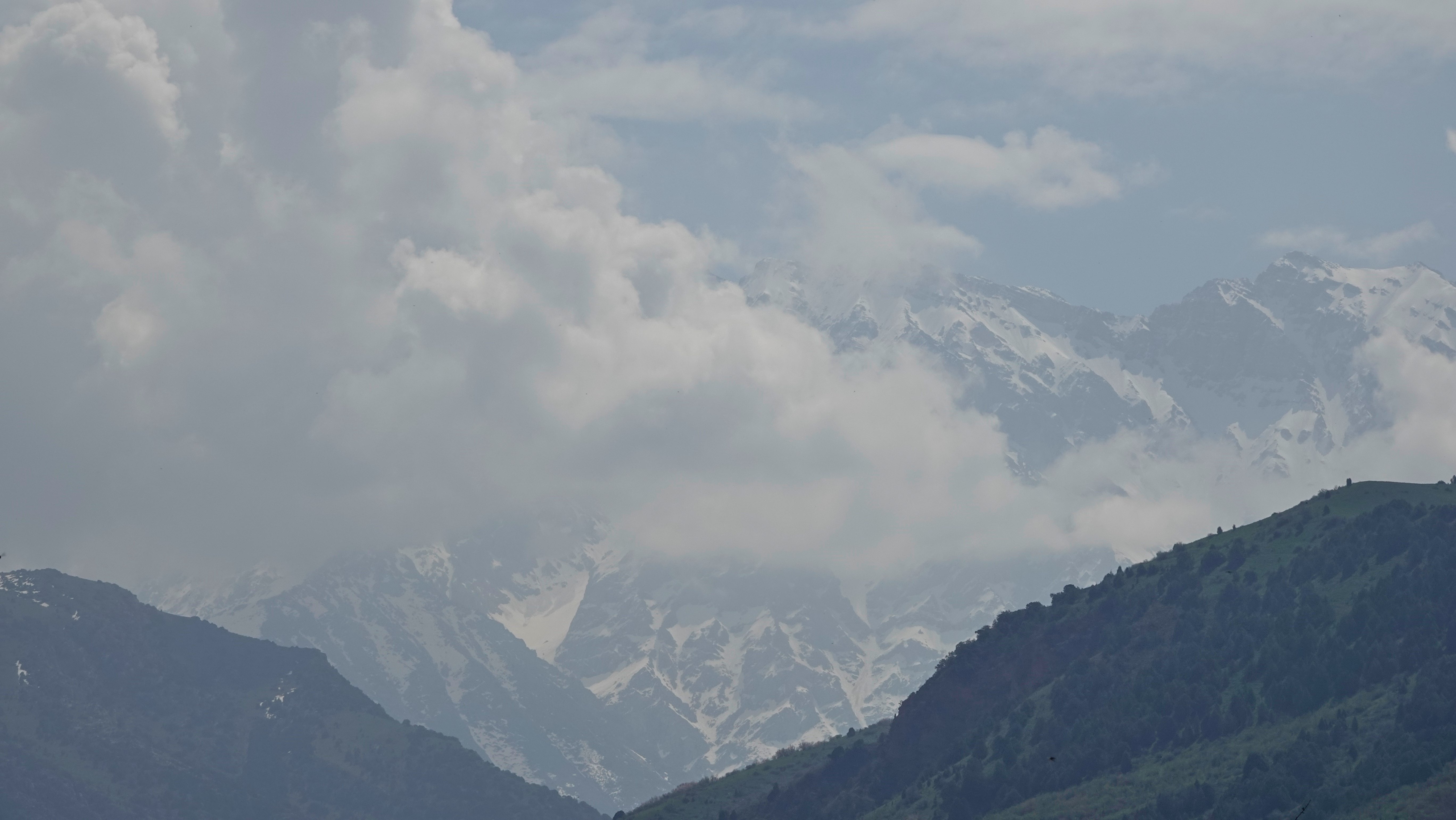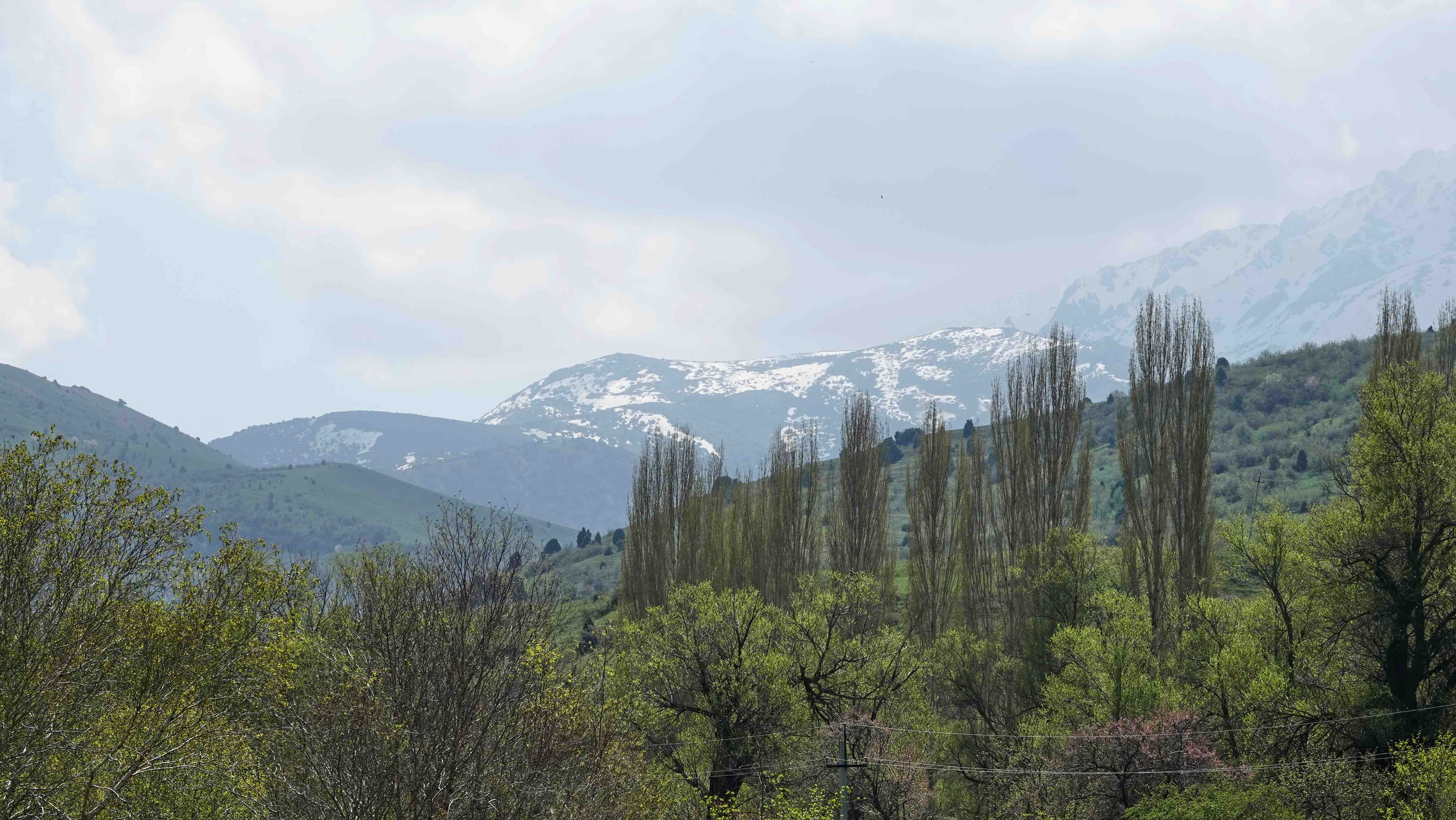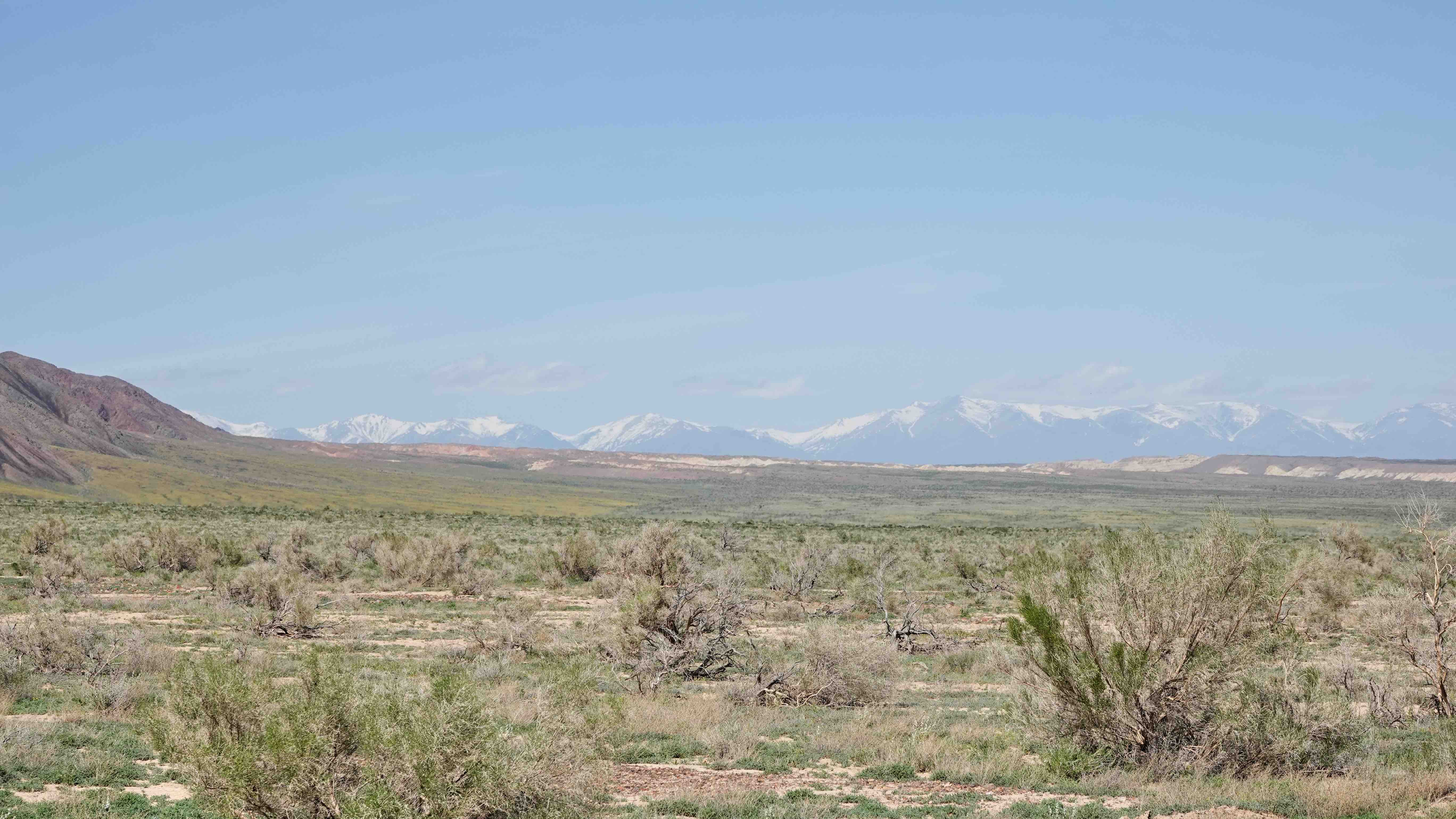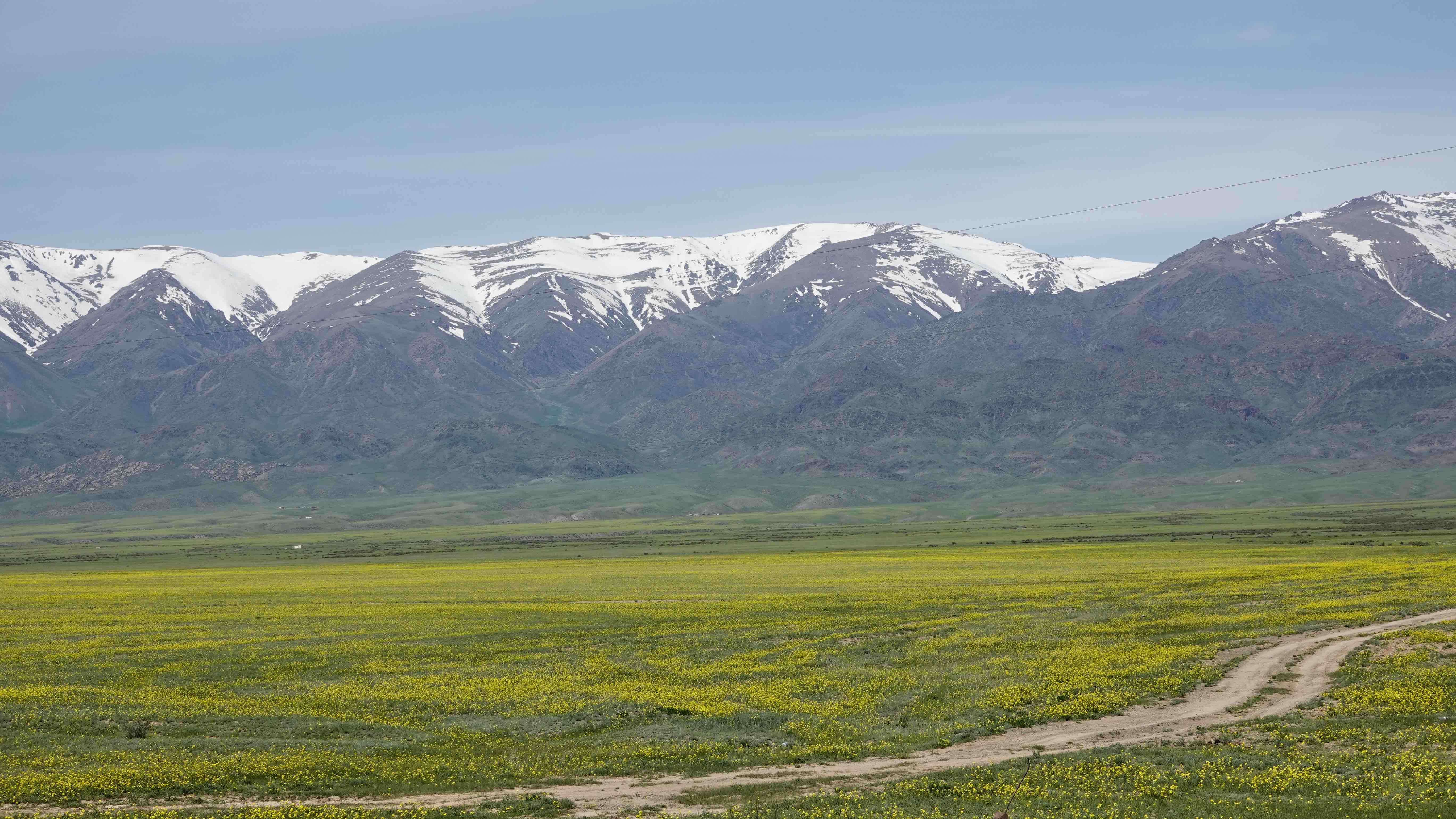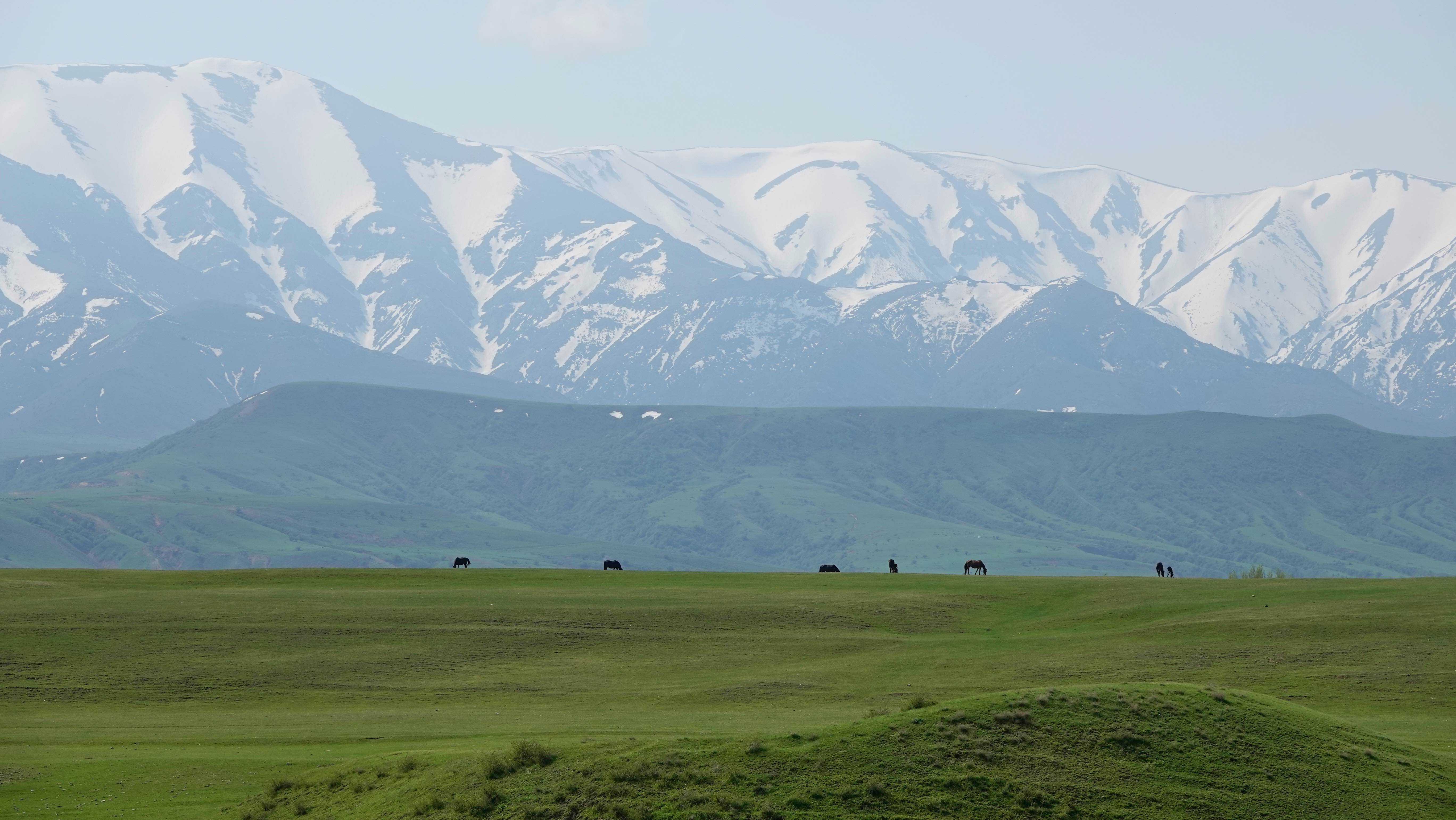 Die Landschaft hat sich total geändert. Statt der doch etwas eintönigen Steppenlandschaft blicken wir auf sattgrüne Wiesen auf sanften Hügeln und am Horizont sind die schneebedeckten Gipfel des Tien Shan Gebirges zu sehen.
