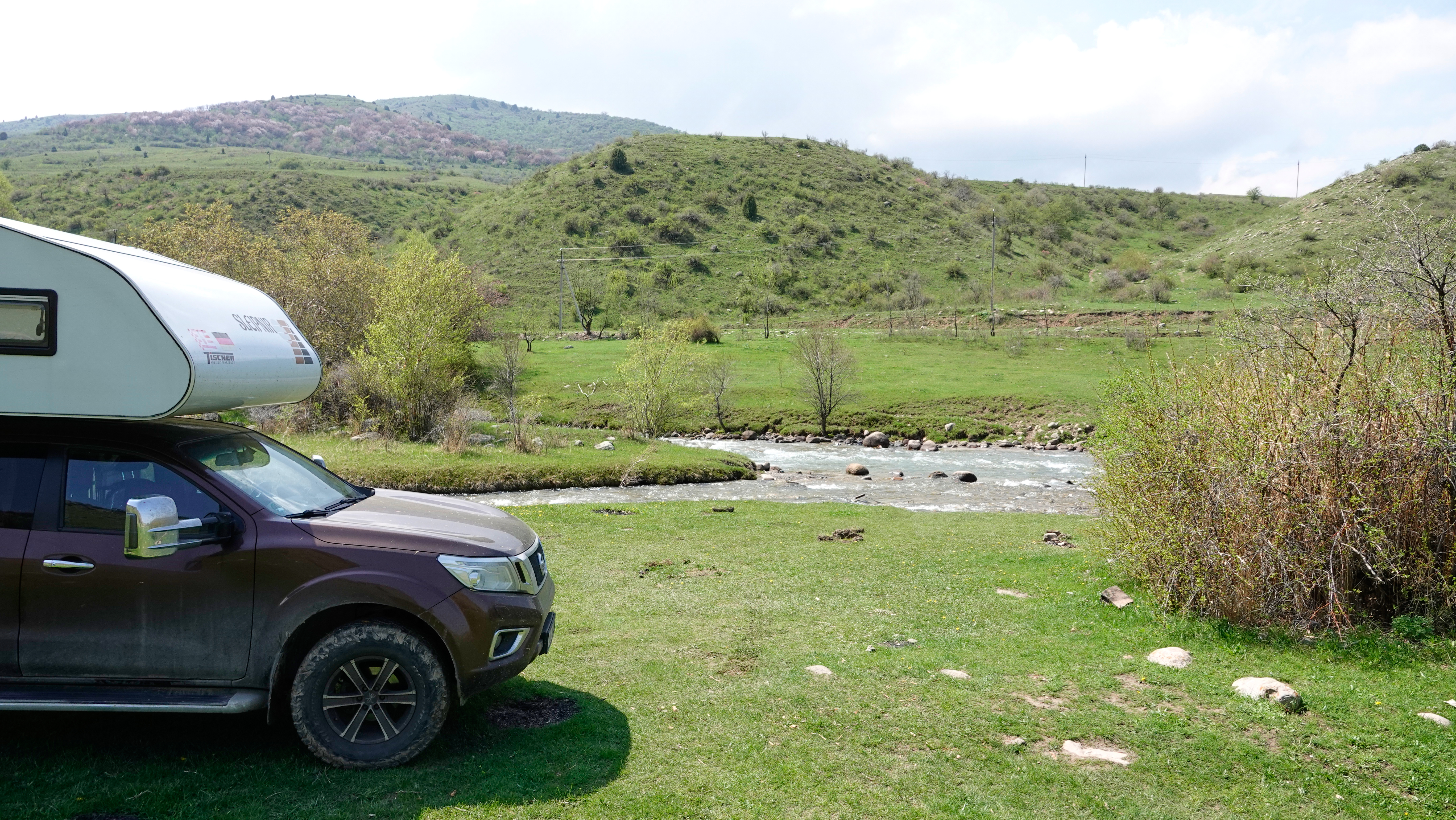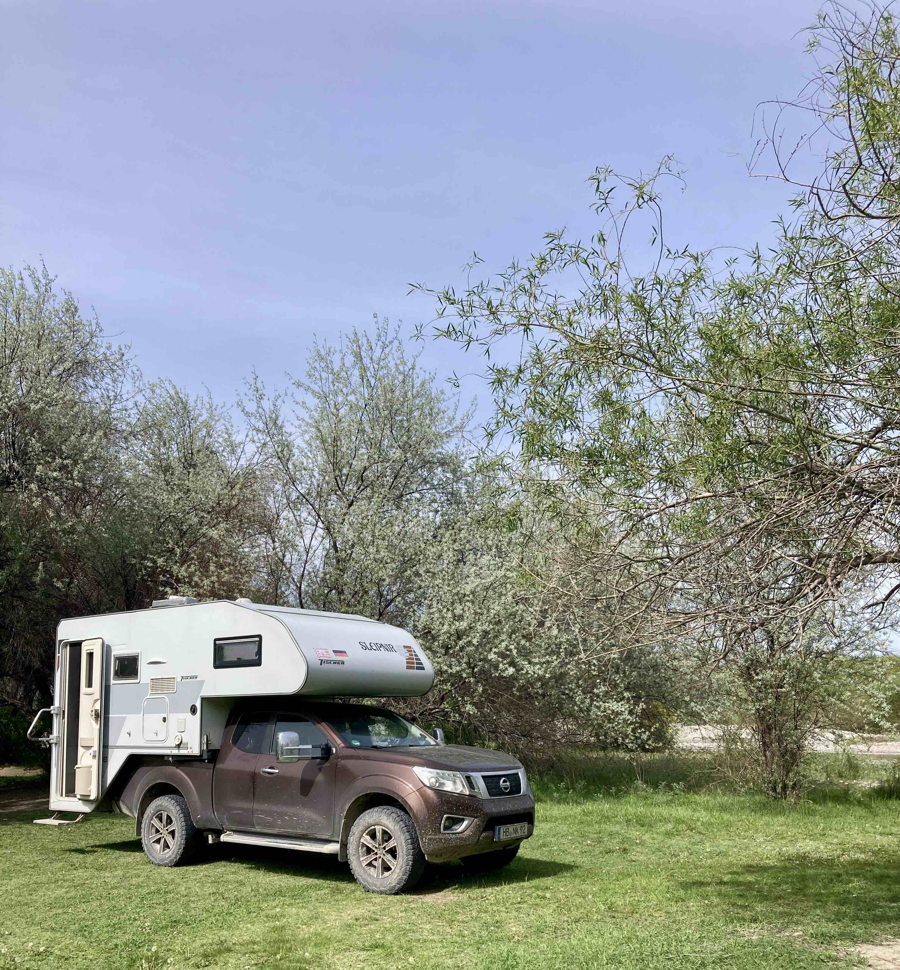 In der Nähe des Nationalpark Aksu Zhabaghty Naturreservates finden wir einen tollen Platz am Flüsschen Sayramsu und werden hier auch an Walters Geburtstag bleiben.