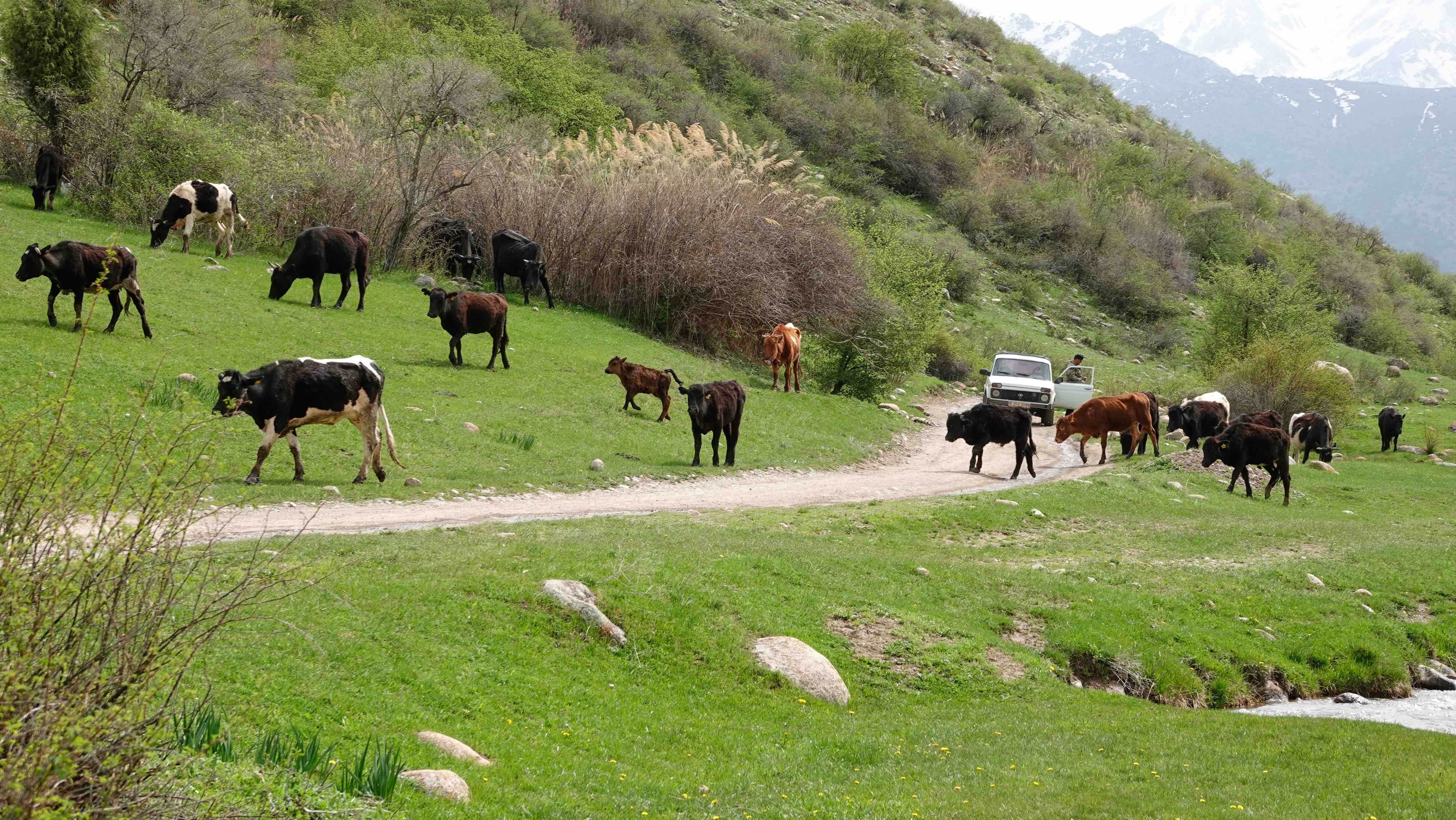 Von hier aus beobachten wir einen modernen Cowboy, der eine Herde mit dem Auto vor sich hertreibt. Unwillige Kühe werden mittels einer Zwille motiviert.