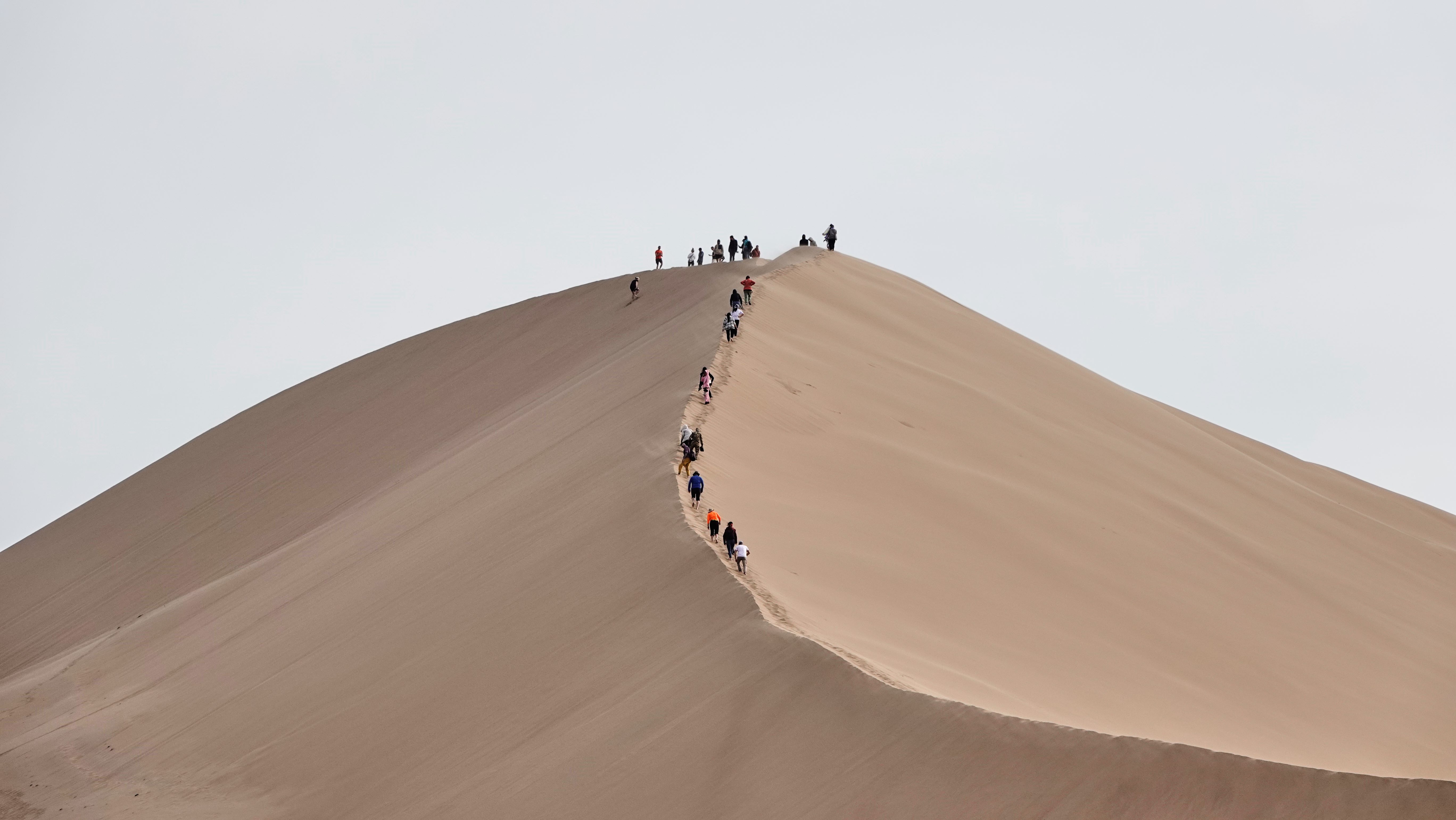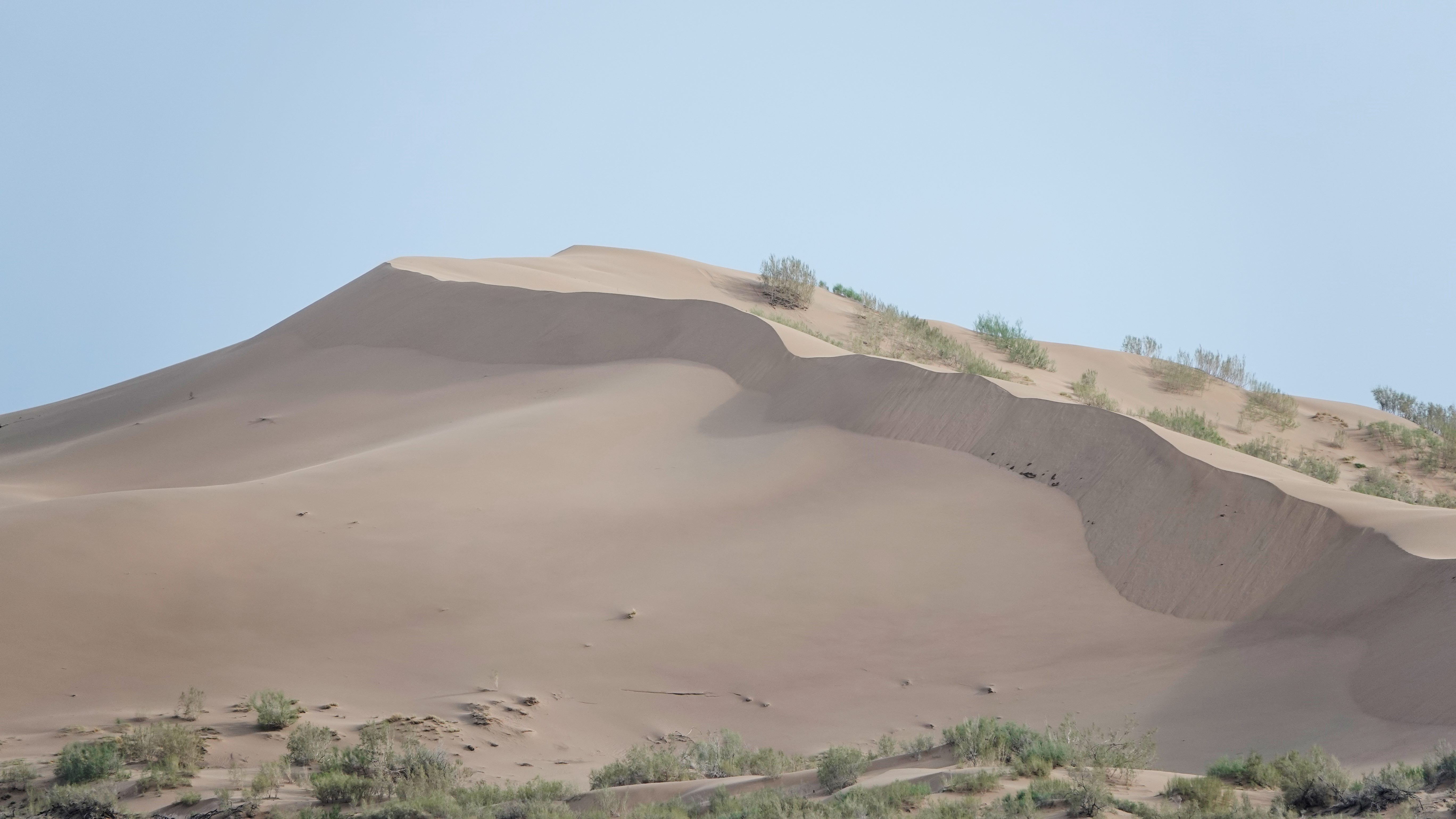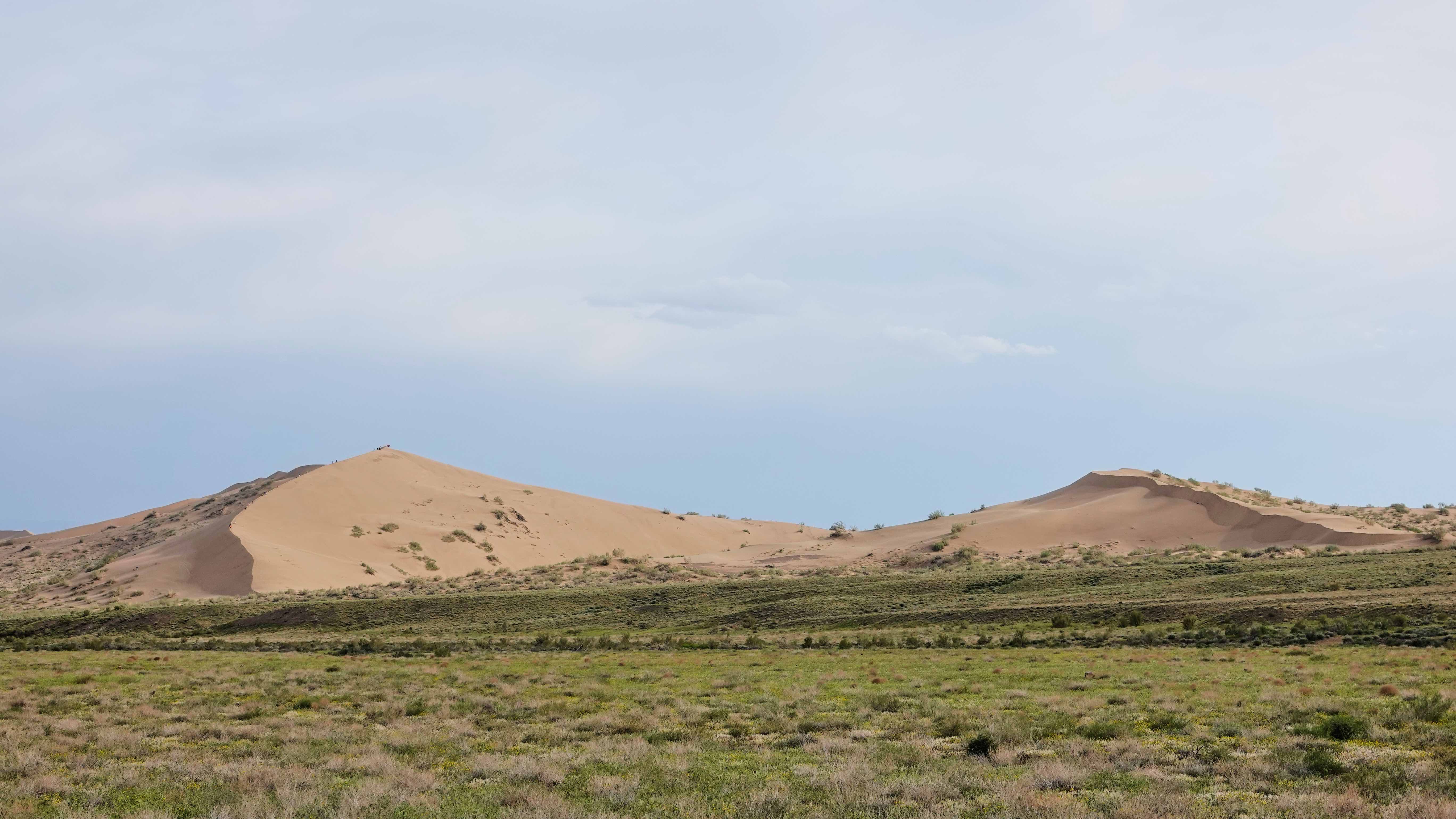 Wir sind spät dran und fahren zunächst zu den „Singenden Dünen“. Unvermittelt tauchen sie aus der Steppenlandschaft auf, ein kurioser Anblick! Es wird erzählt, dass man beim Herunterrutschen der Düne eine Art Gesang hören würde. Wir hören erst einmal nur den heftigen Wind, der die Hänge herabweht. Die Menschen, die die Düne erklettern, haben sichtlich damit zu kämpfen. Da eine Regenfront den Himmel verdüstert, verzichten wir auf das einmalige Klangerlebnis und flüchten vor dem Regen in die Kabine.
