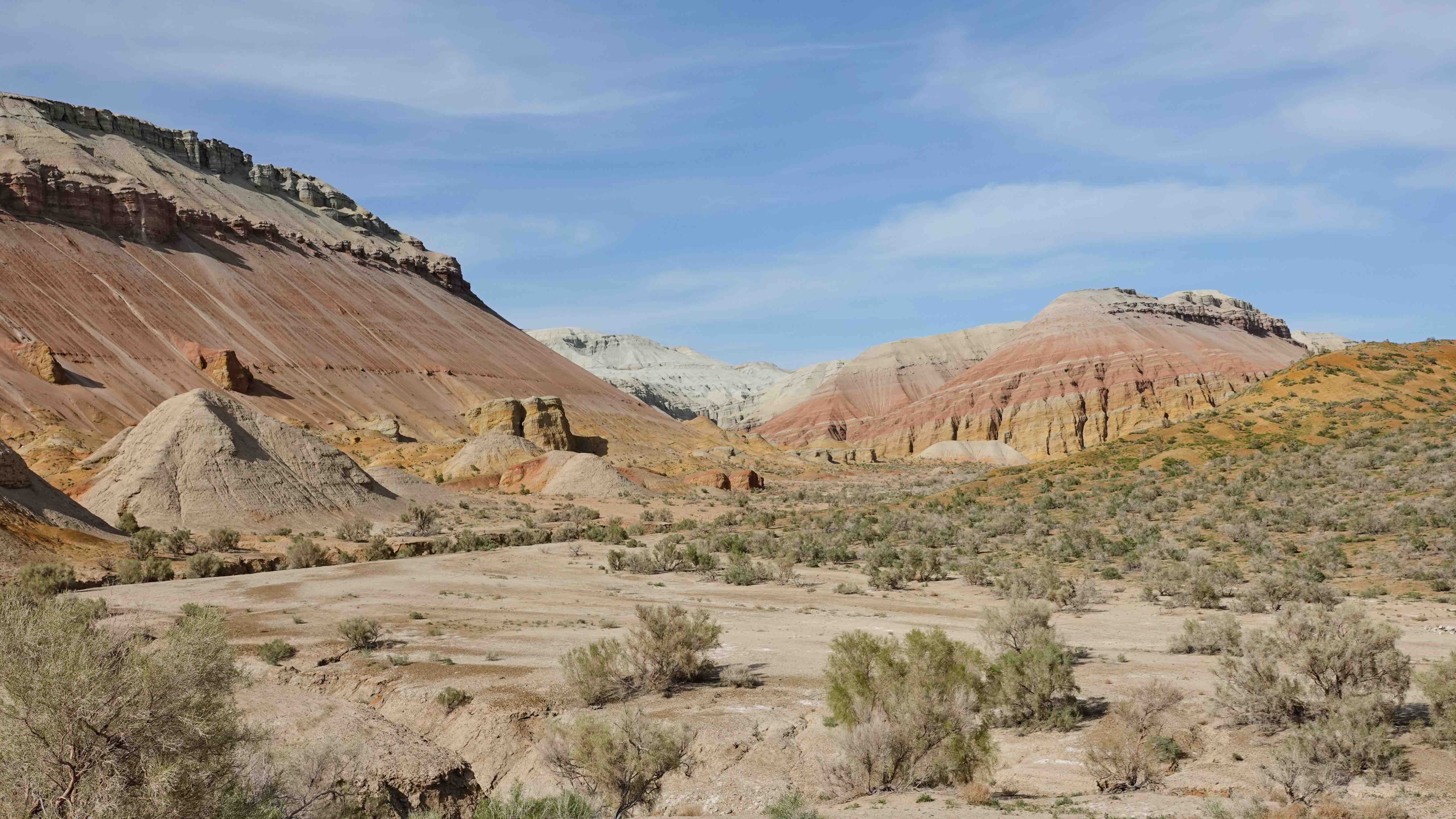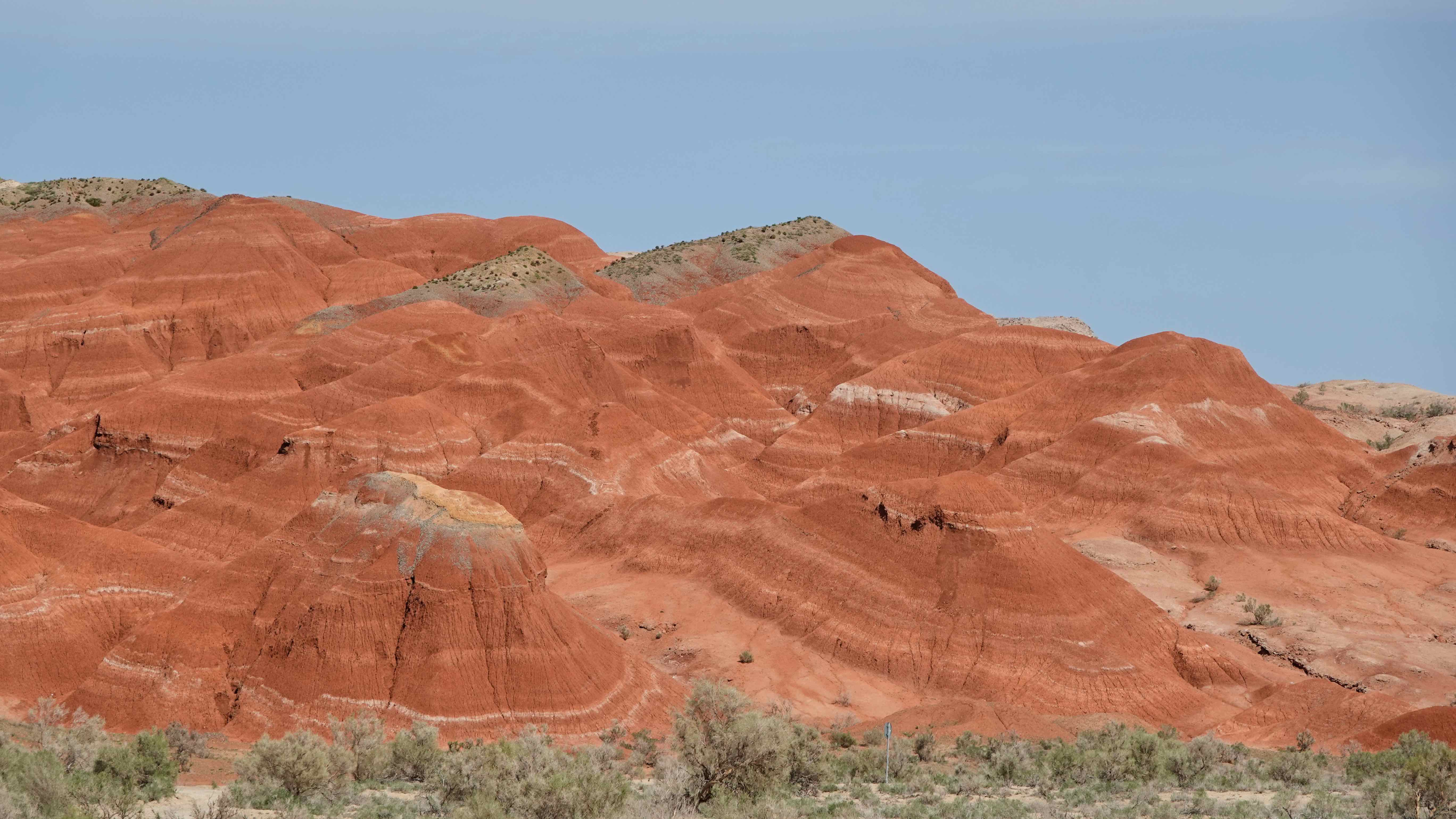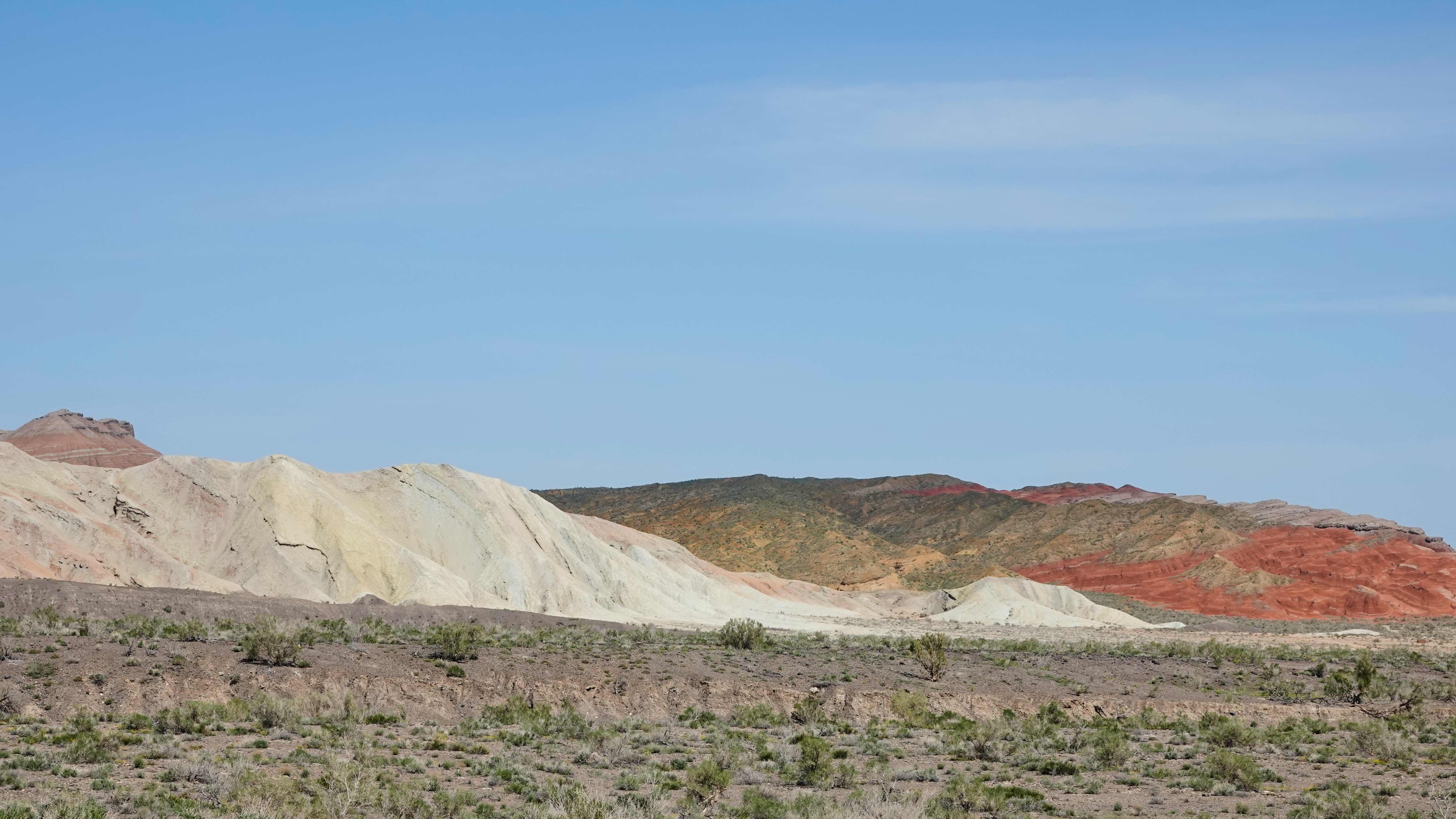 Die Weiterfahrt entlang der bunten Berge werden wir abermals tüchtig durchgeschüttelt, aber es ist ein Fest für die Augen! Am Horizont sieht man noch die schneebedeckten Gipfel des Tien Shan und allmählich tauchen die weißen Gipfel der Aktau Berge auf, was für ein Kontrast! Hier dominiert die Farbe weiß und je nach Lichteinfall mit rötlichem, grünem oder blauem Schimmer.
