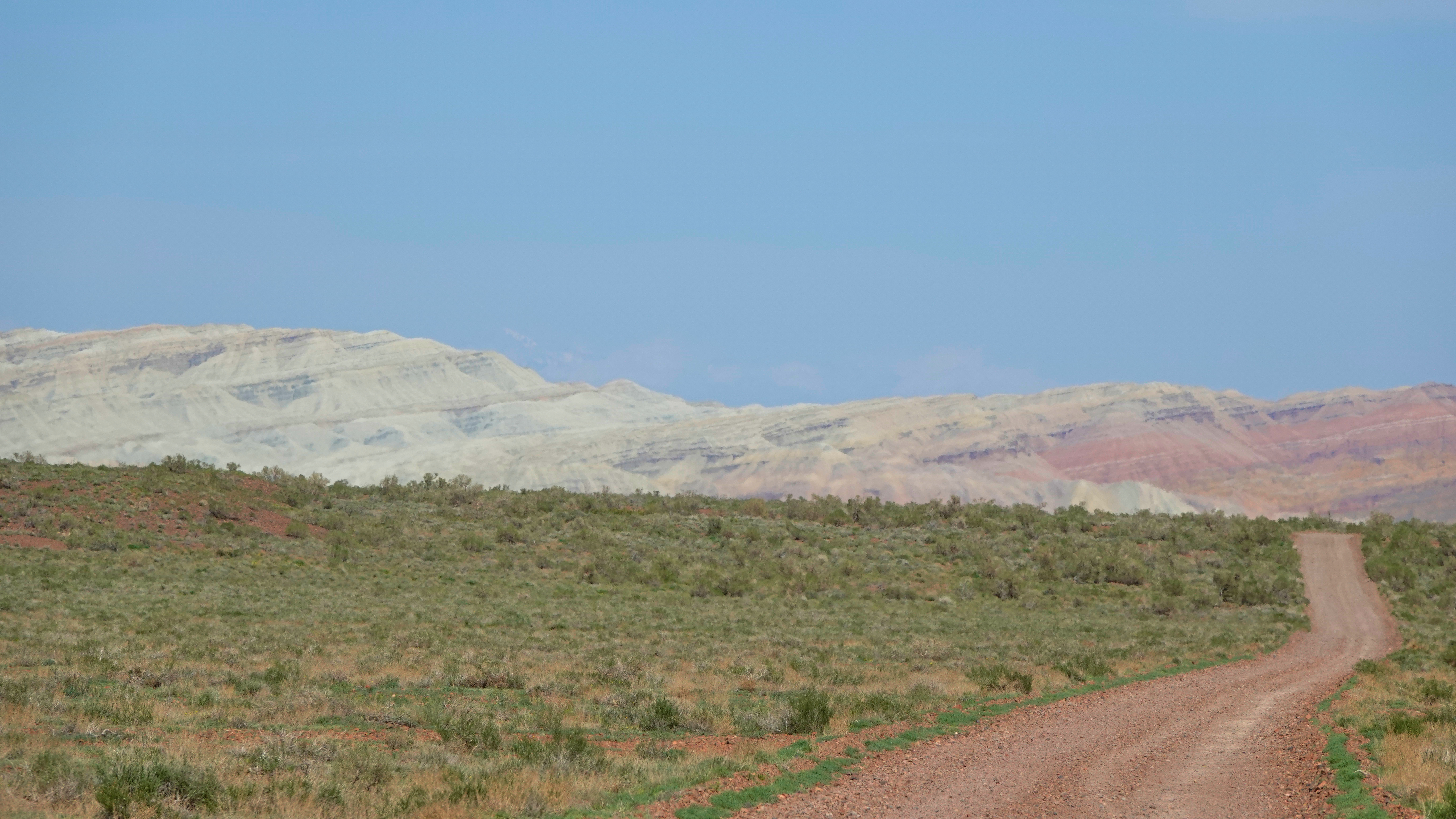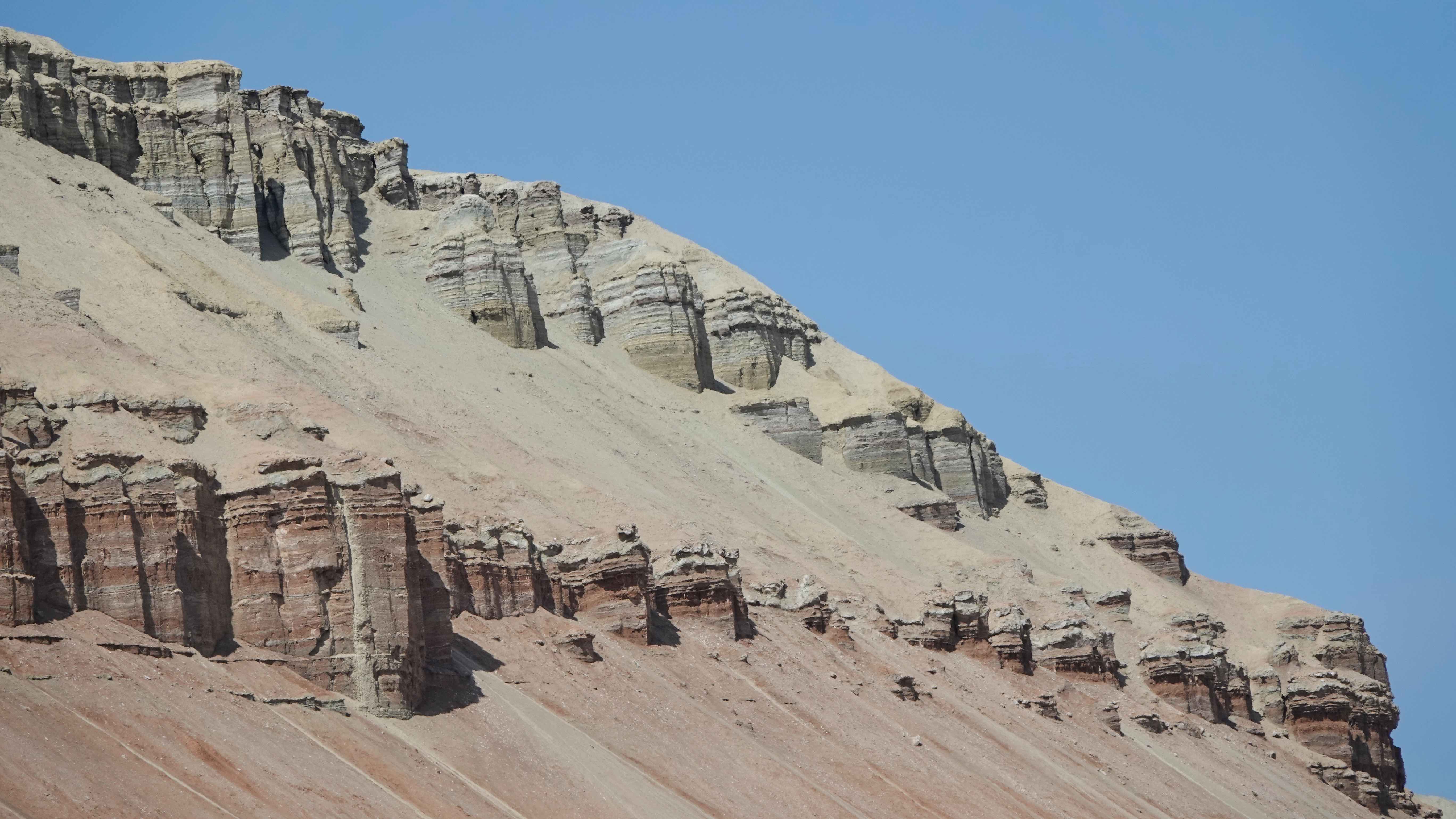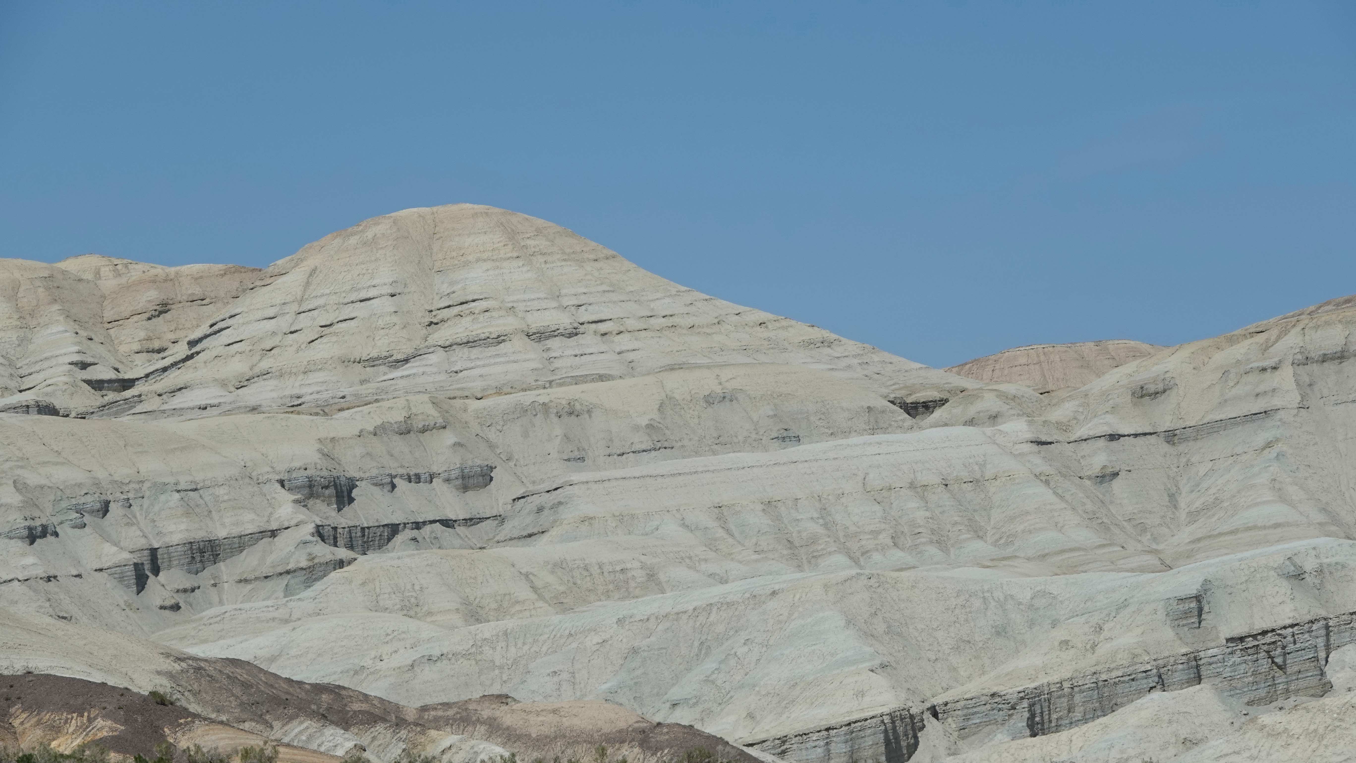 Die Weiterfahrt entlang der bunten Berge werden wir abermals tüchtig durchgeschüttelt, aber es ist ein Fest für die Augen! Am Horizont sieht man noch die schneebedeckten Gipfel des Tien Shan und allmählich tauchen die weißen Gipfel der Aktau Berge auf, was für ein Kontrast! Hier dominiert die Farbe weiß und je nach Lichteinfall mit rötlichem, grünem oder blauem Schimmer.