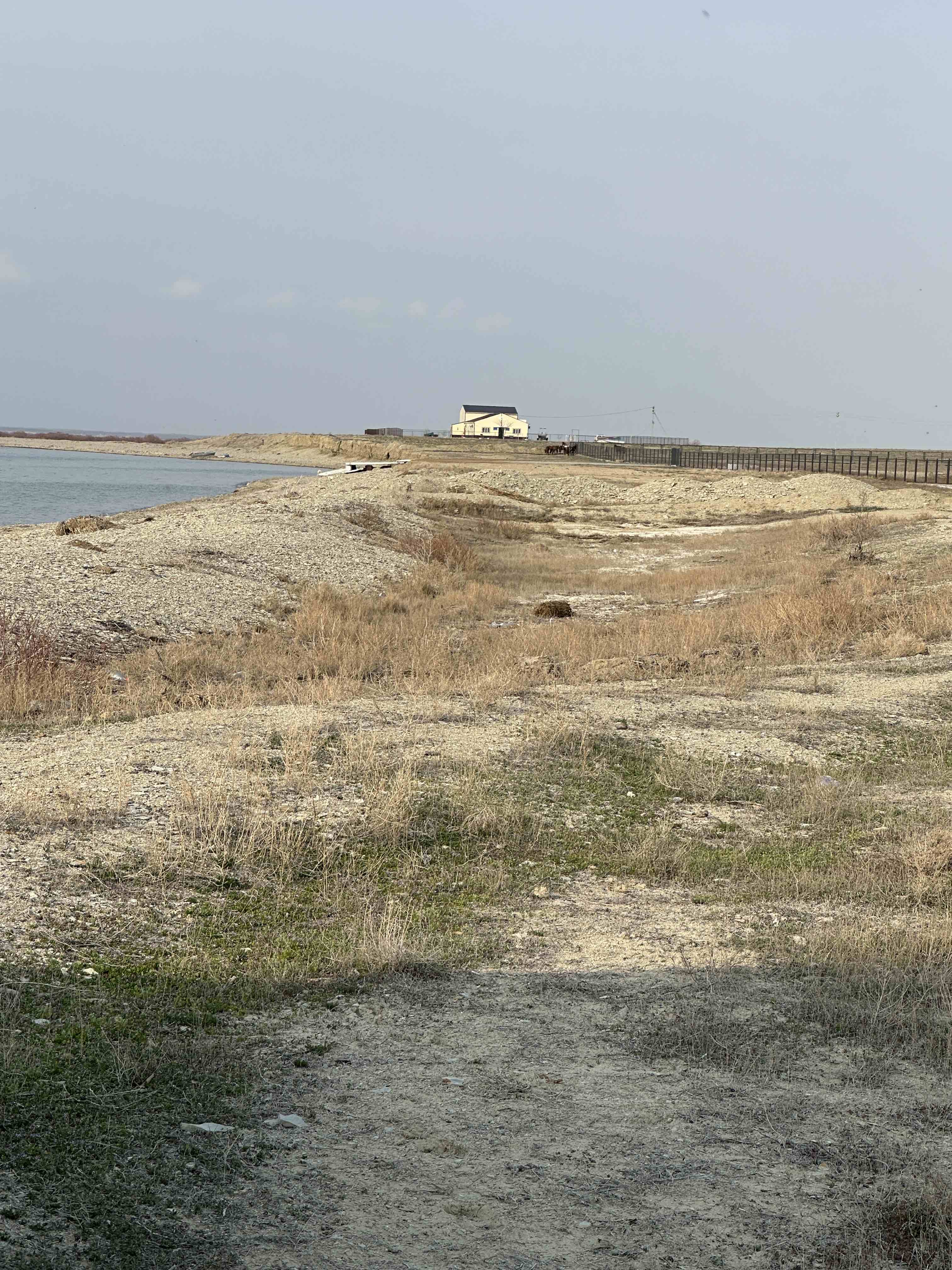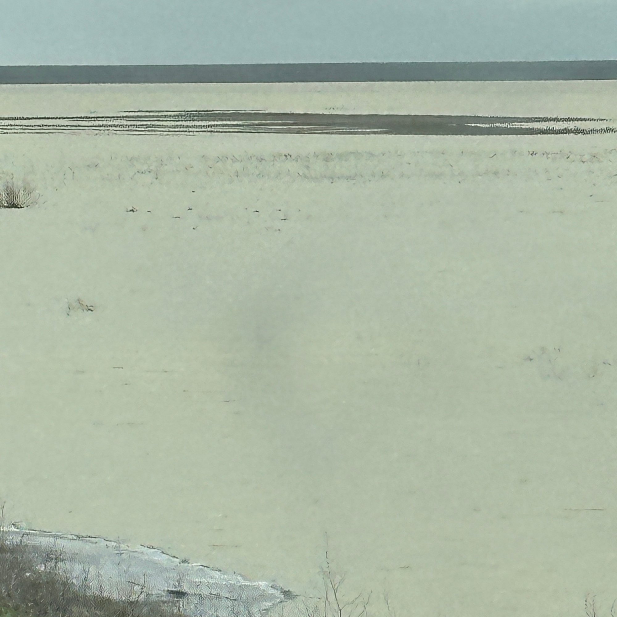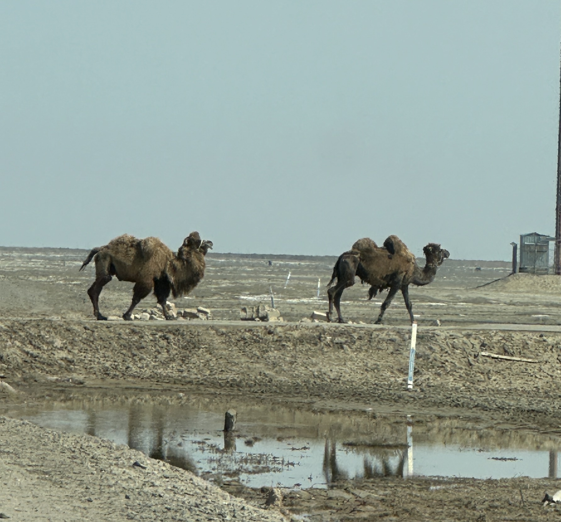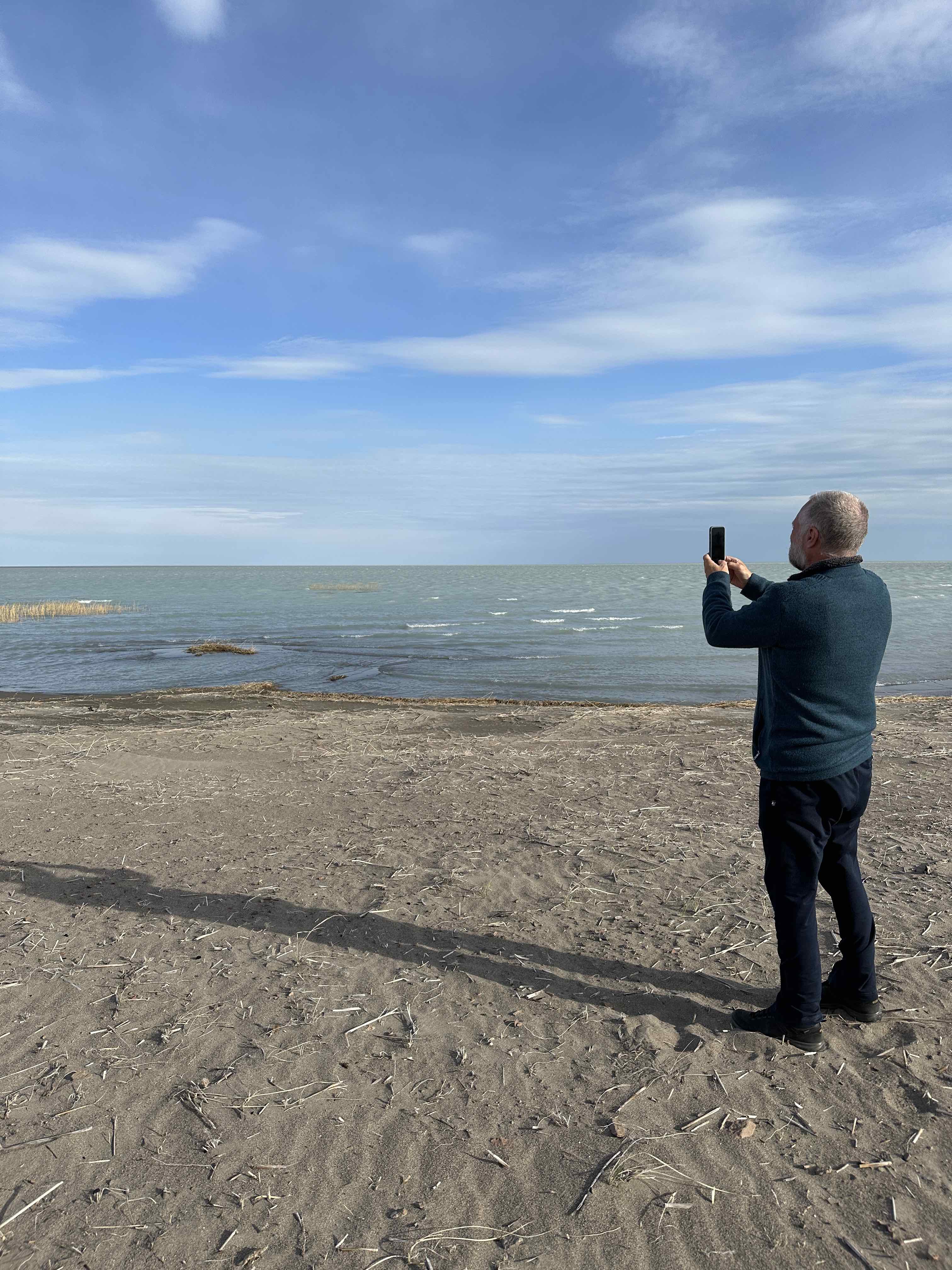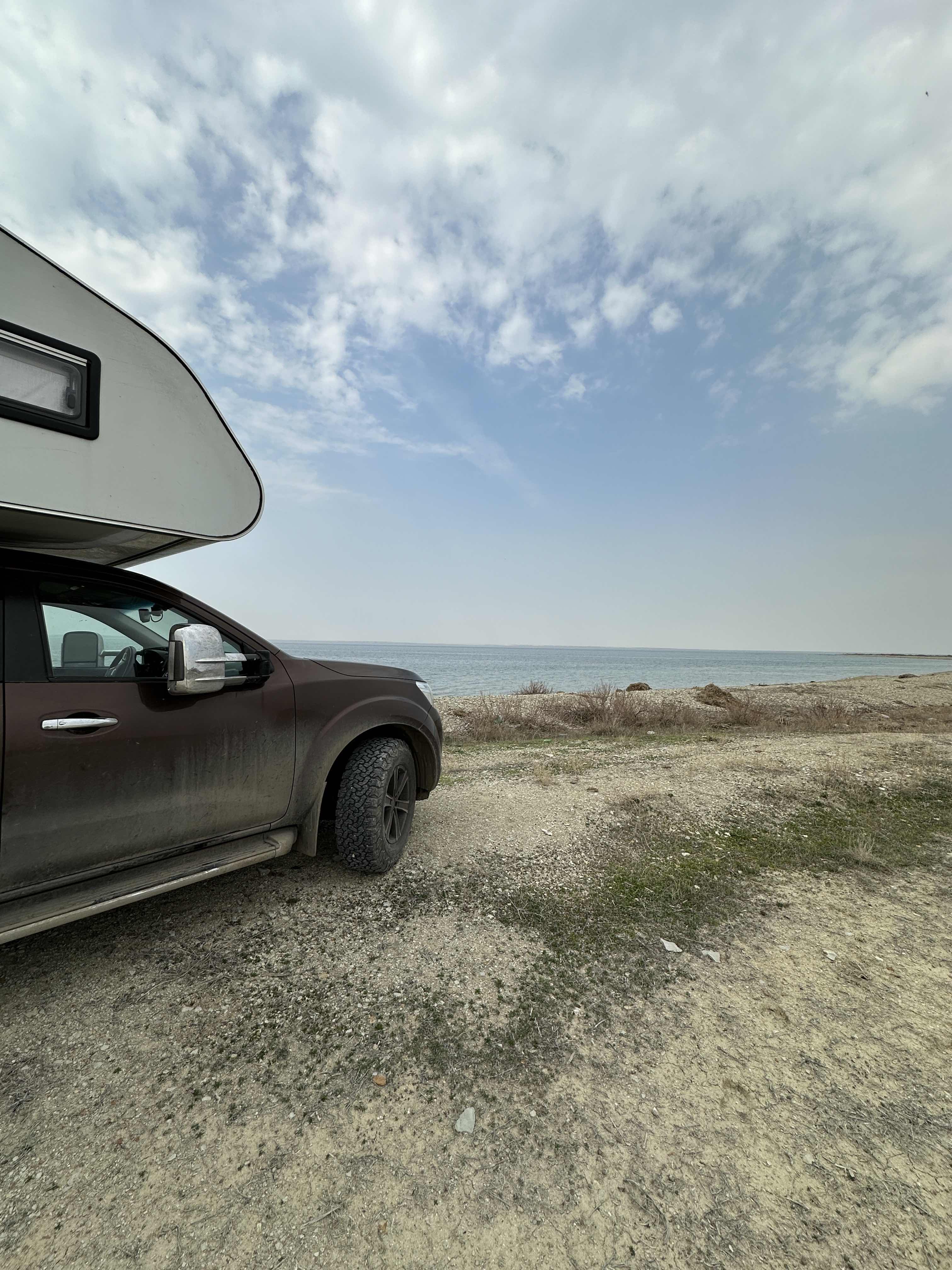 Das Ufer des Kaspischen Meeres erreichen wir mit dem Auto nicht, der Fahrweg wird zunehmend sandiger und matschig. Zurzeit ist der Wasserstand sehr niedrig und ein breiter Uferstreifen besteht aus trocken gefallenem unwegsamem Meeresboden.