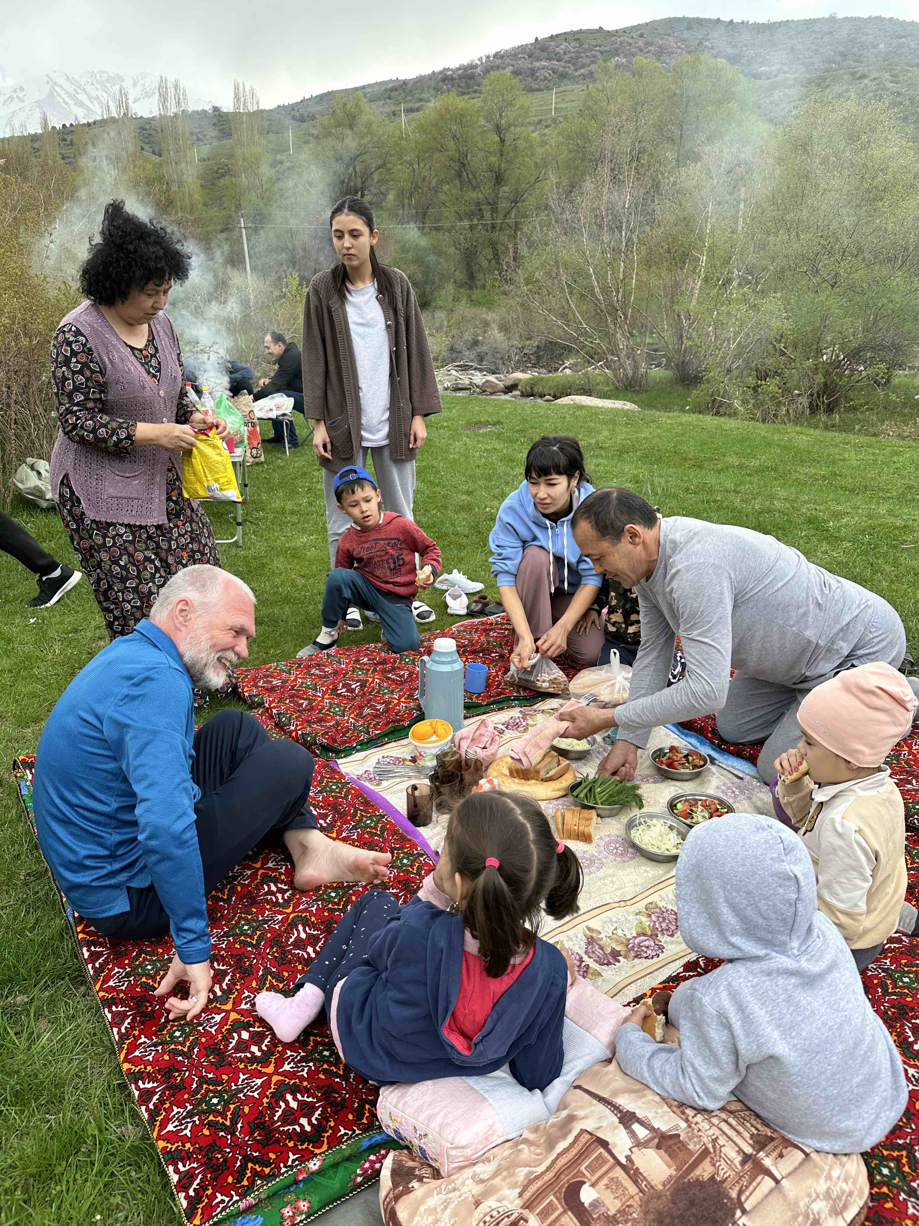 Die 16-jährige Tochter spricht sehr gut Englisch, daher ist die Verständigung kein Problem. Was nicht übersetzt werden kann, wird mit Händen und Füßen ergänzt. Außer zum Tee werden wir auch noch zum Essen eingeladen. Es wird gegrillt, leckere Salate und Brot werden aufgetischt. Gesessen wird auf einer großen Decke, in deren Mitte sich die Speisen türmen.