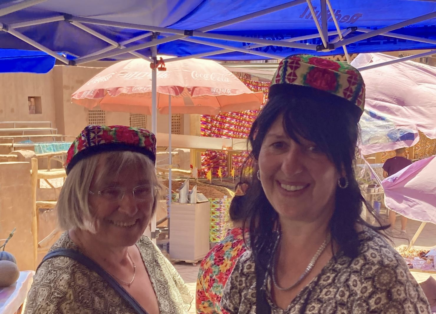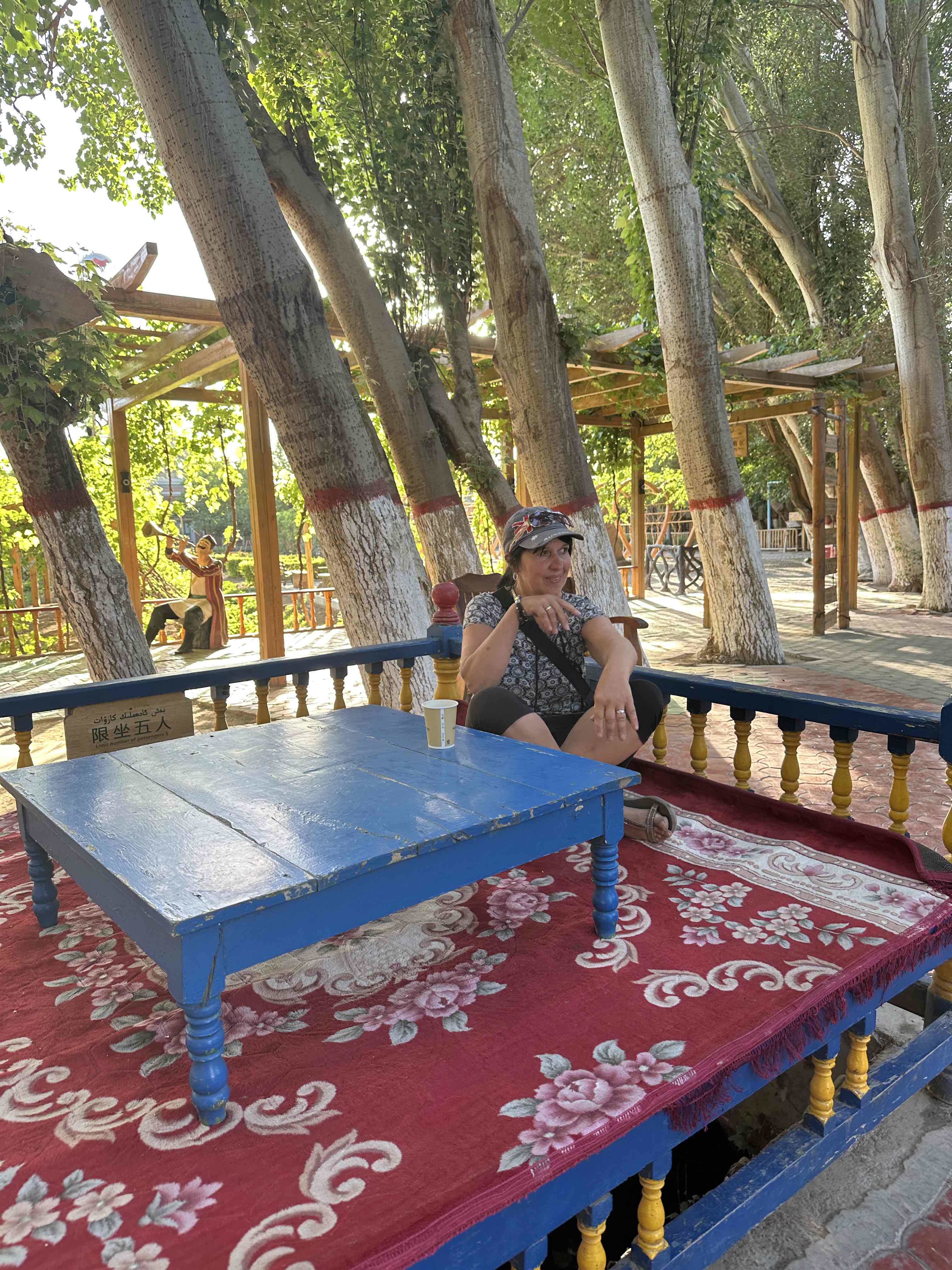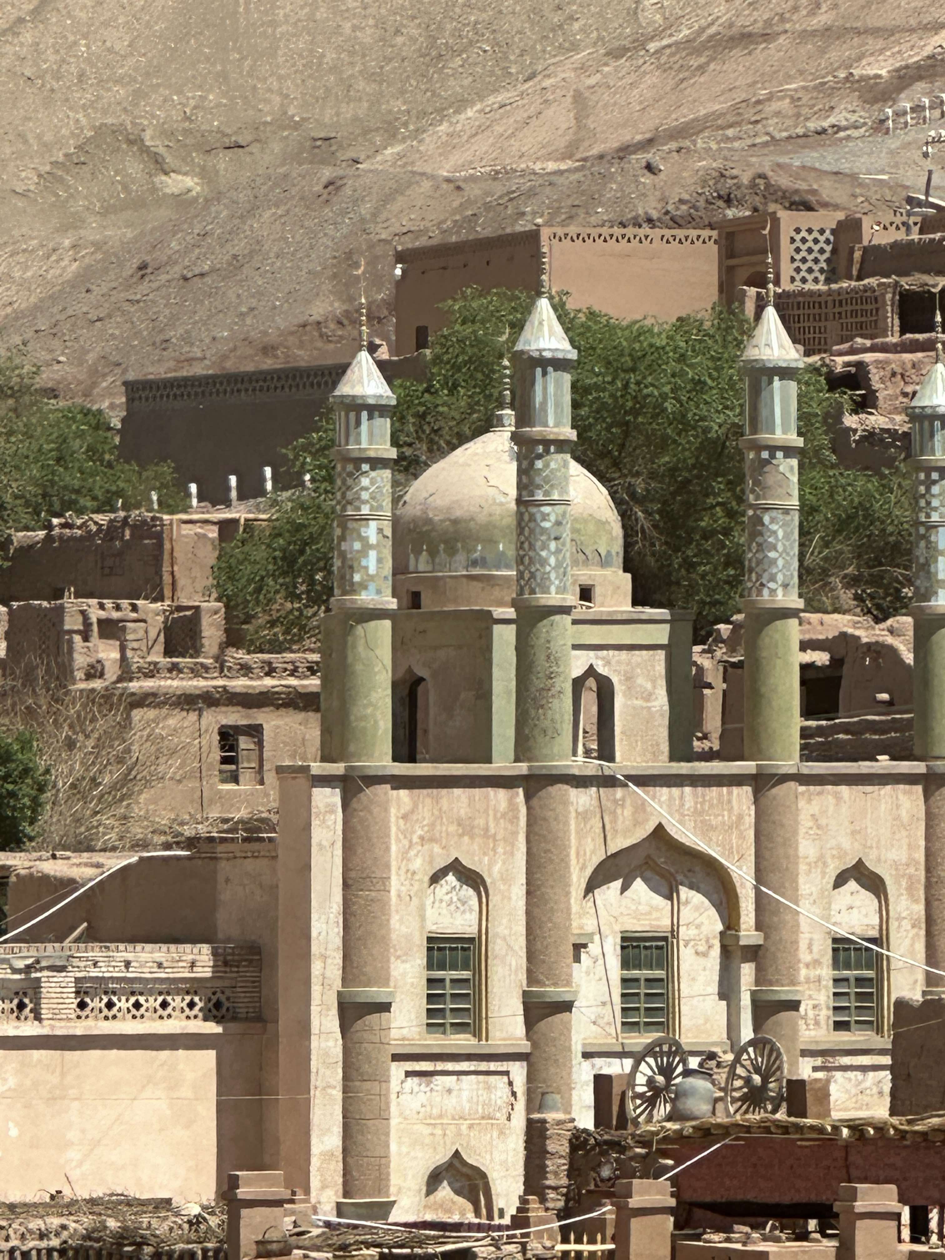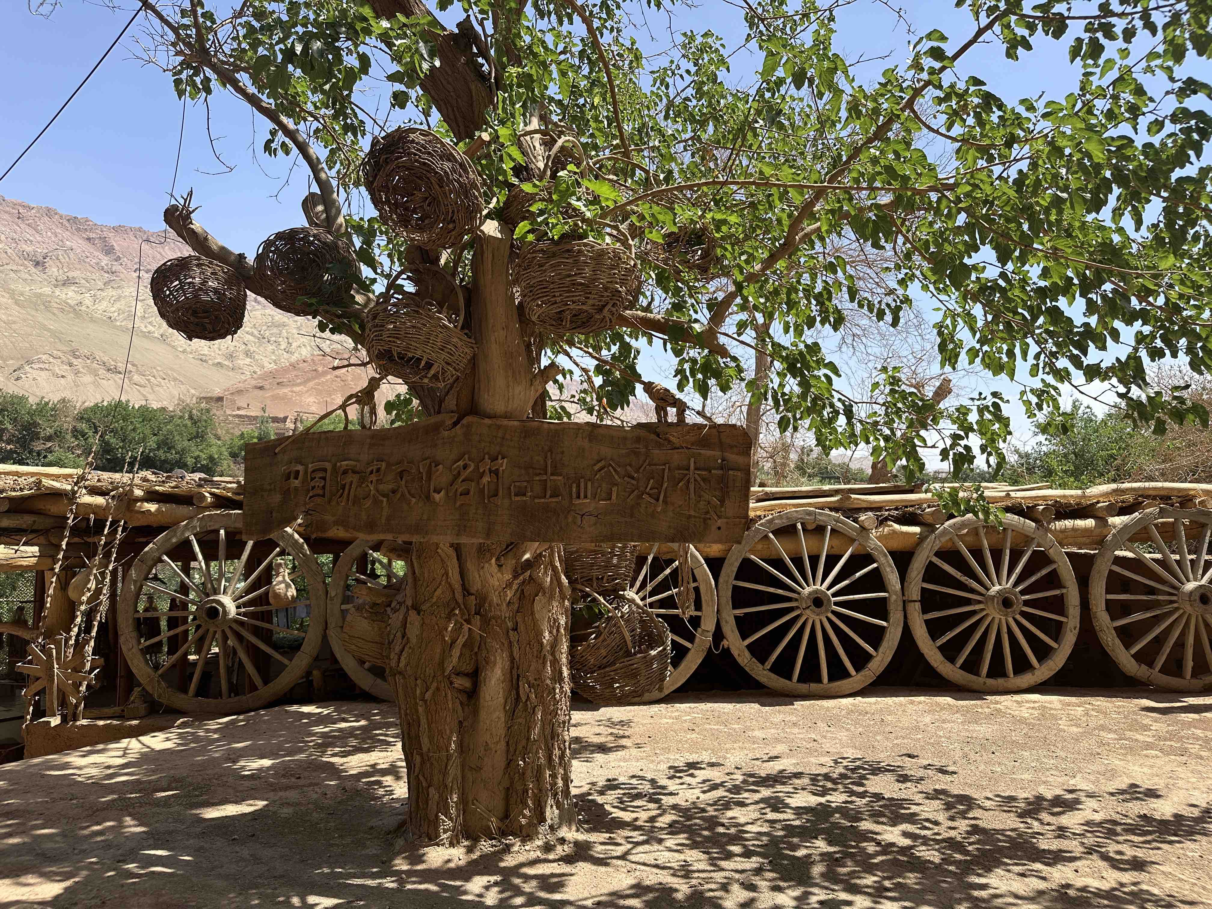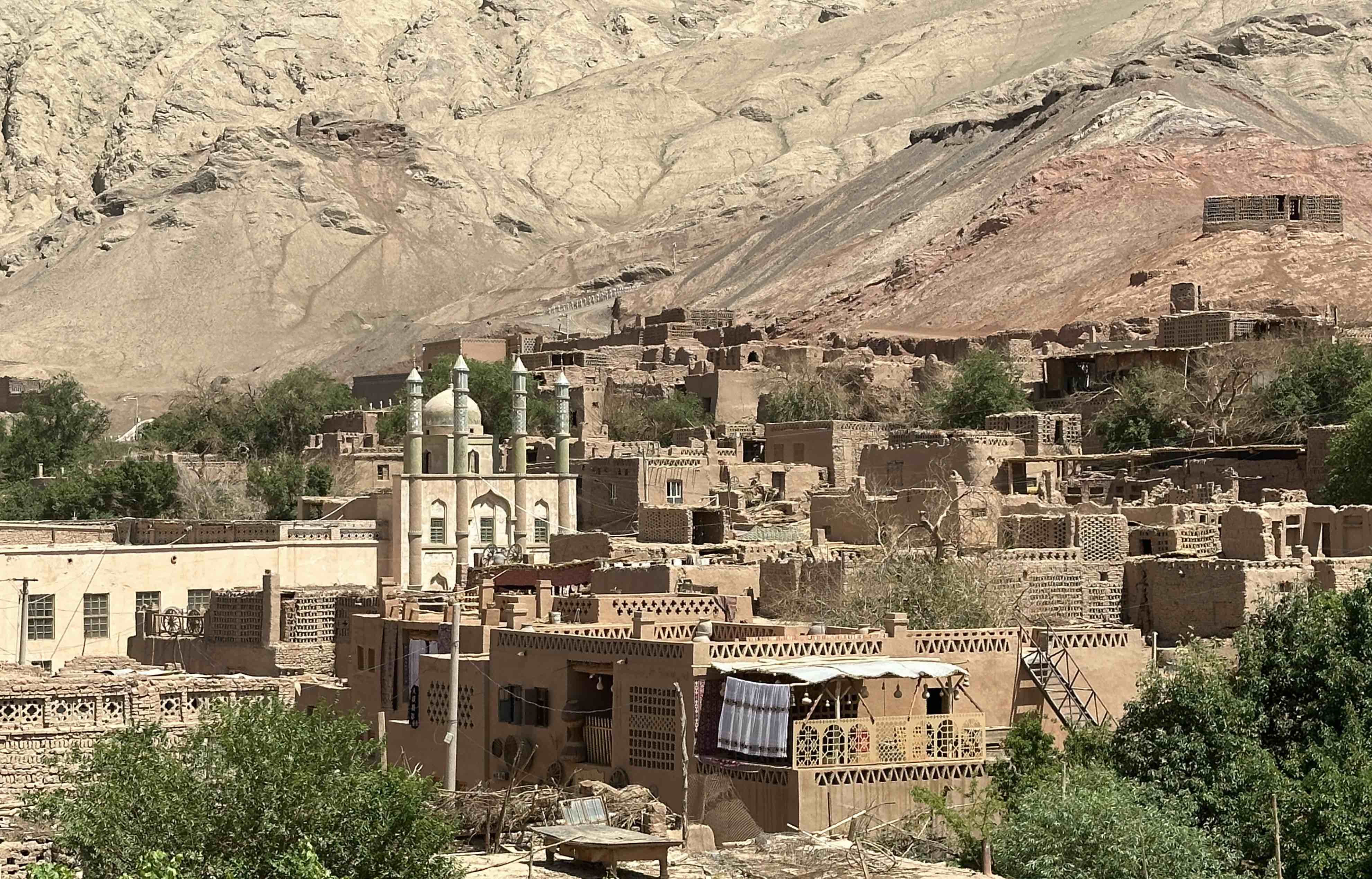 Anschließend besuchen wir das alte uygurische Oasendorf Tuyok in der Taklamakan Wüste. Das Dorf ist für touristische Zwecke erhalten worden und die Besichtigung kostet Eintritt. Struppi darf leider nicht mit rein und René bleibt bei ihm auf dem Parkplatz. Wir bummeln durch das Dorf mit den wirklich schönen im alten Stil erhaltenen Gebäuden. Natürlich gibt es auch viele Verkaufsstände. Auch sehen wir zum ersten Mal wunderschöne Trachten, die nicht zum Verkauf, sondern zum Verleih angeboten werden. Diese Geschäftsidee wird uns überall in China begegnen, mit den jeweils typischen Gewändern der Region.