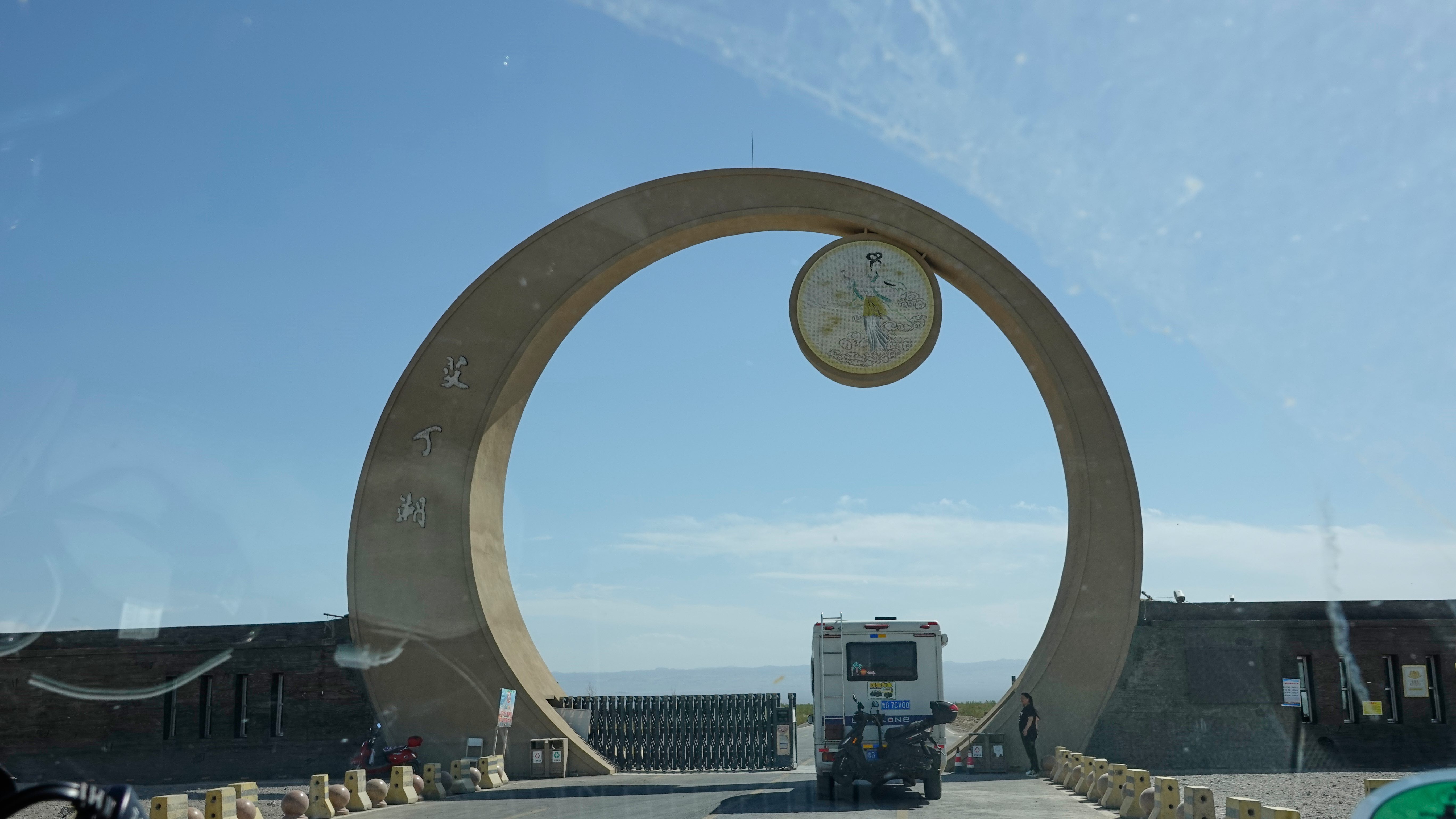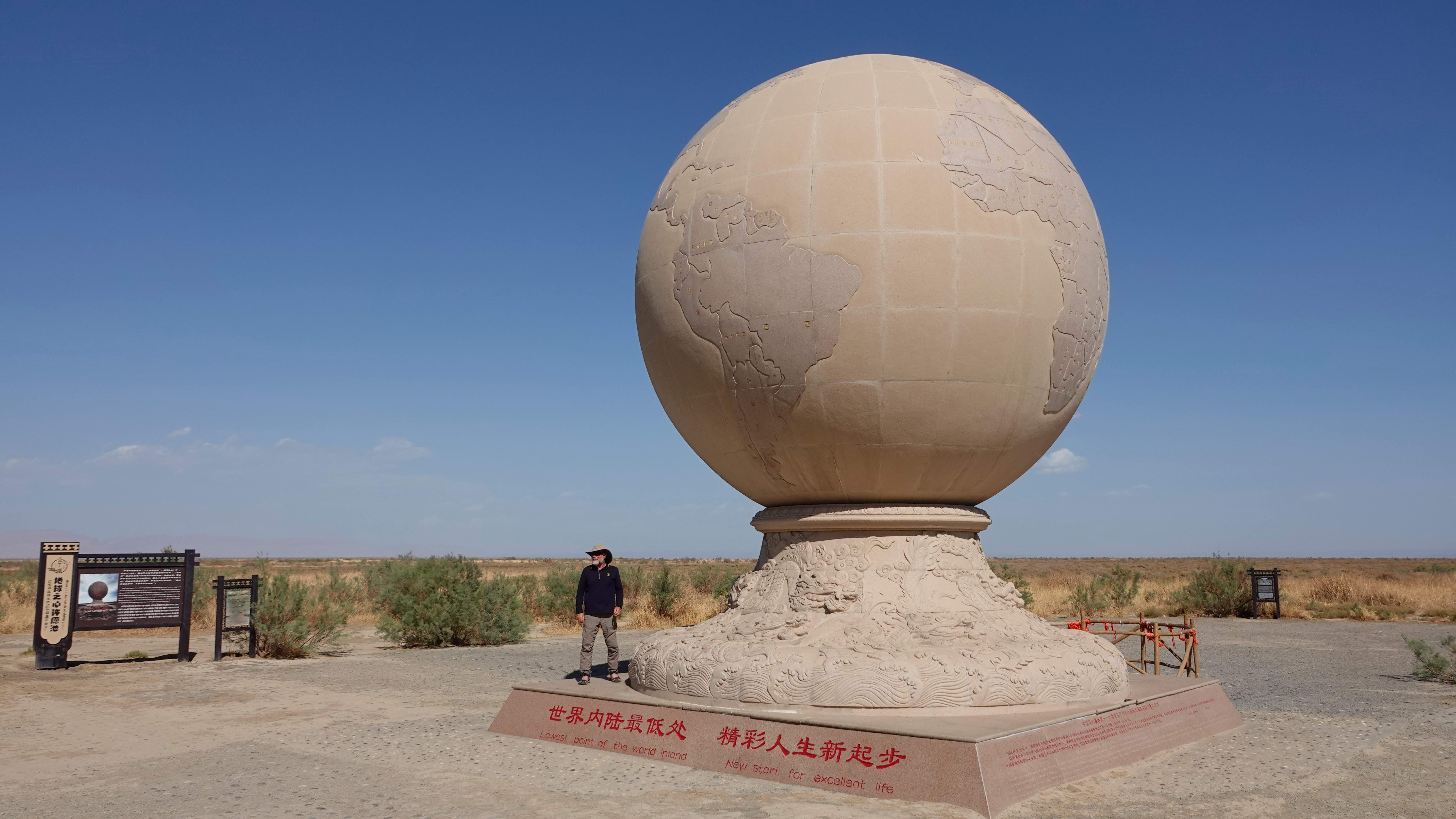 Wenn die Hitze uns hier schon zu schaffen machte, steigt sie beim nächsten Stopp nochmal um einige Grad auf sagenhafte 45,8 Grad. Wir wandern zum tiefsten Punkt Chinas oberhalb der Erde bei -153 m unter NN. Der schön angelegter Pfad am Ayding Lake endet an einer großen Weltkugel.
