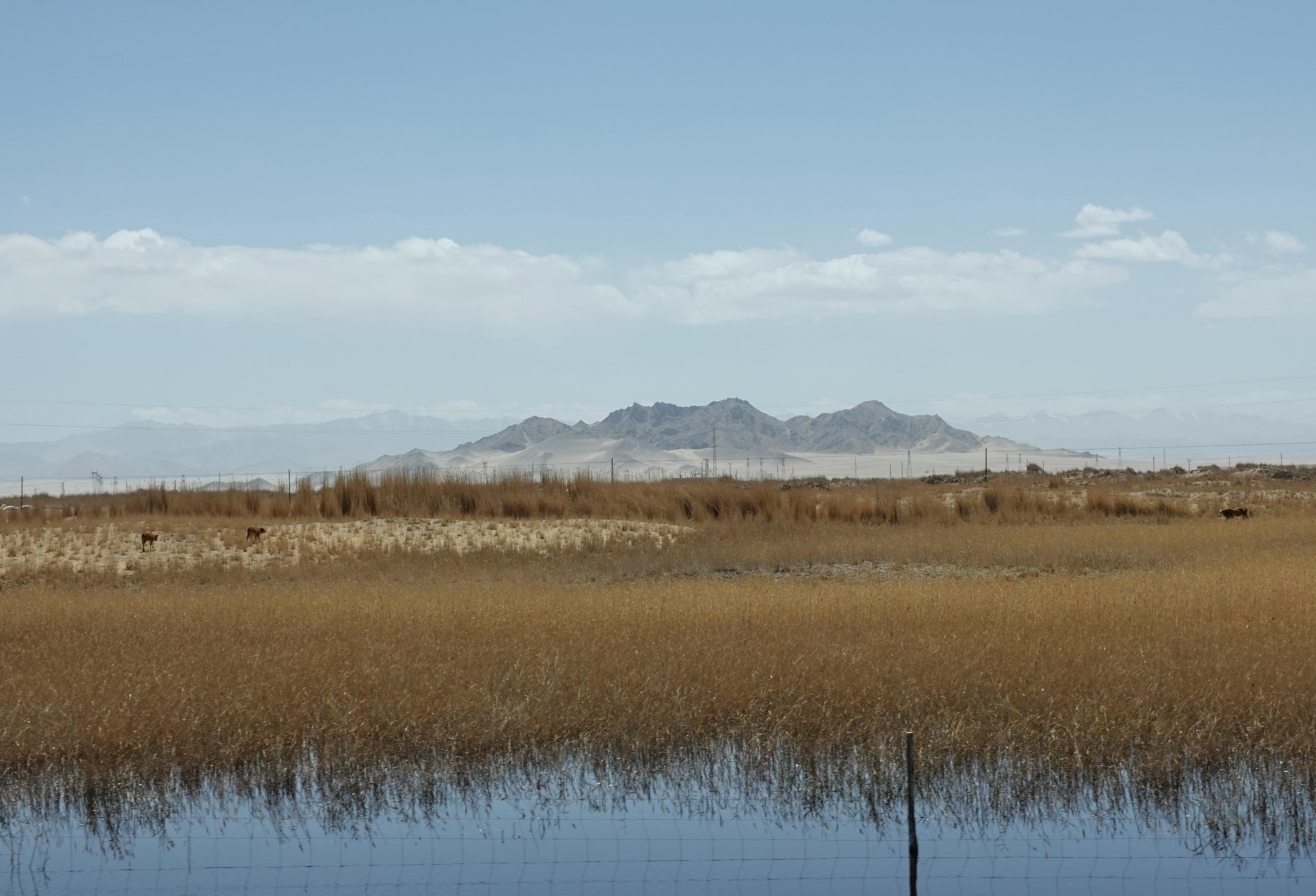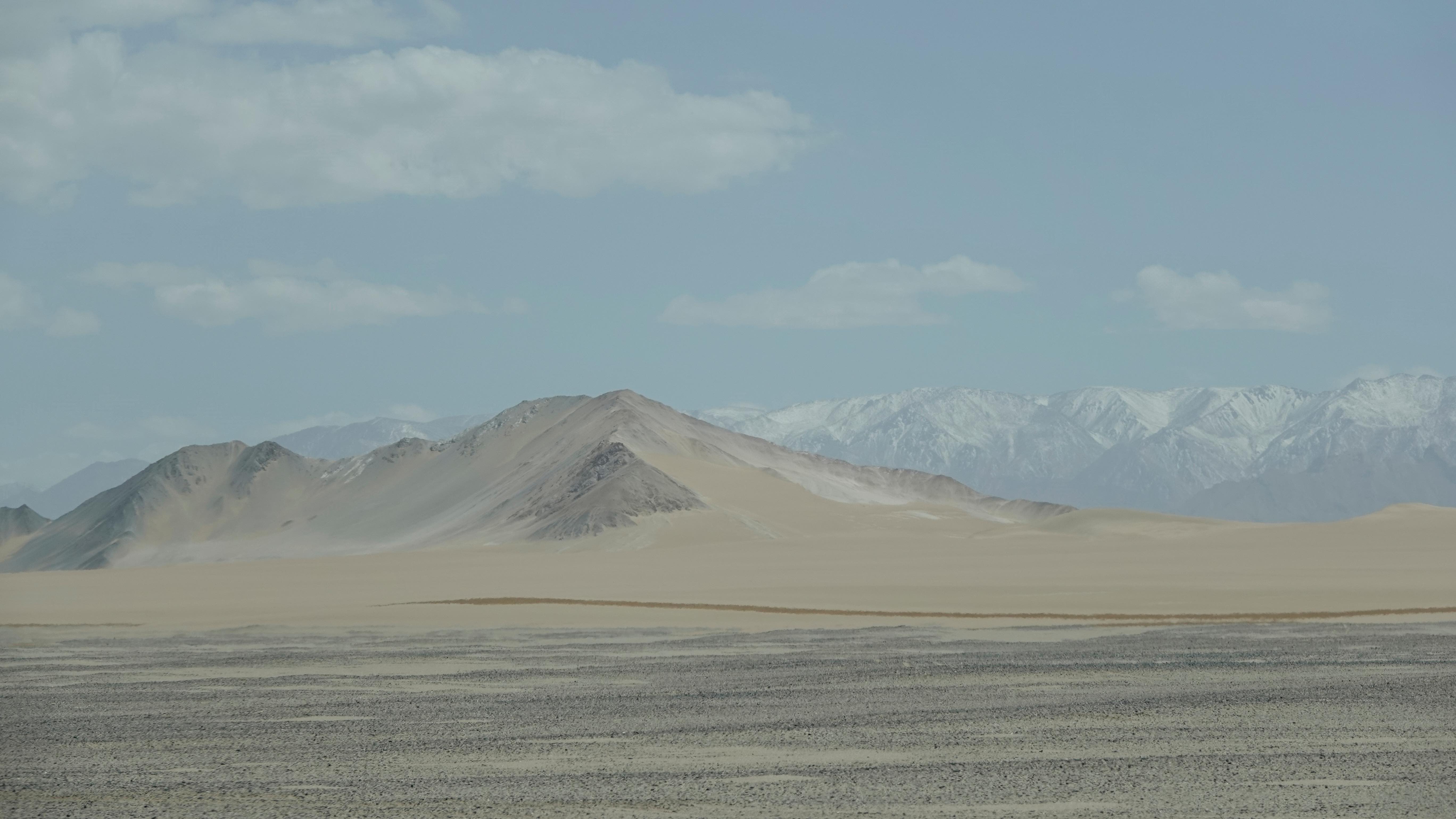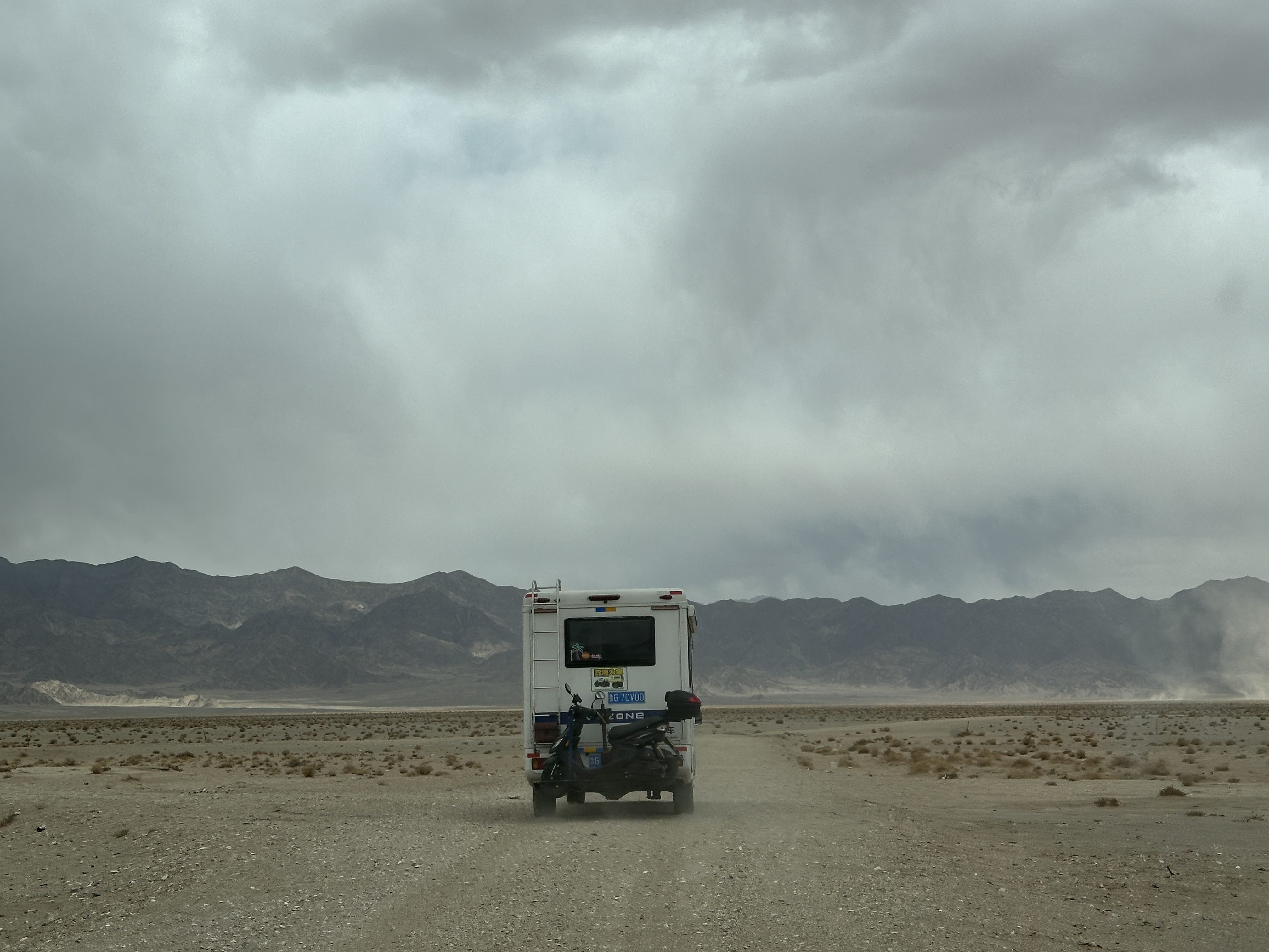 Die Fahrt geht weiter entlang der nördlichen Seite des Tibetanischen Plateaus, durch Wüste und Steppenlandschaft, in der Ferne sind schneebedeckte Berge zu sehen.