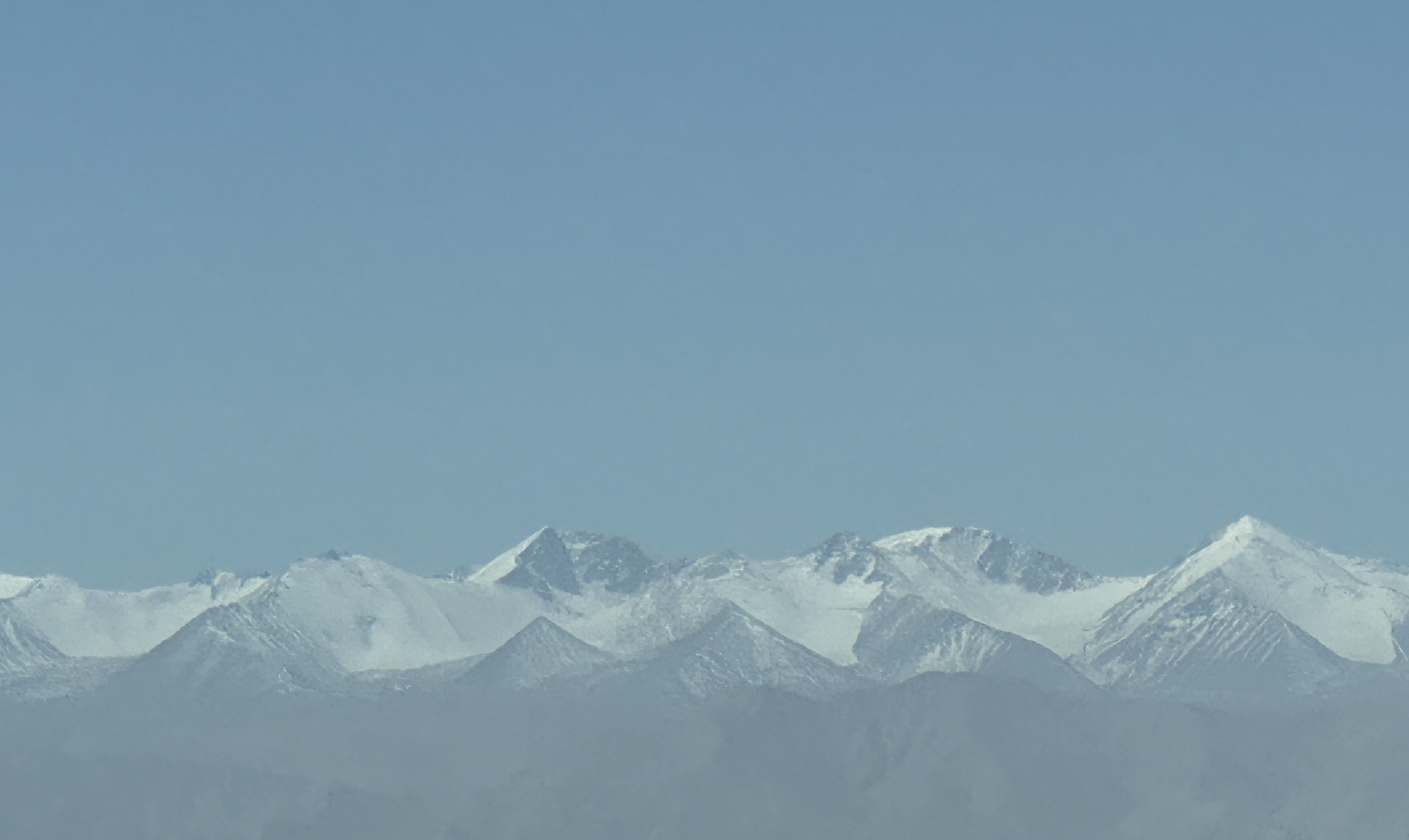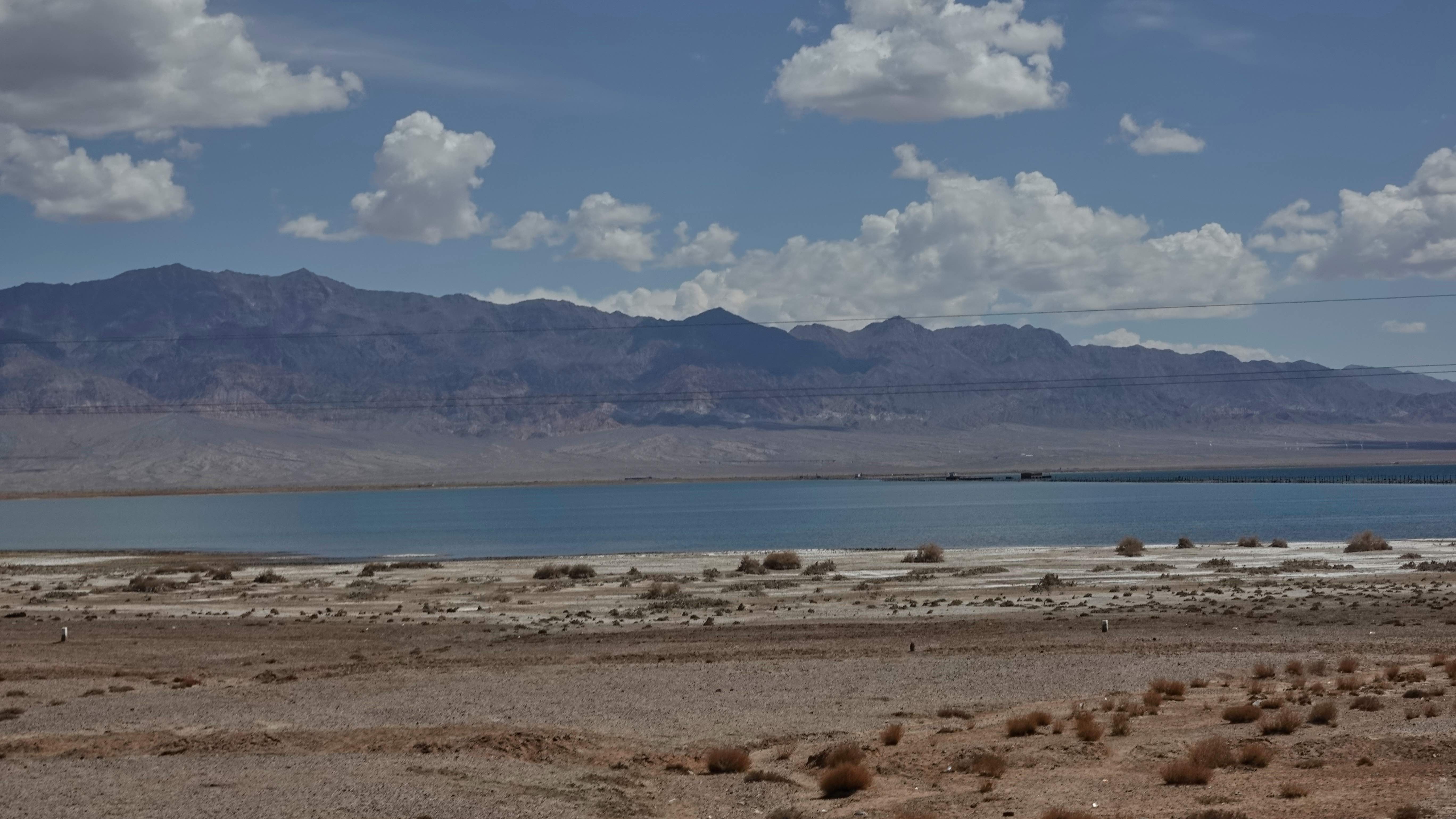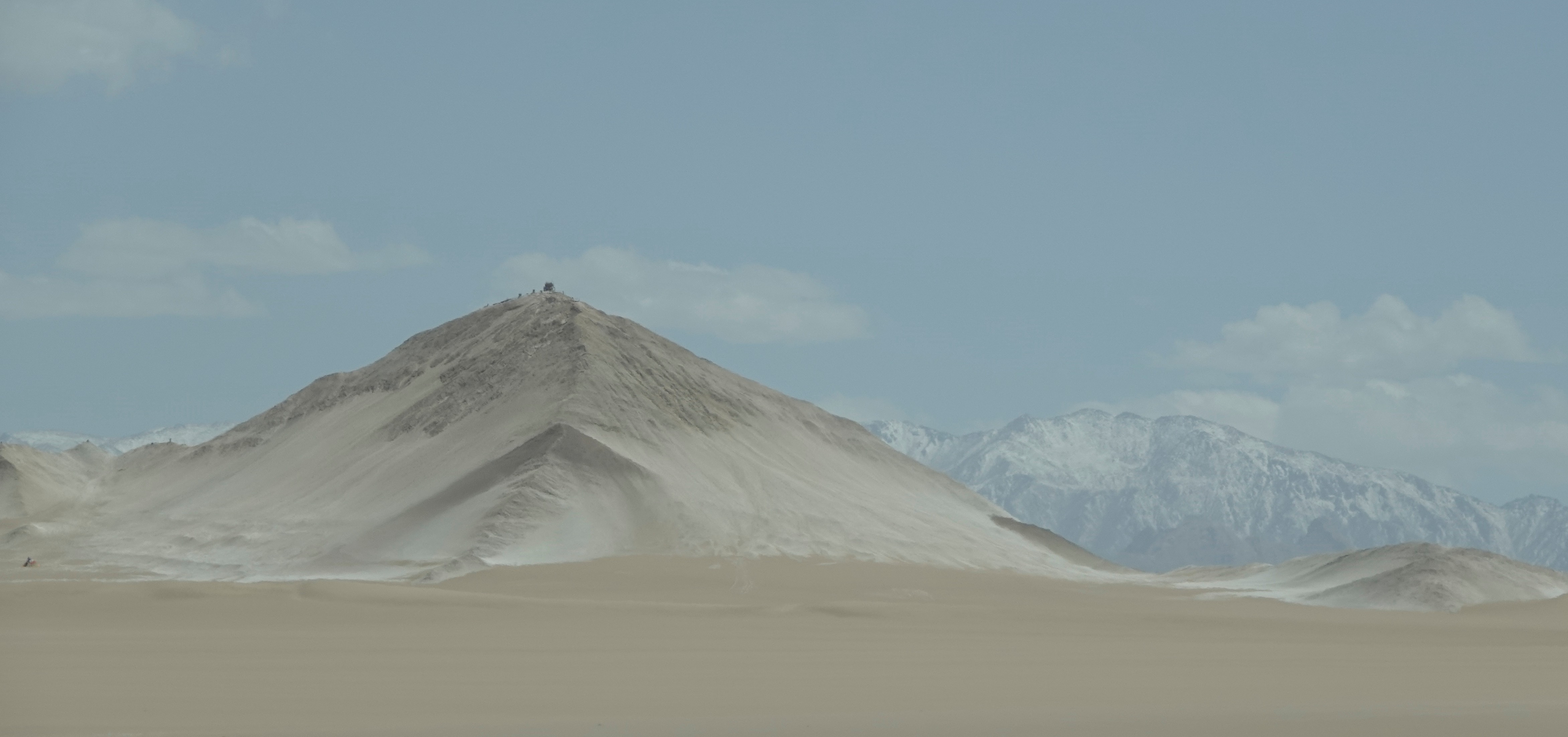 Die Fahrt geht weiter entlang der nördlichen Seite des Tibetanischen Plateaus, durch Wüste und Steppenlandschaft, in der Ferne sind schneebedeckte Berge zu sehen.