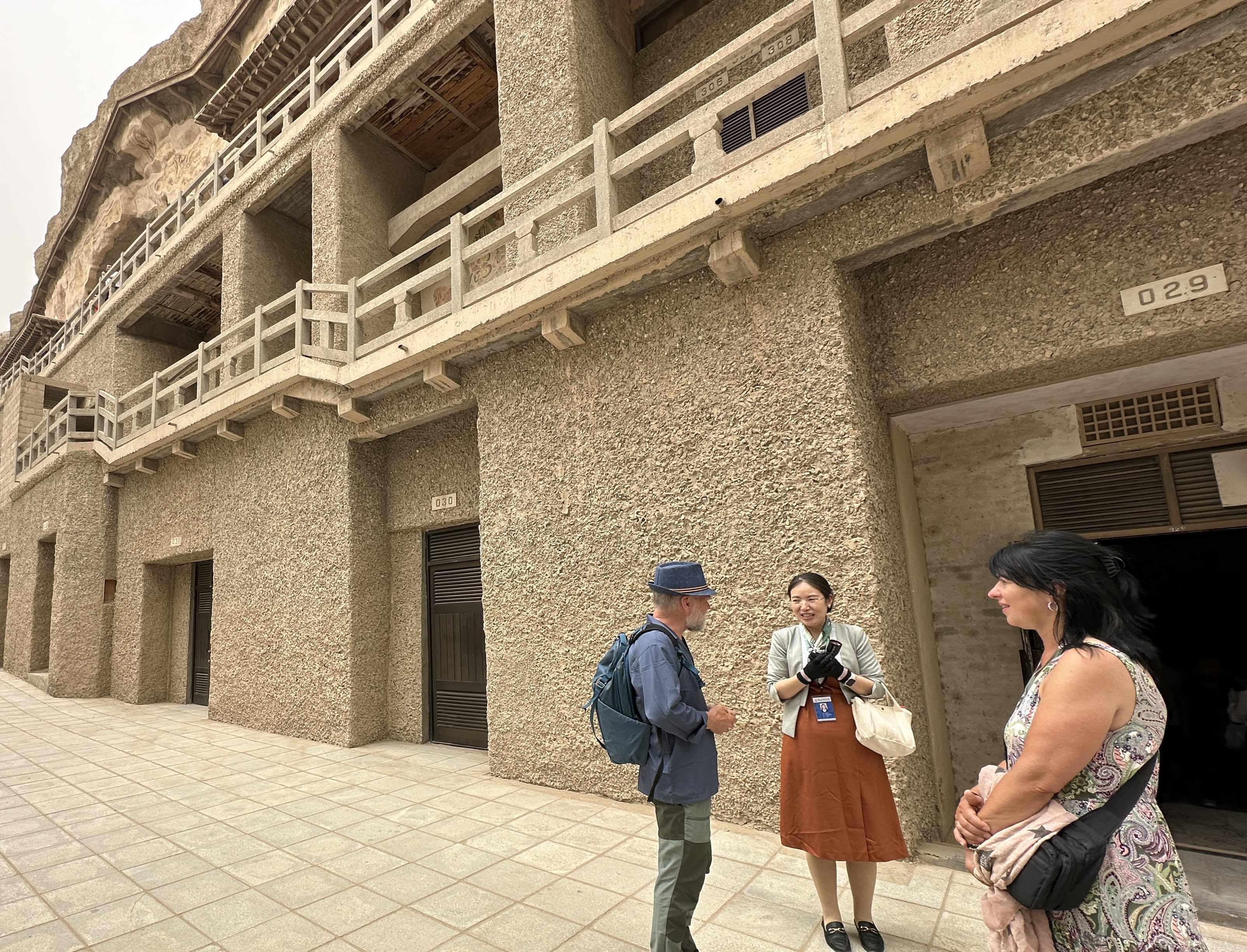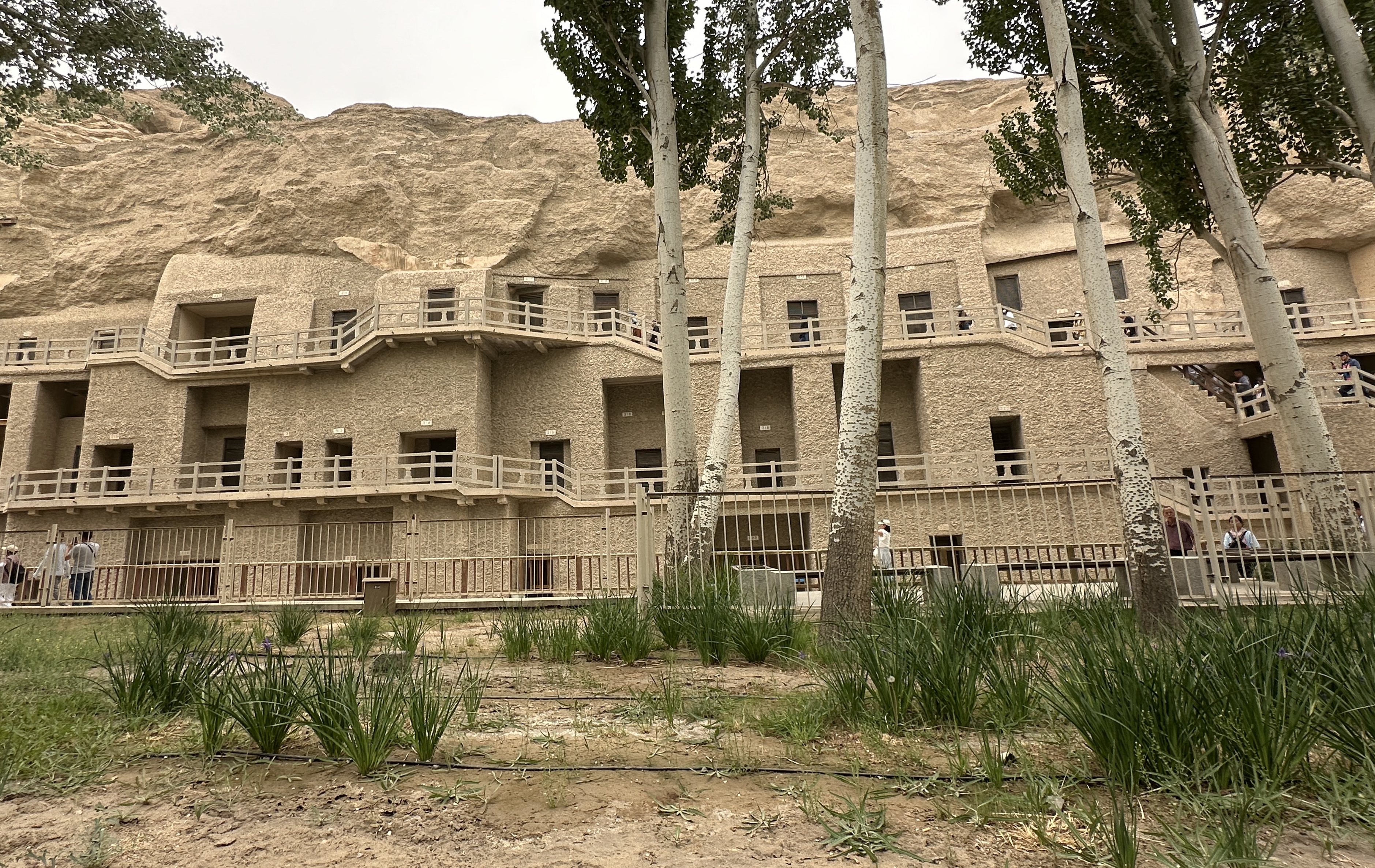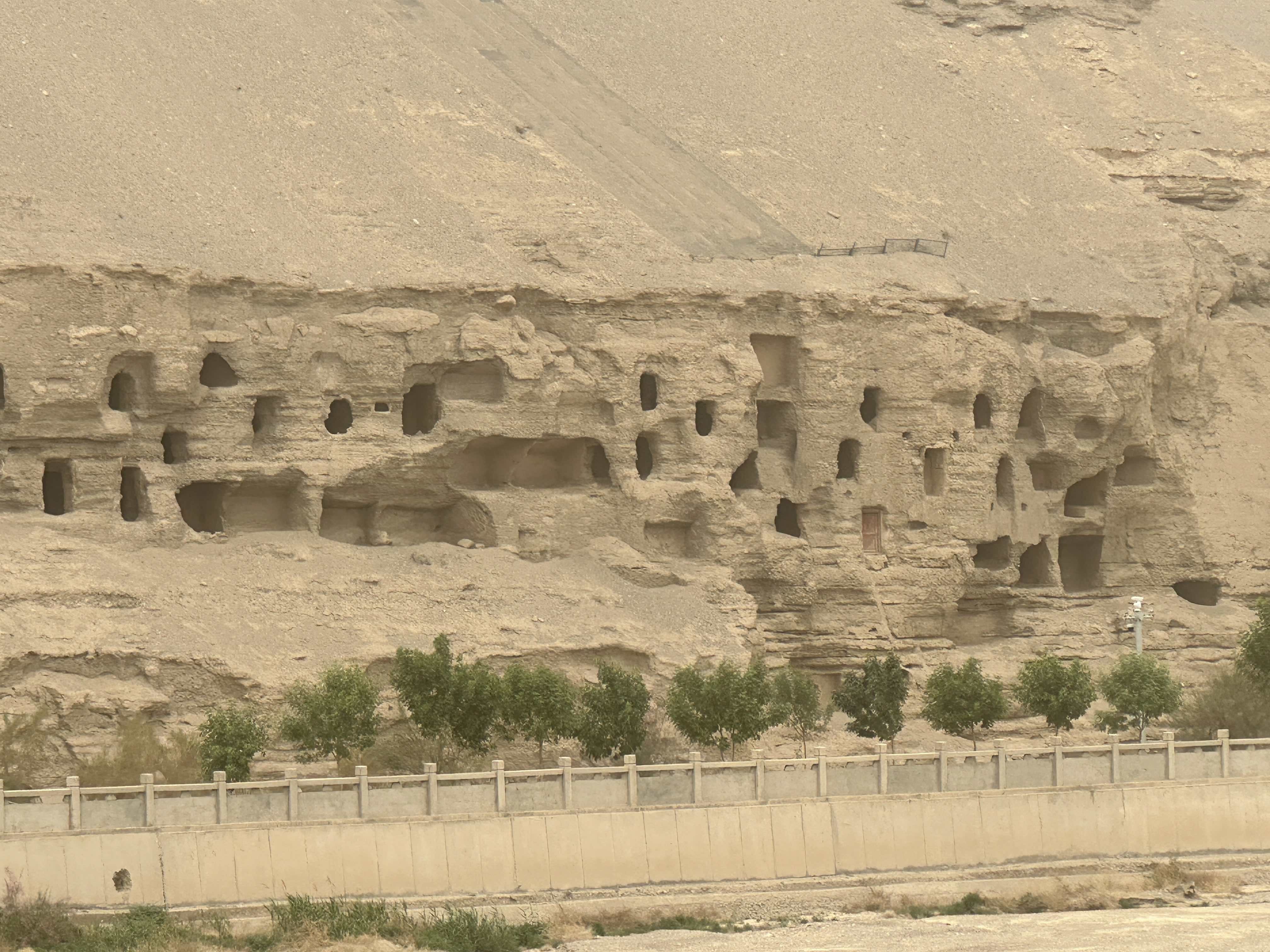 Am nächsten Tag ist die Besichtigung der Mogao-Grotten geplant, ein Unesco World Heritage Site. Der Eintritt ist happig, aber wir kriegen allerhand geboten. Zur Einführung werden 2 Filme gezeigt und mit dem Bus werden wir zu den Grotten gefahren. Von außen ist nicht viel zu sehen: Eine Reihe von verschlossenen Kammern (über 700), die in den Fels gehauen wurden. Im Jahr 366 wurde mit dem Bau begonnen und bis ins 14. Jahrhundert fortgeführt. Deshalb sind auch neben den buddhistischen auch hinduistische und christliche Einflüsse zu erkennen.