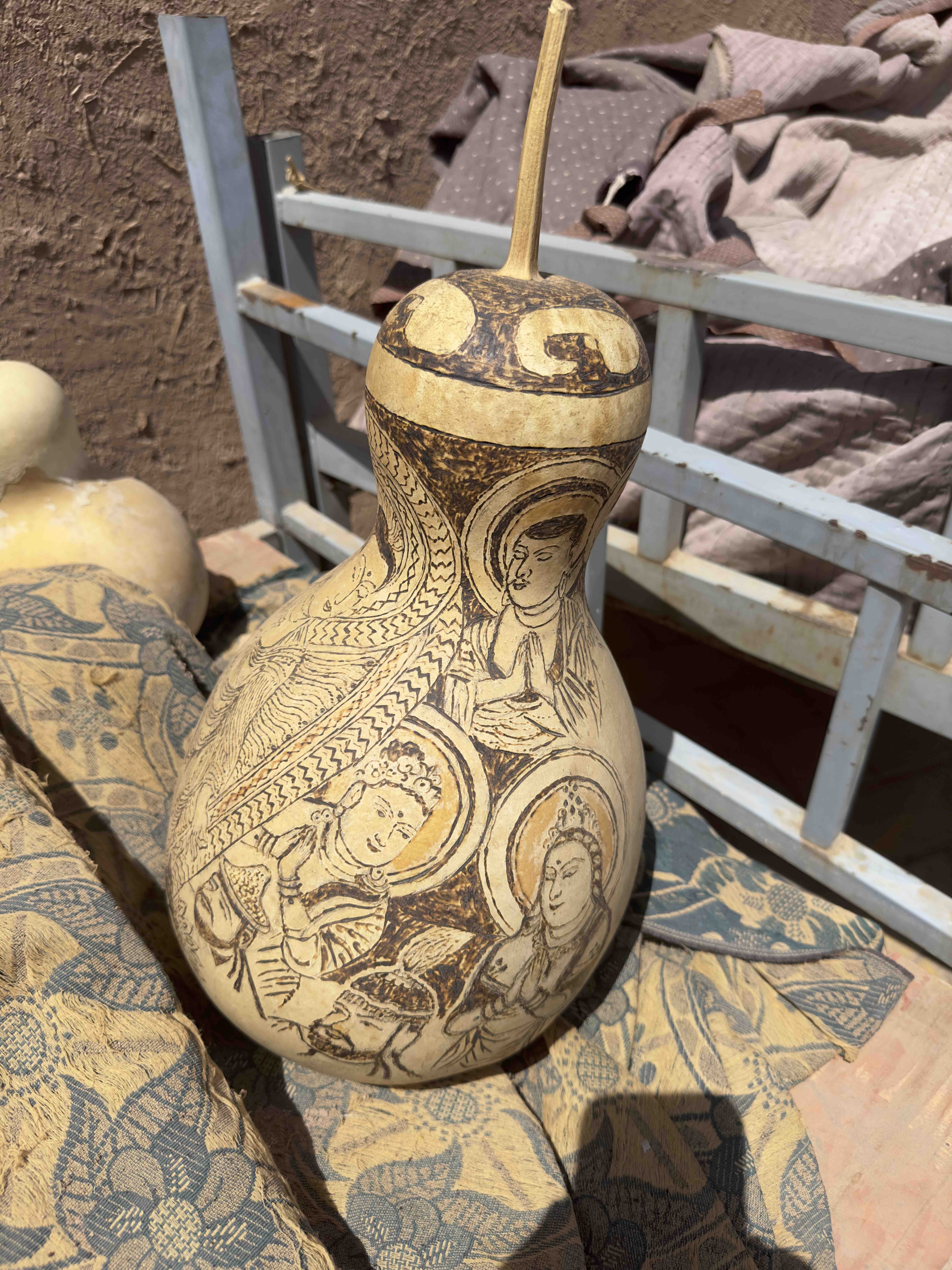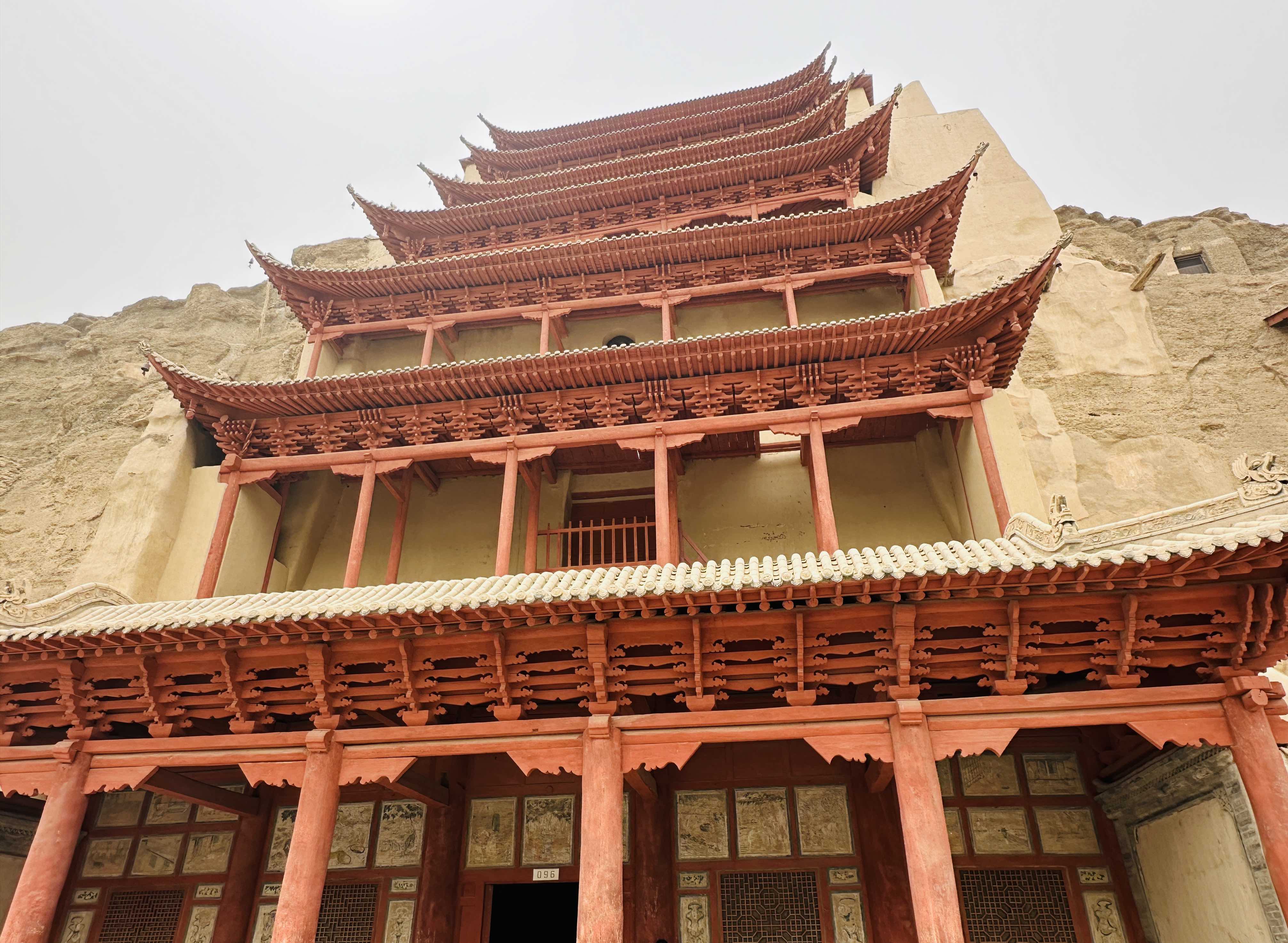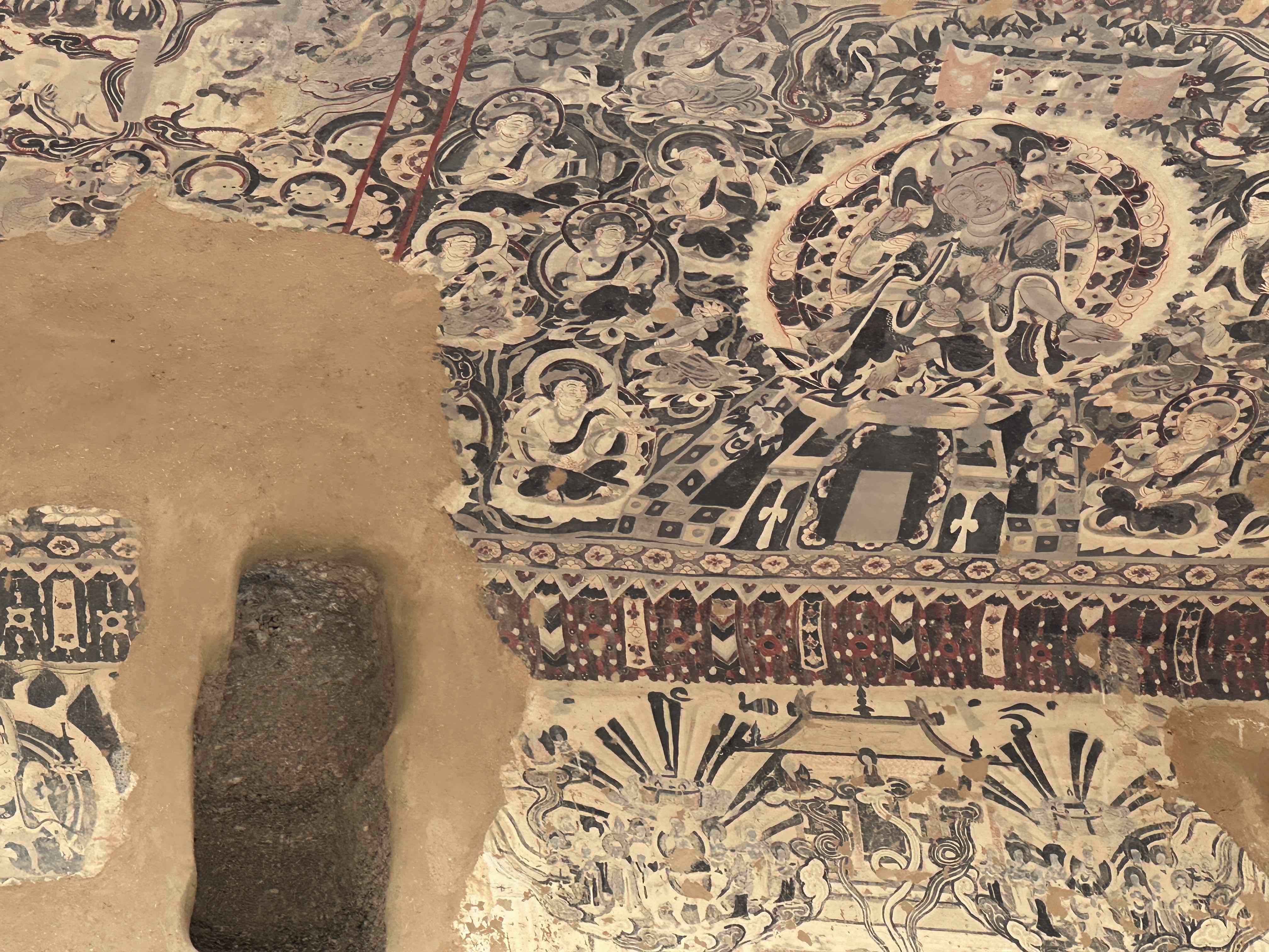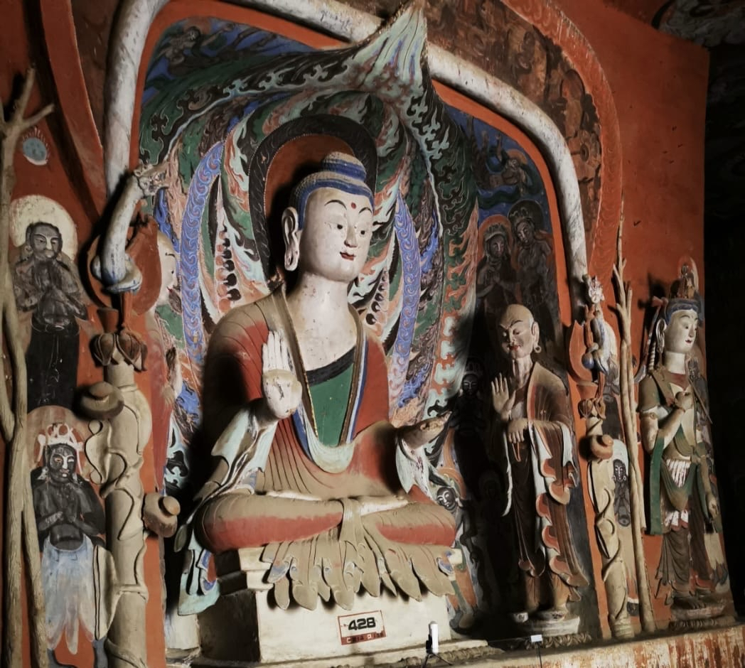 Am nächsten Tag ist die Besichtigung der Mogao-Grotten geplant, ein Unesco World Heritage Site. Der Eintritt ist happig, aber wir kriegen allerhand geboten. Zur Einführung werden 2 Filme gezeigt und mit dem Bus werden wir zu den Grotten gefahren. Von außen ist nicht viel zu sehen: Eine Reihe von verschlossenen Kammern (über 700), die in den Fels gehauen wurden. Im Jahr 366 wurde mit dem Bau begonnen und bis ins 14. Jahrhundert fortgeführt. Deshalb sind auch neben den buddhistischen auch hinduistische und christliche Einflüsse zu erkennen.
