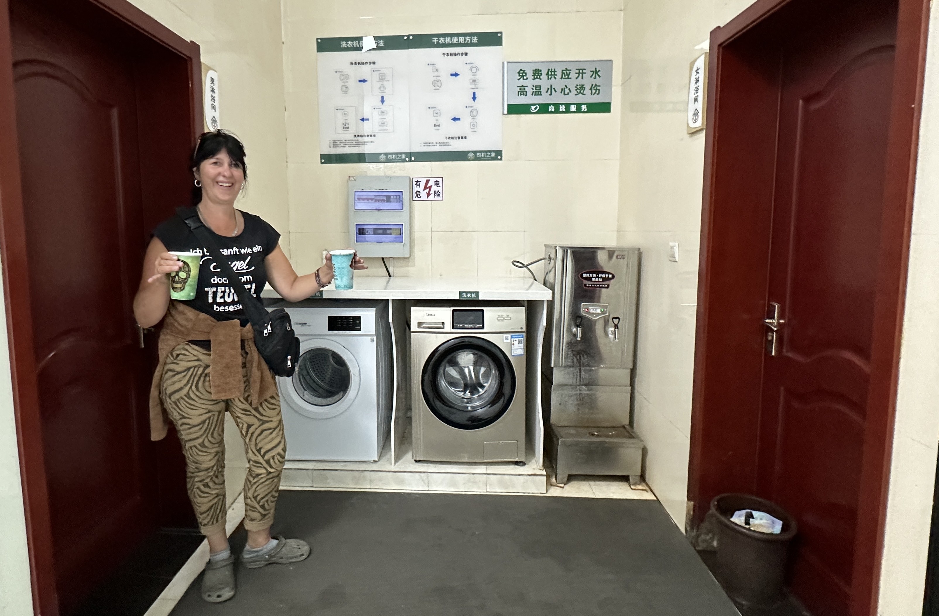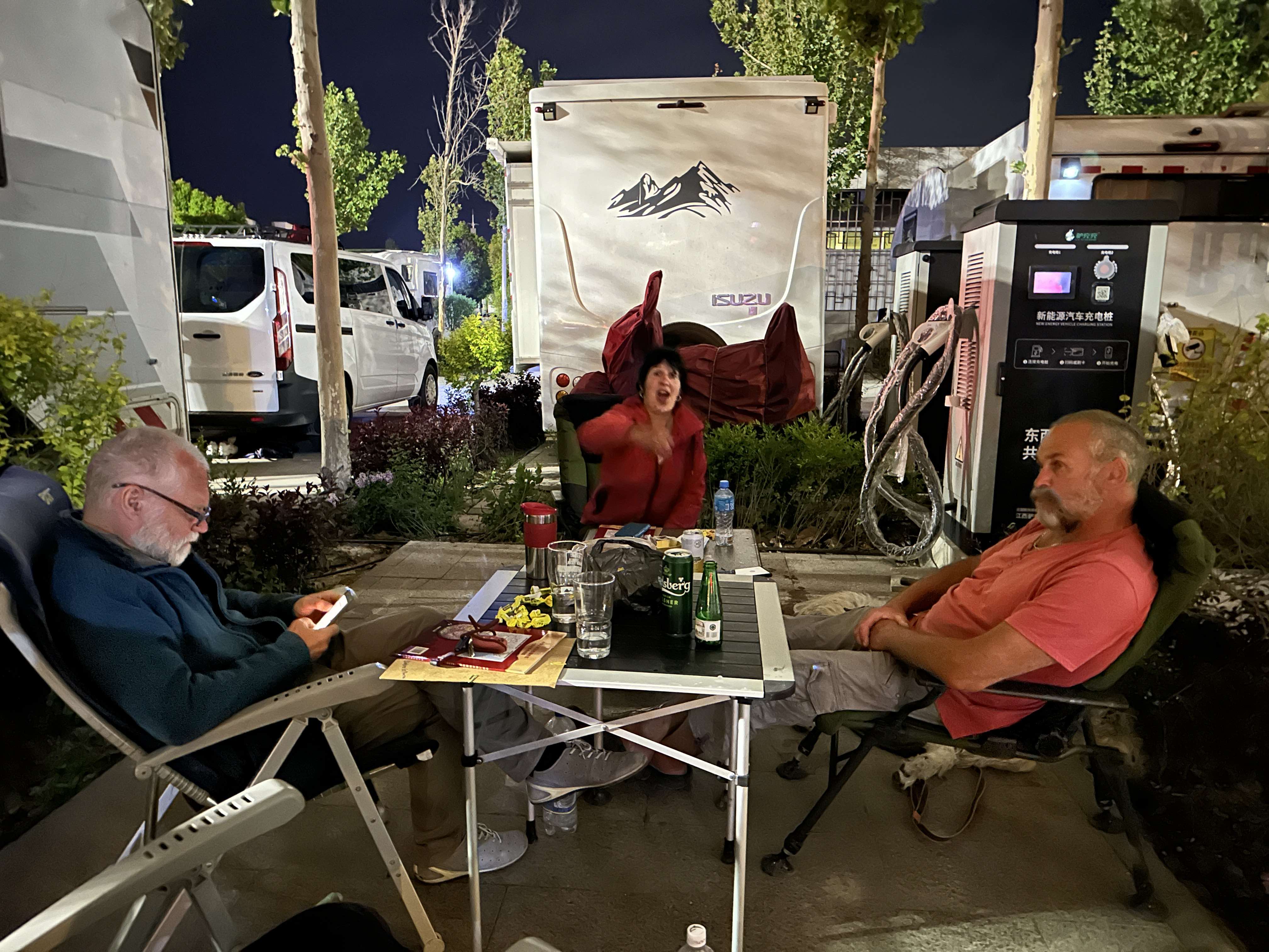 Inzwischen bekommen wir Besuch von mehreren Polizisten, die wissen wollen, warum wir hier parken. Als Yinchou zurückkehrt, machen sie deutlich, dass es nicht gestattet wird, hier zu bleiben, wir dürfen allerdings noch kurz in die Stadt laufen und unsere Besorgungen machen: Geld holen, SIM-Karte besorgen (sehr günstig: 192 GB für 2 Monate für 100 Yuan = 12,50 € ) und etwas einkaufen (der Kühlschrank ist ja wie erwähnt, ziemlich leer). Mit einer Reiseleiterin an unserer Seite sind alle Erledigungen schnell und einfach erledigt, echt klasse! Die Nacht müssen wir allerdings auf den Campingplatz in der Stadt verbringen, der sehr gut ausgestattet und außerordentlich günstig ist (1,50 € für 1 Nacht). Wir sitzen noch ein Weilchen gemütlich zusammen und sind gespannt auf den nächsten Tag.