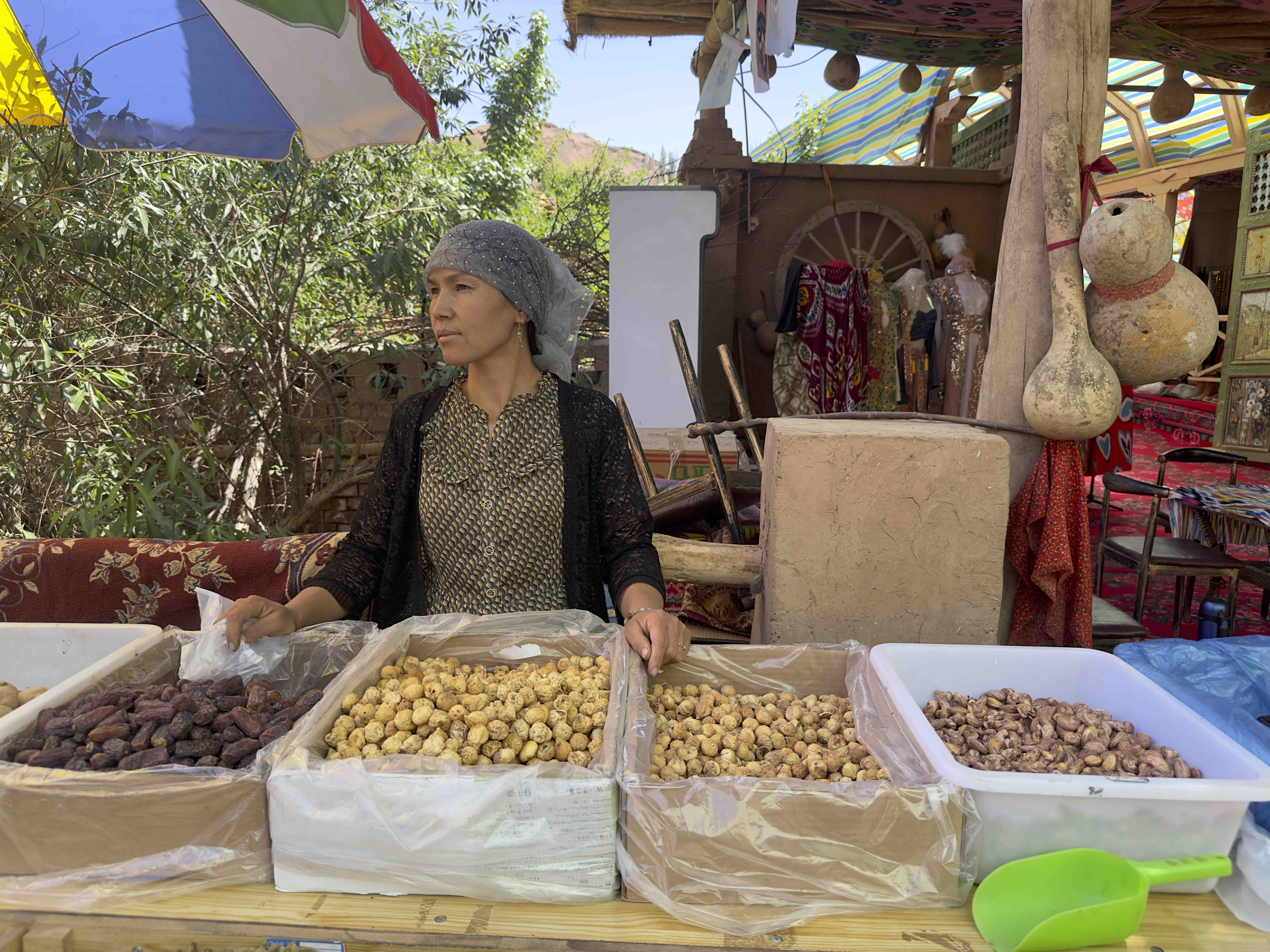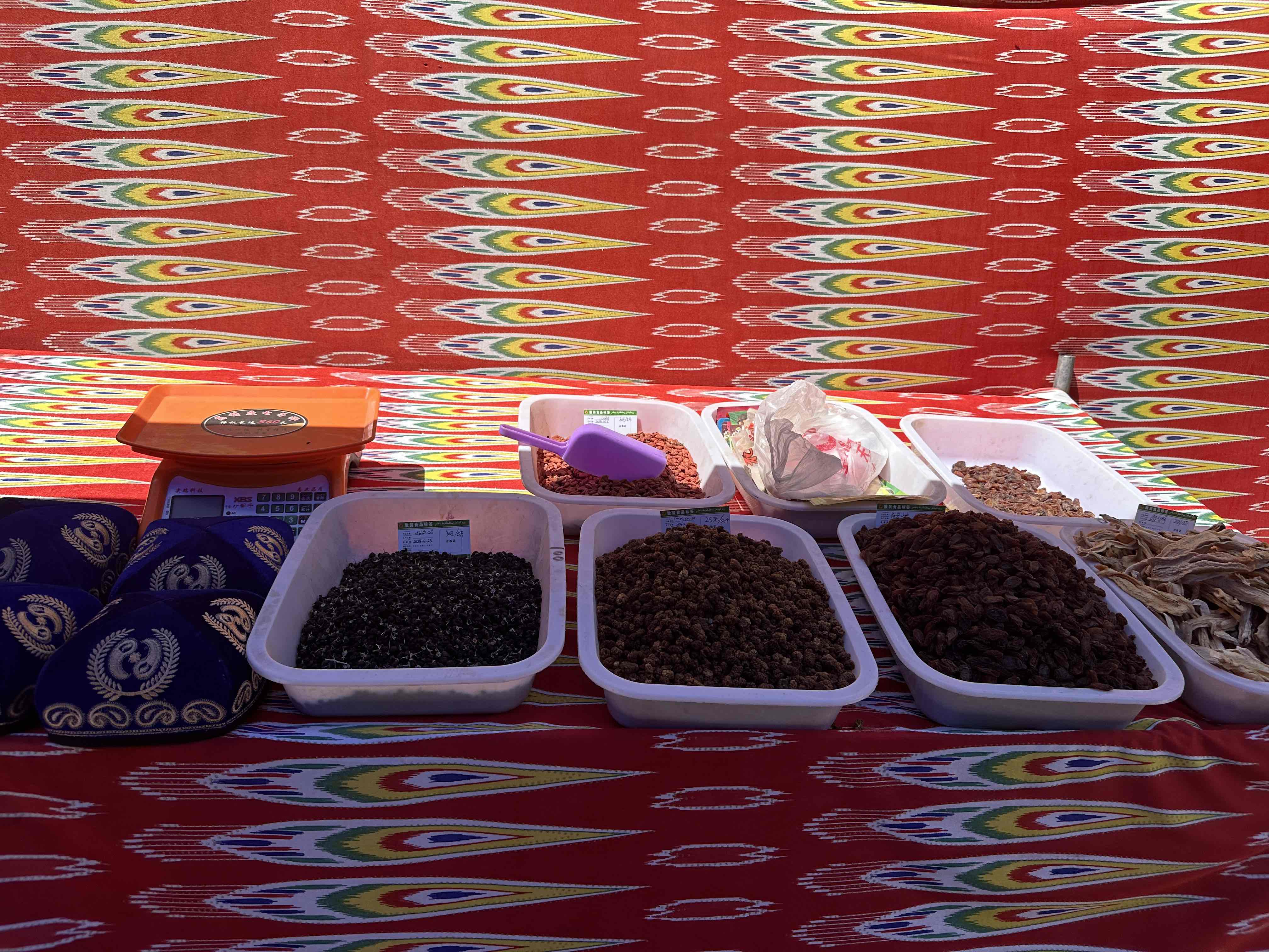 Vor allem werden hier Rosinen angeboten, für die diese Gegend berühmt ist. Die Weintrauben werden in riesigen Lehmbauten getrocknet, die überall in der Gegend zu sehen sind.
