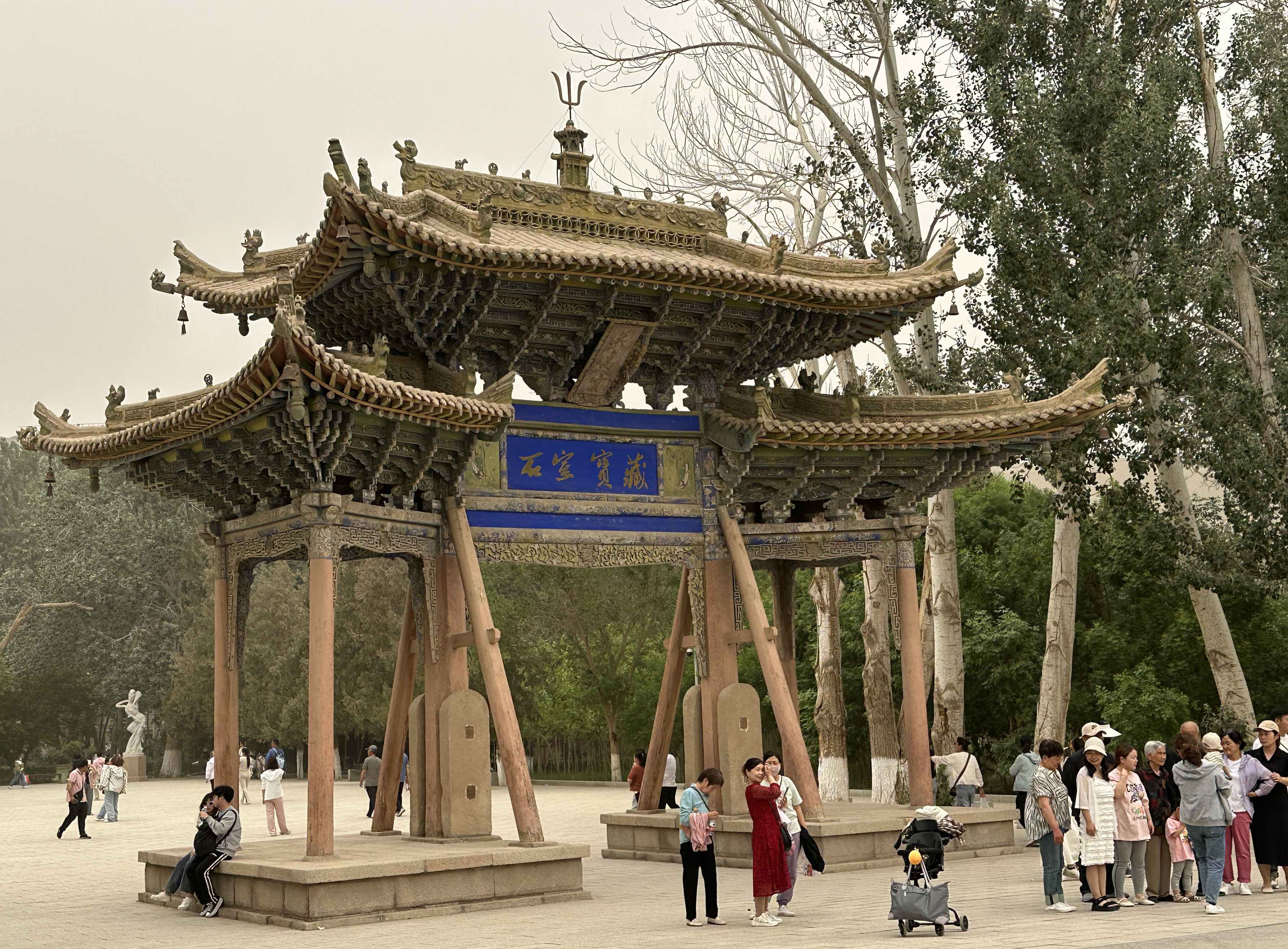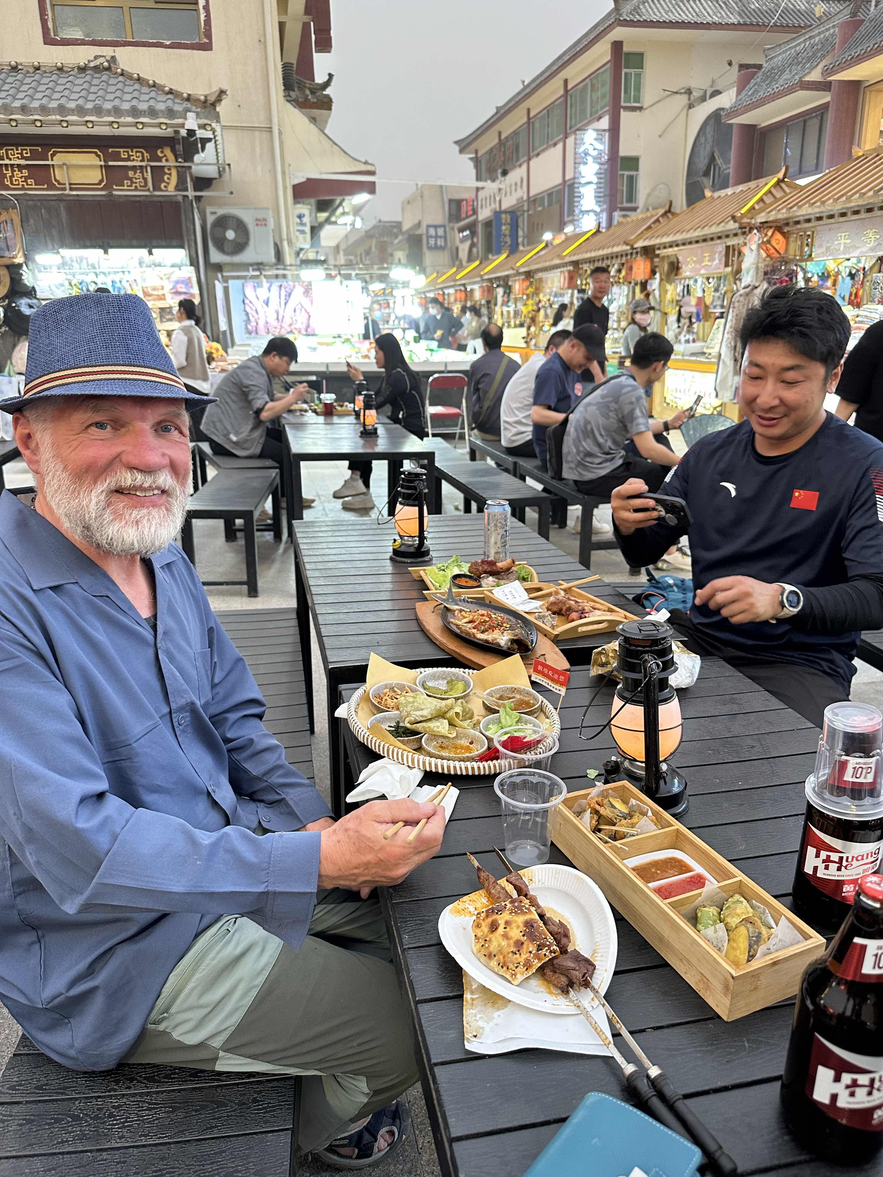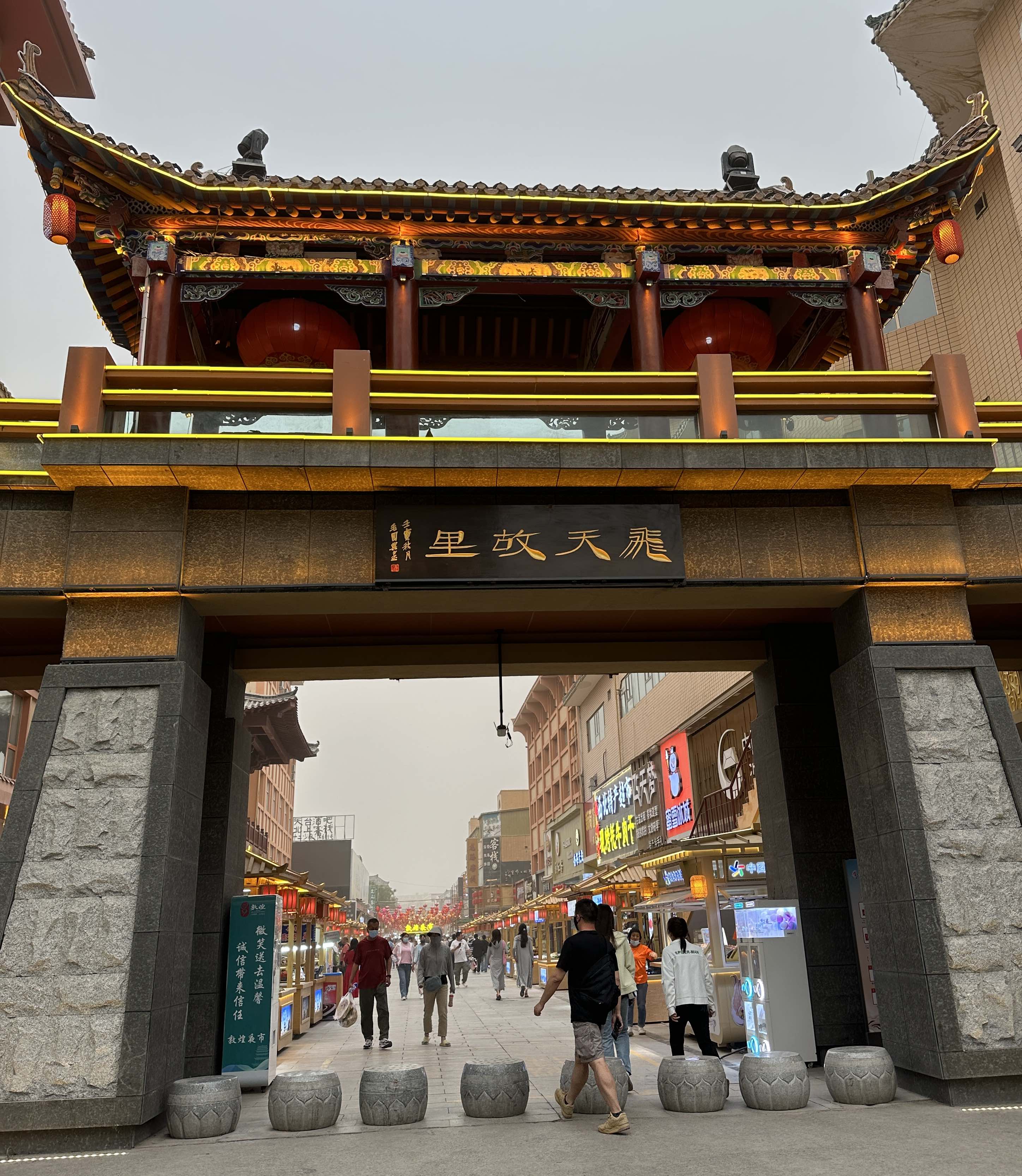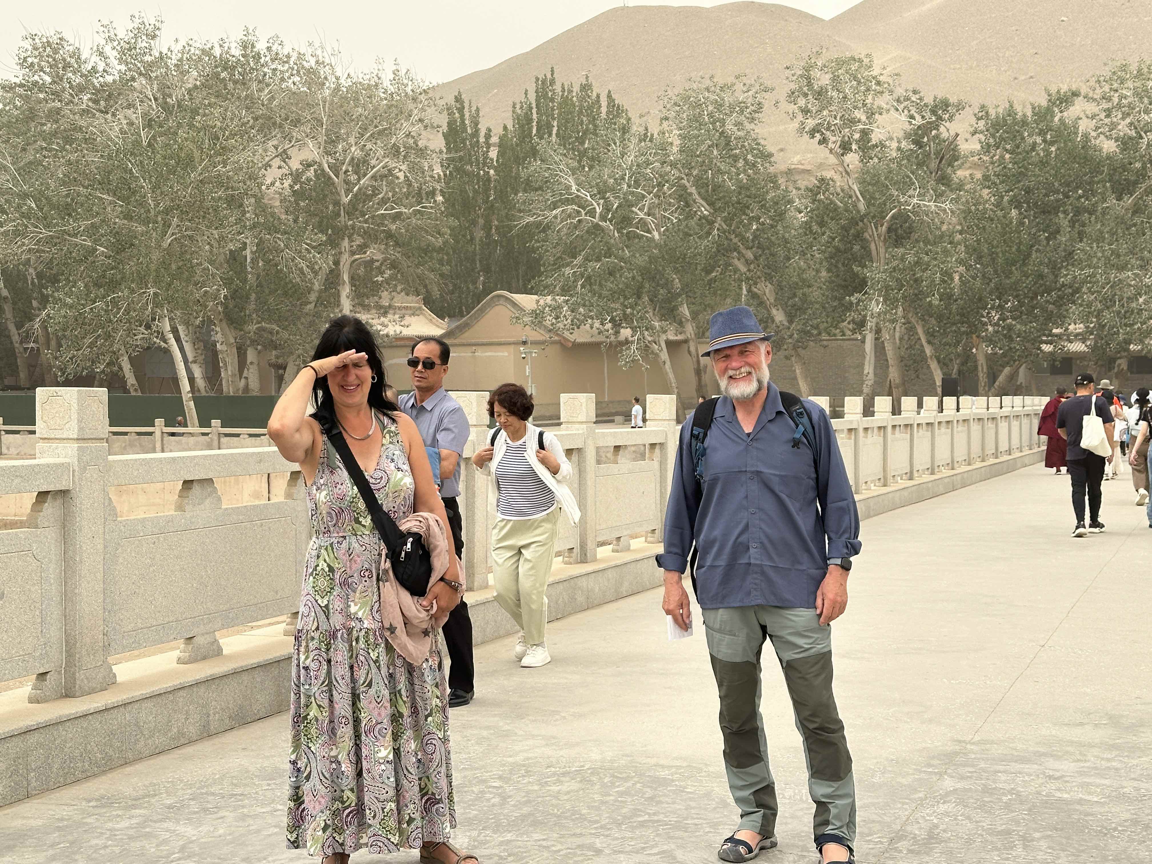 Dunhuang wurde 111 v. Chr. gegründet und spielte aufgrund seiner Lage als wichtiger Knotenpunkt der alten Seidenstraße eine bedeutende Rolle. Wir bleiben für 2 Tage auf einem Parkplatz nahe der Stadt und fahren mit dem Taxi zum Night Market und stürzen uns in das bunte Treiben von Verkaufs- und Essständen. Mit Yinchous Hilfe findet auch Walter etwas vegetarisches. Struppi ist mit dabei und zieht reichlich Aufmerksamkeit auf sich. Eine Traube von Chines*innen umgibt uns und wir werden von einem Polizisten feundlich aufgefordert, weiterzugehen, damit sich die Menge auflöst…