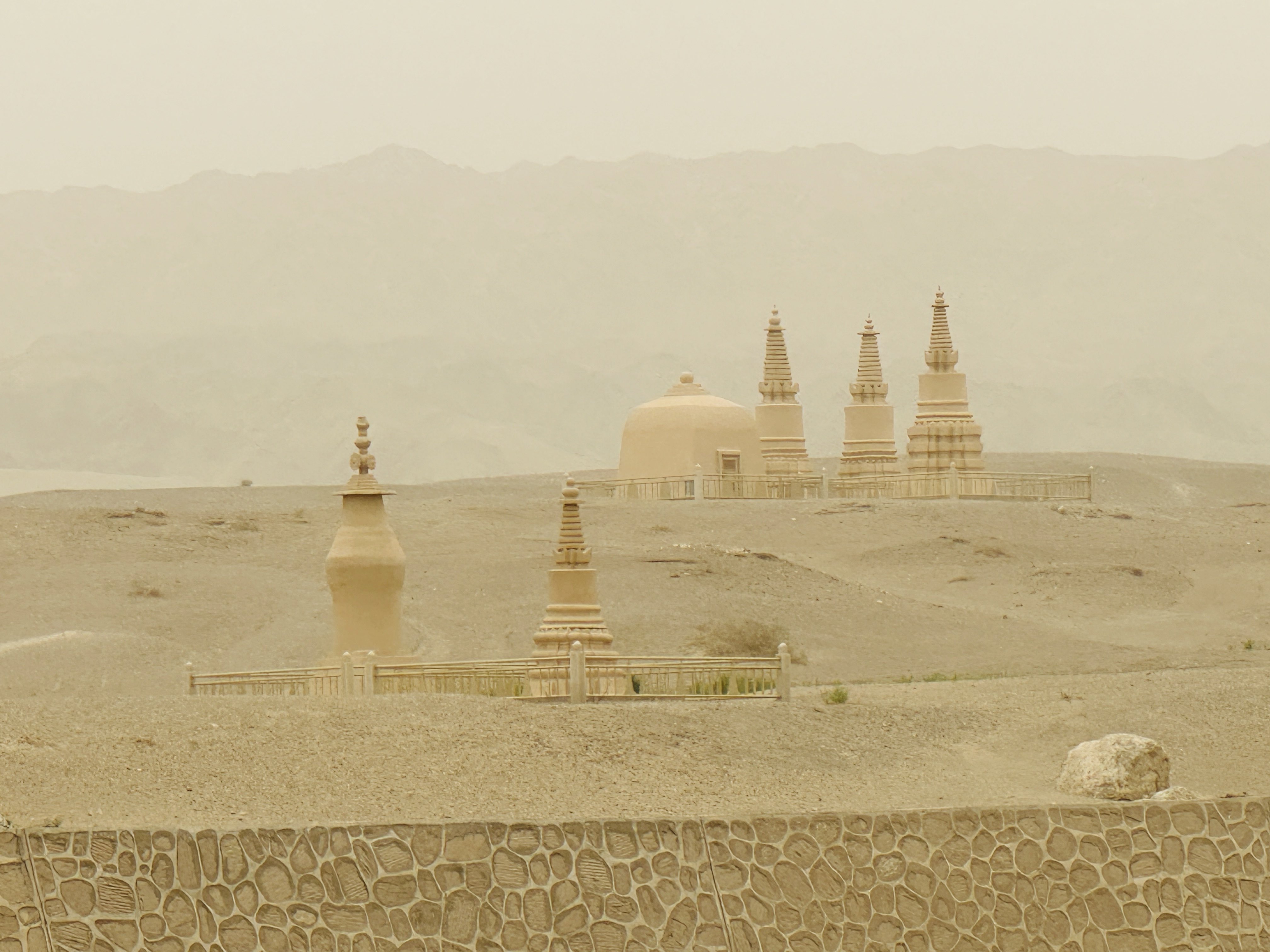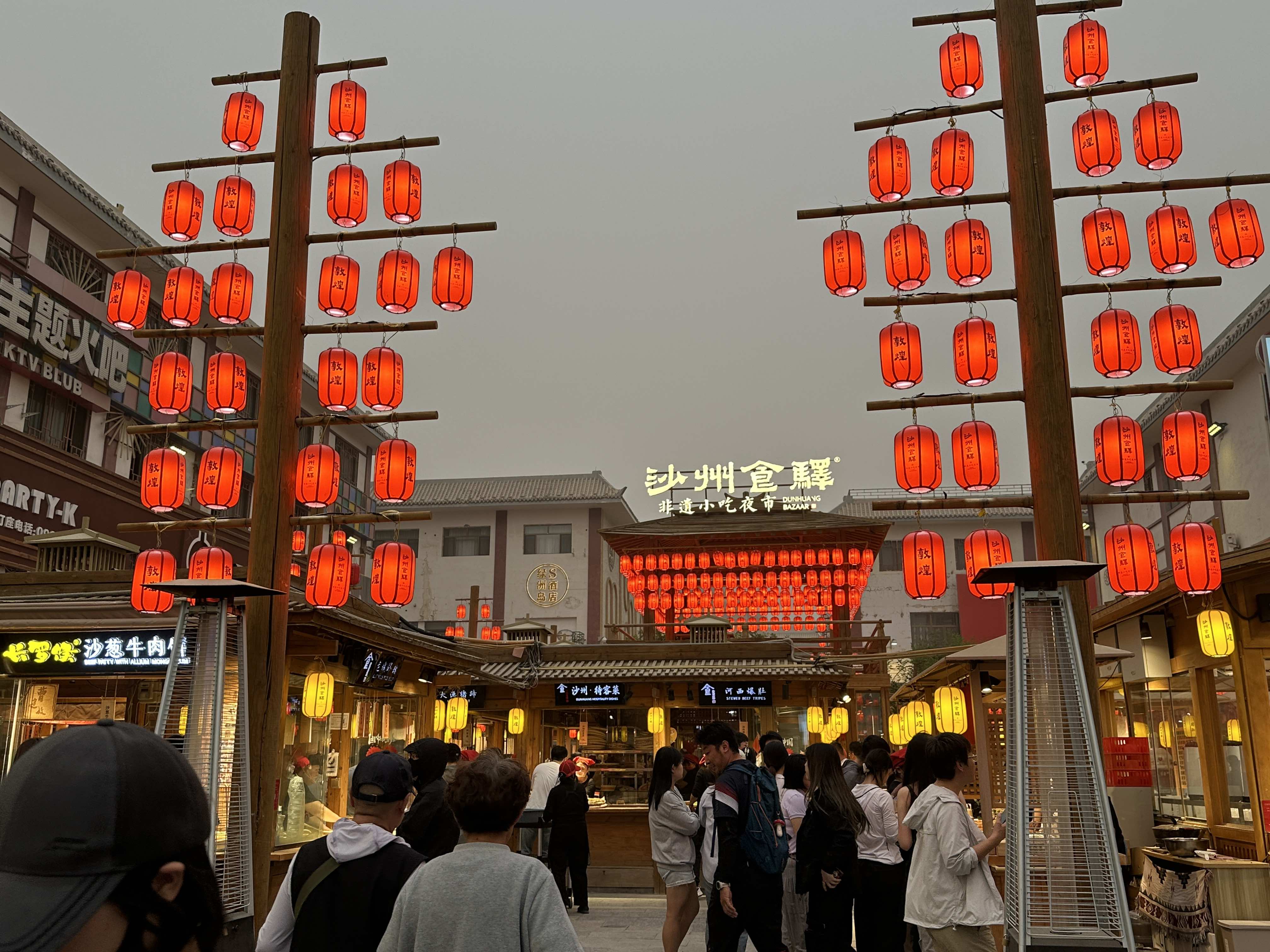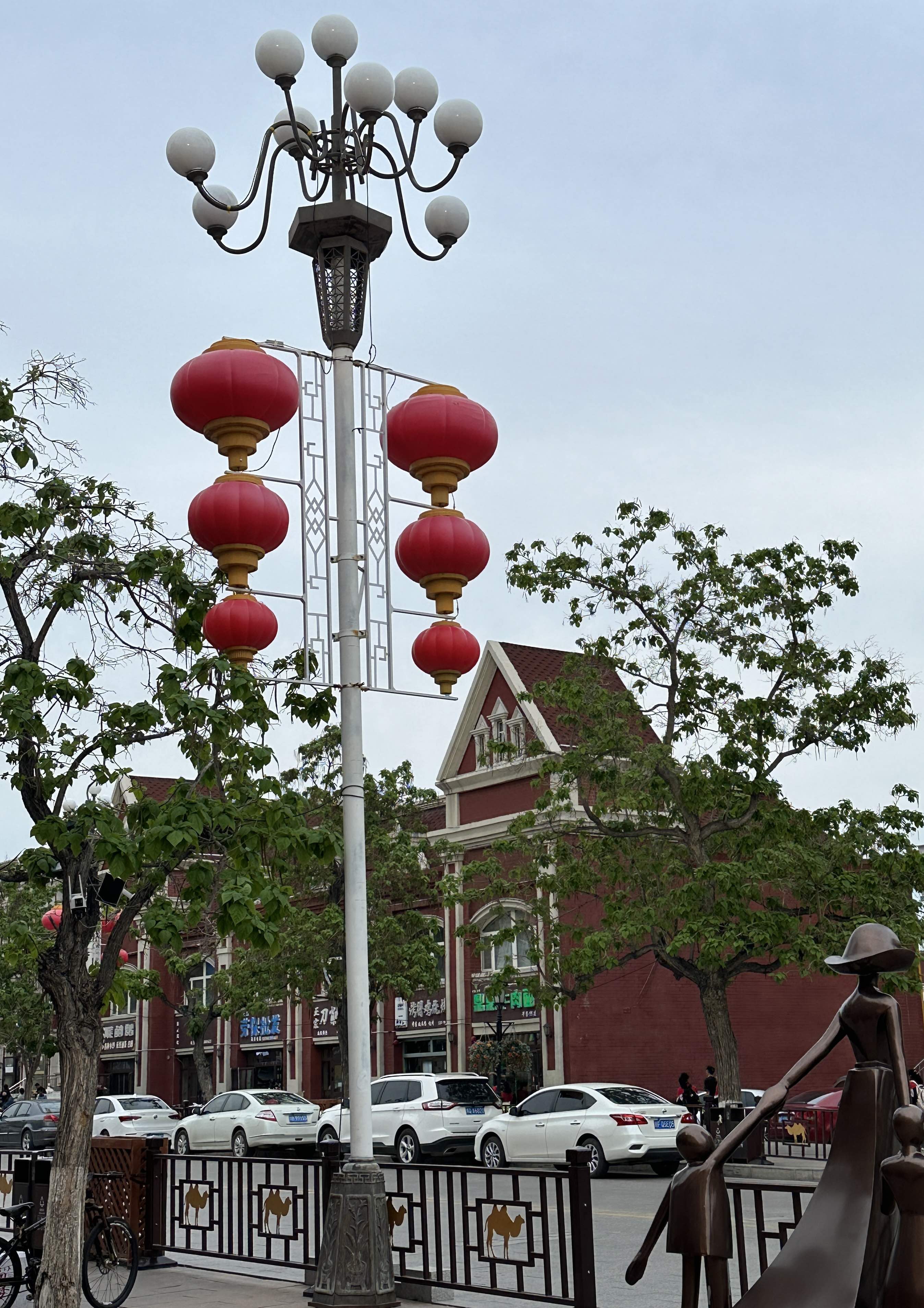Dunhuang wurde 111 v. Chr. gegründet und spielte aufgrund seiner Lage als wichtiger Knotenpunkt der alten Seidenstraße eine bedeutende Rolle. Wir bleiben für 2 Tage auf einem Parkplatz nahe der Stadt und fahren mit dem Taxi zum Night Market und stürzen uns in das bunte Treiben von Verkaufs- und Essständen. Mit Yinchous Hilfe findet auch Walter etwas vegetarisches. Struppi ist mit dabei und zieht reichlich Aufmerksamkeit auf sich. Eine Traube von Chines*innen umgibt uns und wir werden von einem Polizisten feundlich aufgefordert, weiterzugehen, damit sich die Menge auflöst…