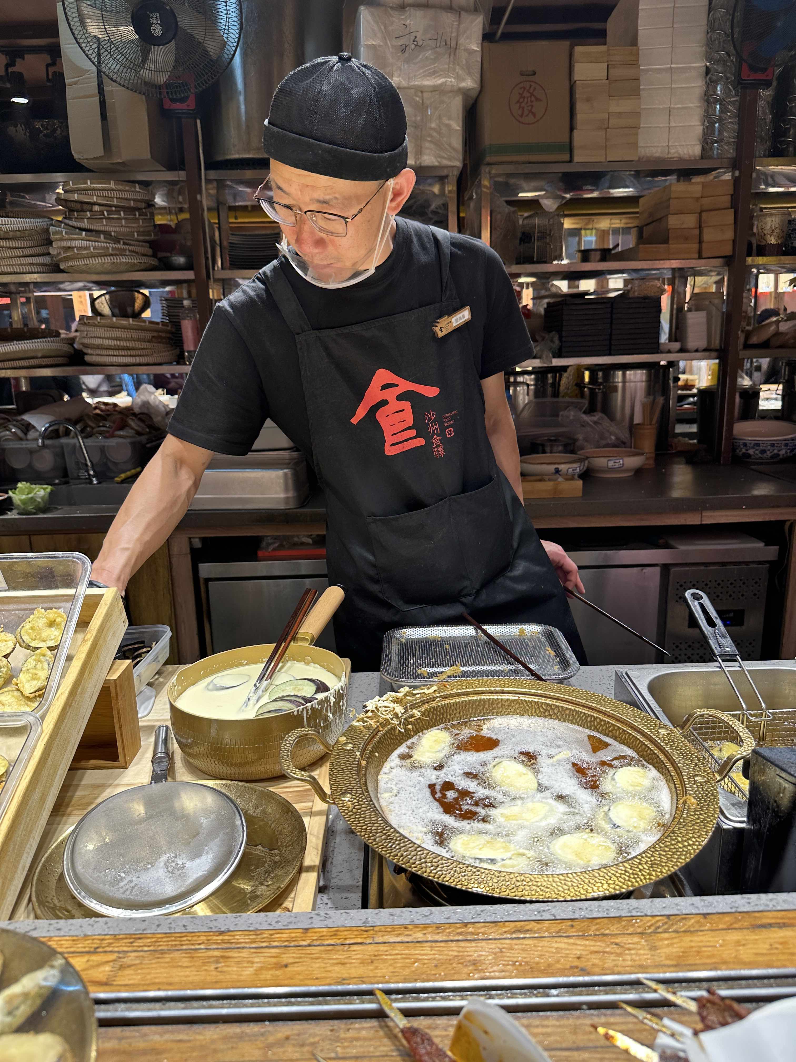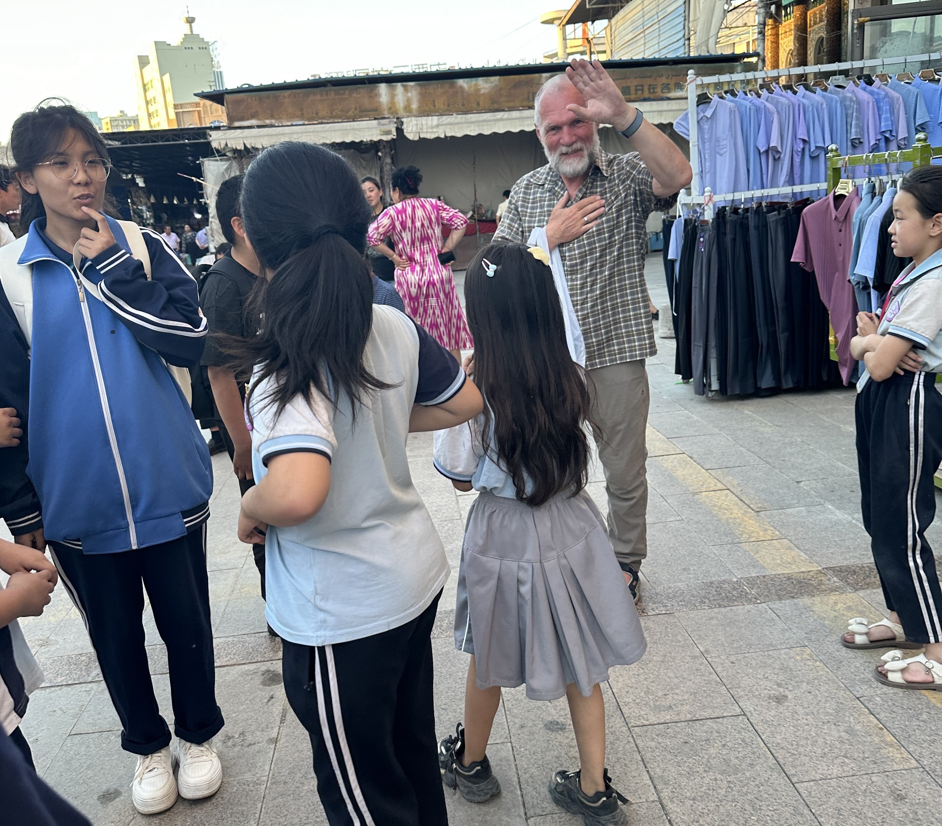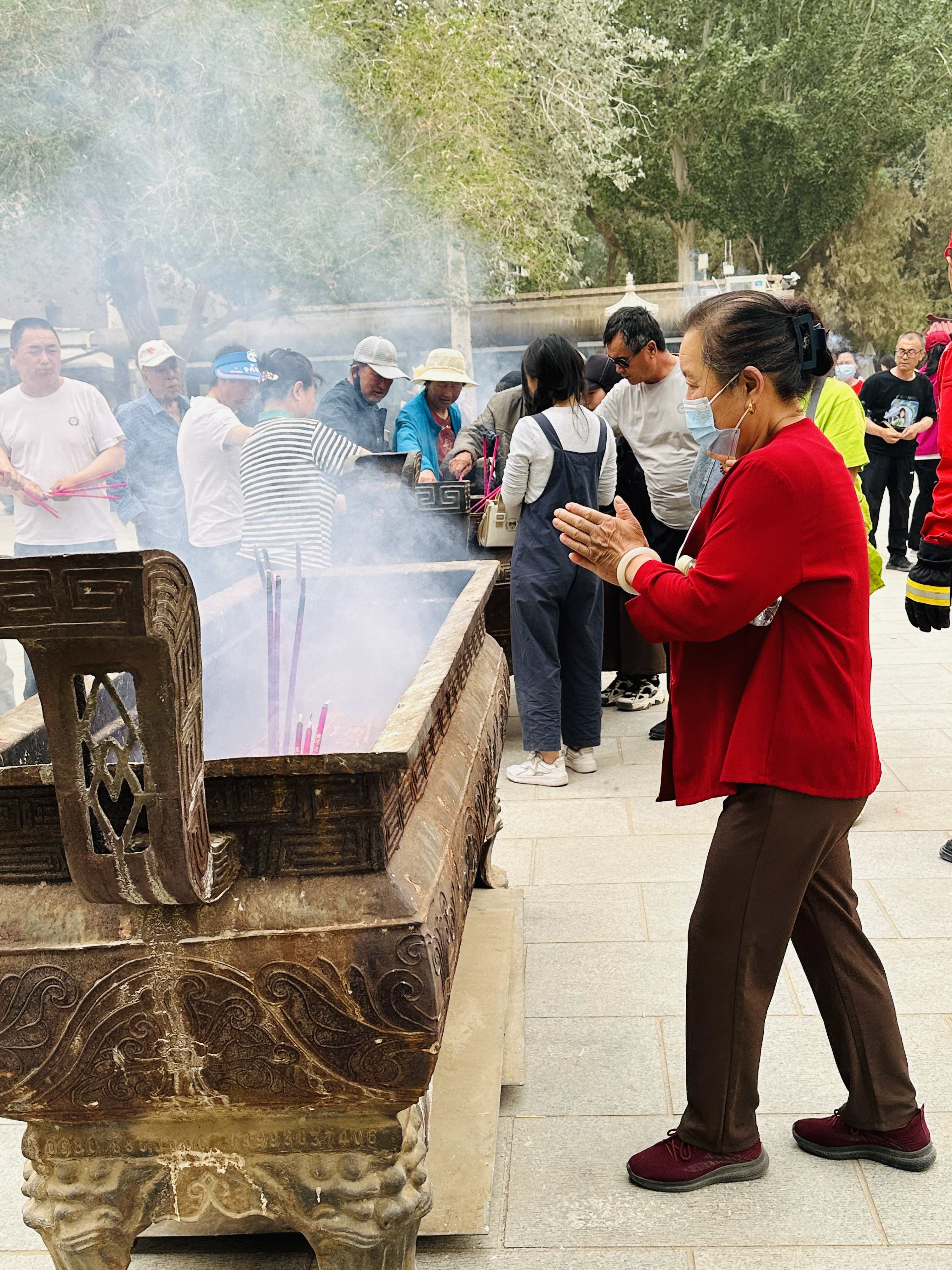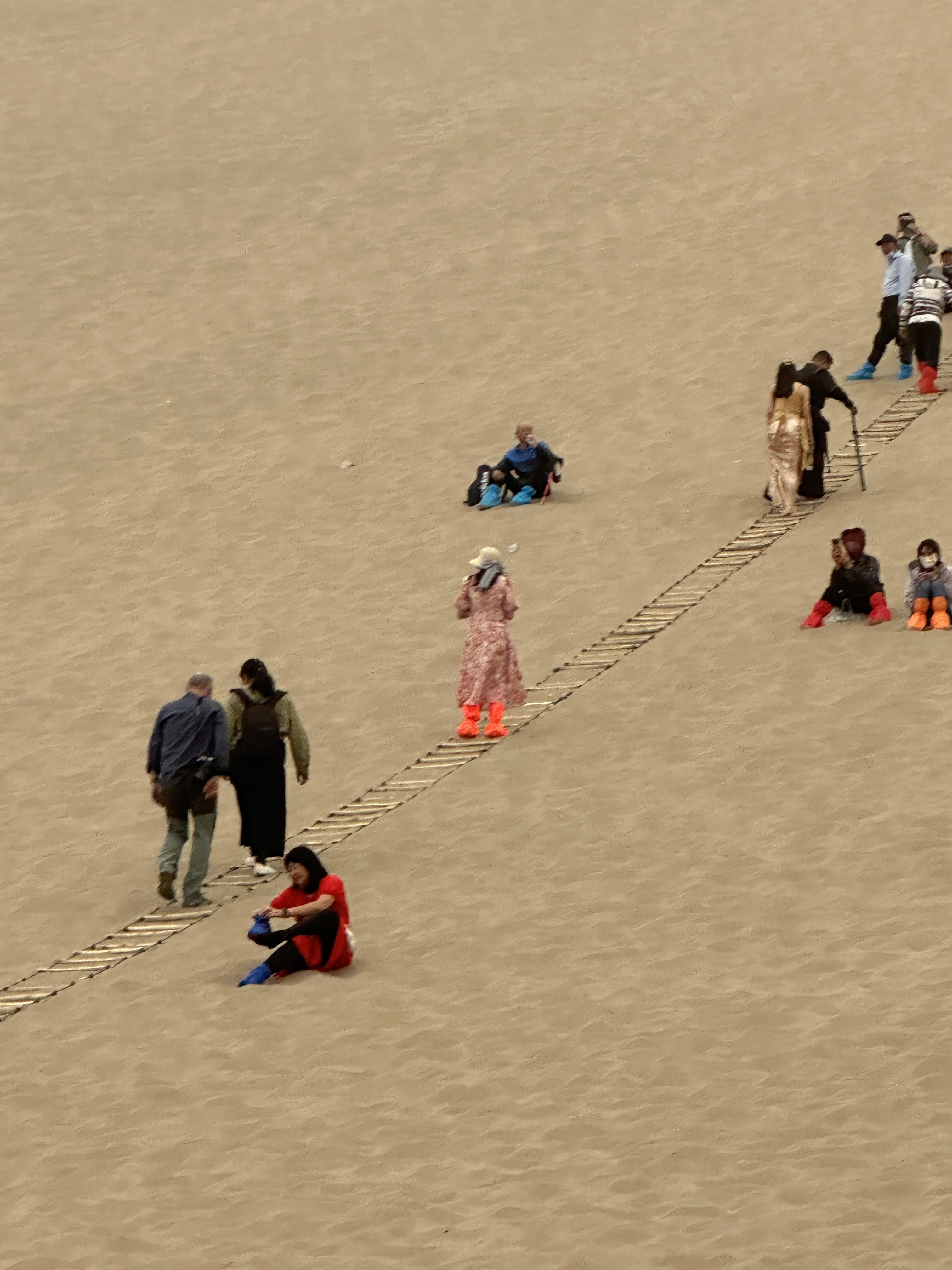 Dunhuang wurde 111 v. Chr. gegründet und spielte aufgrund seiner Lage als wichtiger Knotenpunkt der alten Seidenstraße eine bedeutende Rolle. Wir bleiben für 2 Tage auf einem Parkplatz nahe der Stadt und fahren mit dem Taxi zum Night Market und stürzen uns in das bunte Treiben von Verkaufs- und Essständen. Mit Yinchous Hilfe findet auch Walter etwas vegetarisches. Struppi ist mit dabei und zieht reichlich Aufmerksamkeit auf sich. Eine Traube von Chines*innen umgibt uns und wir werden von einem Polizisten feundlich aufgefordert, weiterzugehen, damit sich die Menge auflöst…