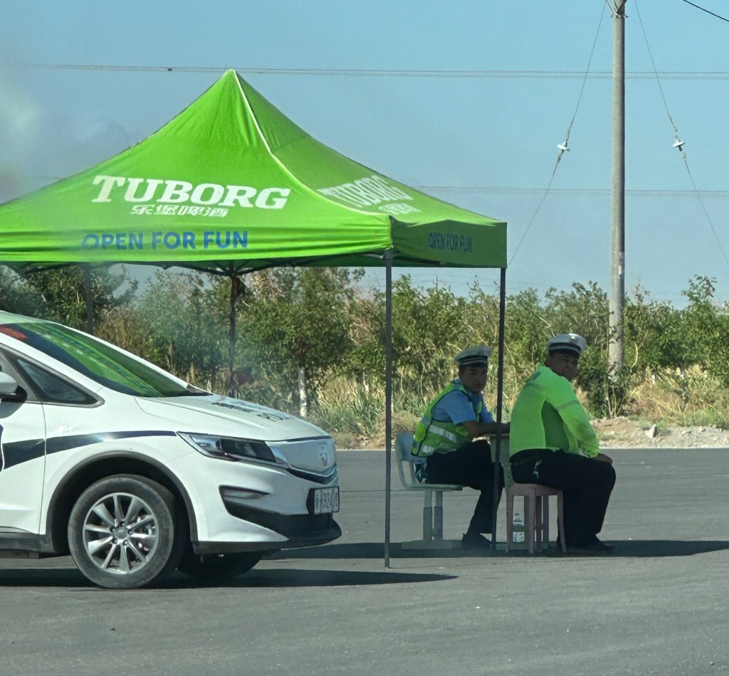 An einem Polizeikontrollposten wird es etwas schwierig: Yinchou verhandelt lange mit den Beamten, aber es wird angeordnet, dass wir nicht weiter auf der Landstraße fahren dürfen und ein herbei gerufenes Polizeiauto eskortiert uns zur nächsten Autobahnauffahrt. In der Provinz Xinjiang ist die Polizeipräsenz sehr auffällig, aber es gab auch diesen ungewollt komischen Augenblick.