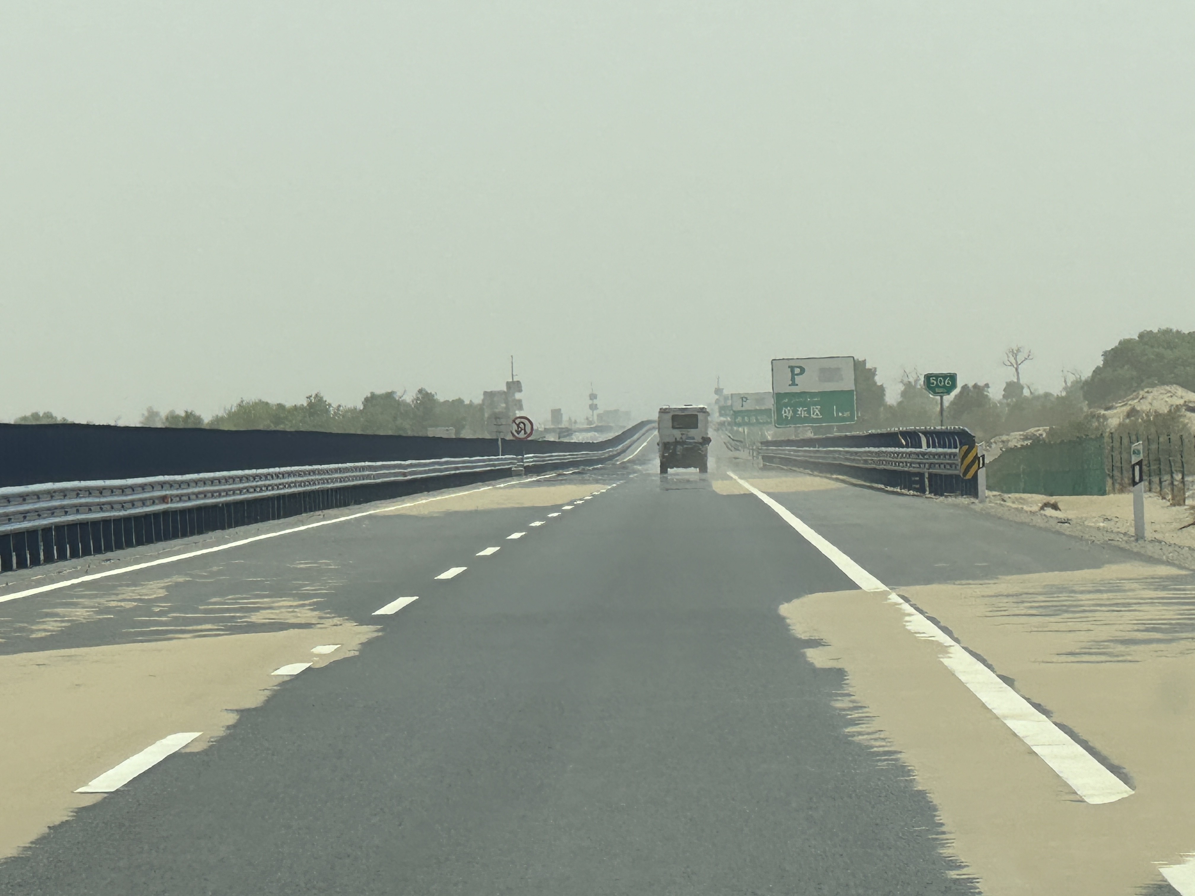 Es staubt mächtig und die Straße ist teilweise mit Sand bedeckt.