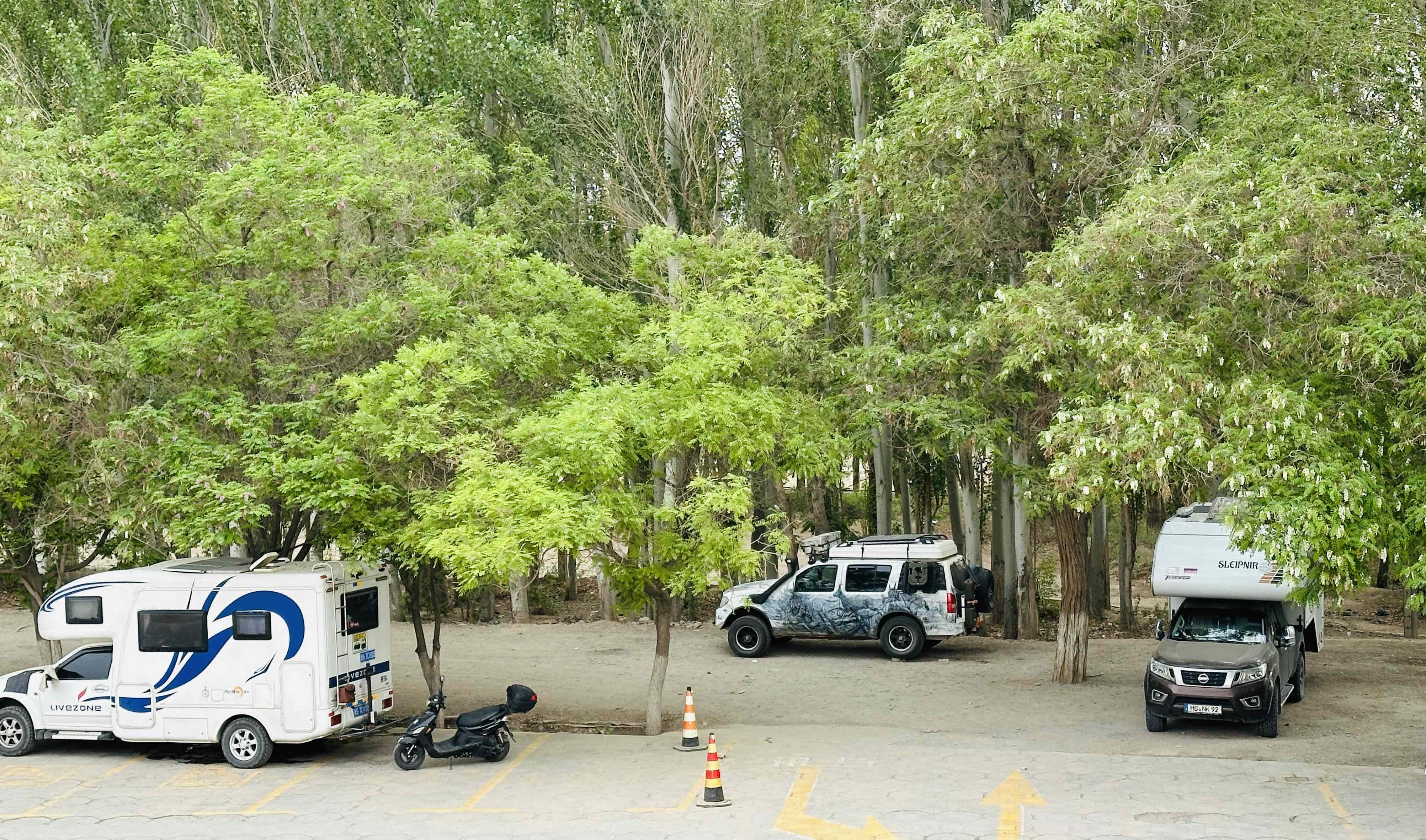 Yinchou wird von Jerry mit dem Roller abgeholt und wir fahren ihnen hinterher nach Khorgas, auf einen großen Parkplatz, auf dem wir auch unsere erste Nacht verbringen wollen.