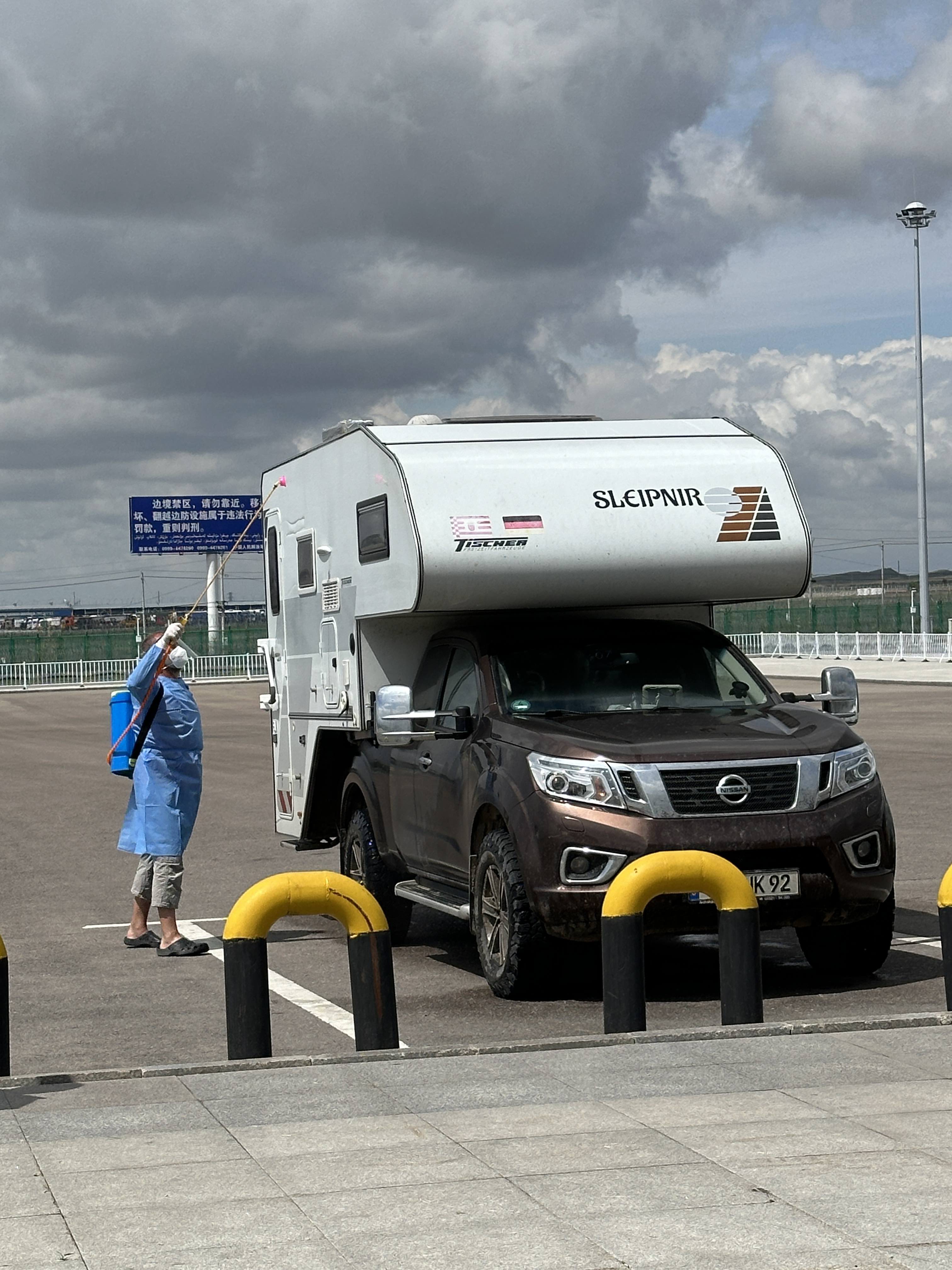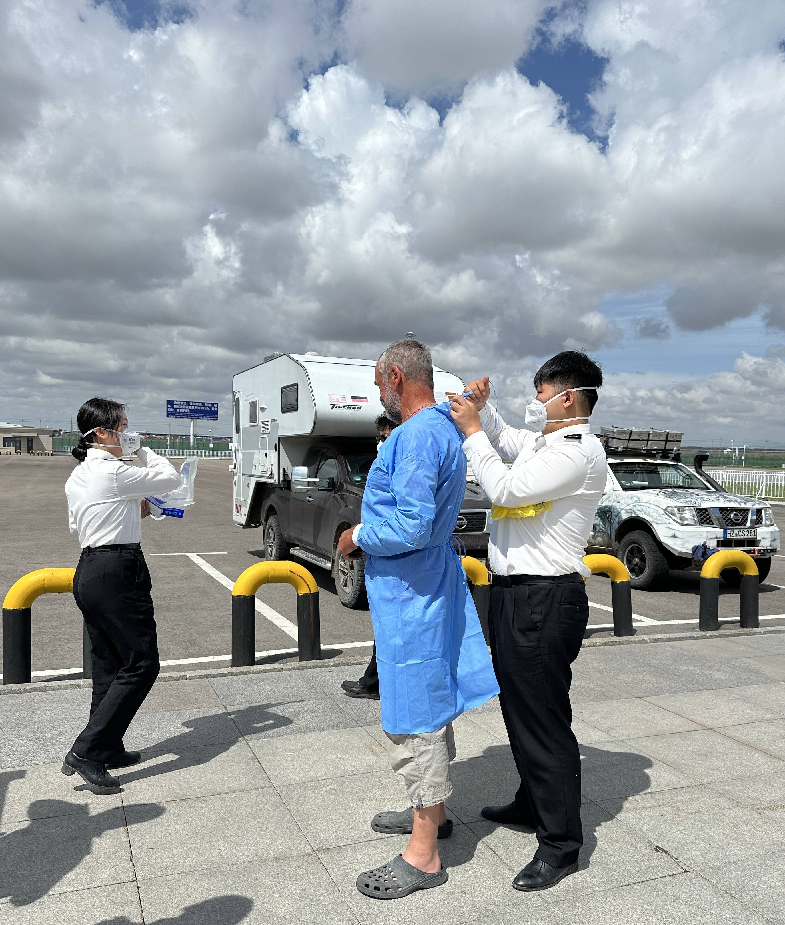 Wir Frauen müssen jetzt zu Fuß durch das riesige, supermoderne Abfertigungsgebäude zur Passkontrolle. Bei mir gibt es Irritationen, da in meinem Pass mit dem chinesischen Visum das Ausreisevisum aus Kasachstan fehlt. Ich zeige meinen zweiten Reisepass vor, in dem sich der Stempel befindet. Ich versuche zu erklären, dass für die gleichzeitige Beantragung des chinesischen und des russischen Visums der 2. Pass notwendig war. Nach langem Hin und Her und der Hinzuziehung von weiteren Beamten und mit Hilfe von einer Übersetzungs-App ist der Sachverhalt geklärt und auch ich passiere die Kontrolle. Die Beiden Männer – und Struppi – fahren mit den Autos zur Zollabfertigung und nochmaligen Fahrzeugkontrolle. Yinchou ist dabei und hilft beim Ausfüllen der Formulare.