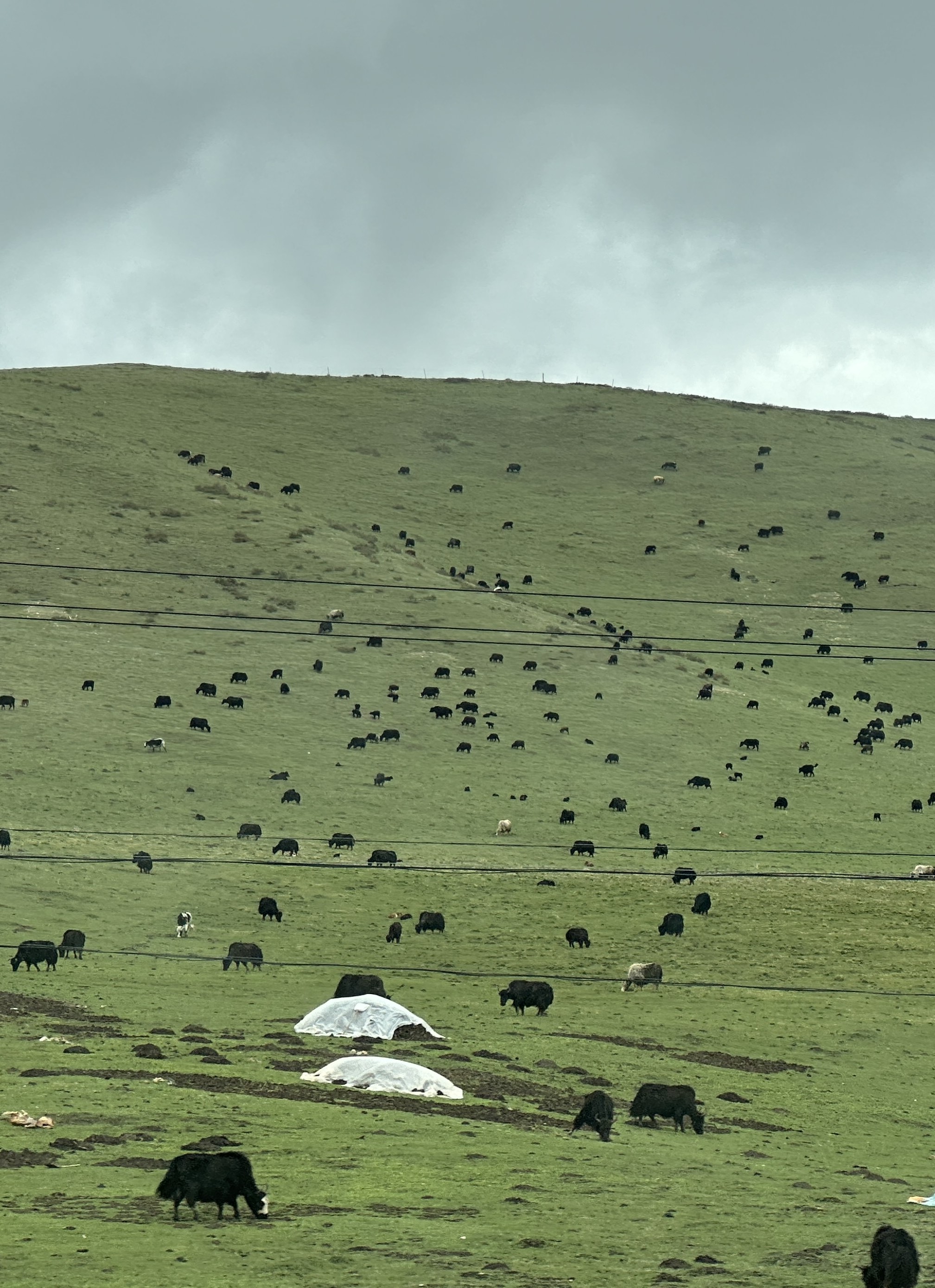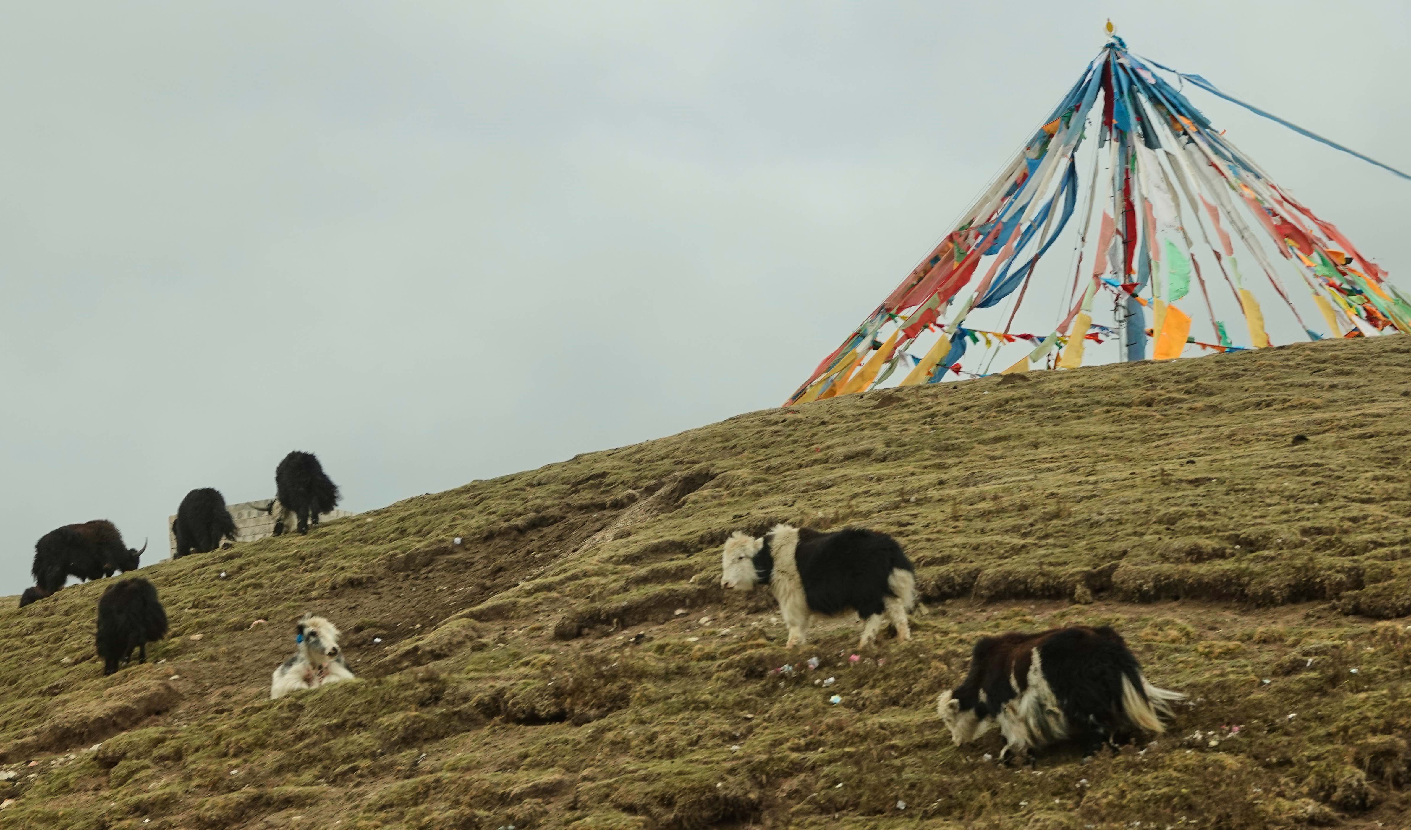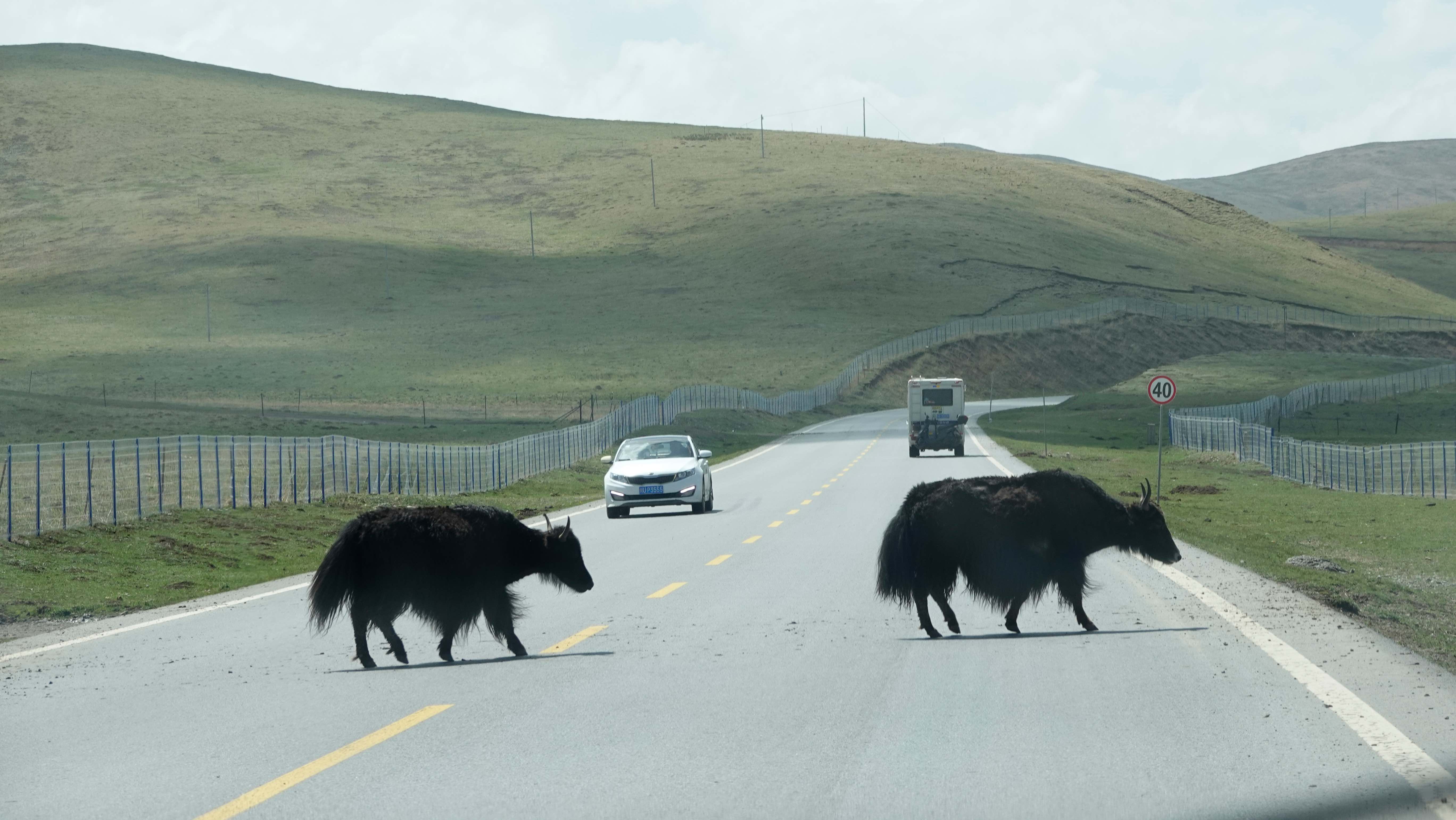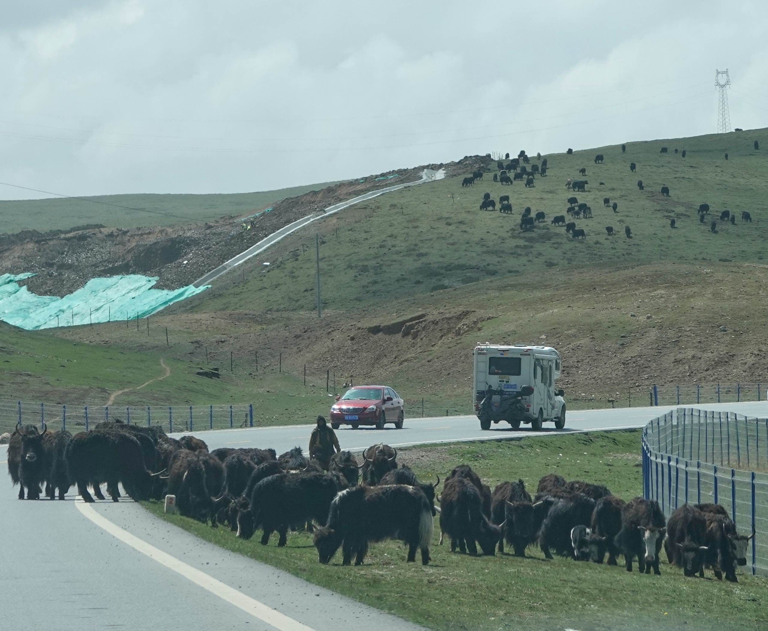 Die Landschaft hat sich total geändert, wir fahren nun durch wunderschönes, satt grünes Grasland, mit tausenden von Yaks, die hier grasen. Manchmal laufen sie auch unvermittelt auf die Straße, man muss gut aufpassen! Natürlich probieren wir auch das Yakfleisch – schmeckt gut!