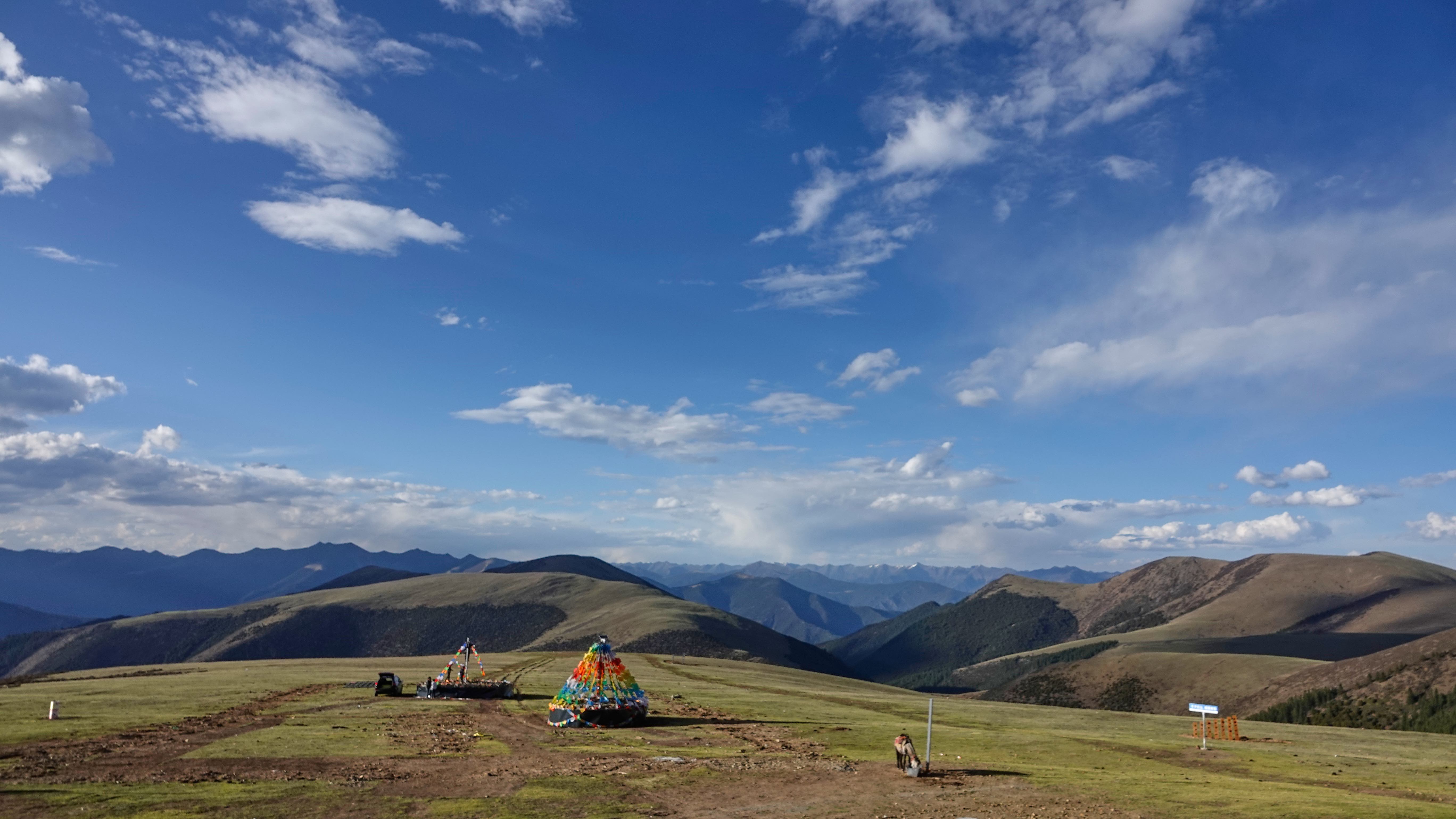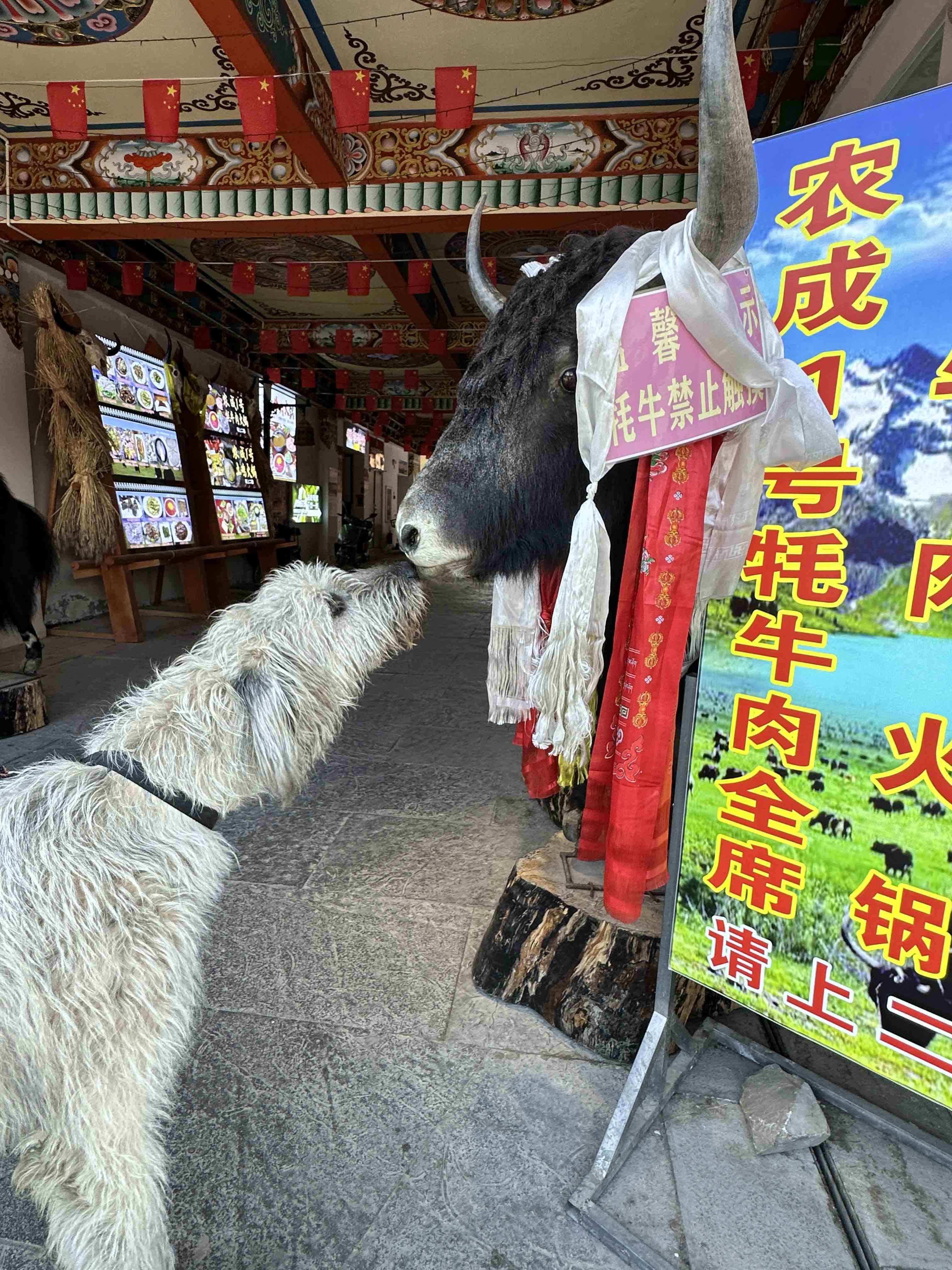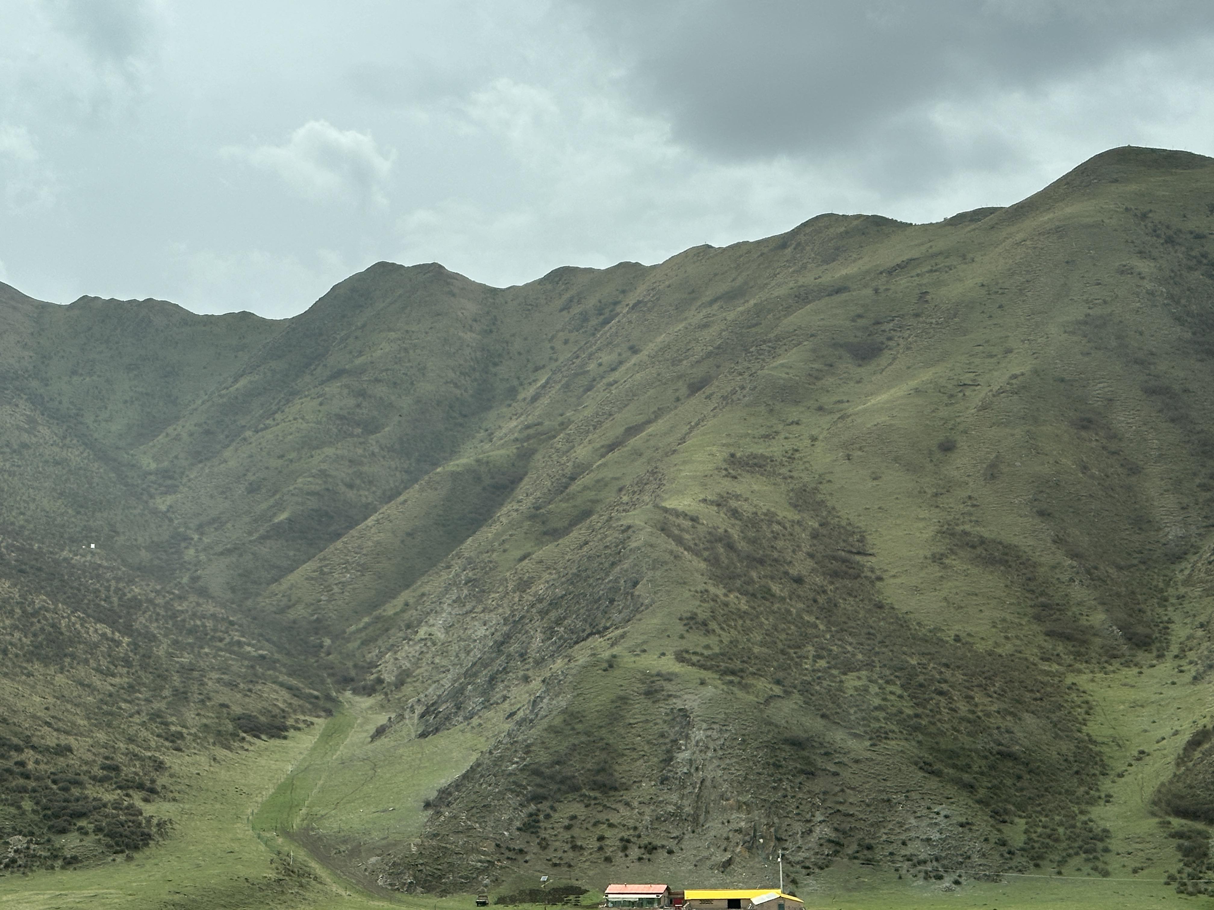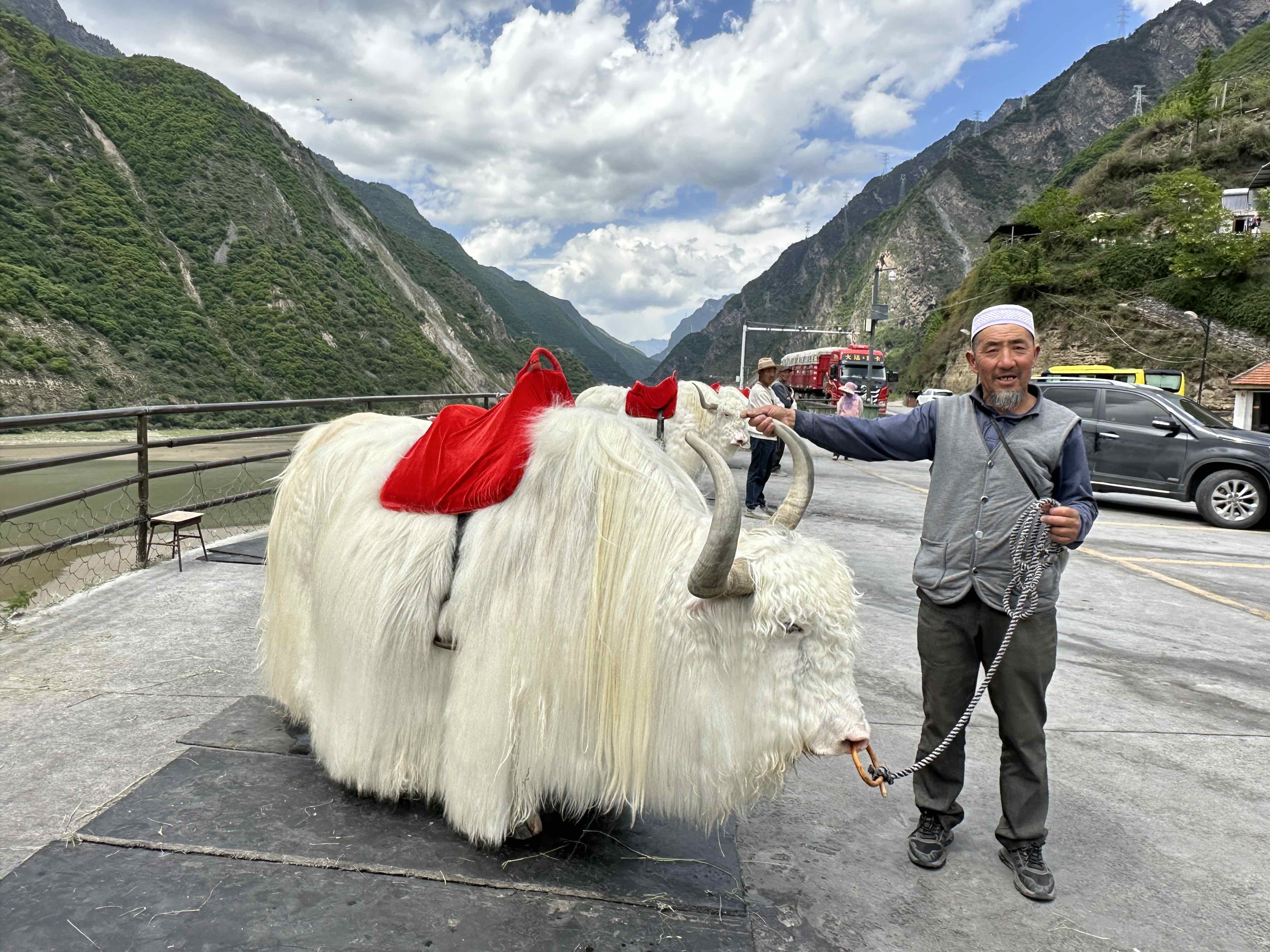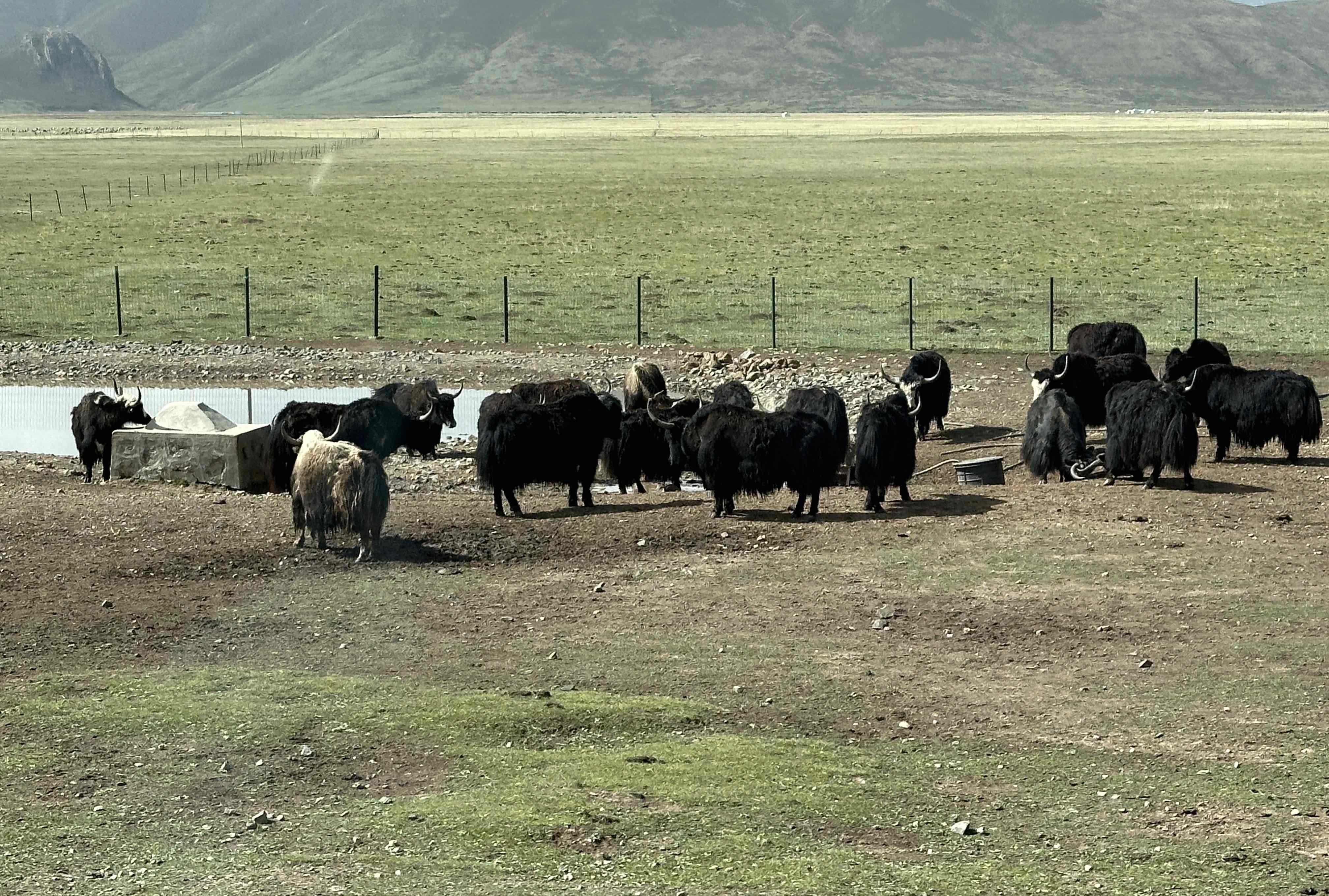 Die Landschaft hat sich total geändert, wir fahren nun durch wunderschönes, satt grünes Grasland, mit tausenden von Yaks, die hier grasen. Manchmal laufen sie auch unvermittelt auf die Straße, man muss gut aufpassen! Natürlich probieren wir auch das Yakfleisch – schmeckt gut!