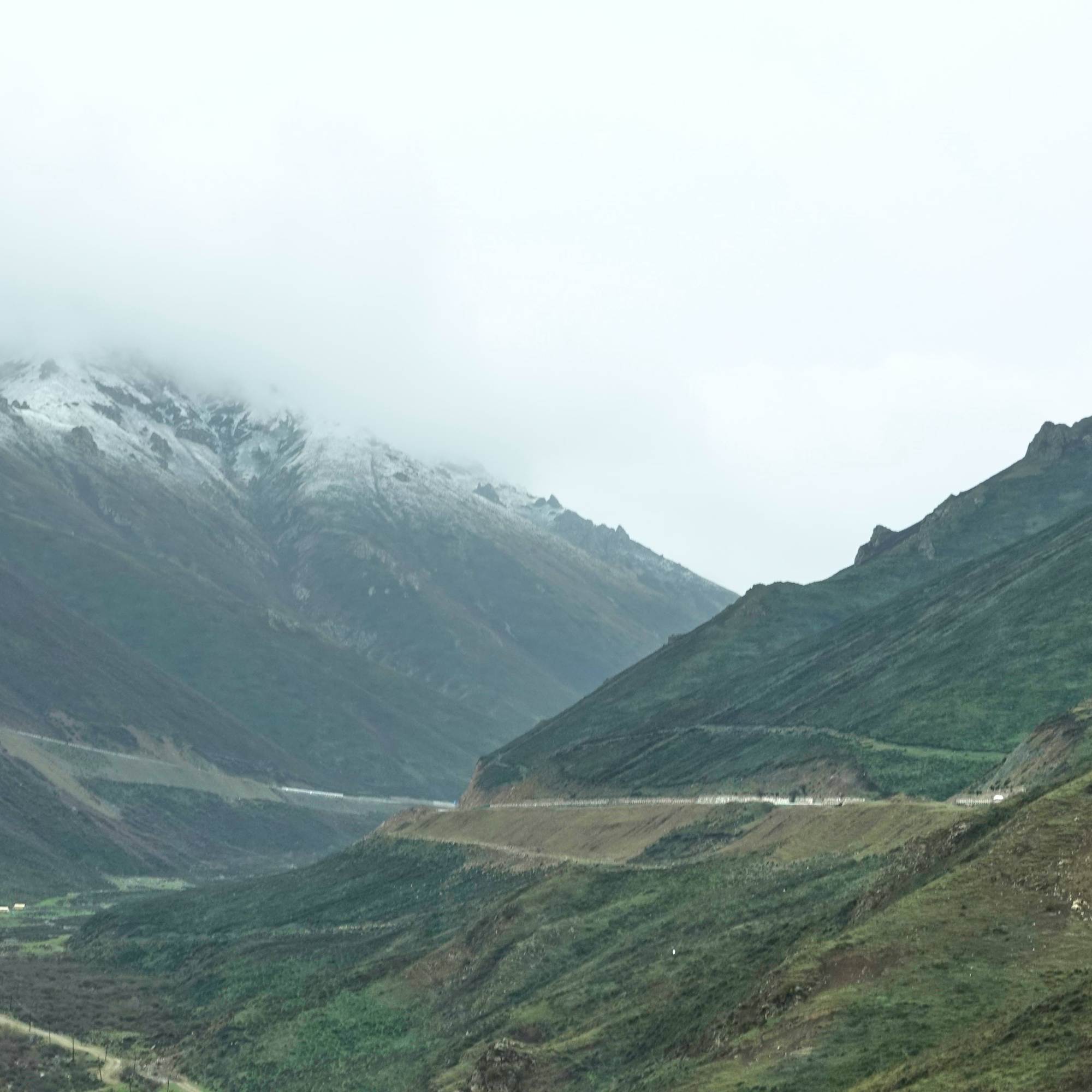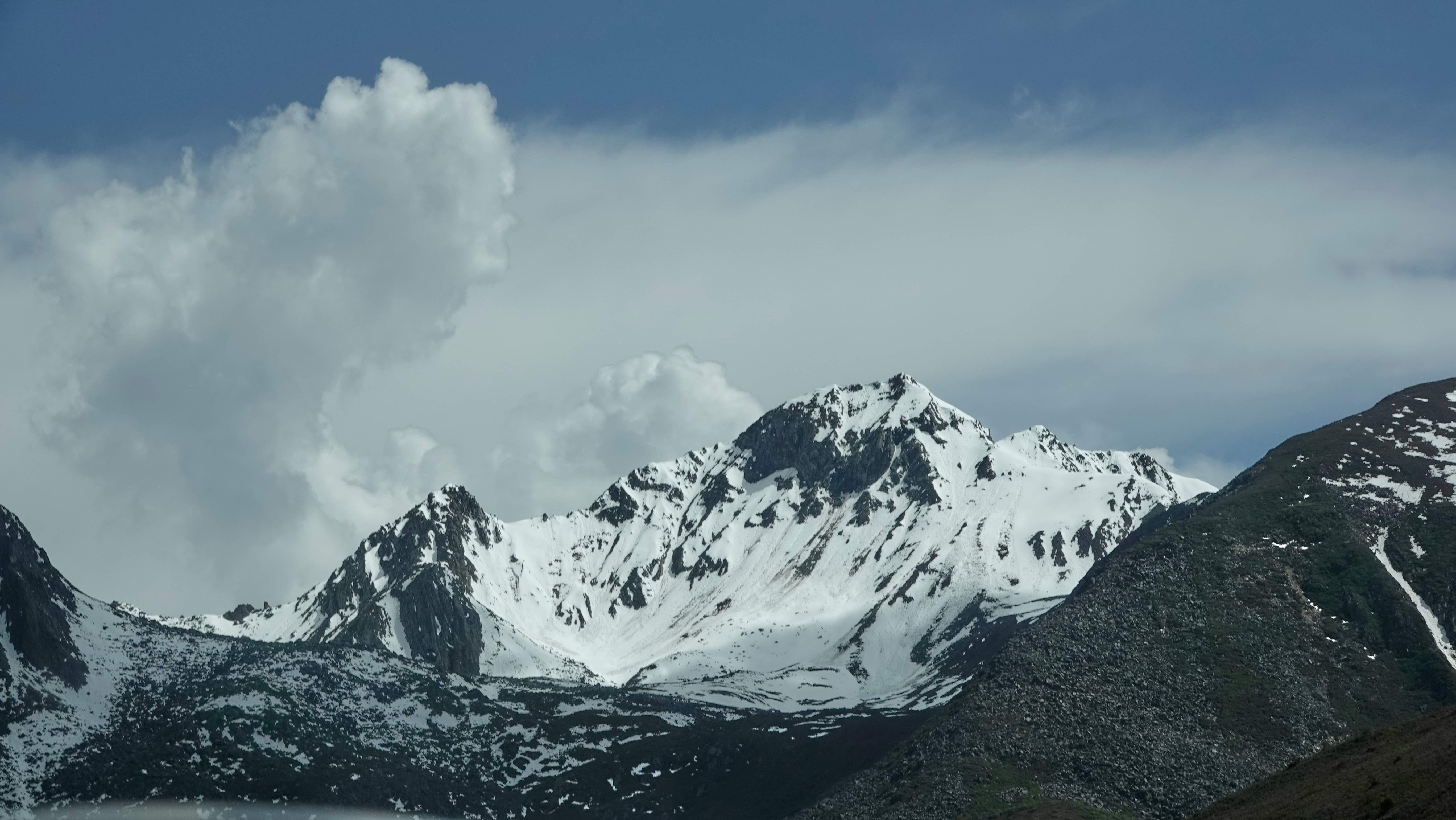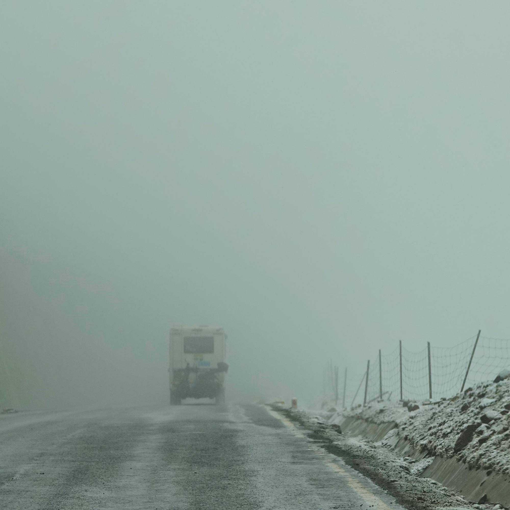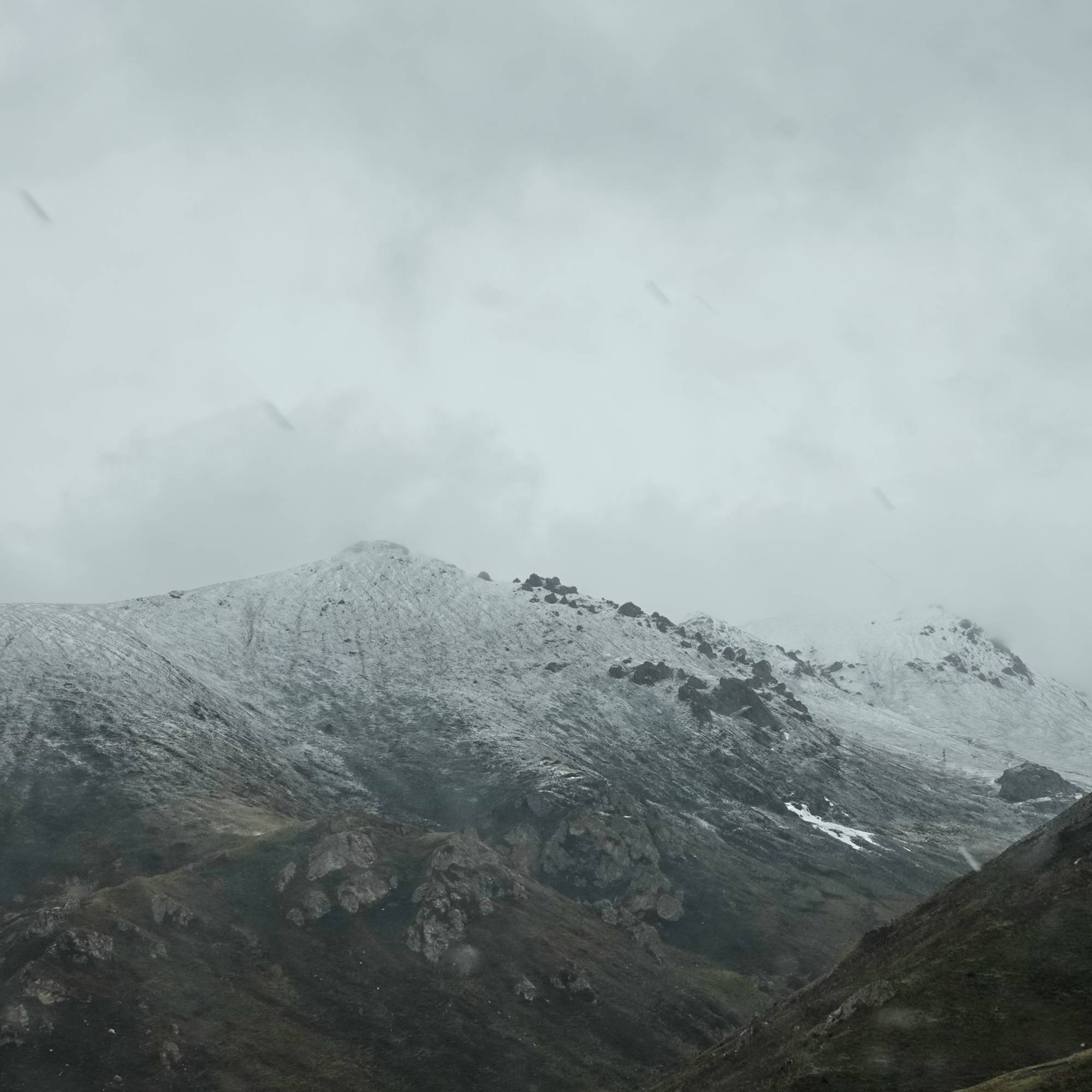 Unterwegs auf dem nächsten Pass (3.800 m) fängt es an zu schneien und hüllt die Berge in grauweißes Licht.