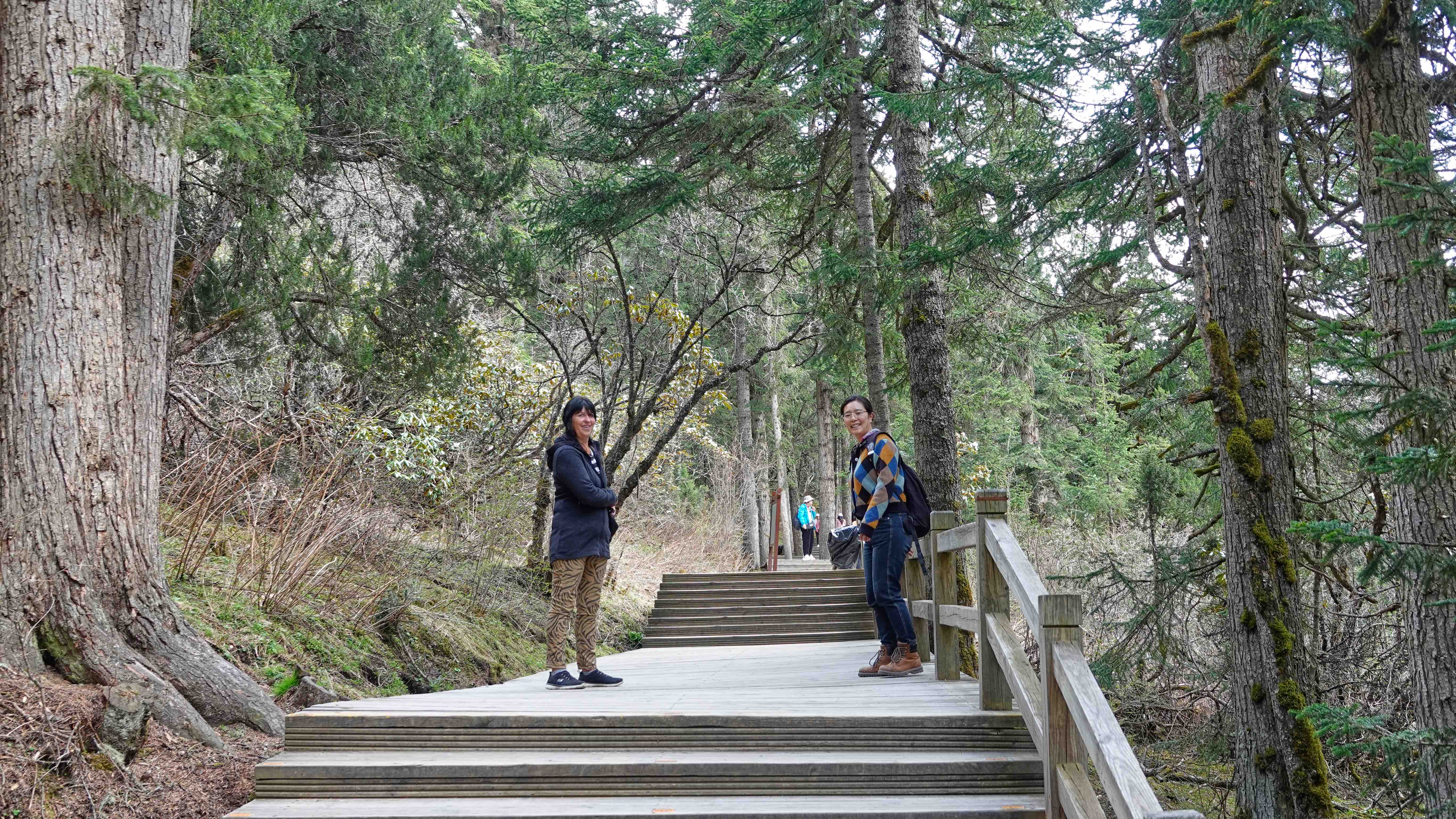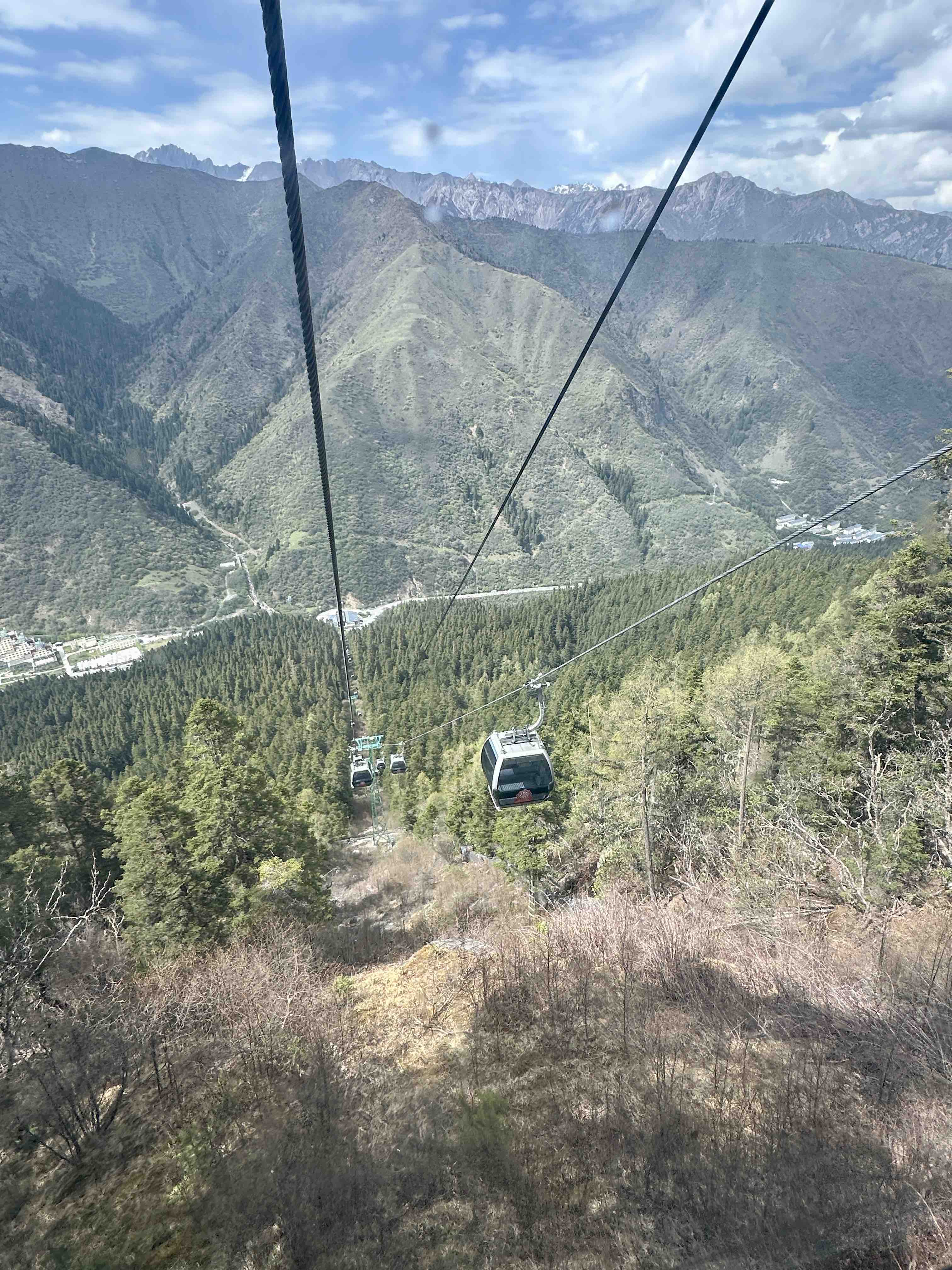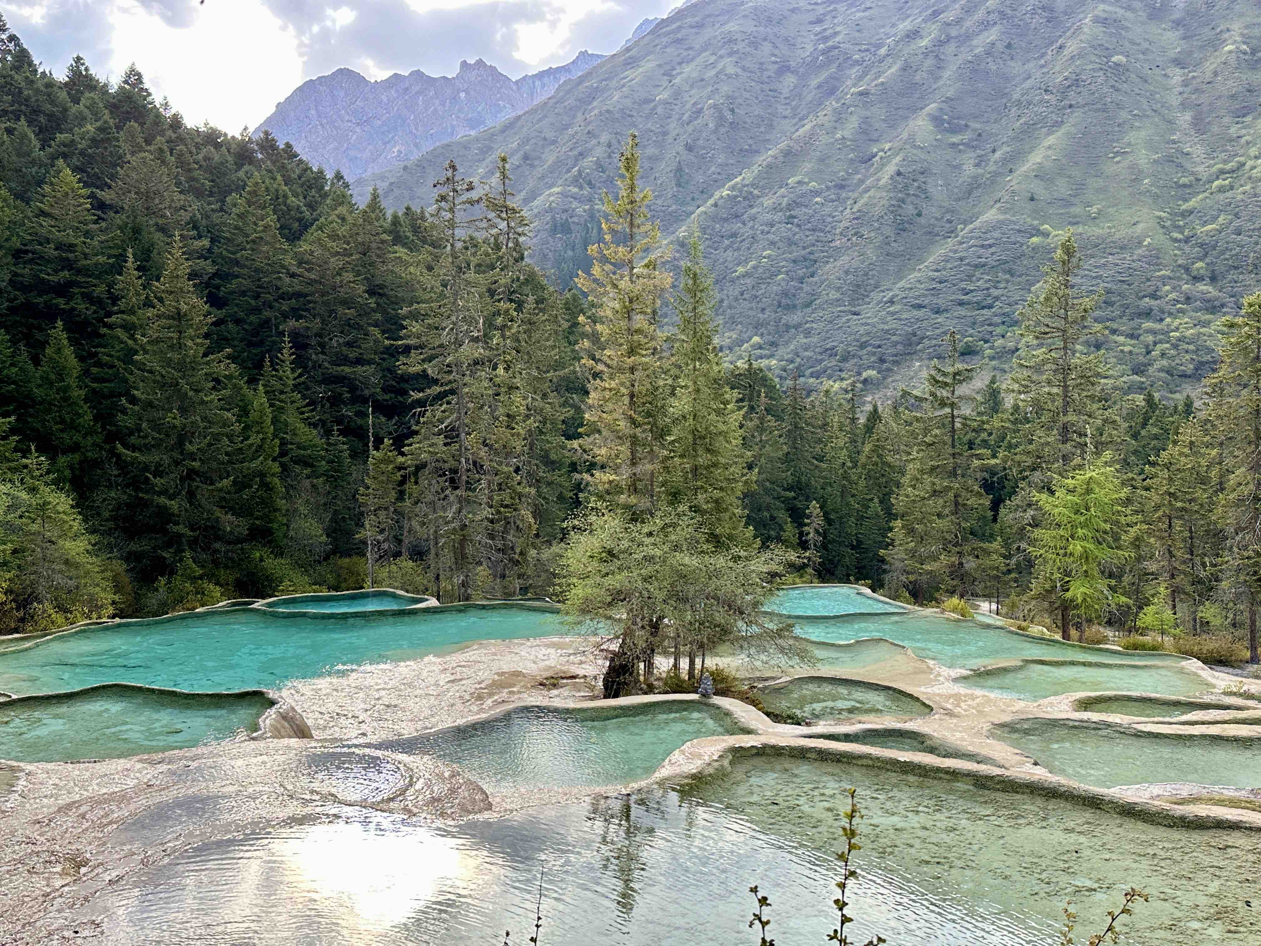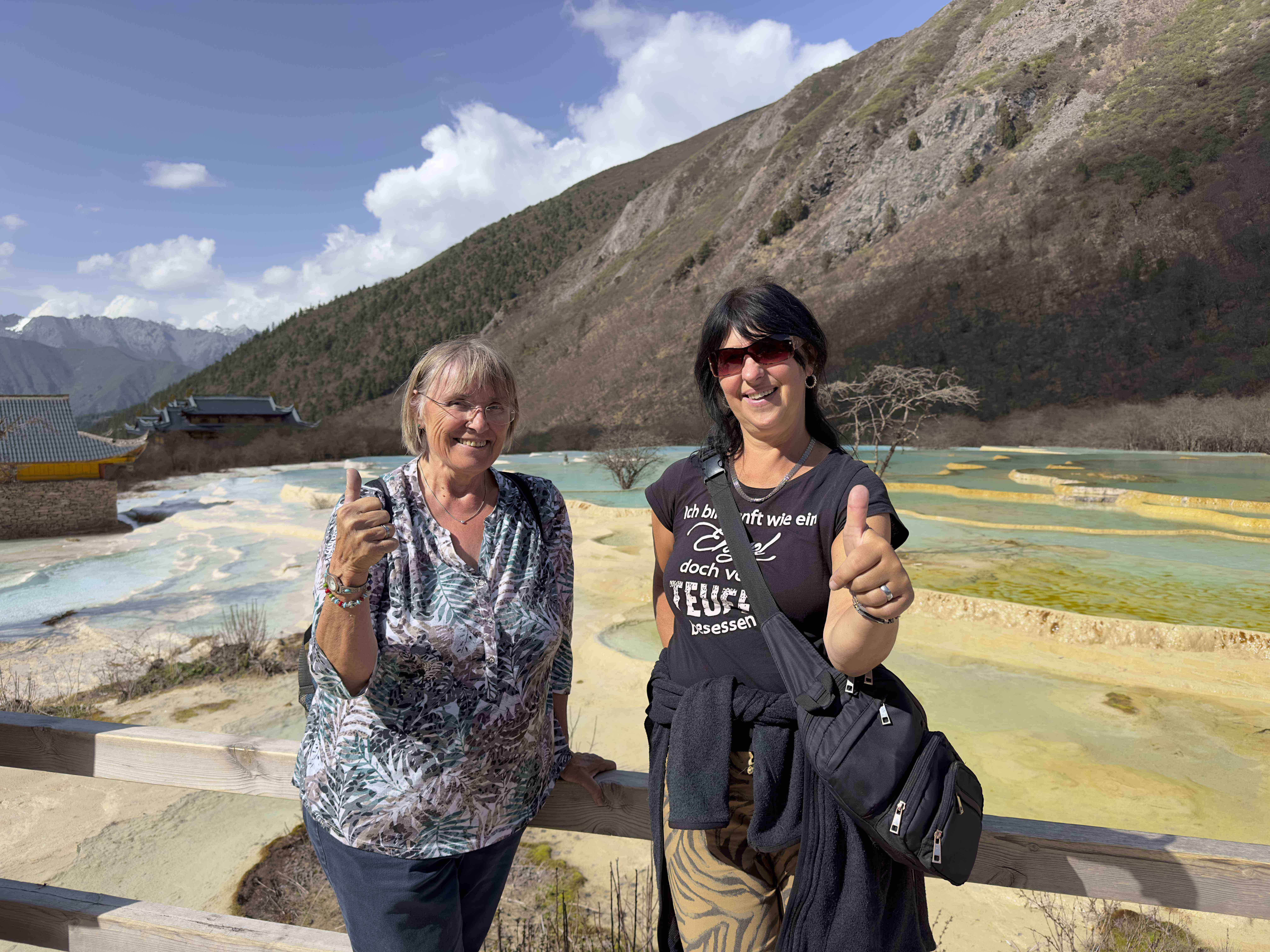 Am frühen Nachmittag sind wir in Huanglong und wir 3 Frauen machen uns auf zu einer Tour zu den Sinterterrassen (Walter kann wegen seiner Schmerzen nicht laufen). Mit der Gondelbahn geht es ein Stück den Berg hoch, auf ca. 3.500 m Höhe. Bis zu den Sinterterrassen müssen wir noch ein ganzes Stück laufen. Die Höhe macht mir ganz schön zu schaffen und ich schleiche die letzten 600m die Treppen hoch.