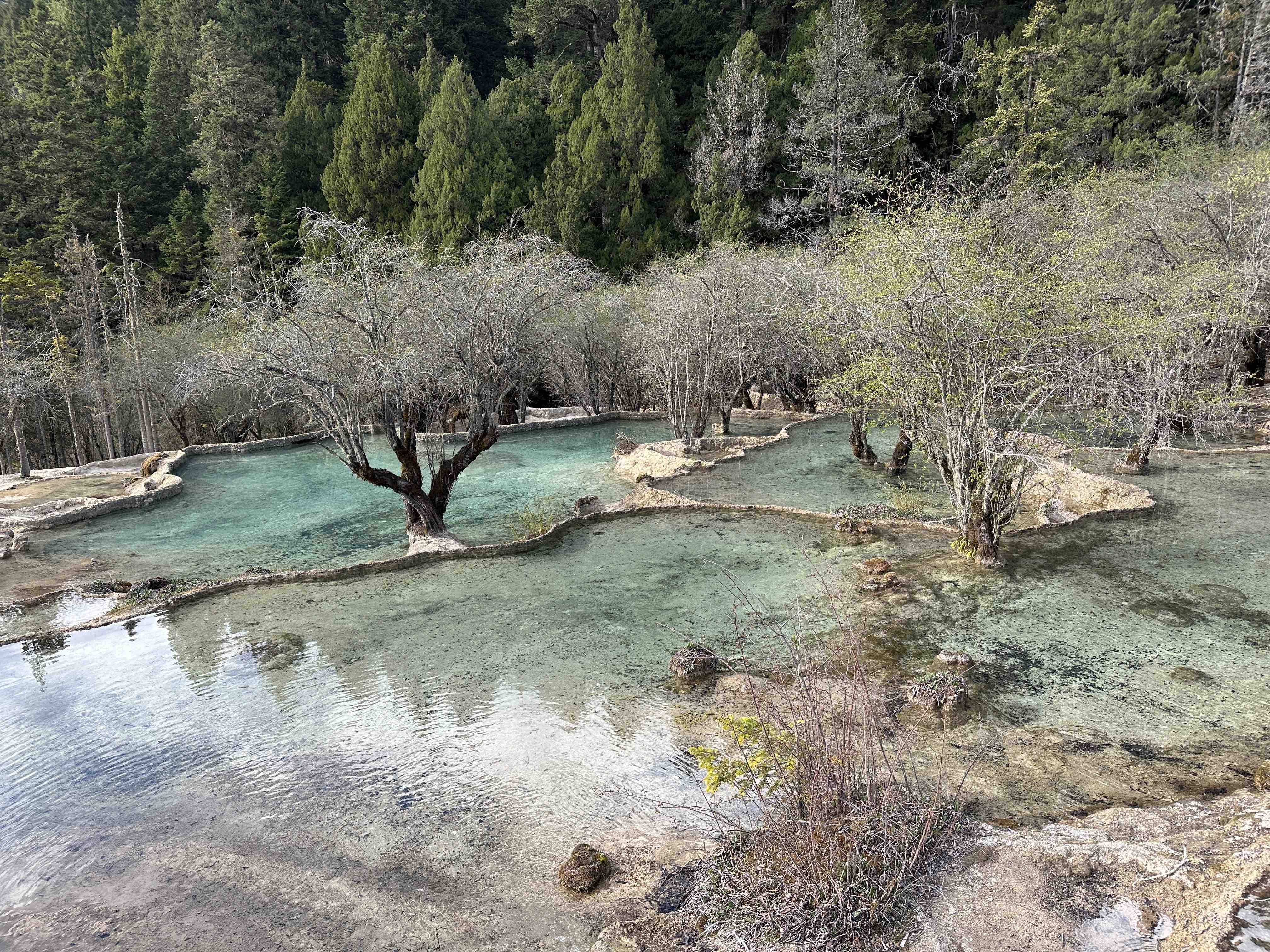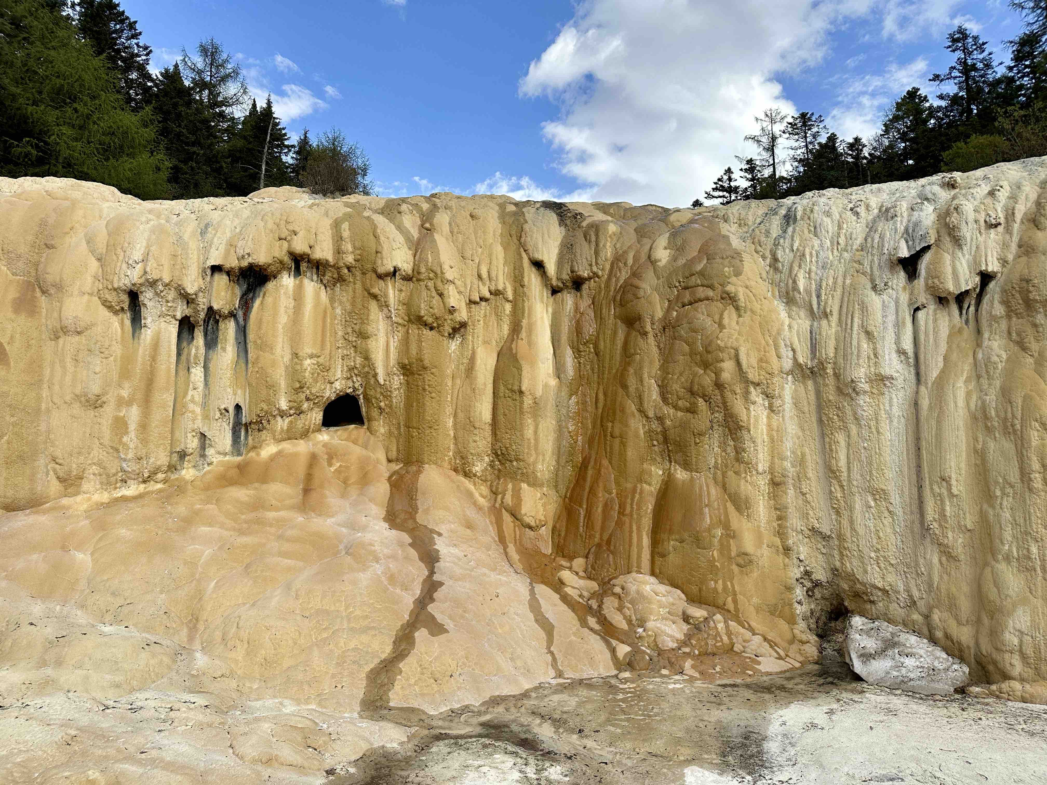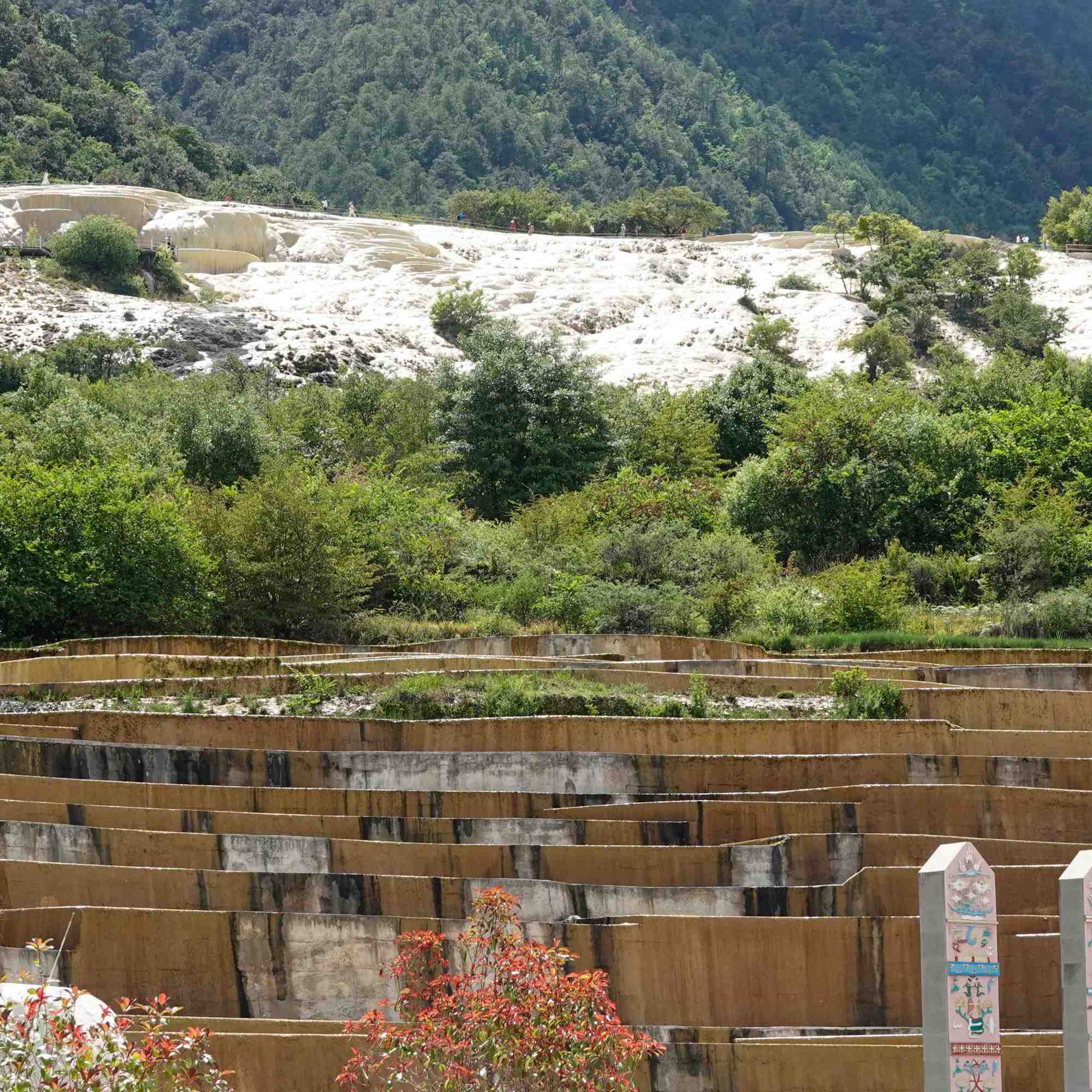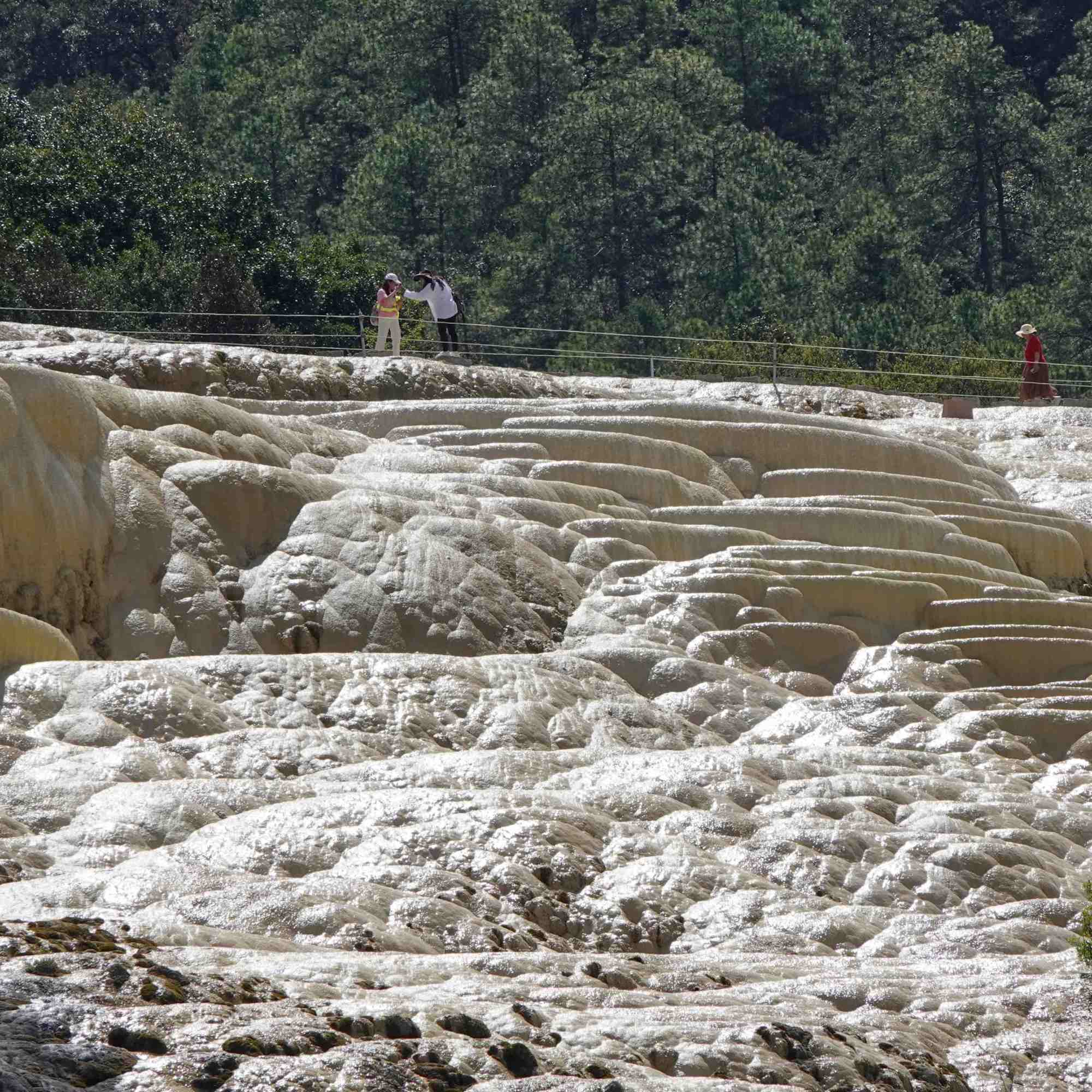 Anschließend fahren wir noch ein Stück weiter zu den White Water Terraces, eine kleine Ausgabe der Sinterterrassen von Huanglong. Es ist unglaublich heiß und wir verzichten auf eine weitere Kraxeltour.