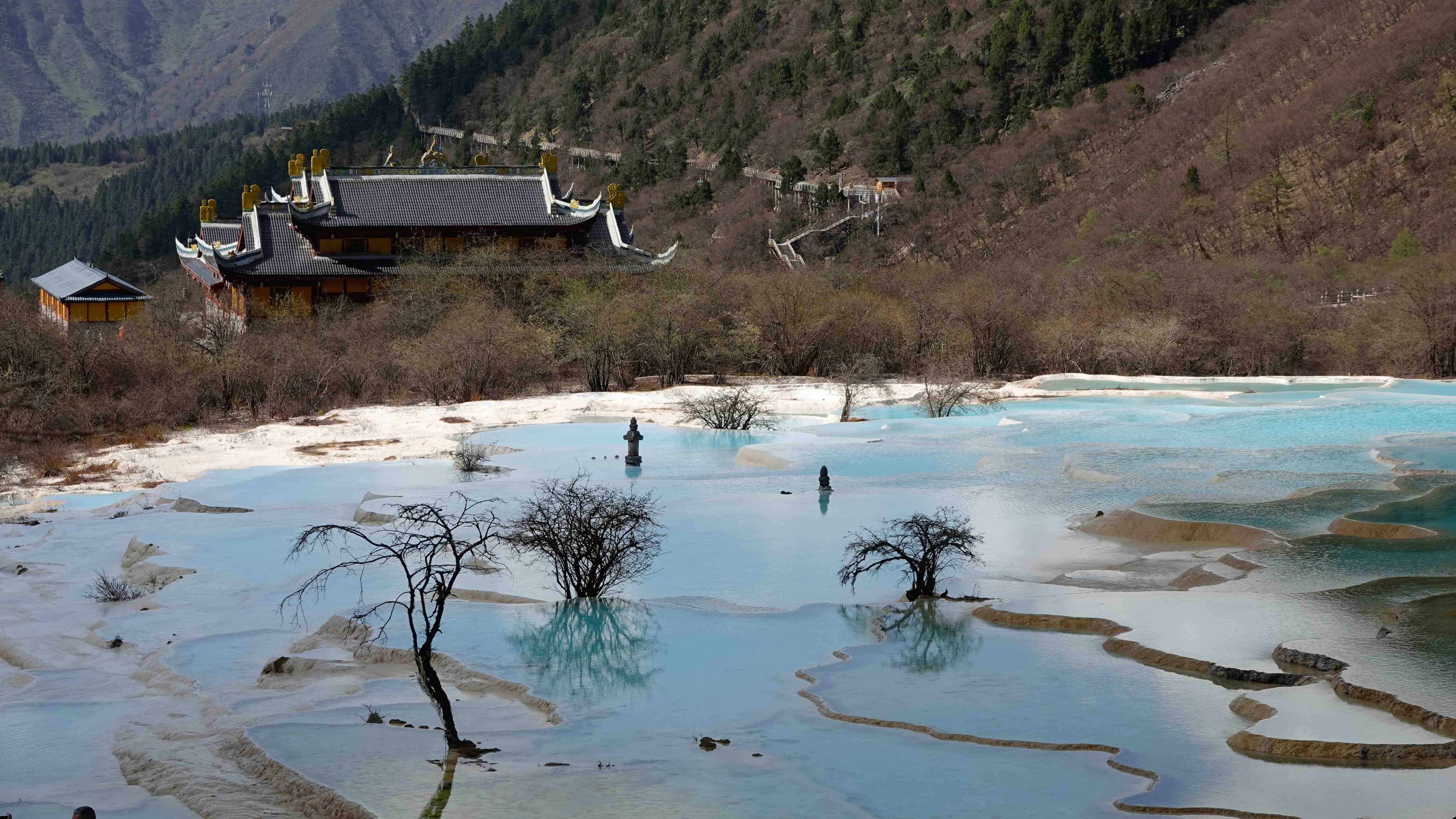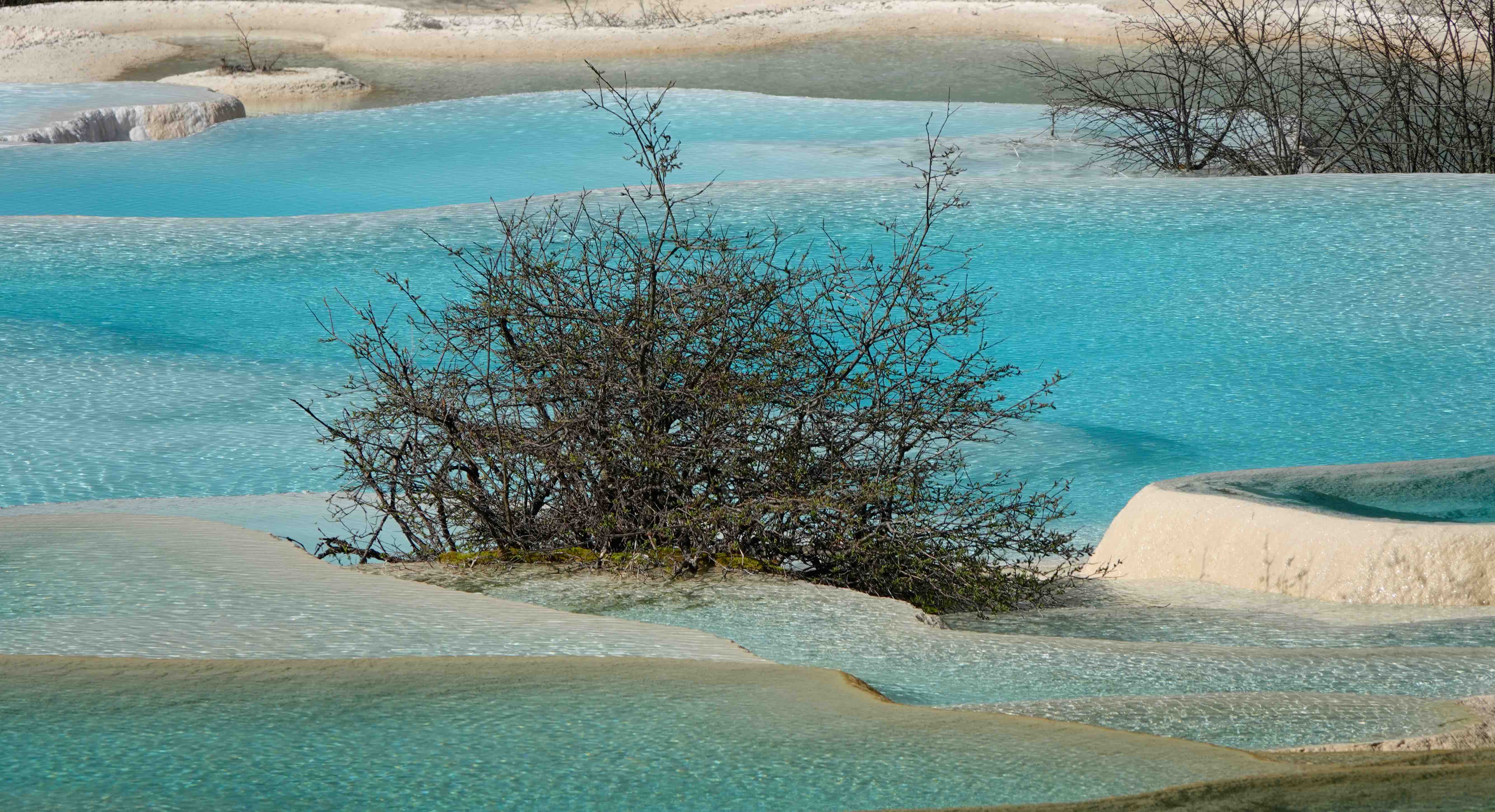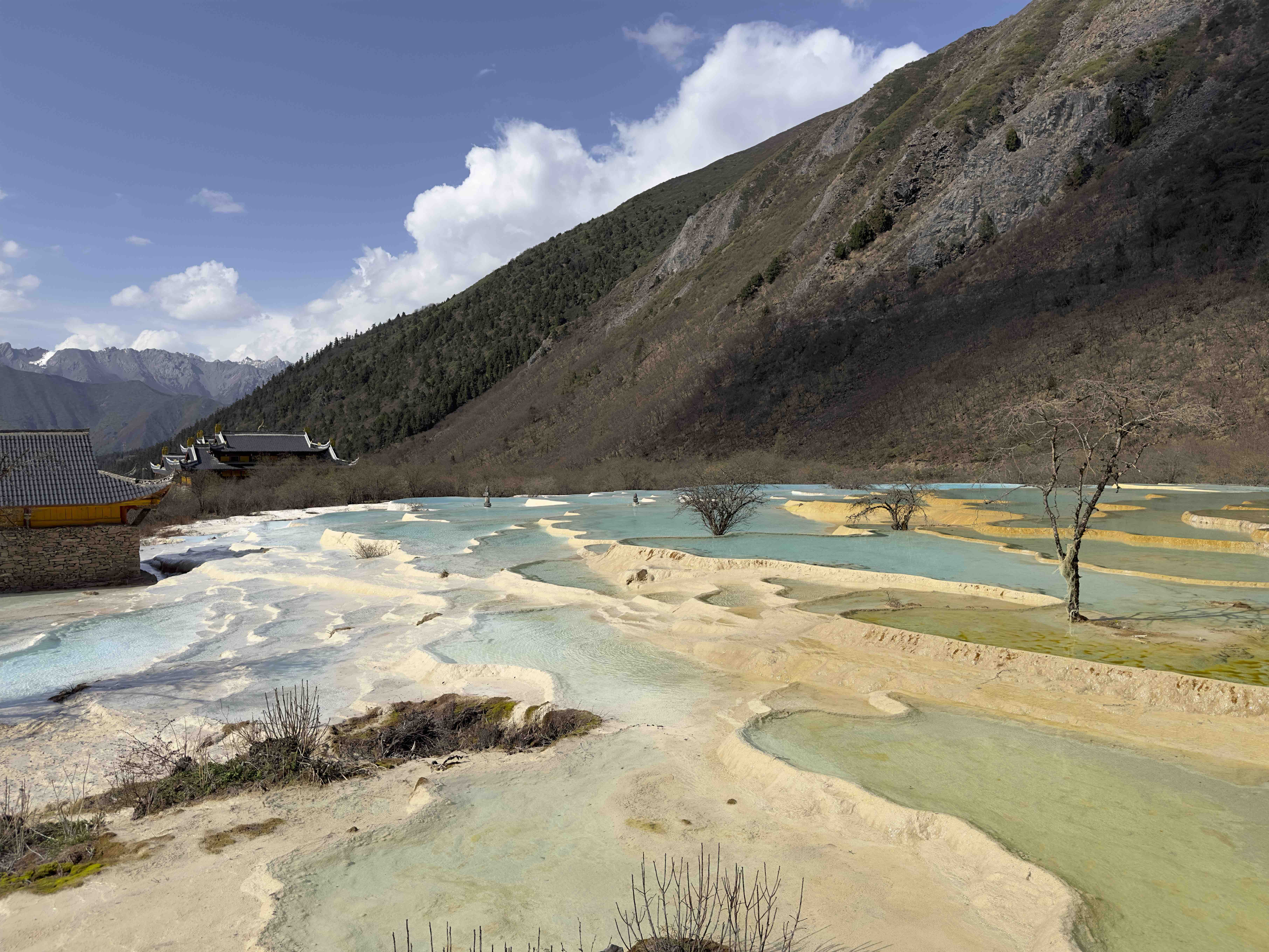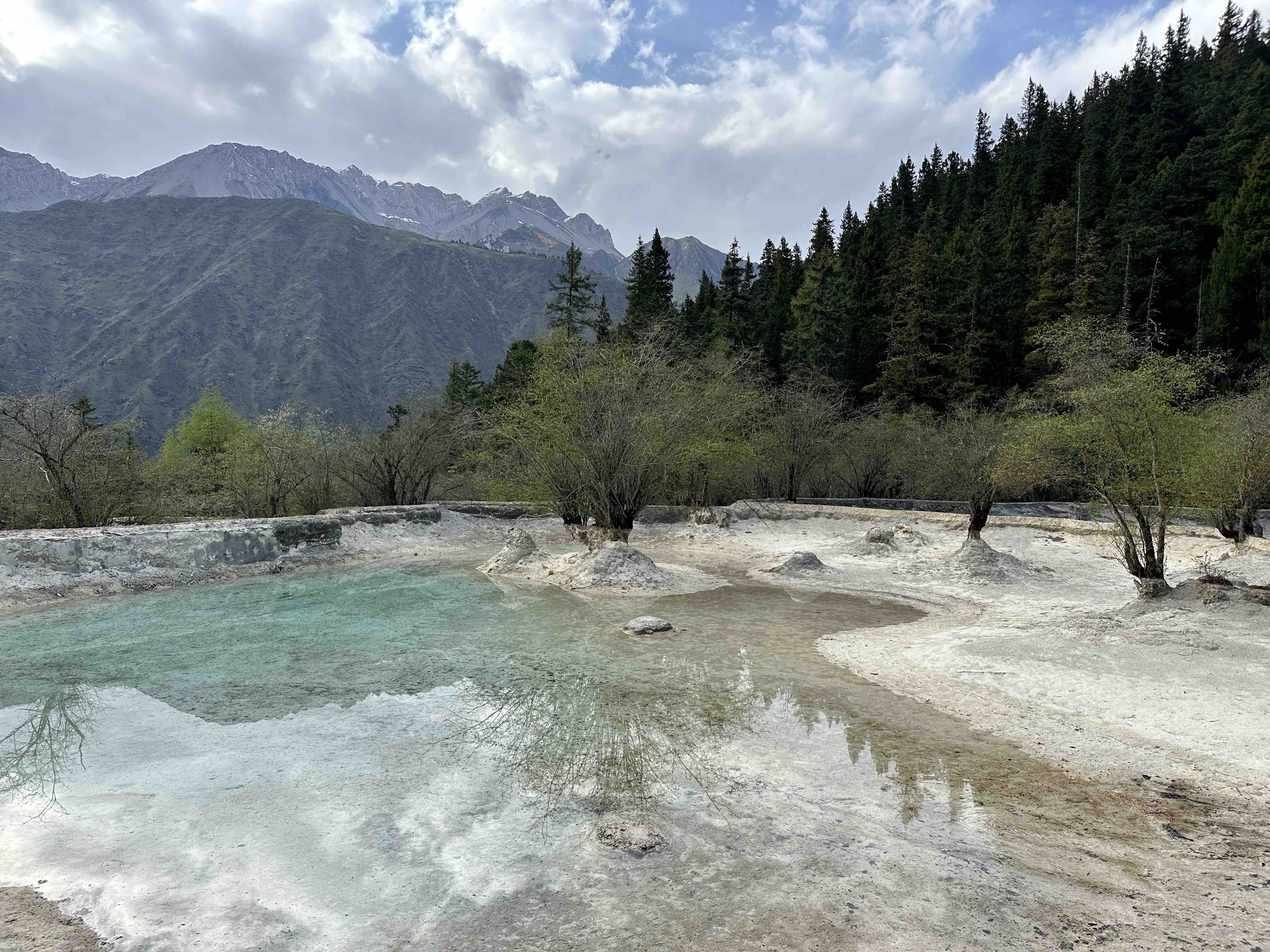 Anschließend fahren wir noch ein Stück weiter zu den White Water Terraces, eine kleine Ausgabe der Sinterterrassen von Huanglong. Es ist unglaublich heiß und wir verzichten auf eine weitere Kraxeltour.