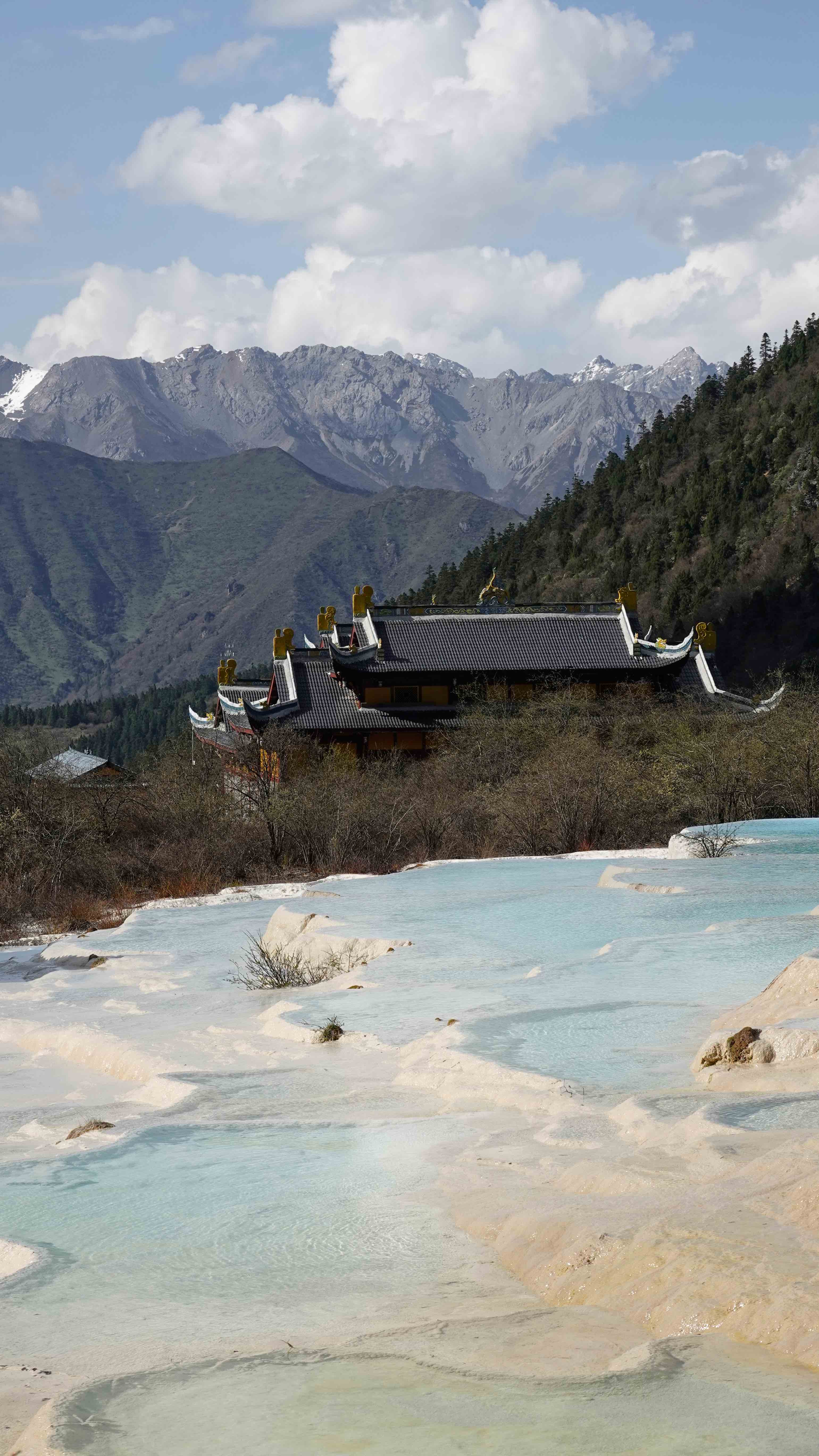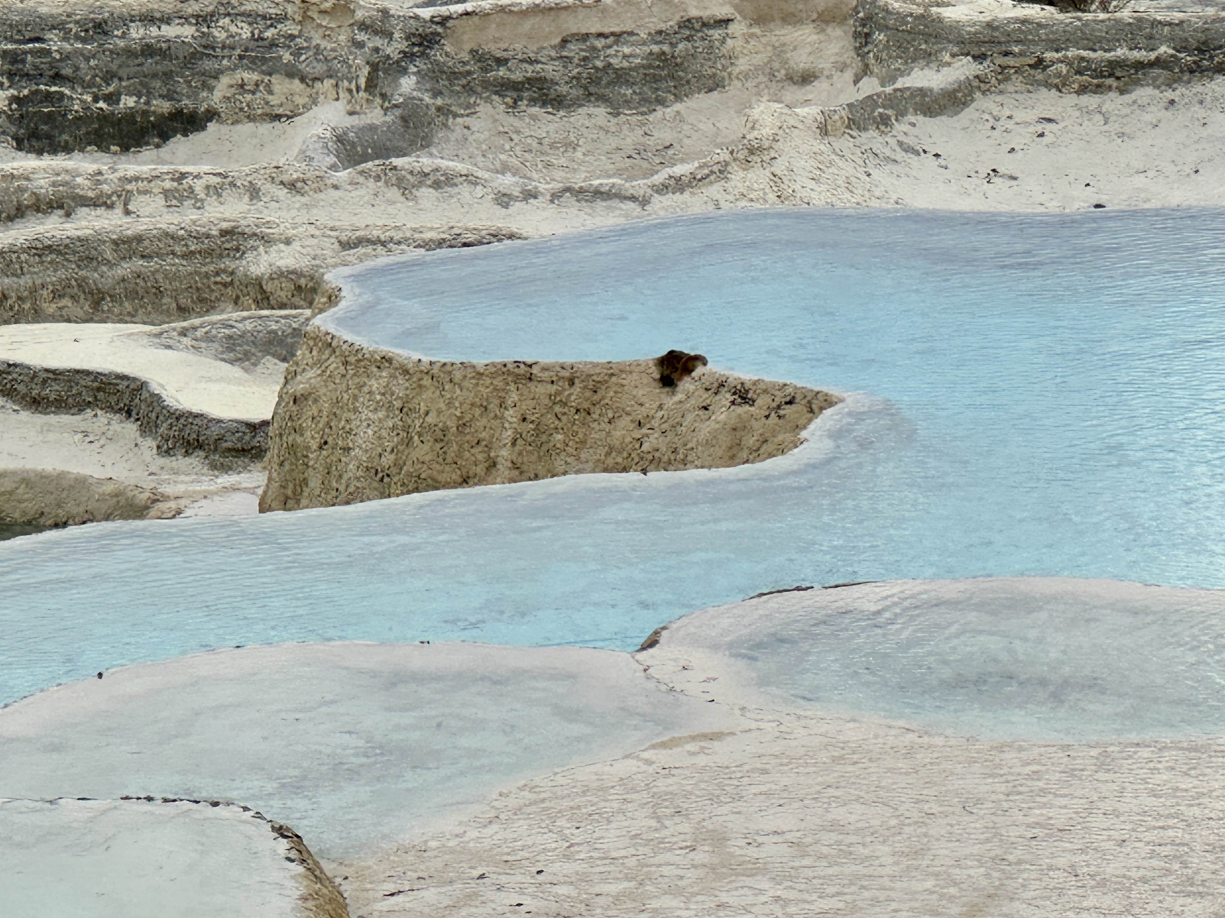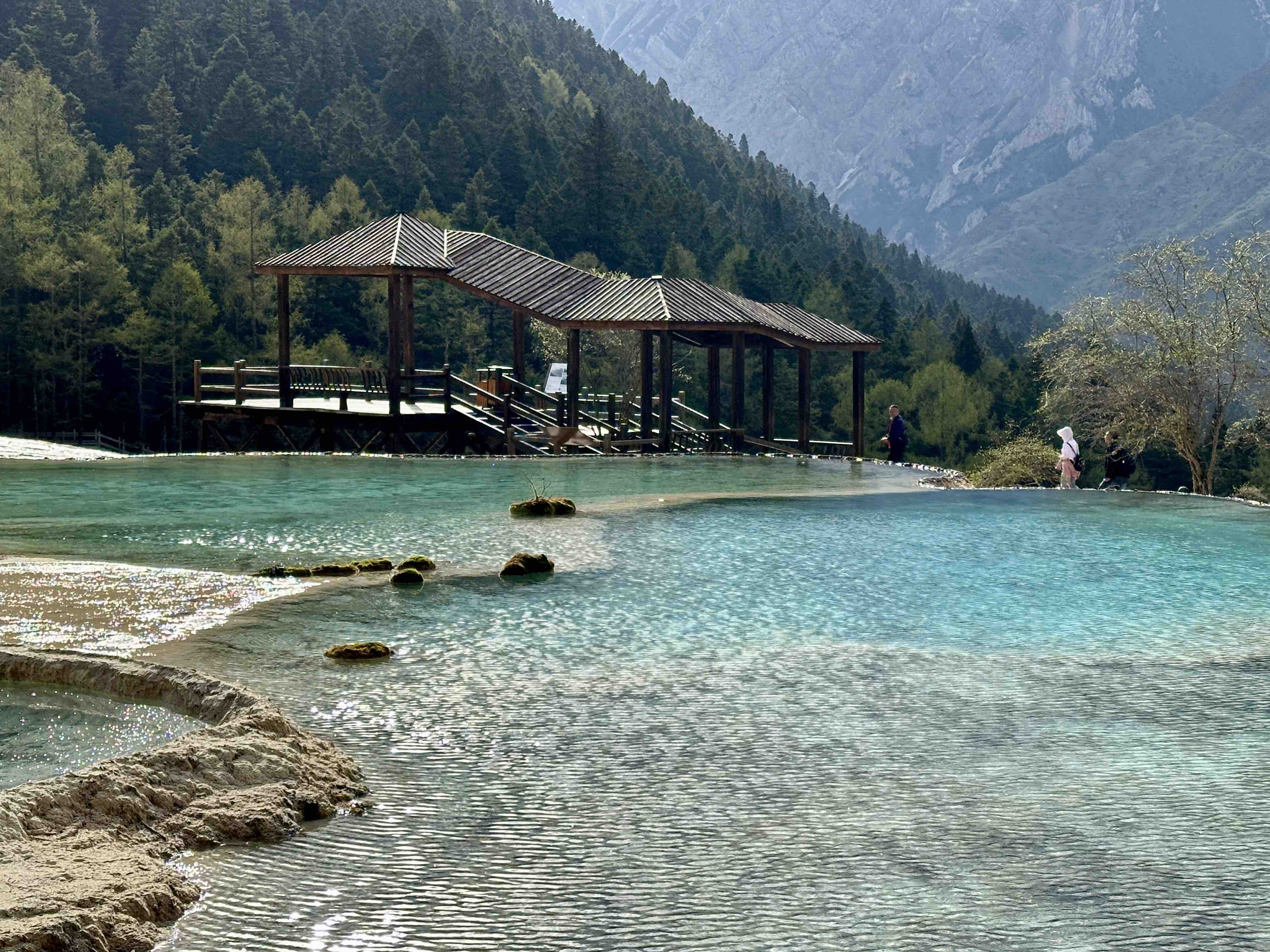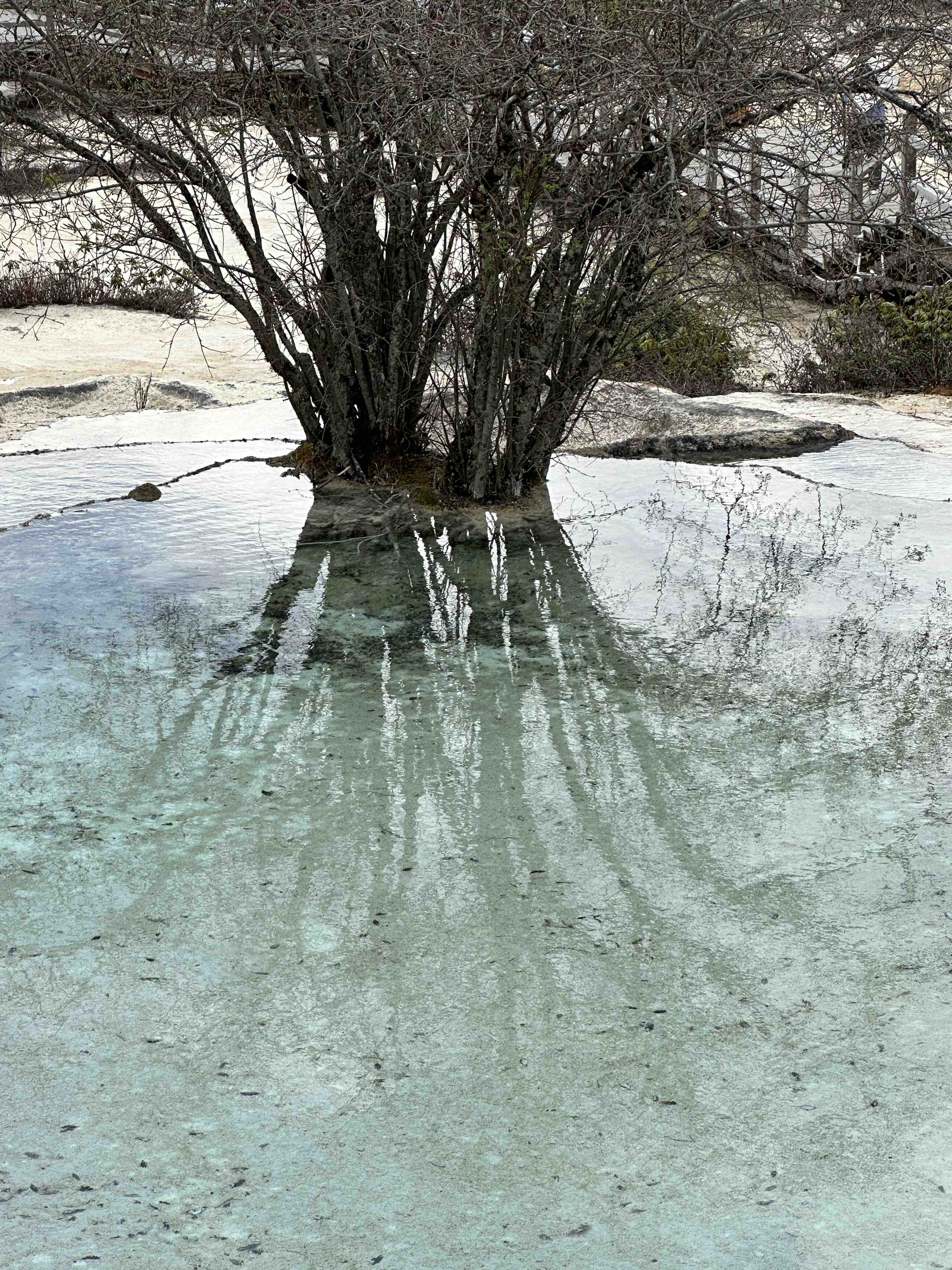 Anschließend fahren wir noch ein Stück weiter zu den White Water Terraces, eine kleine Ausgabe der Sinterterrassen von Huanglong. Es ist unglaublich heiß und wir verzichten auf eine weitere Kraxeltour.