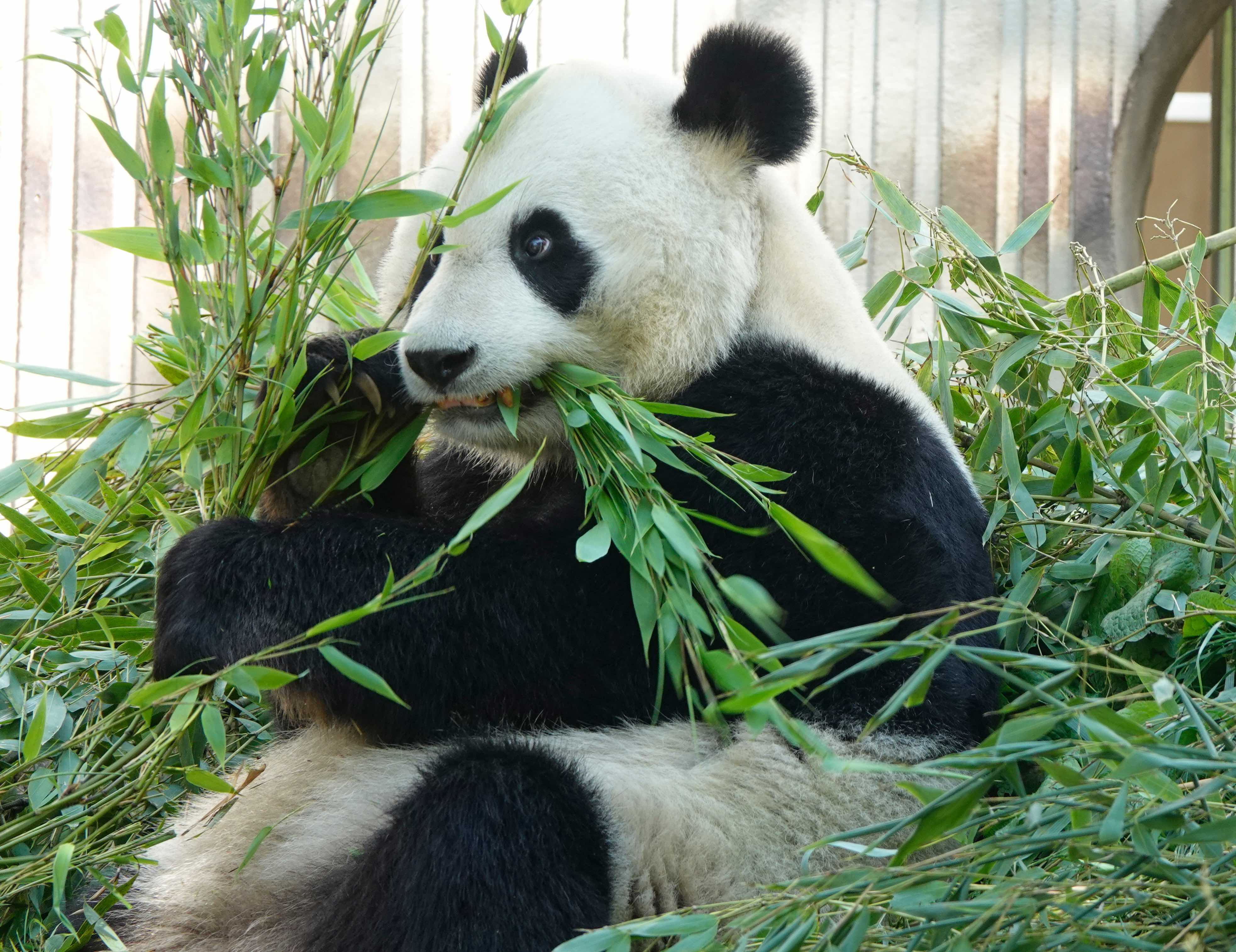 Es ist gerade Fütterungszeit und der frische Bambus lockt die Pandas ins Freigehege. Der Bambus muss übrigens aus den höher gelegenen Regionen Chinas herangeholt werden, die hier üppig sprießende Bambusart verschmähen sie.