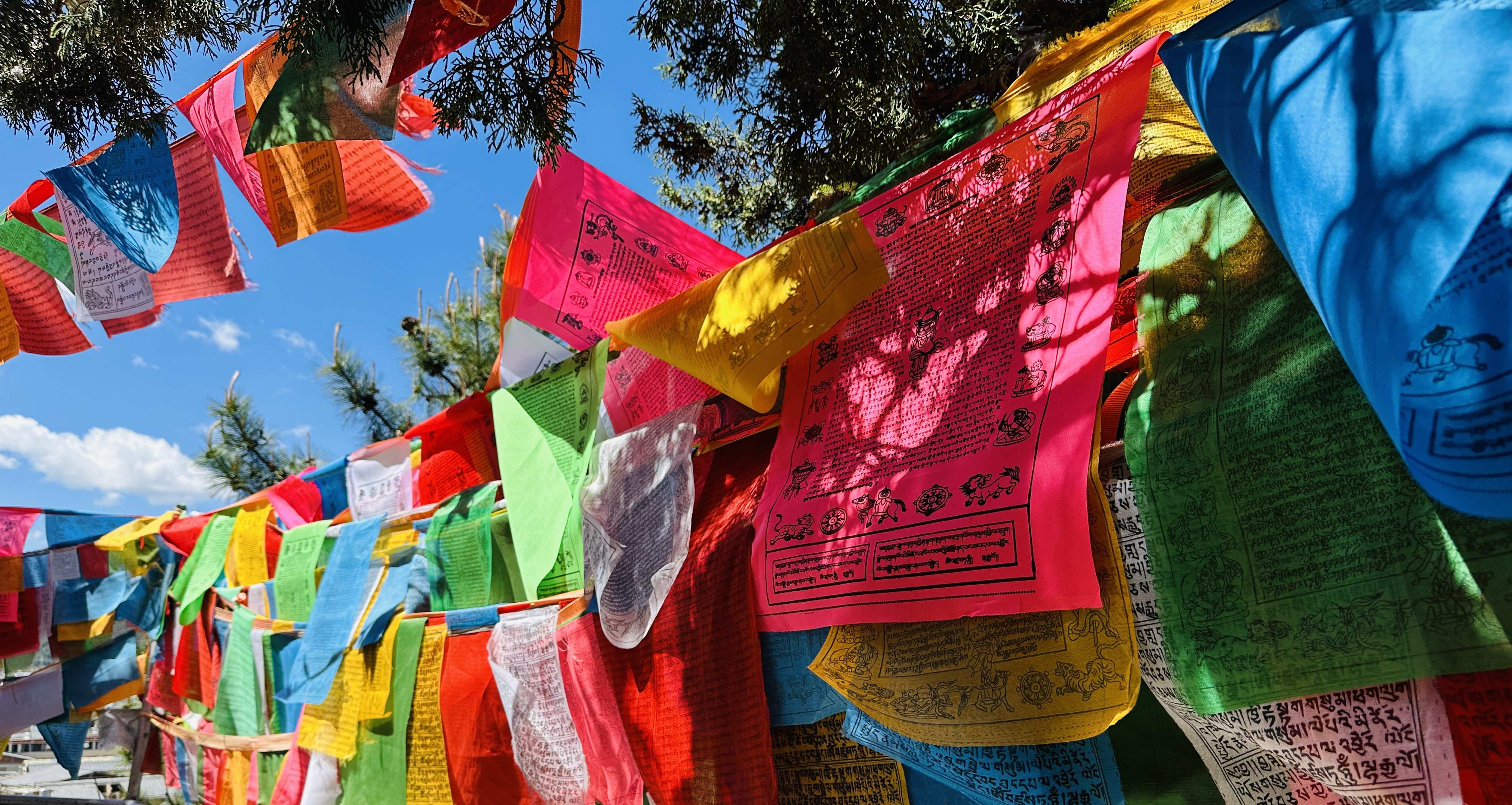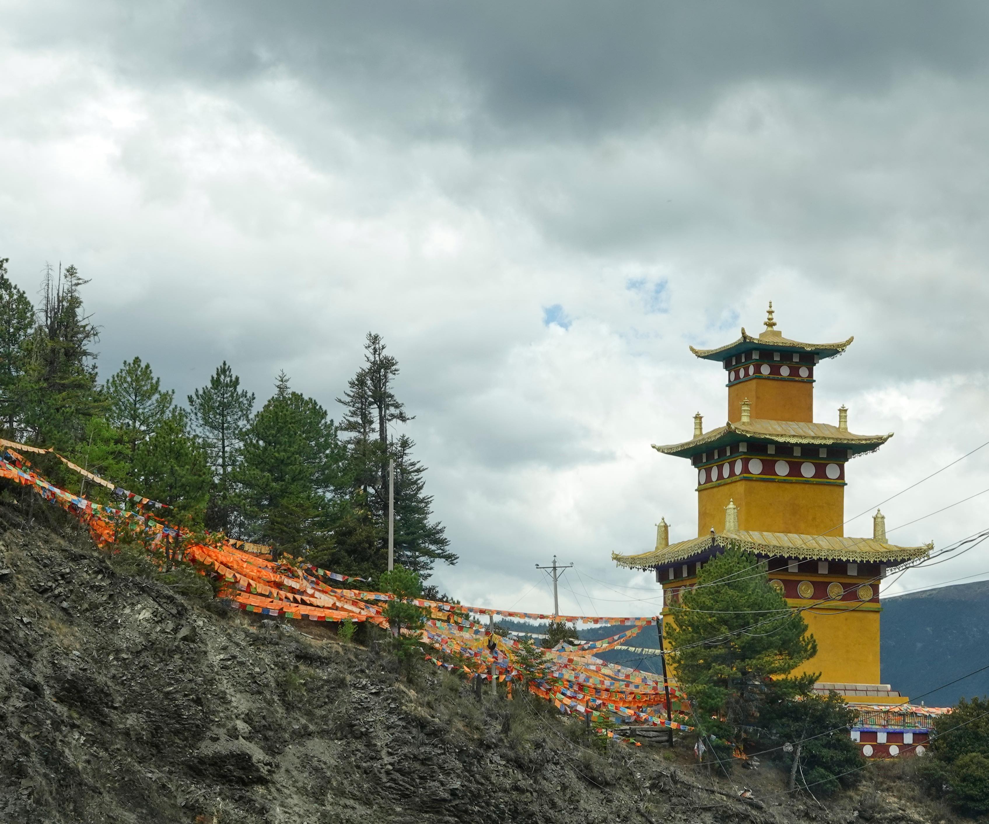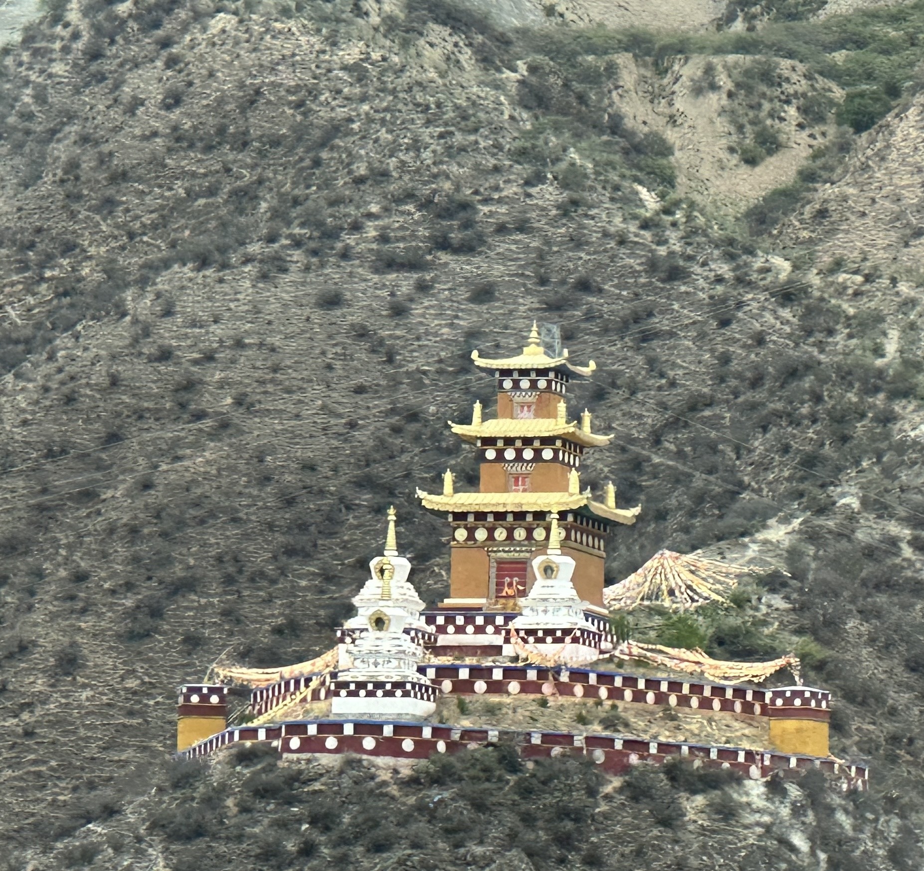 Es geht immer weiter südwärts, durch die grandiose Bergwelt des Himalaya. In den Bergen sind immer wieder hübsche Dörfer im tibetischen Stil zu sehen, viele Tempel und die hübschen tibetischen Gebetsfahnen. Das Aufhängen dieser Fahnen soll den Krieg vertreiben und den Frieden auf die Erde bringen.