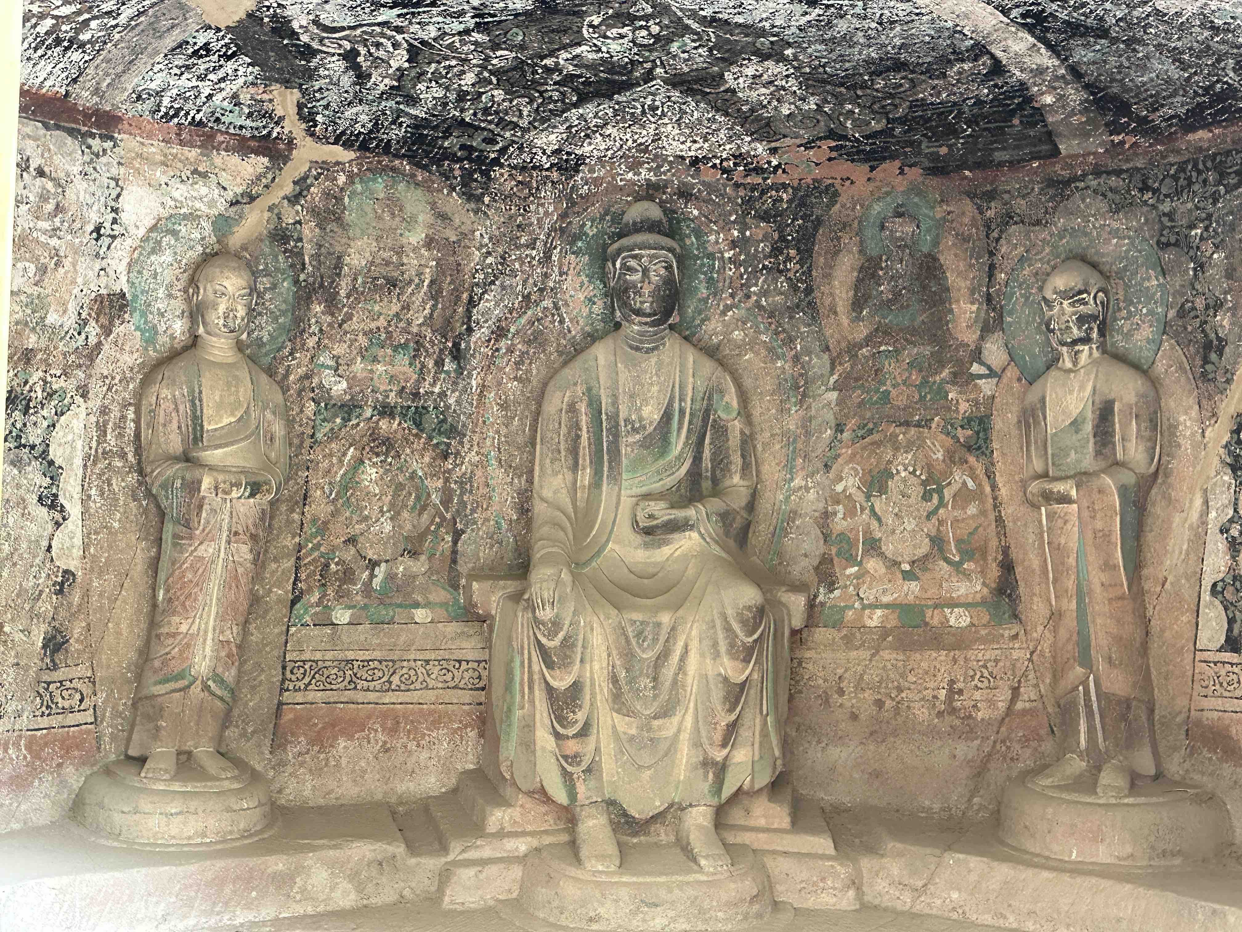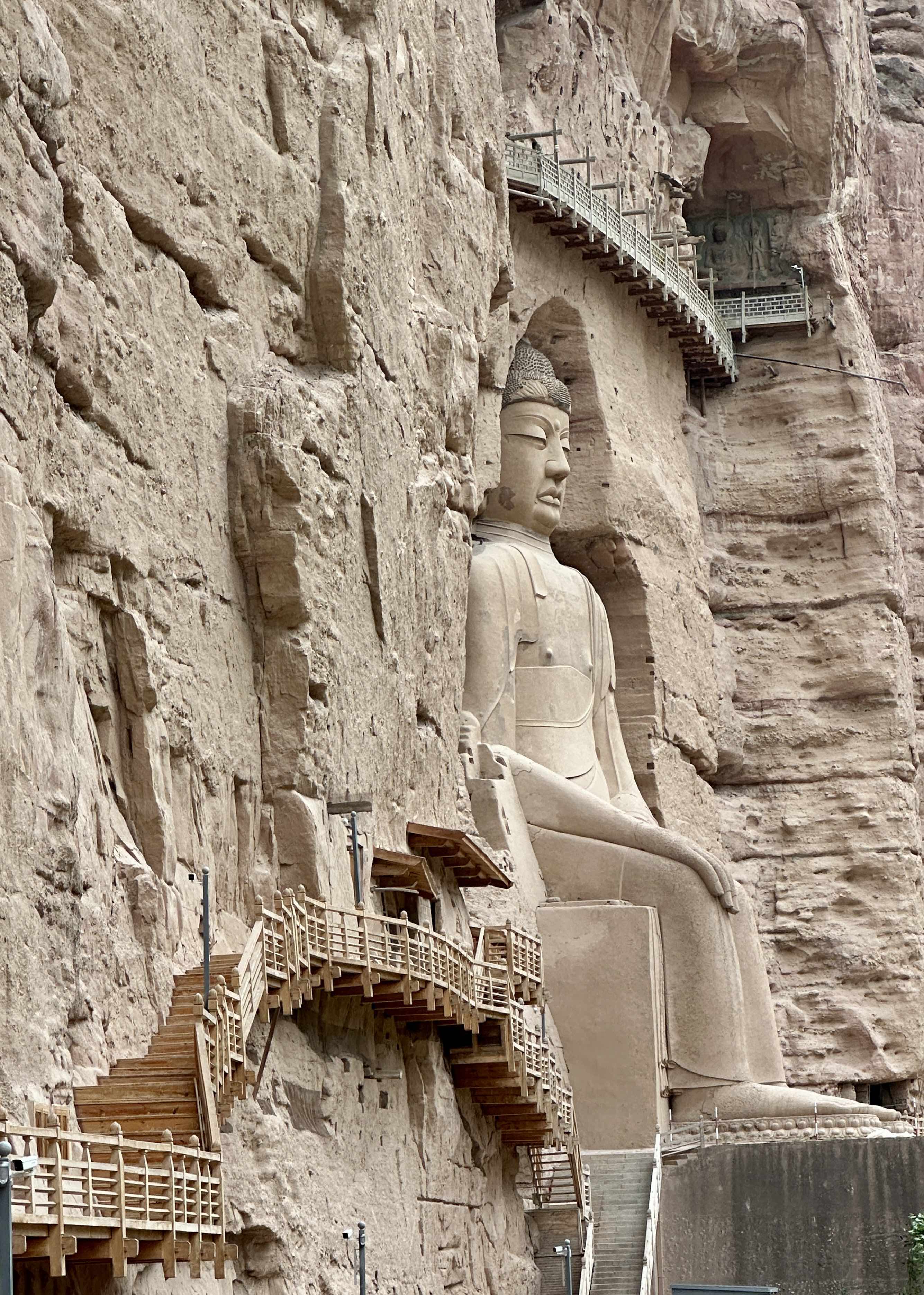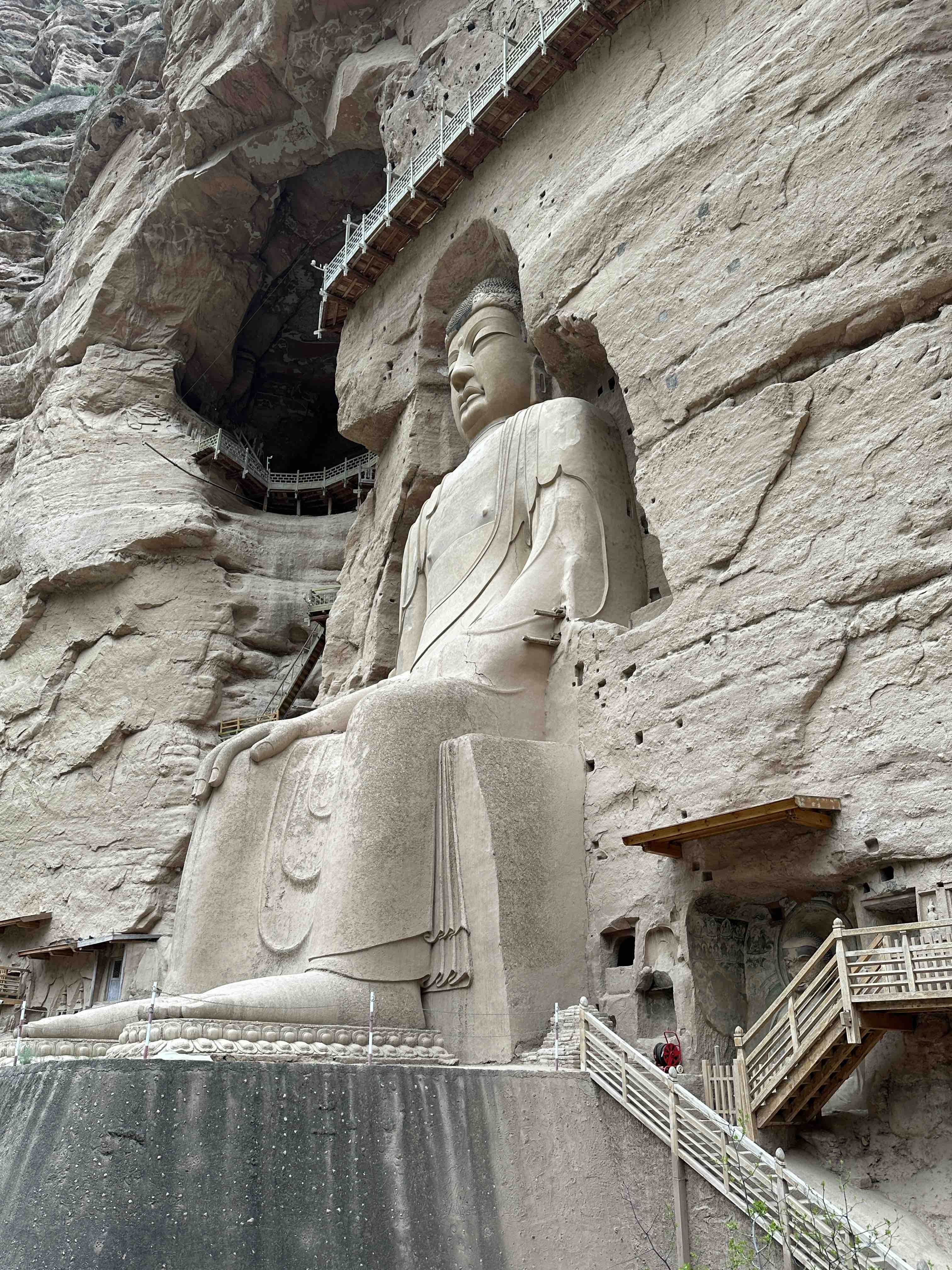 Ich mache die Besichtigung daher allein mit Yinchou und einer Fremdenführerin, die alles auf Englisch erklärt. Der Bingling-Tempel ist die Bezeichnung für das gesamte Areal. Es gibt wieder viele in die Felswand geschlagene Nischen, die allerdings nicht betreten werden können da sie schlicht zu klein sind. Entstanden sind sie im 3. – 15. Jahrhundert n.Chr. und ausgestattet mit prächtigen Wandmalereien und Statuen.