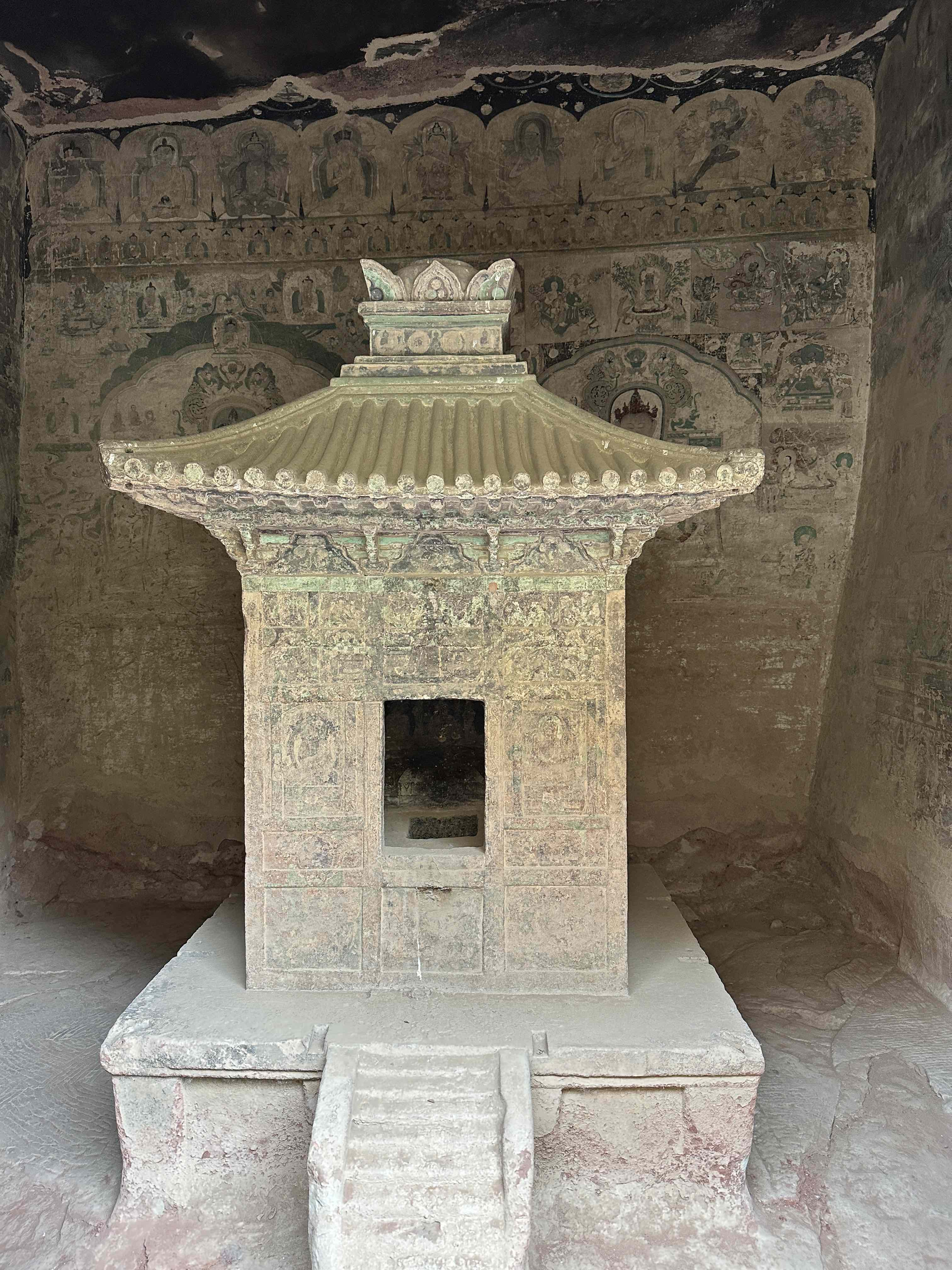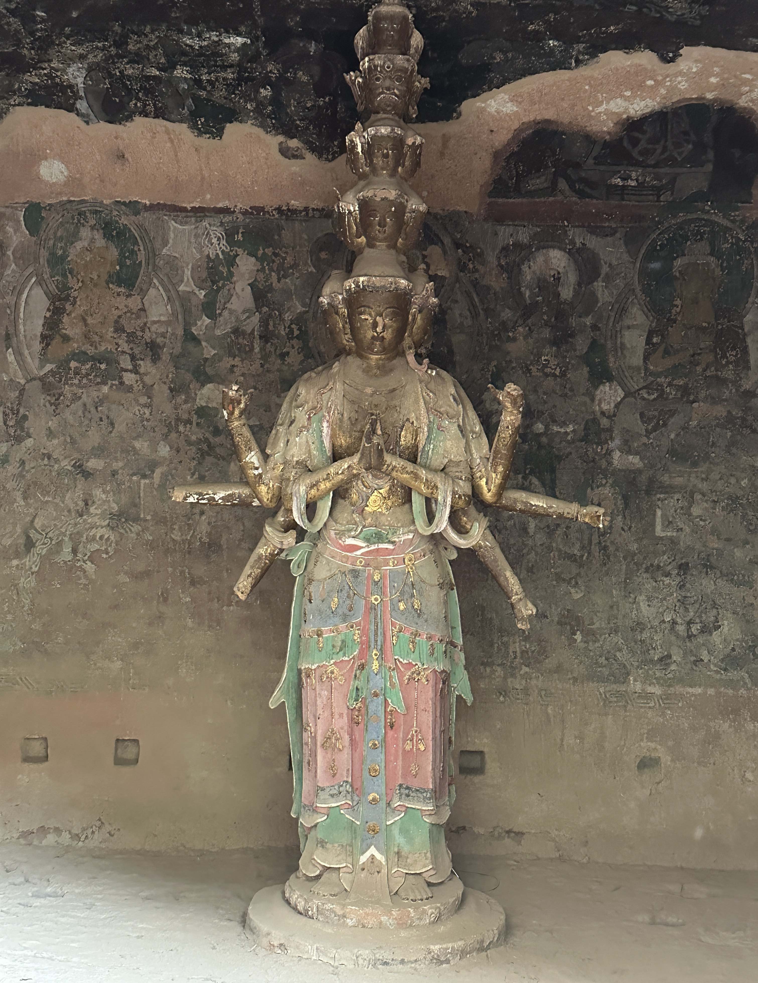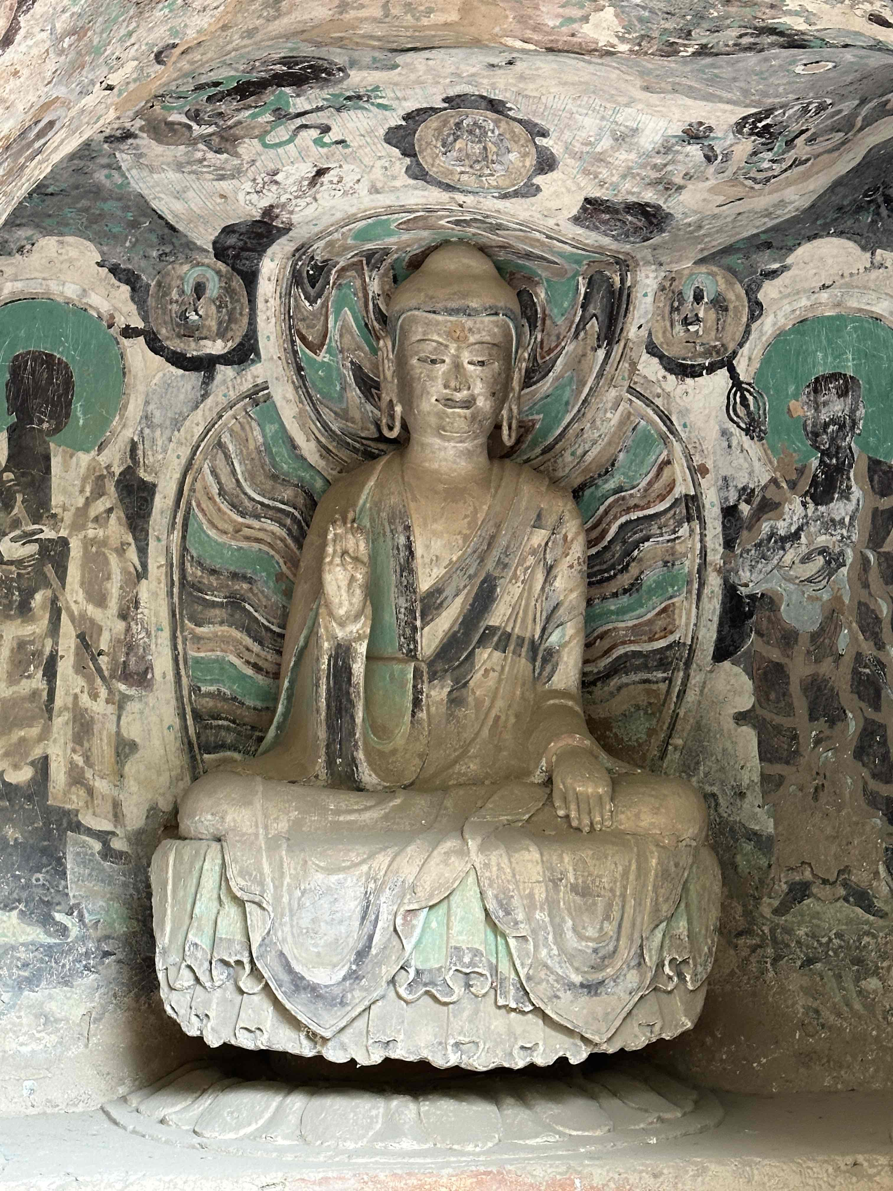 Ich mache die Besichtigung daher allein mit Yinchou und einer Fremdenführerin, die alles auf Englisch erklärt. Der Bingling-Tempel ist die Bezeichnung für das gesamte Areal. Es gibt wieder viele in die Felswand geschlagene Nischen, die allerdings nicht betreten werden können da sie schlicht zu klein sind. Entstanden sind sie im 3. – 15. Jahrhundert n.Chr. und ausgestattet mit prächtigen Wandmalereien und Statuen.