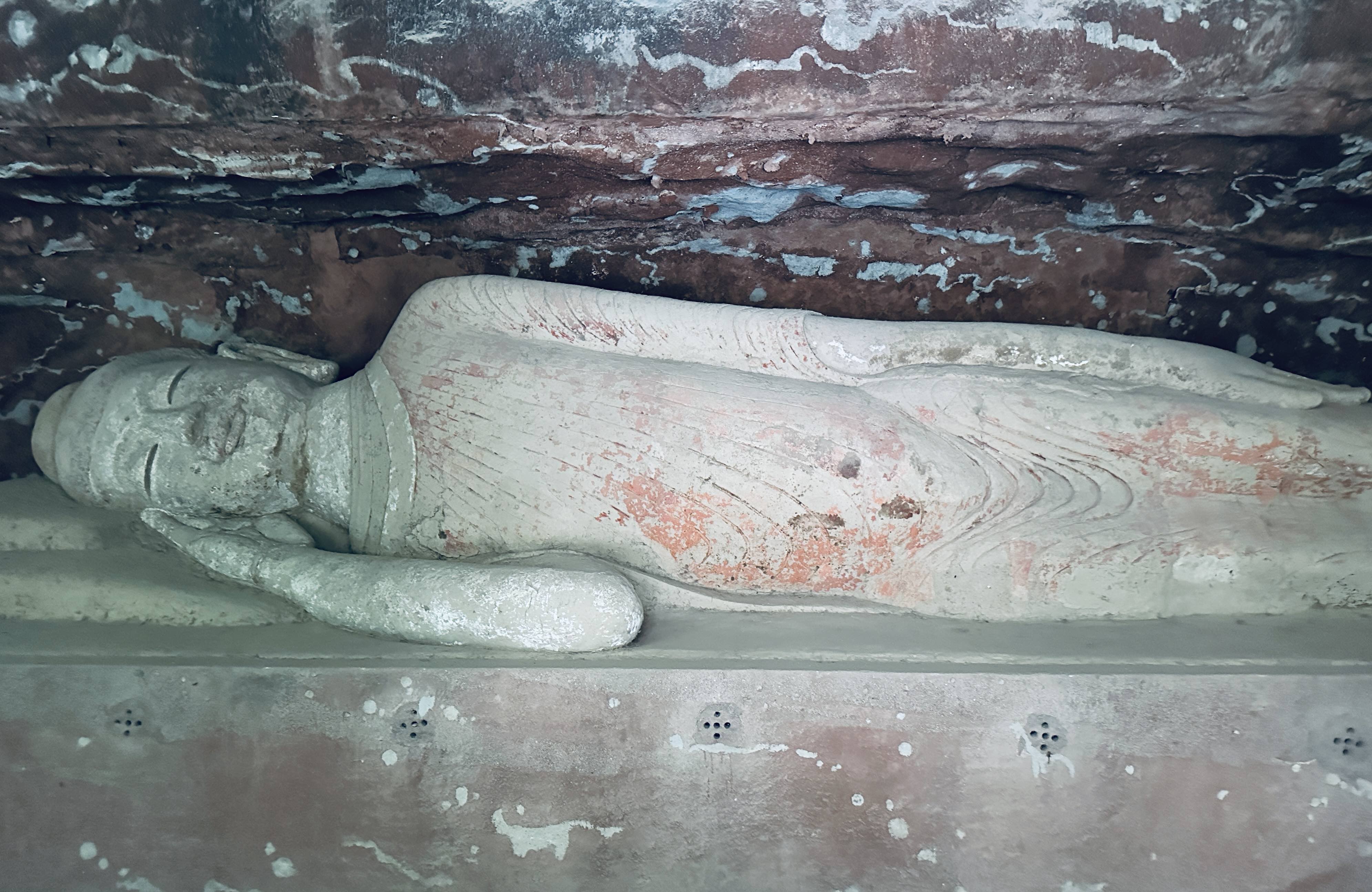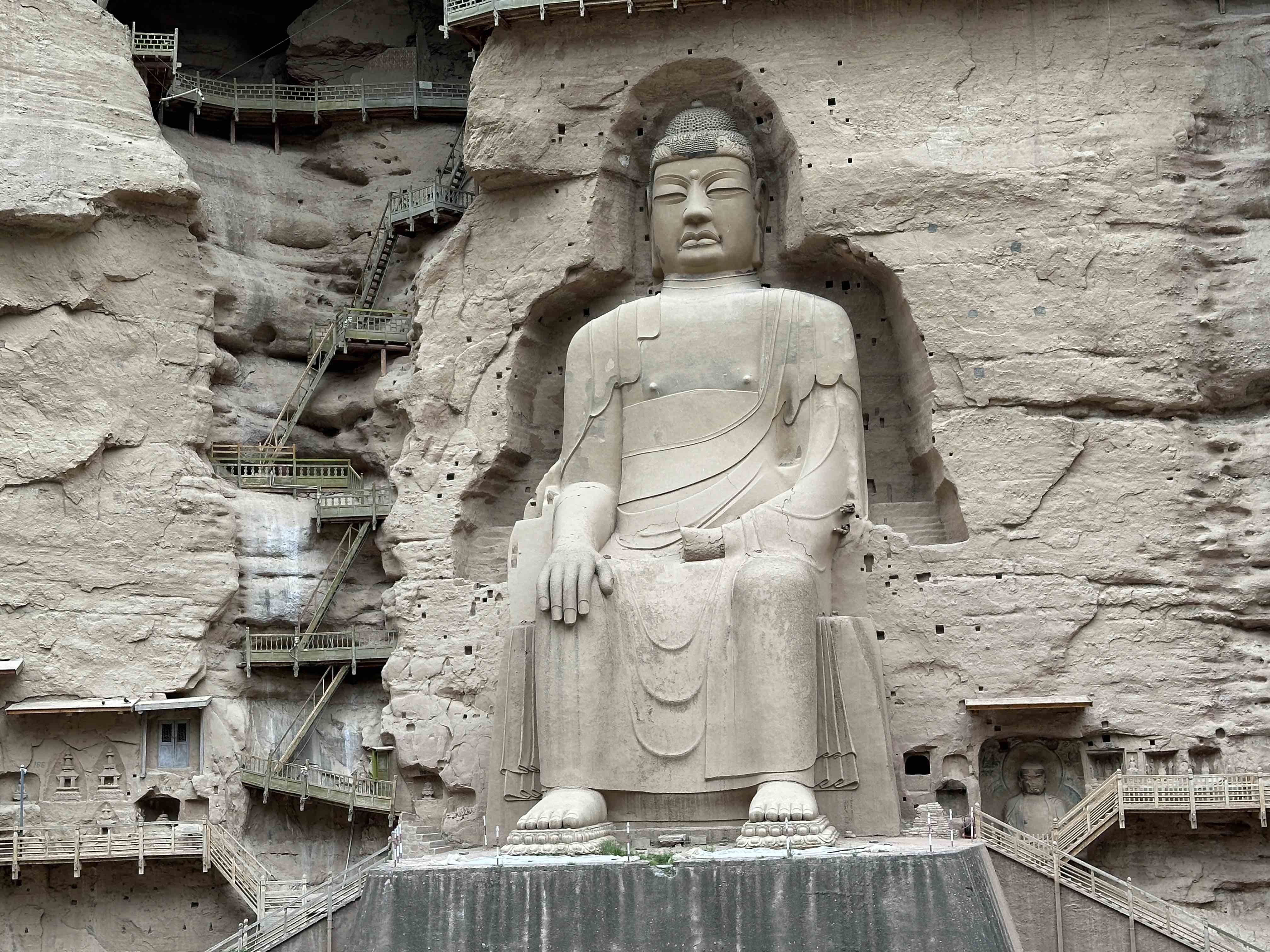 Am Ende der Grotten befindet sich eine 27 m hohe Buddha Statue, deren oberer Teil aus dem Fels geschlagen wurde. Der untere Teil besteht aus Stroh, umgeben von Lehm und muss von Zeit zu Zeit restauriert werden. Hier darf überall fotografiert werden!!!!