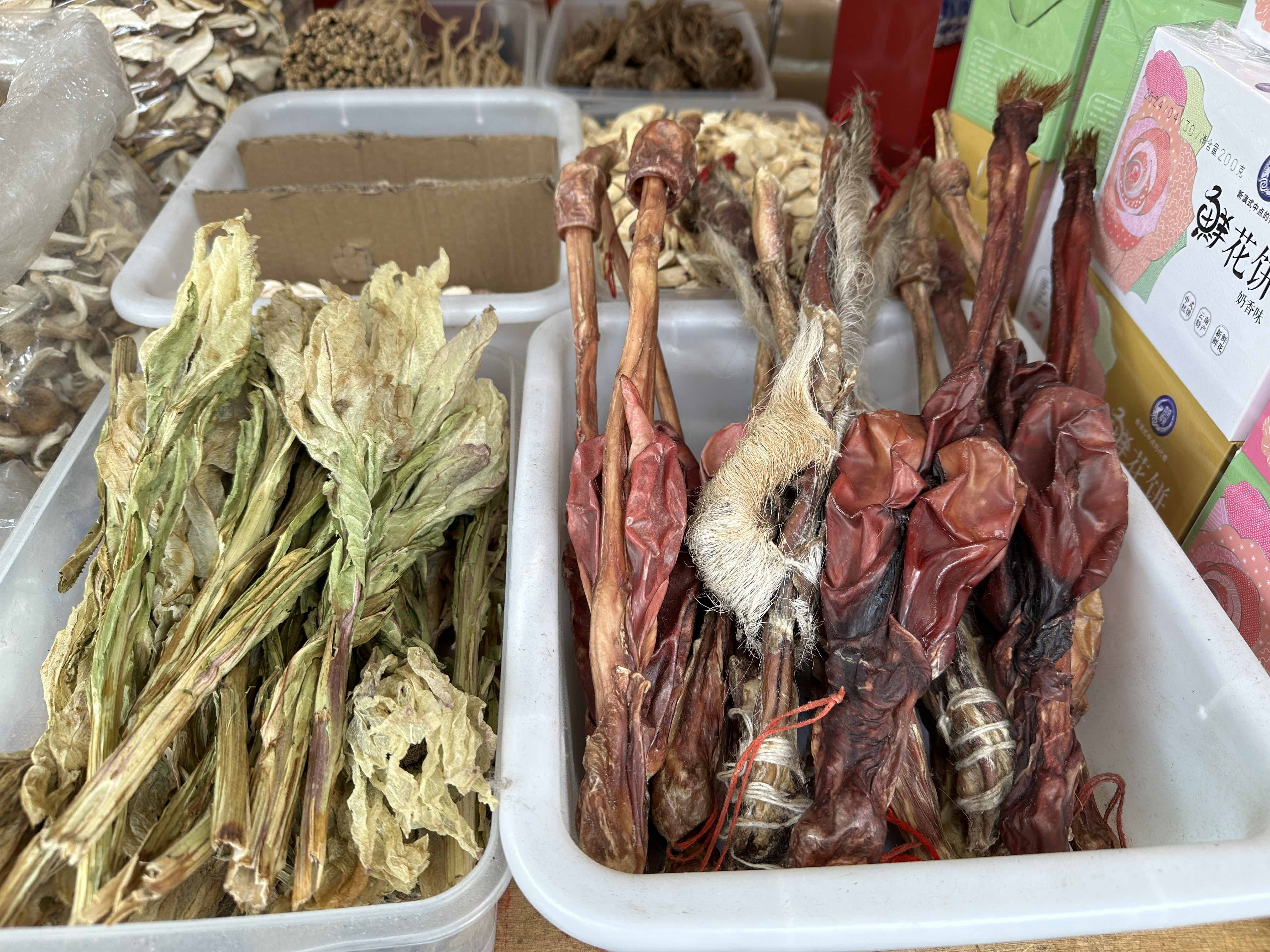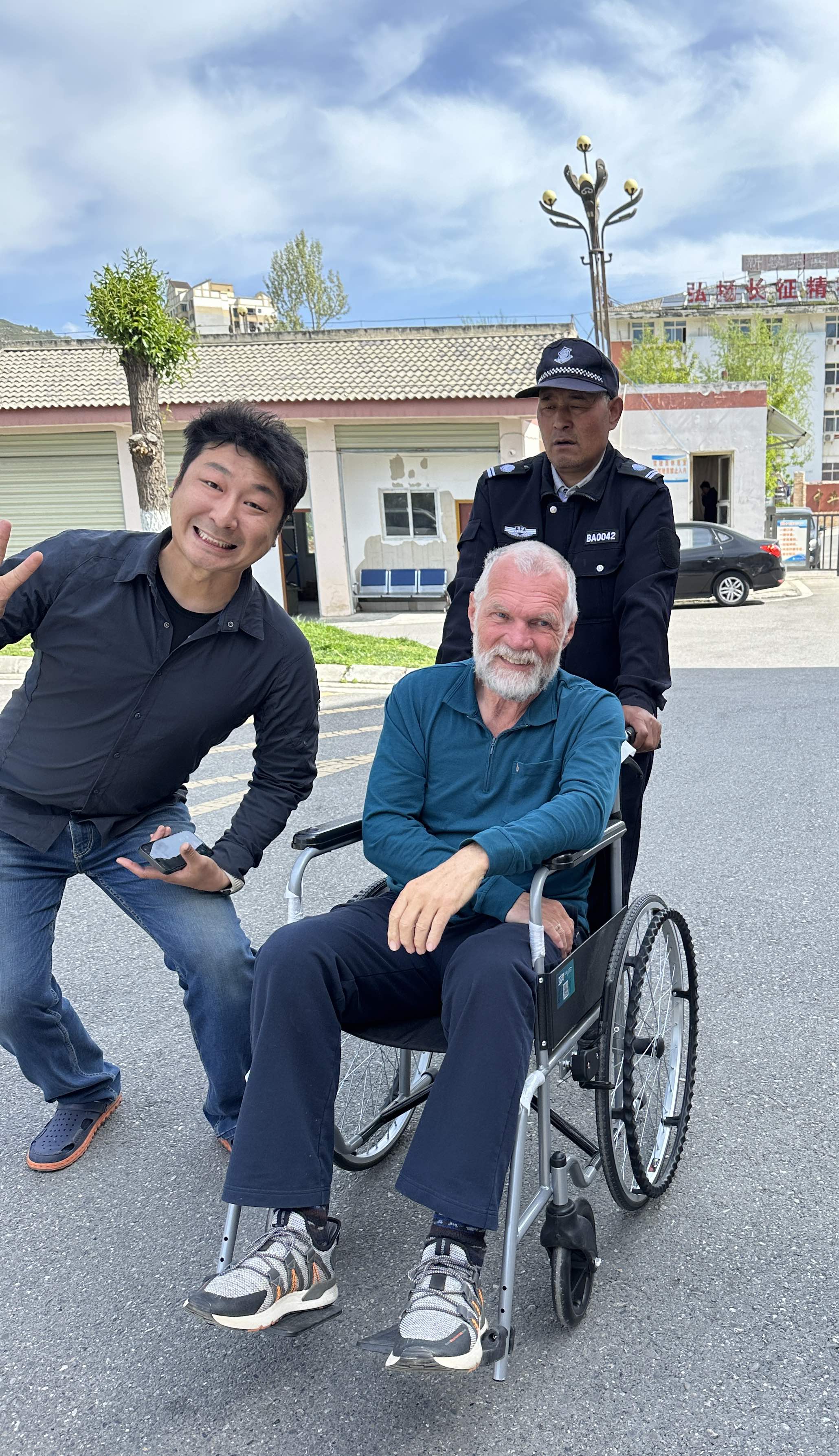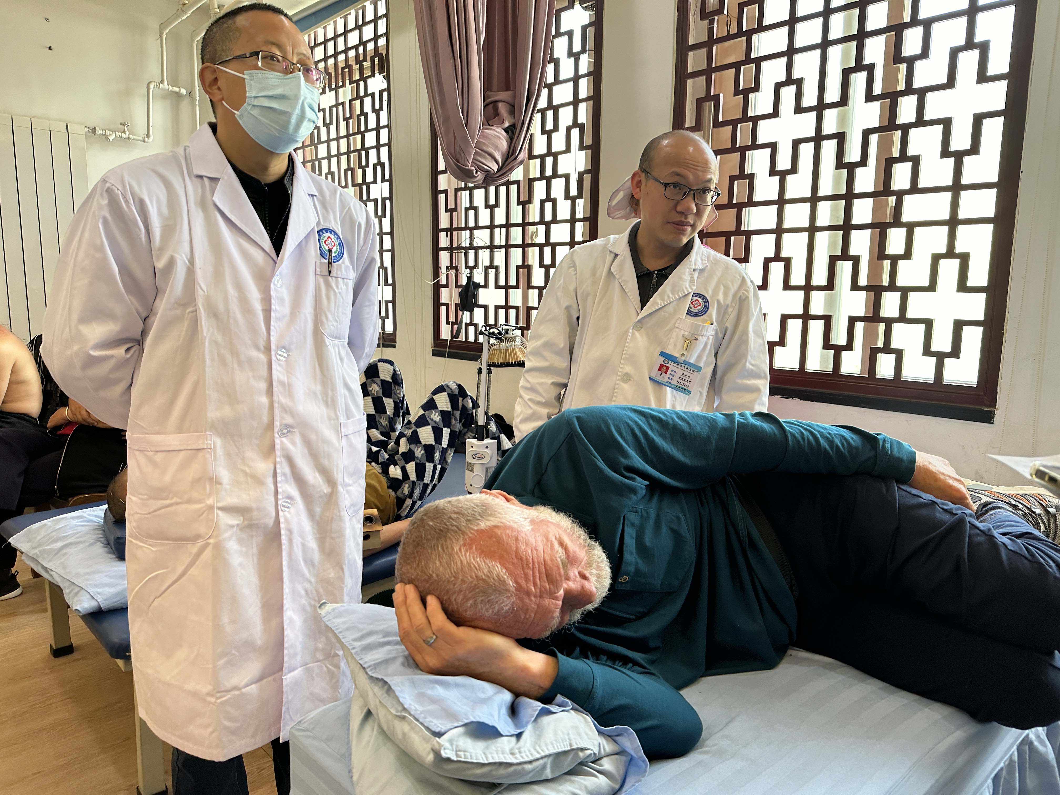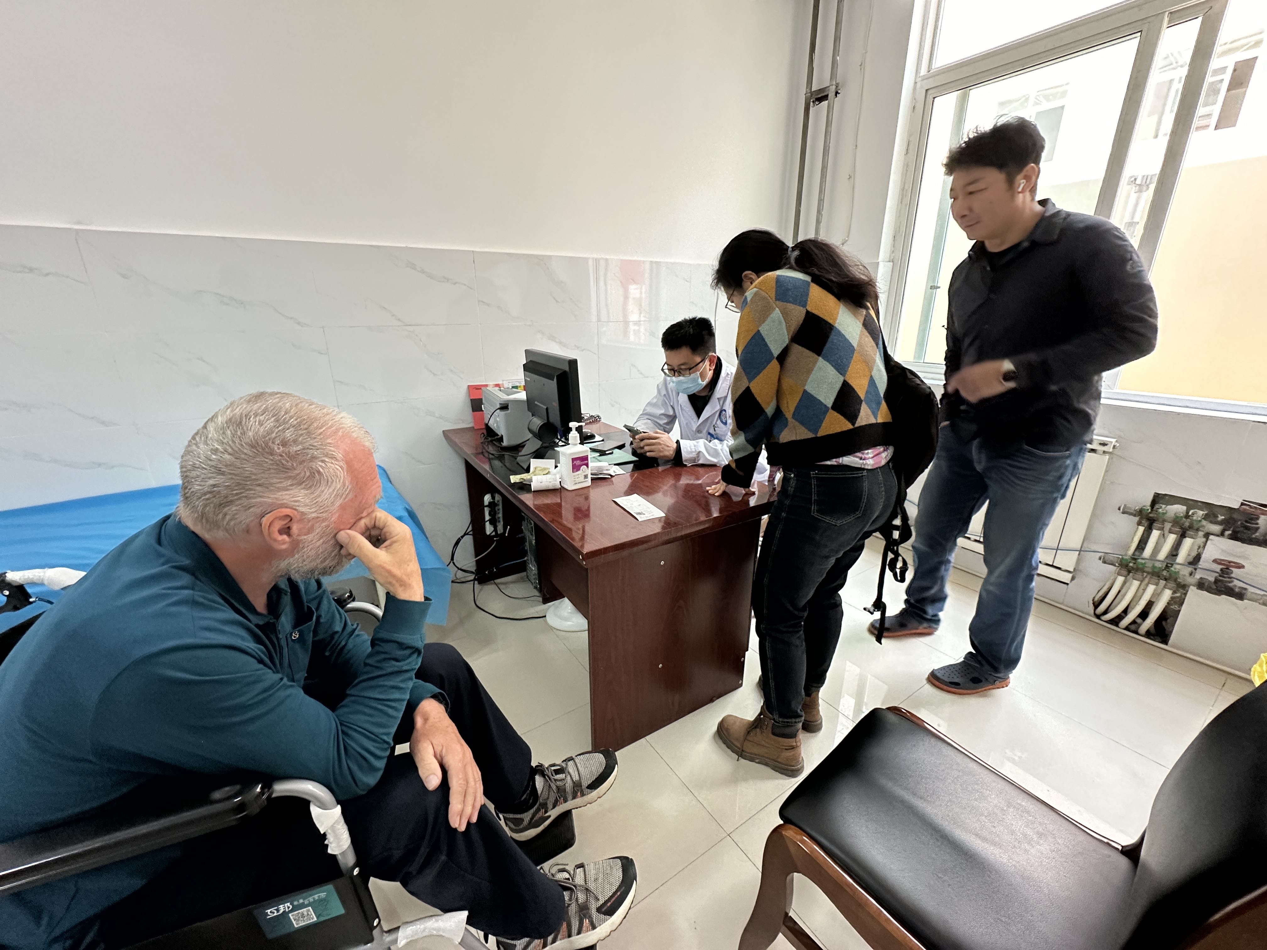 Am nächsten Morgen fahren wir als erstes in die nächste Stadt ins Krankenhaus. Walter kann immer noch nicht laufen und braucht einen Rollstuhl, um hinein zu kommen. Yinchou erledigt alle Formalitäten und Walter bekommt auch sofort einen Termin bei einem Arzt, der einen Bandscheibenvorfall diagnostiziert und eine Behandlung mit traditioneller chinesischer Medizin vorschlägt. Eine schmerzstillende Spritze lehnt er ab, da diese ja nur kurzzeitig wirksam sei. Also gut, Walter lässt sich darauf ein. Es werden Akupunkturnadeln entlang platziert, die mit einer Stromzufuhr verbunden werden, eine Wärmelampe kommt zum Einsatz und ein Glasgefäß zum Kröpfen.