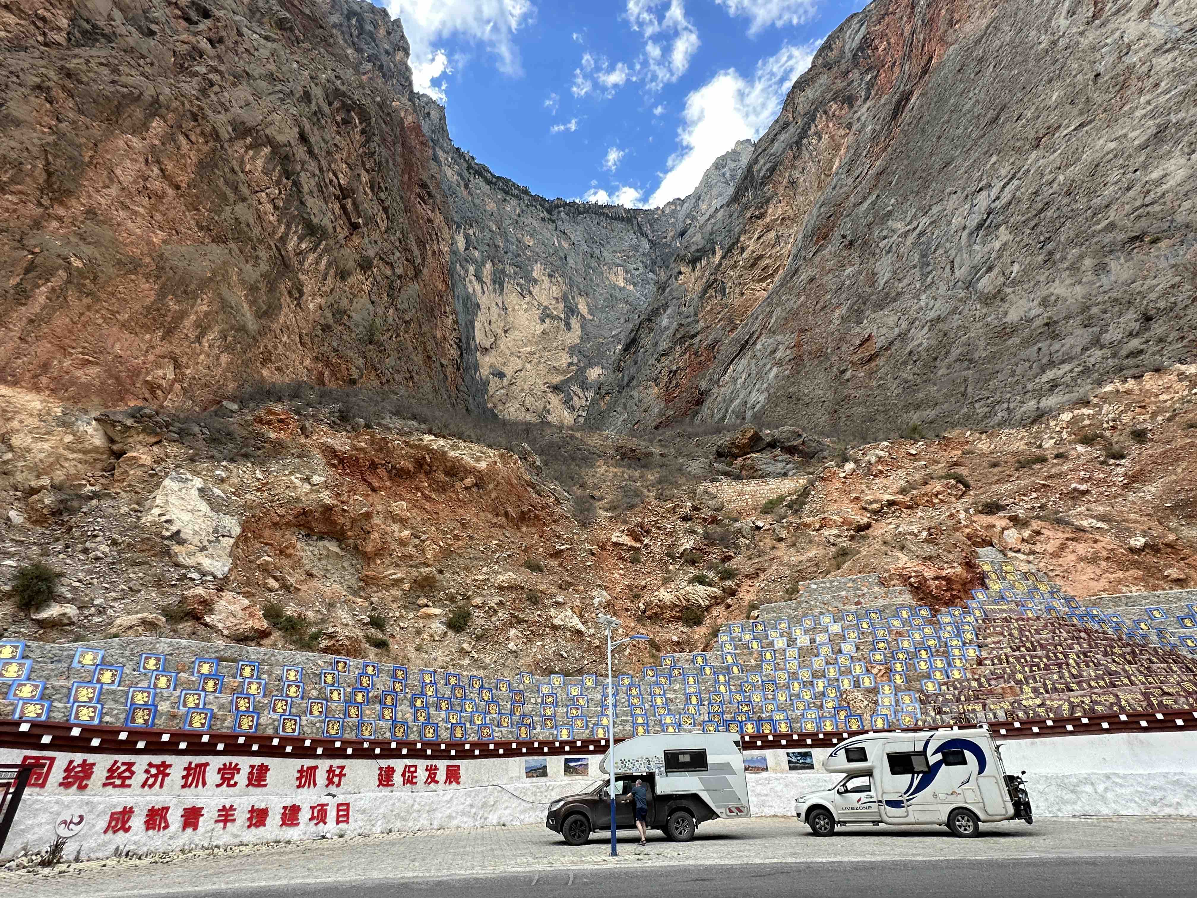 Am nächsten Tag machen wir zur täglichen Behandlung einen Stopp in Yajiang, einer kleinen Stadt, die sich eng an die sie umgebenden Berge schmiegt und für unsere großen Autos kaum ein Durchkommen ist.