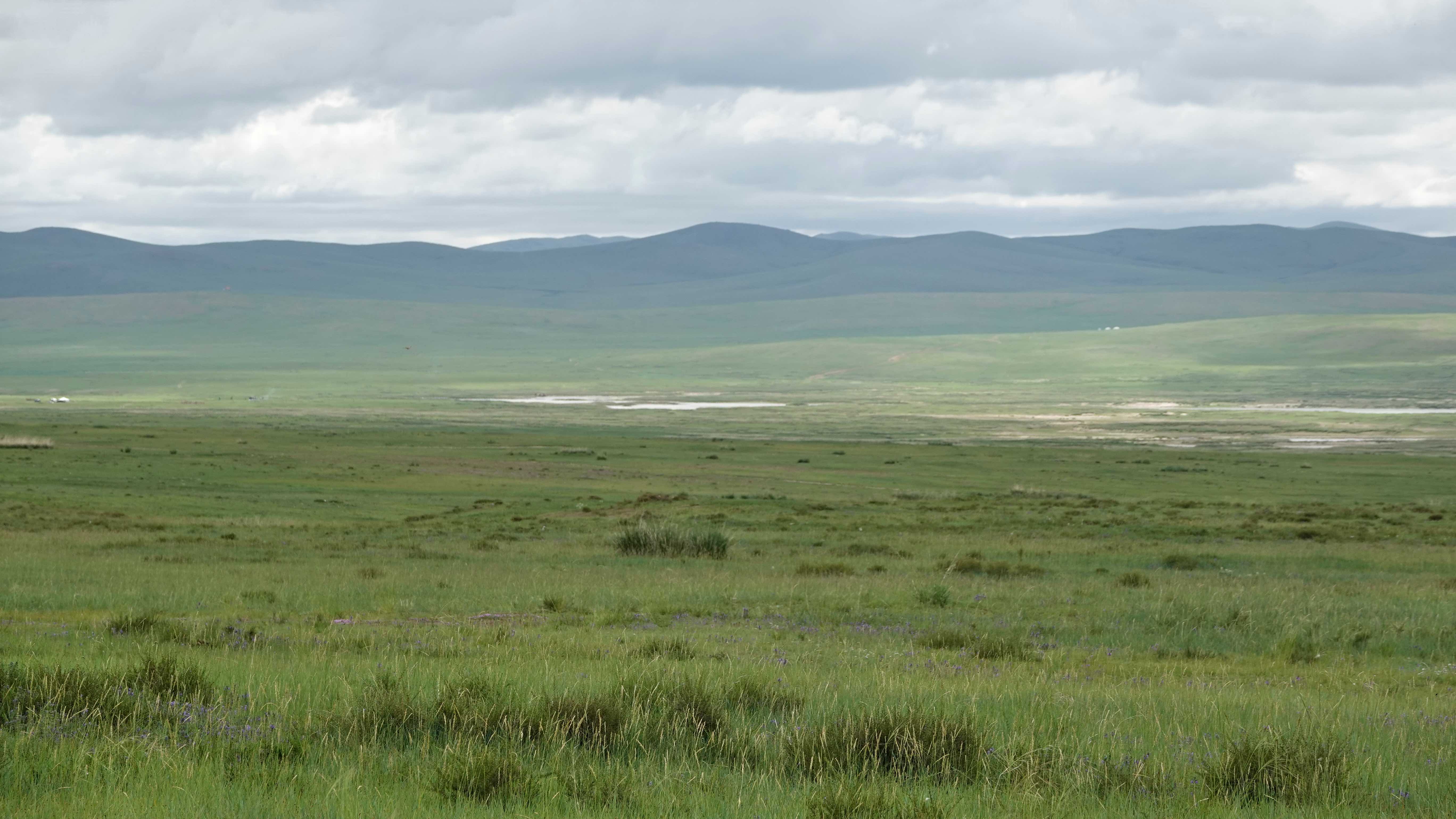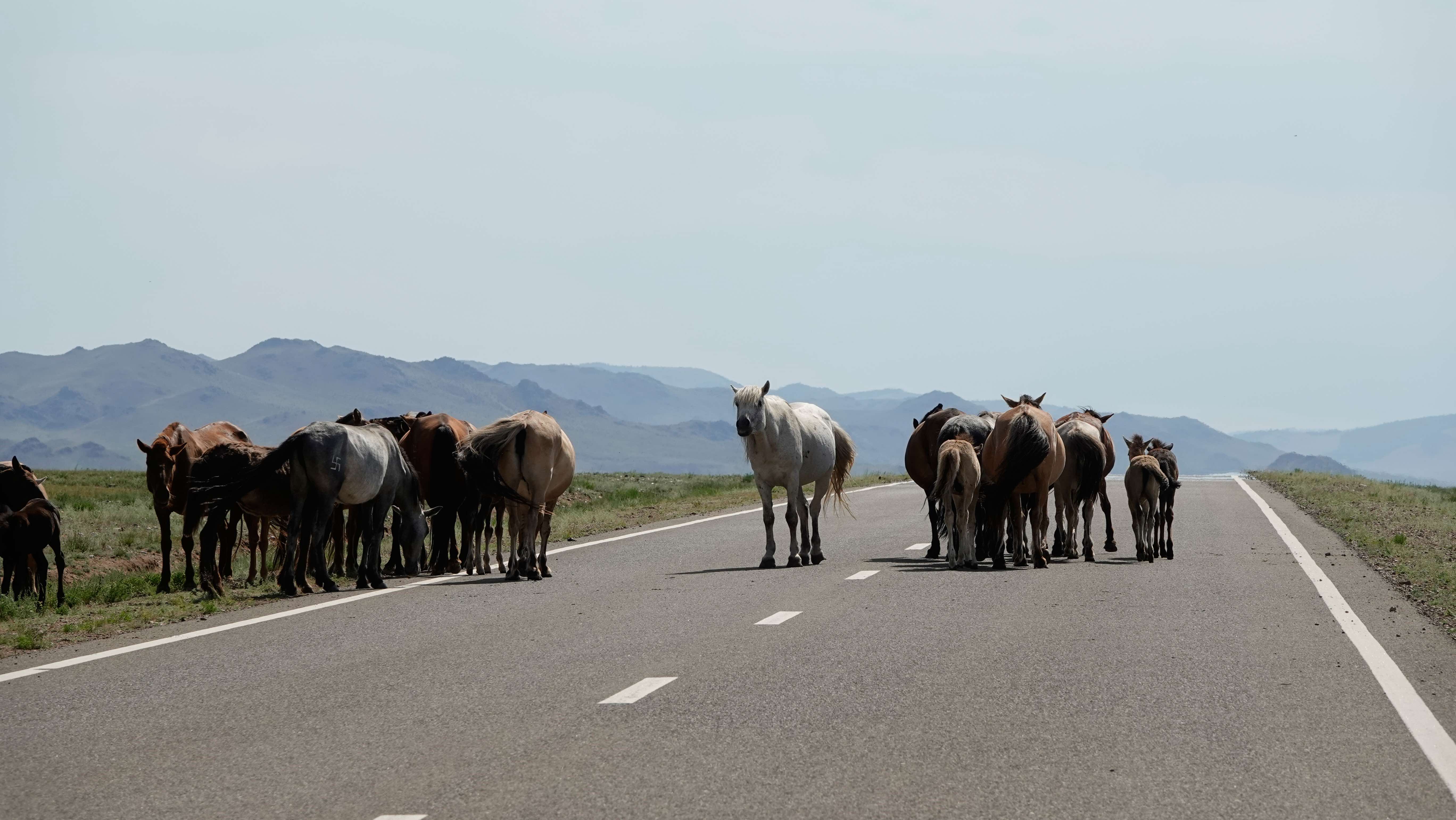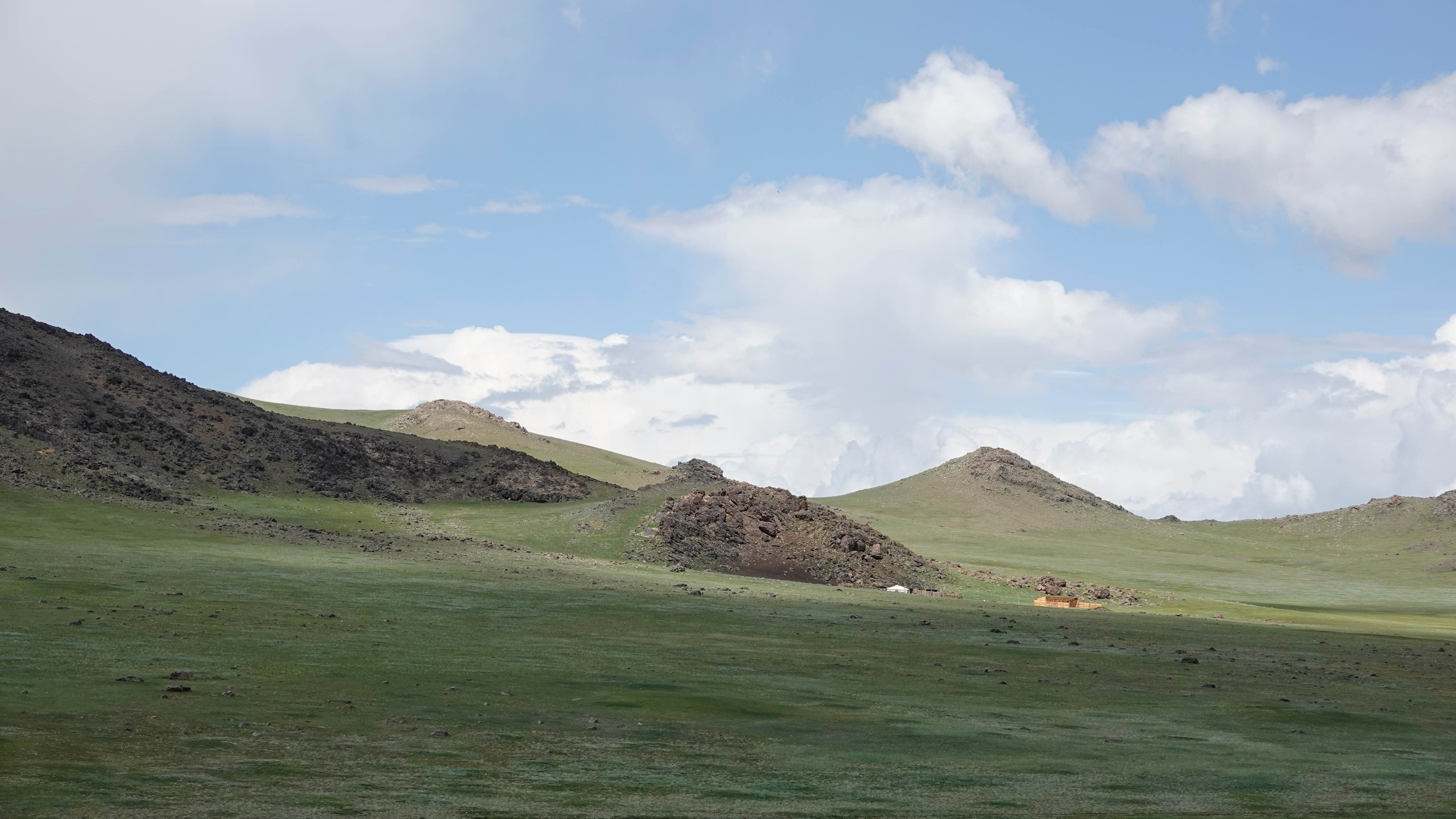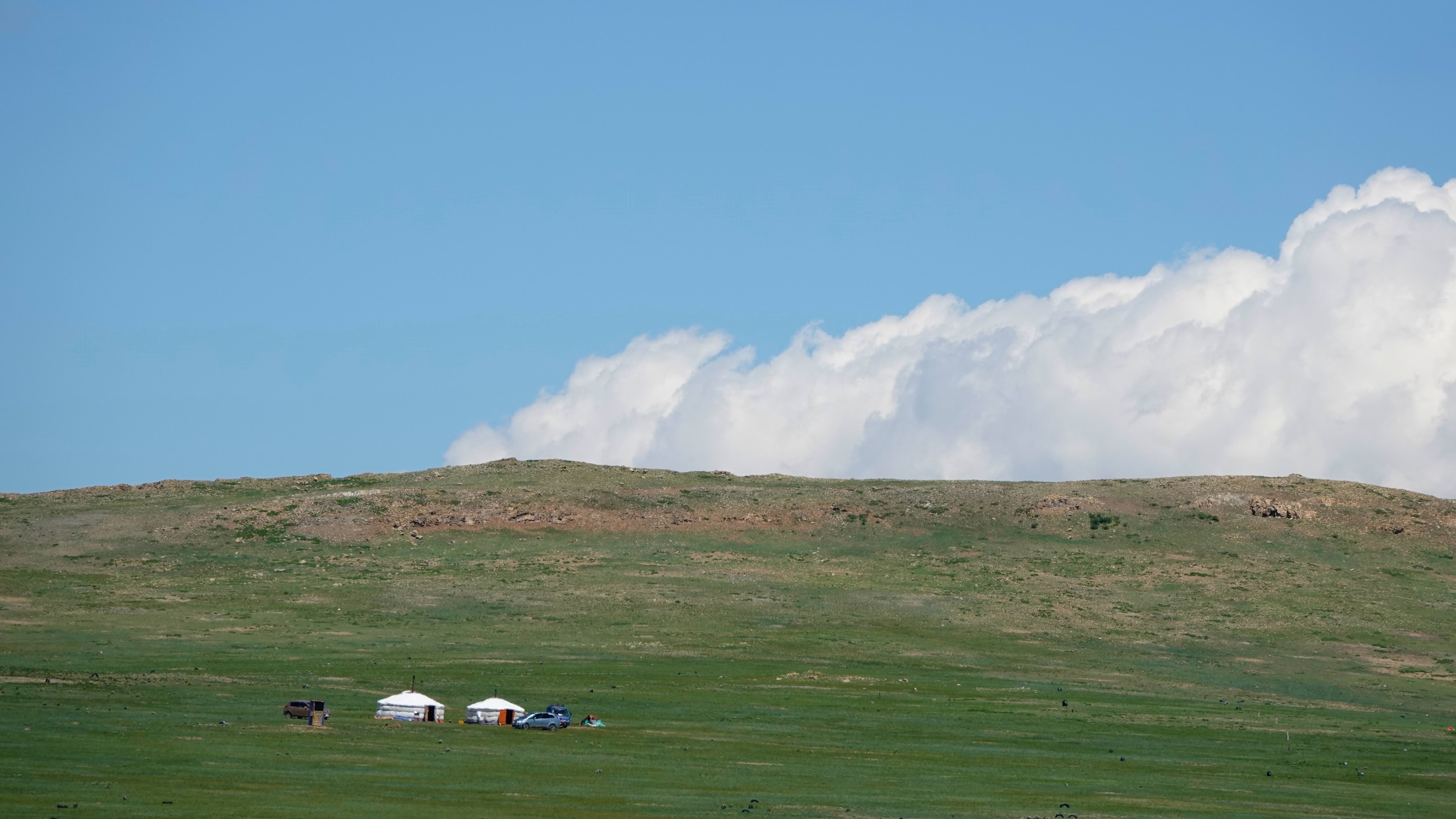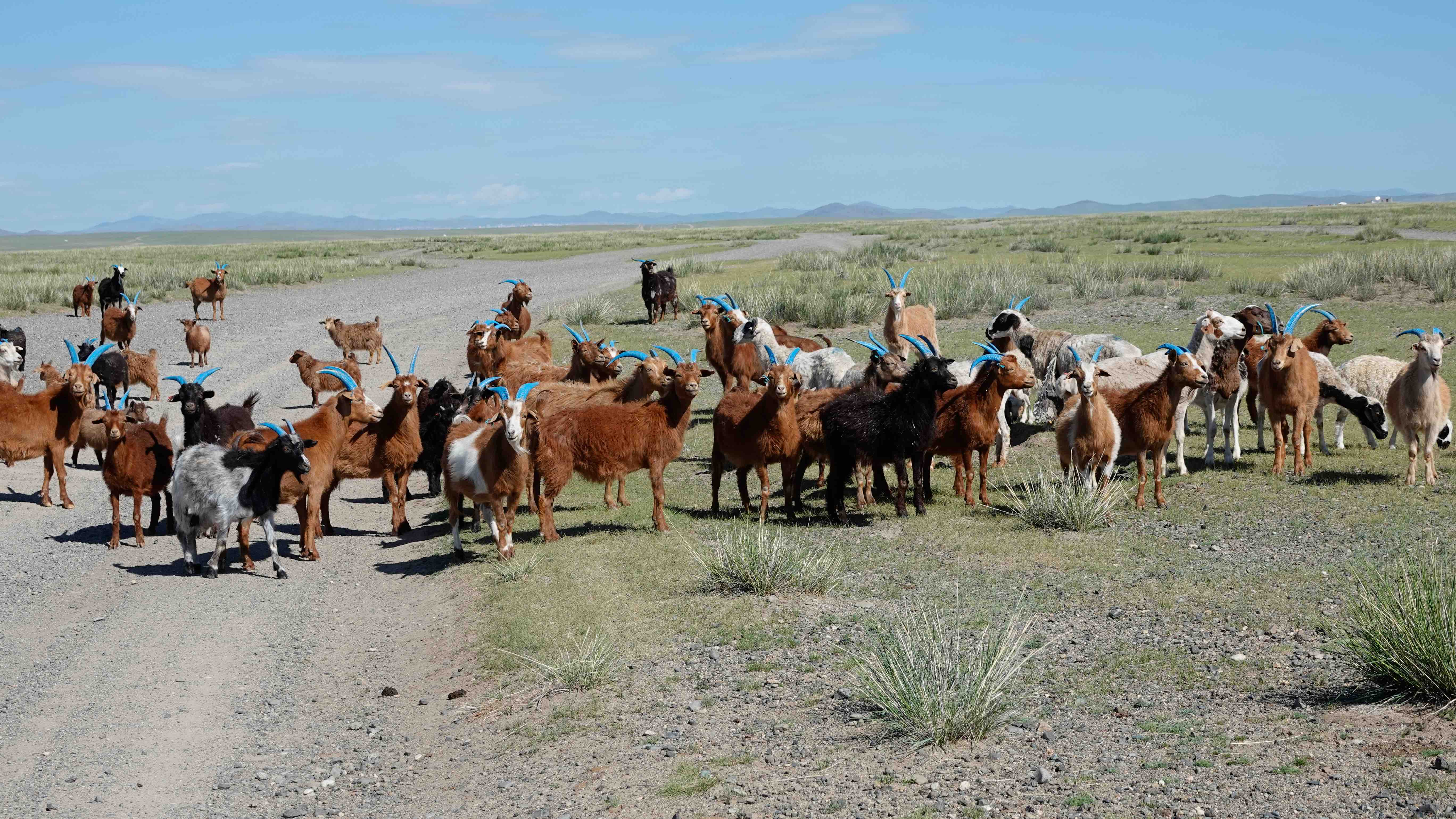 Je weiter wir nach Norden kommen, wird es hügeliger und die ersten Jurten tauchen auf, die sich mit ihrer weißen Farbe malerisch von dem Grün der Landschaft abheben. Ziegen, Schafe, Rinder und Pferde tummeln sich im Gelände und laufen leider auch manchmal unvermittelt über die Straße.
