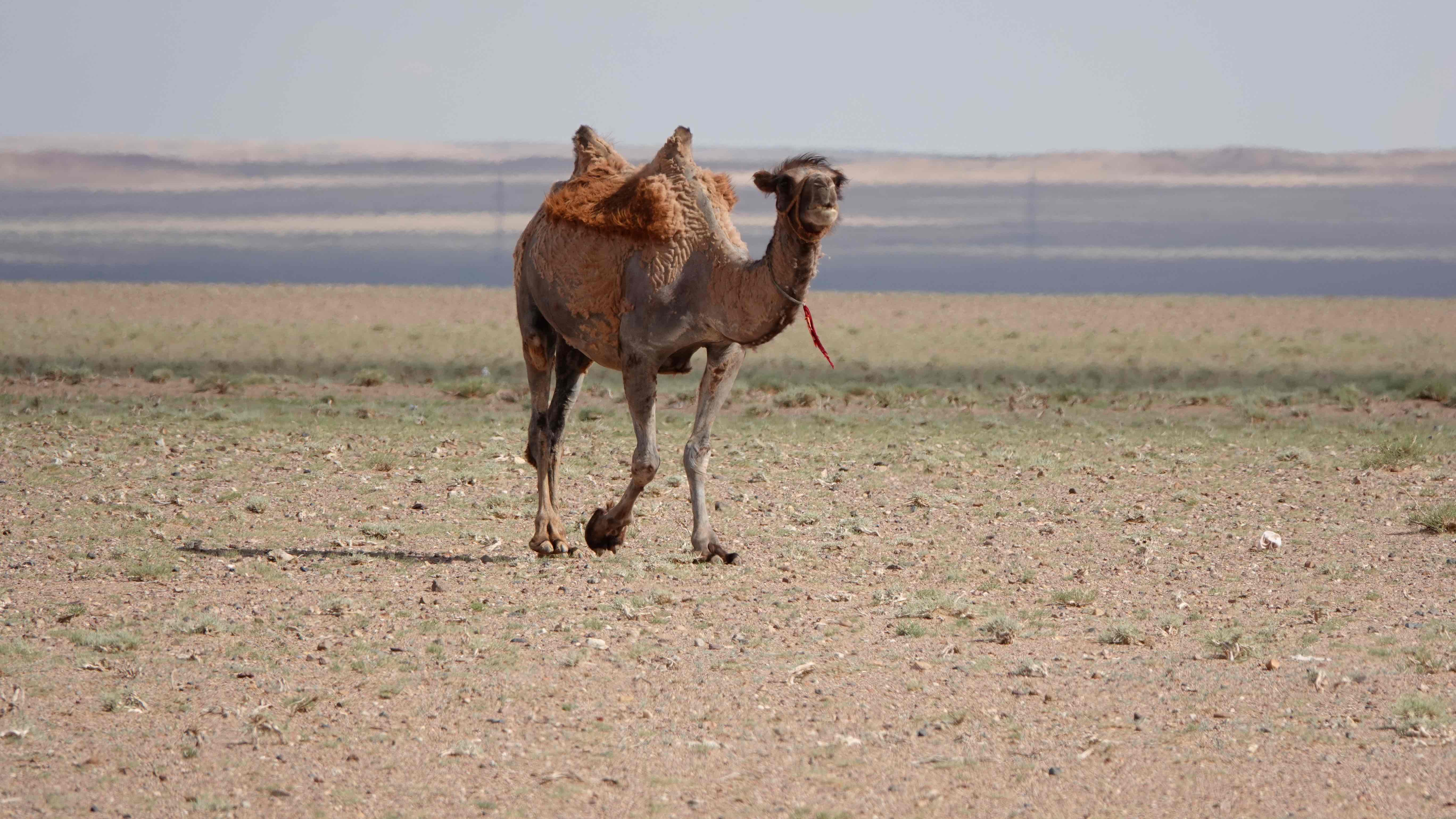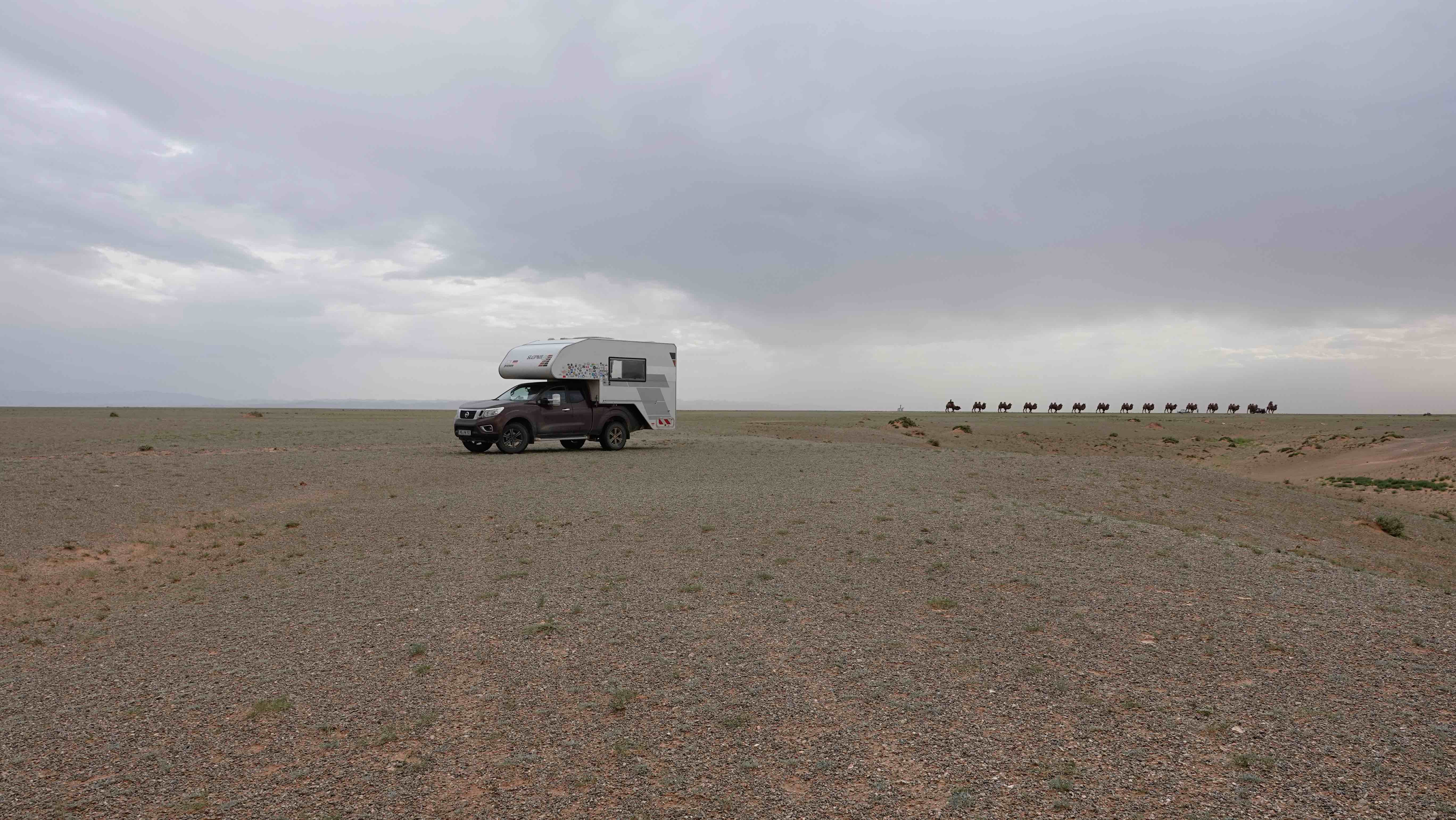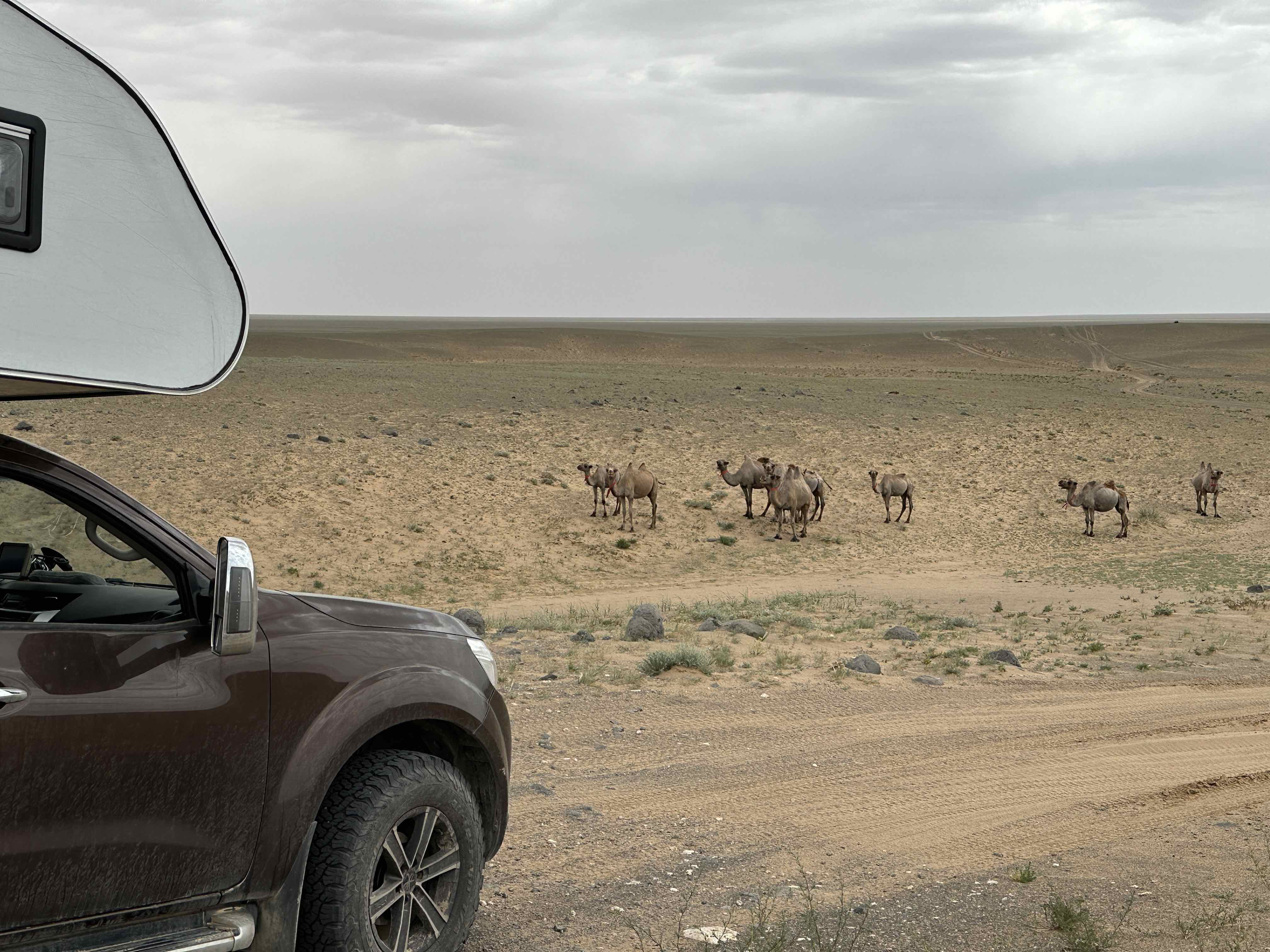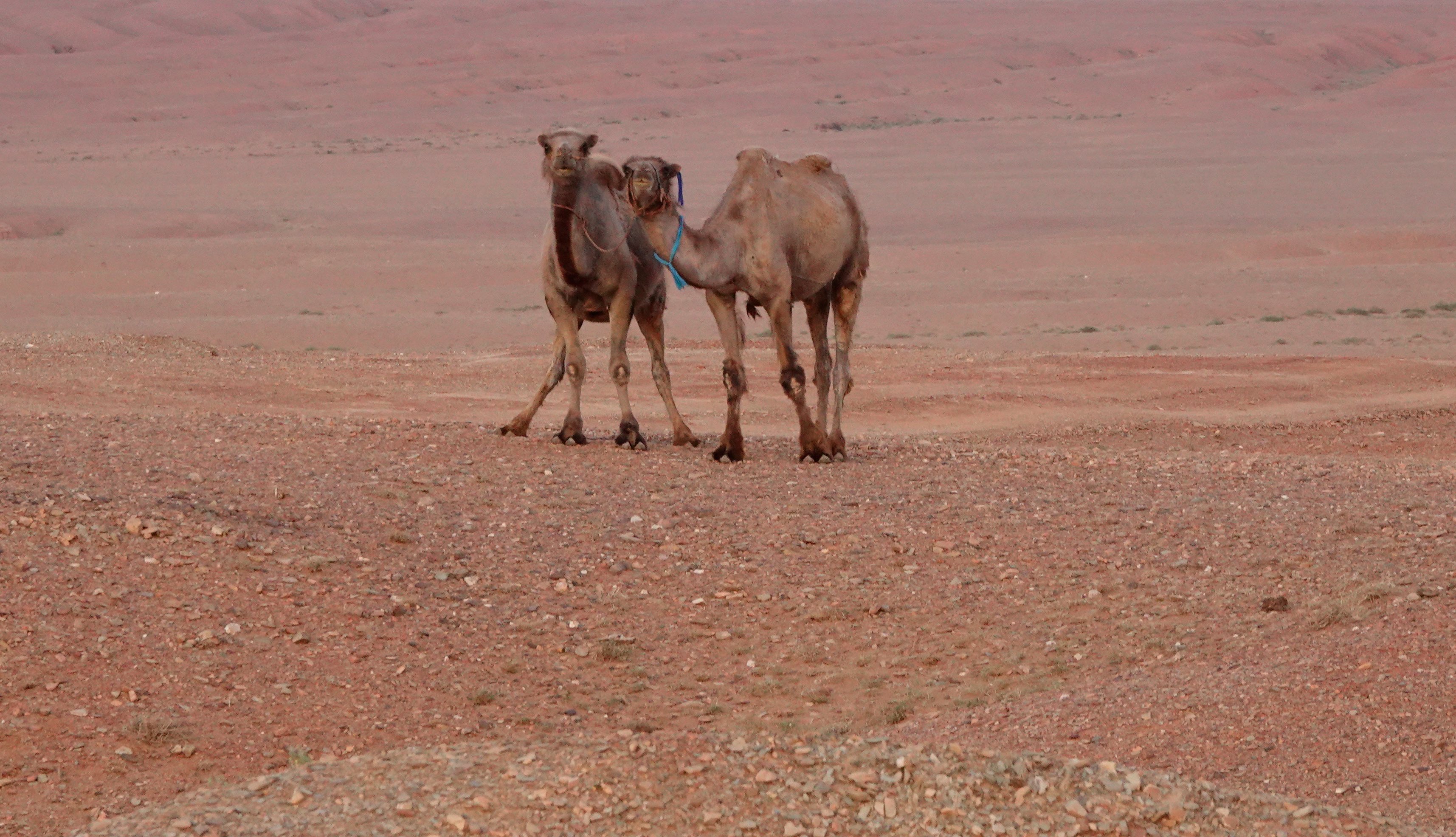 Die Gobi ist hier eine Steinwüste, manchmal bergig und immer mal trifft man auf Saxaul Bäume, Kamele streifen durch die Gegend.