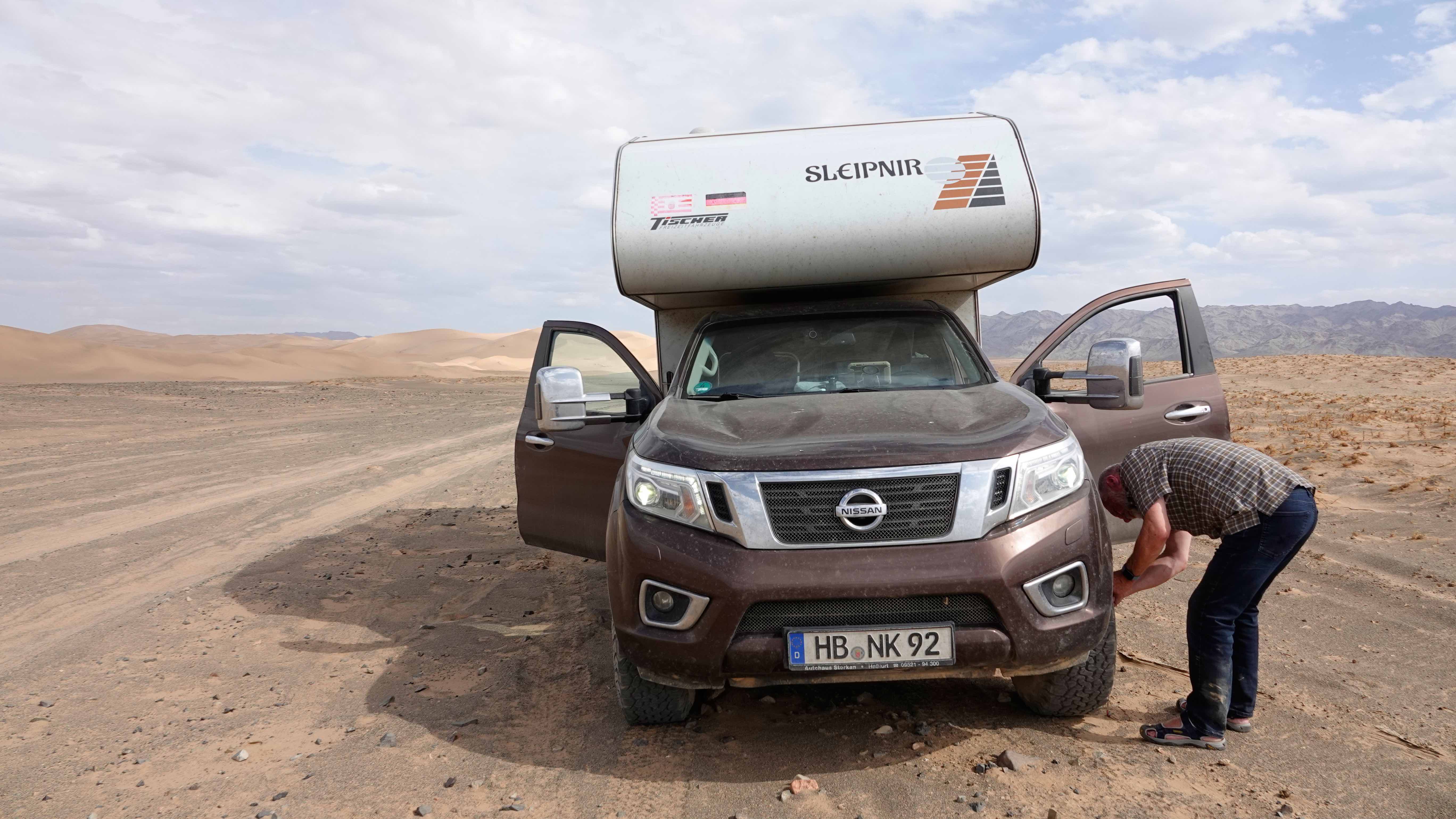 Auch am nächsten Tag geht es immer weiter auf unwegsamen Pisten durch die Wüste. Aus Versehen haben wir die Tür zur Kabine nicht fest zugemacht und bei der ersten Rast erwartet uns eine kleine Sanddüne im Auto. Es kostet einige Mühe. Und Zeit, den Sand zu entfernen, der sich überall festgesetzt hat.