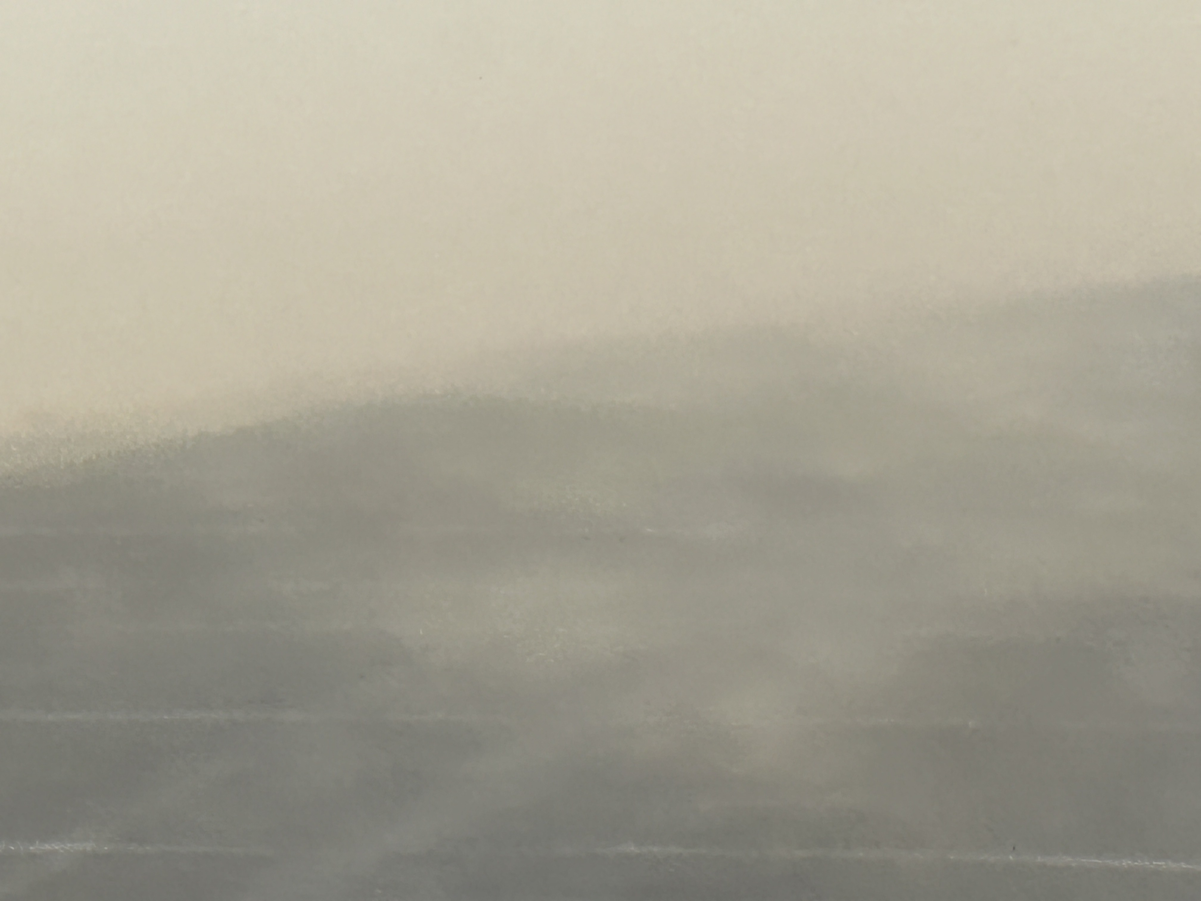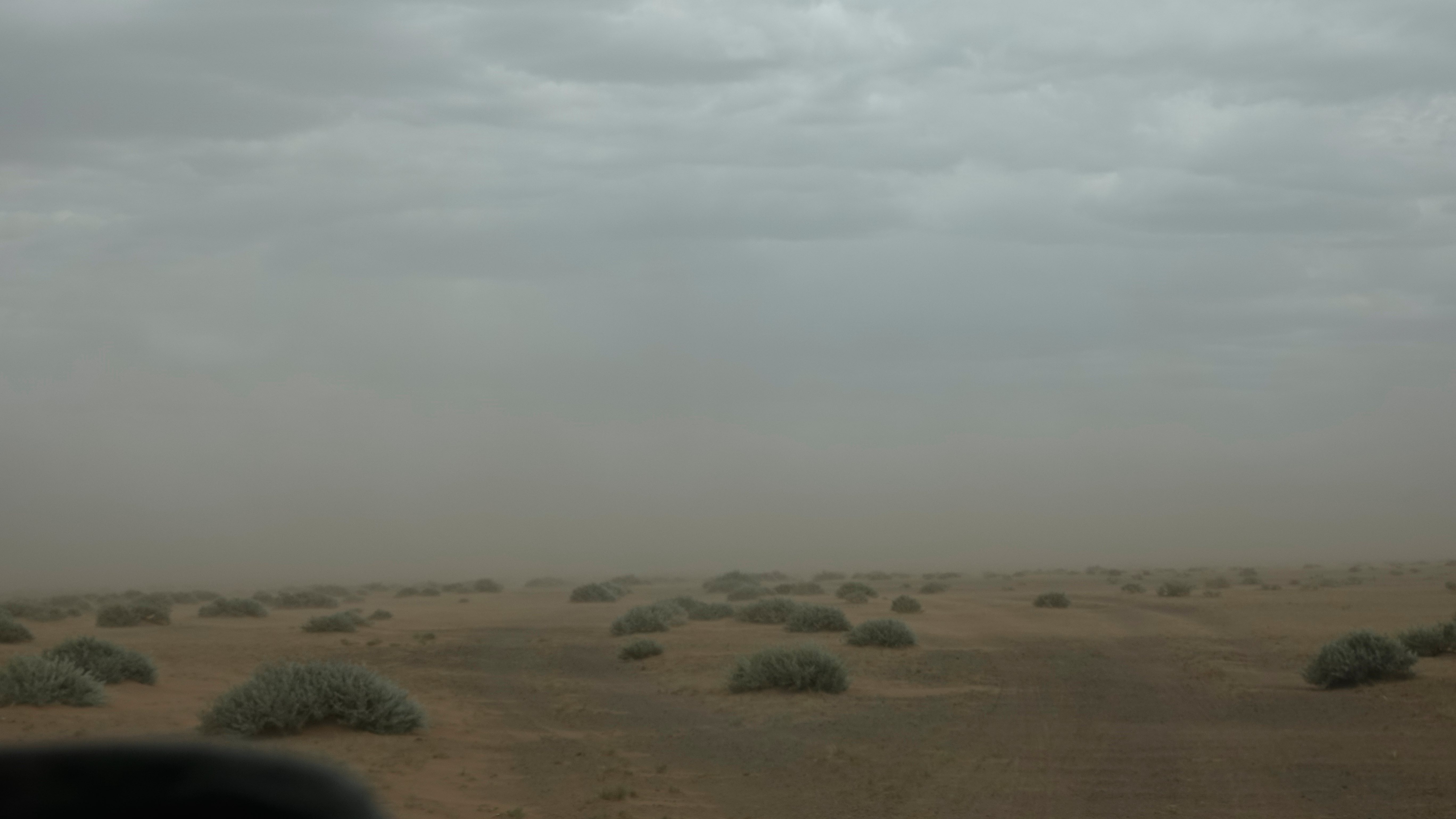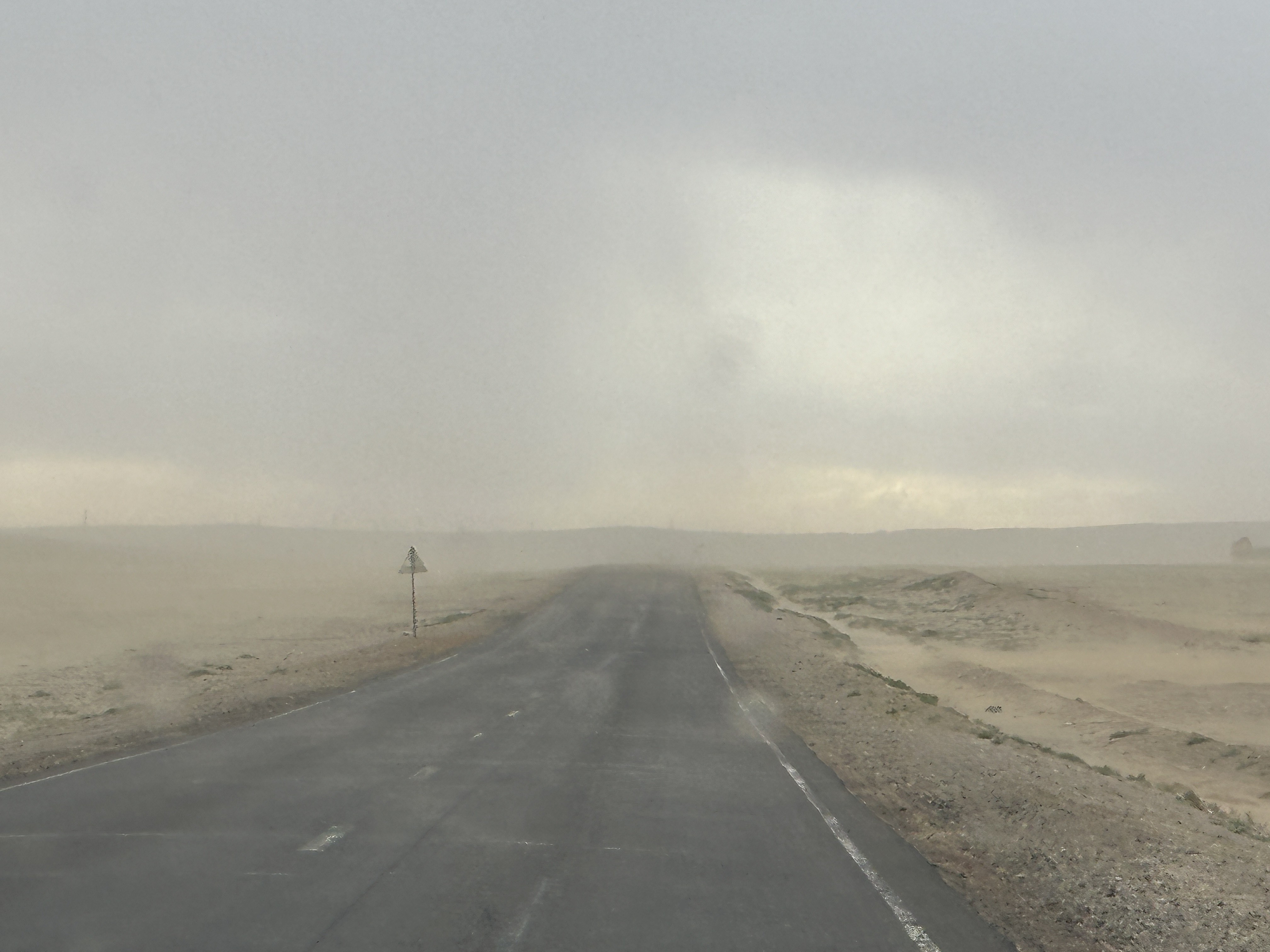 Zunächst geht es durch die Wüste und ein kleiner Sandsturm nimmt uns zeitweise die Sicht.