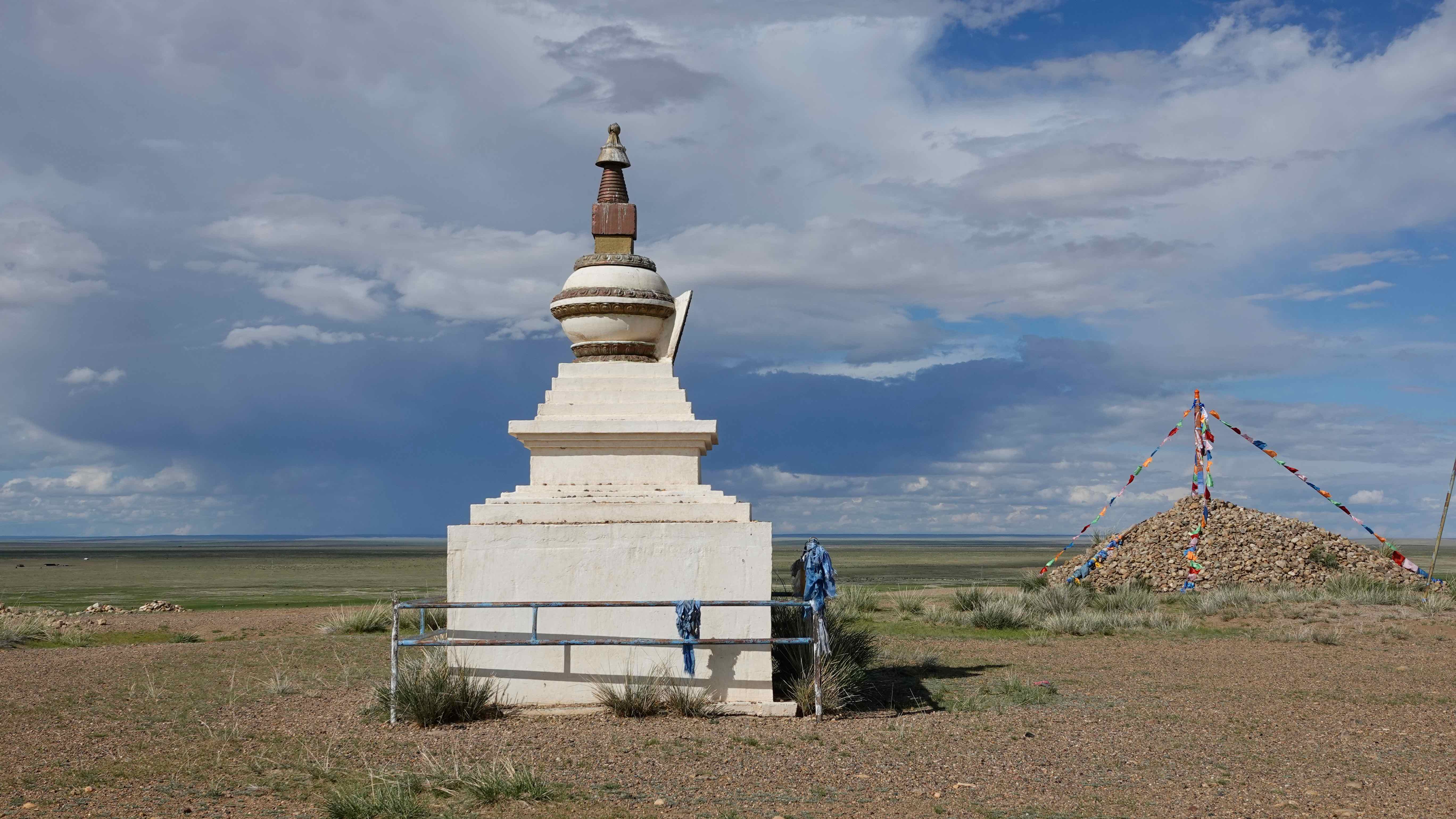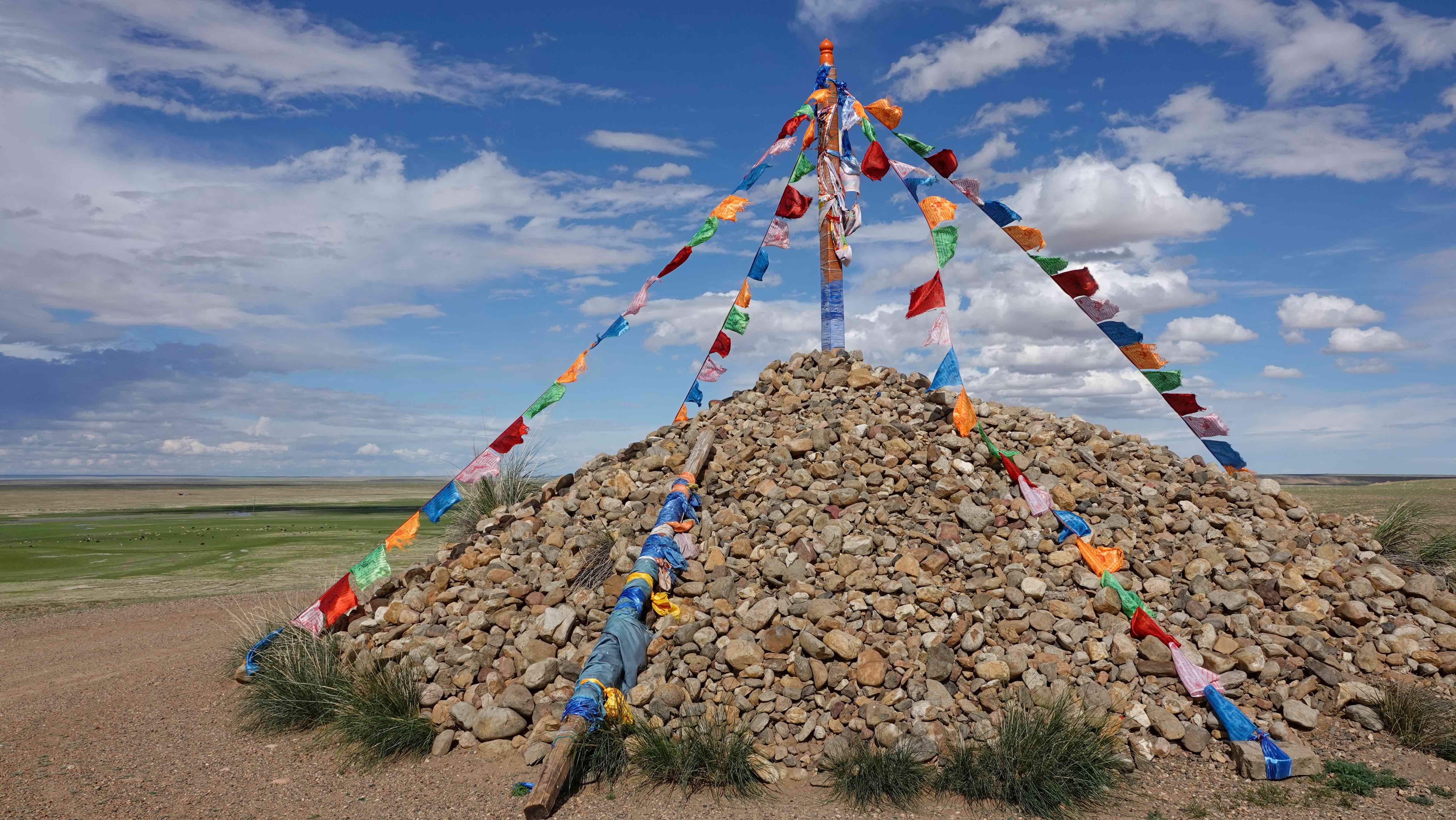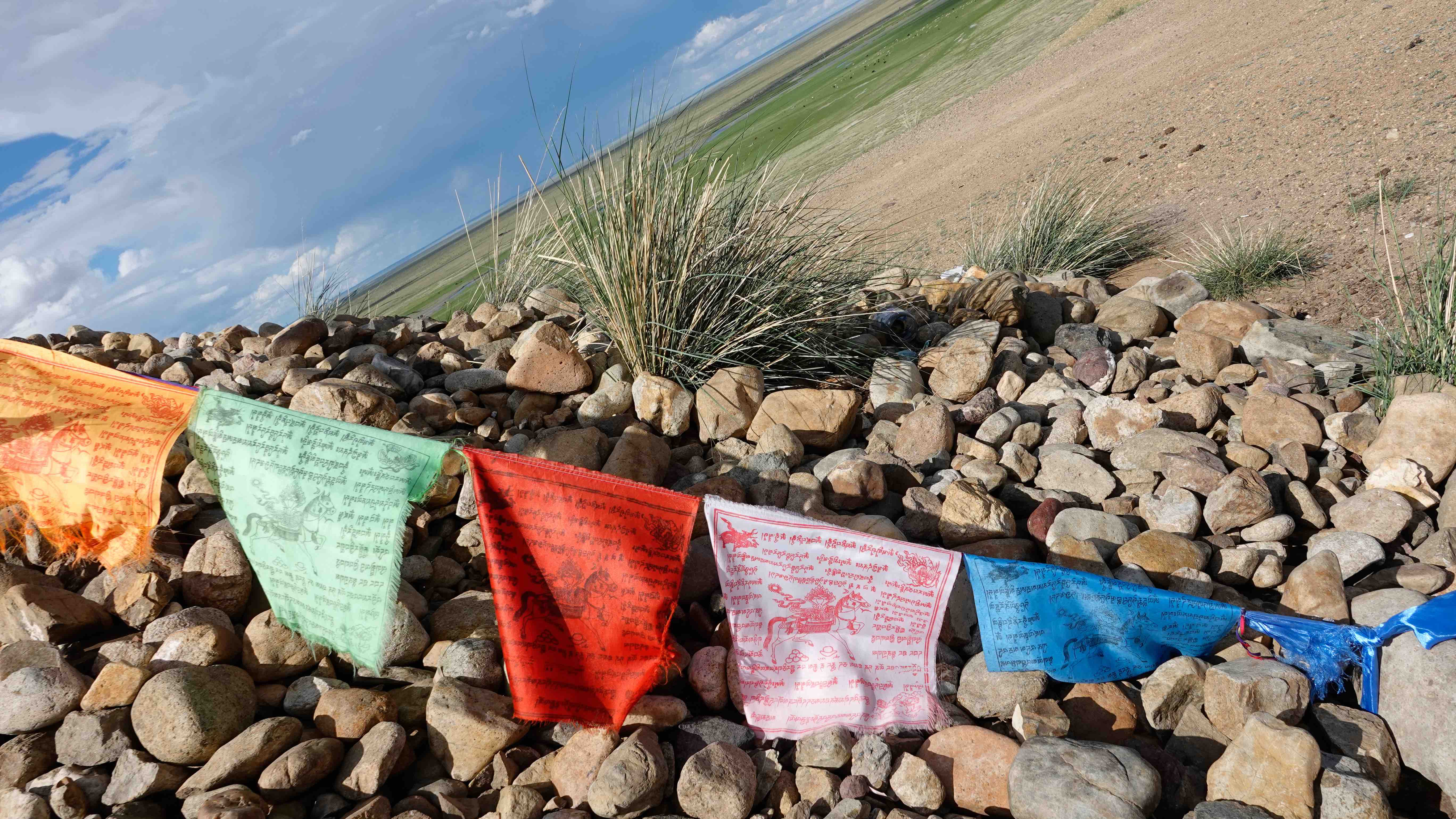 Am Wegesrand findet man immer mal wieder große Steinhaufen mit Bändern und Fahnen bestückt, sogenannte Oovos. Sie sind schamanischen Ursprungs und sollen die Reisenden beschützen, wenn man sie 3 mal umrundet. Im Vorbeifahren Hupen soll allerdings die gleiche Wirkung haben. In den Steinen sind Opfergaben deponiert: Geldscheine, Wasserflaschen, mehr oder wenige hübsche Gegenstände, Hörner etc. In der Nachbarschaft befinden sich häufig auch kleine Buddhistische Stupas mit einem Altar und den typischen Gebetsfahnen.