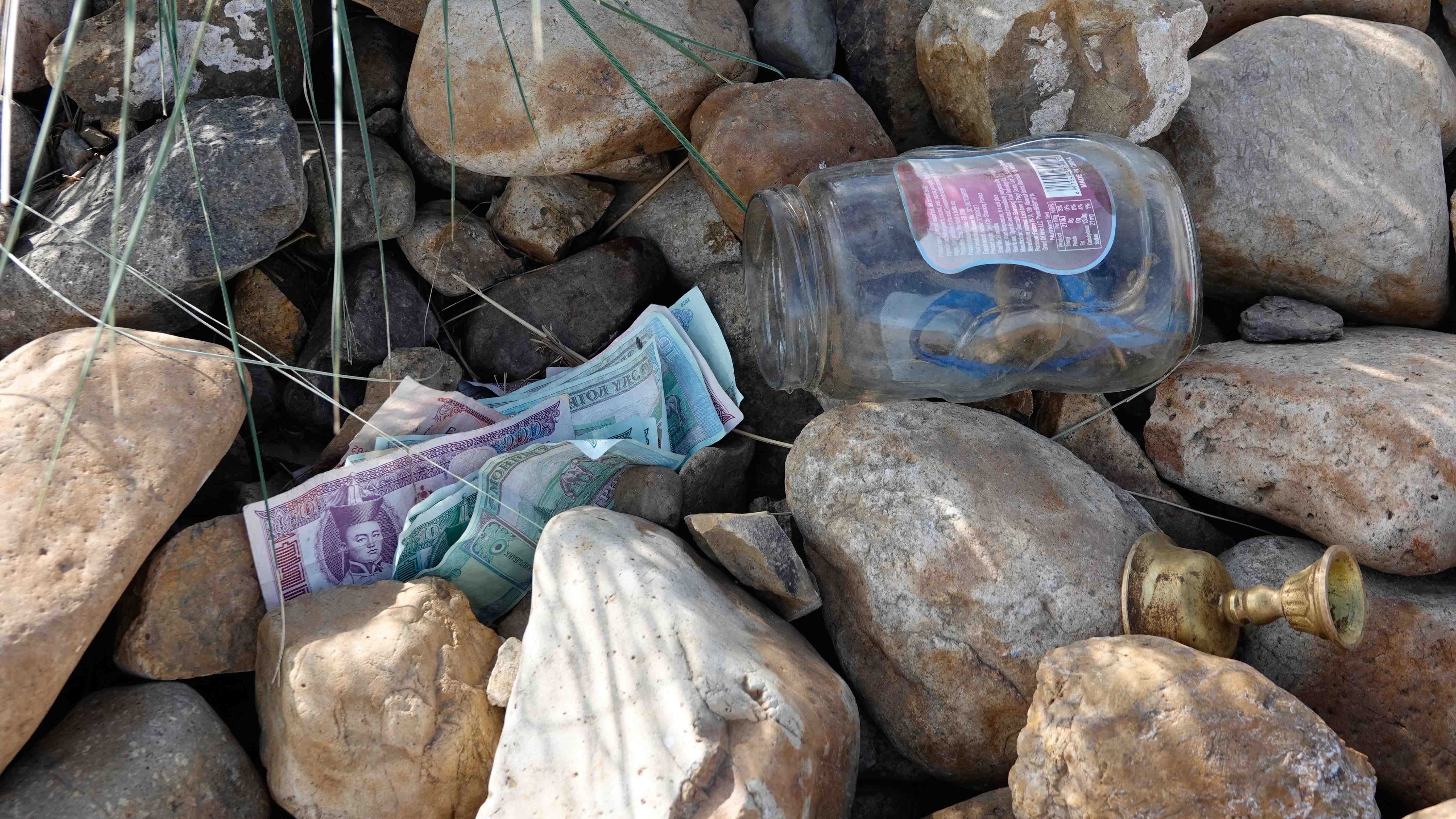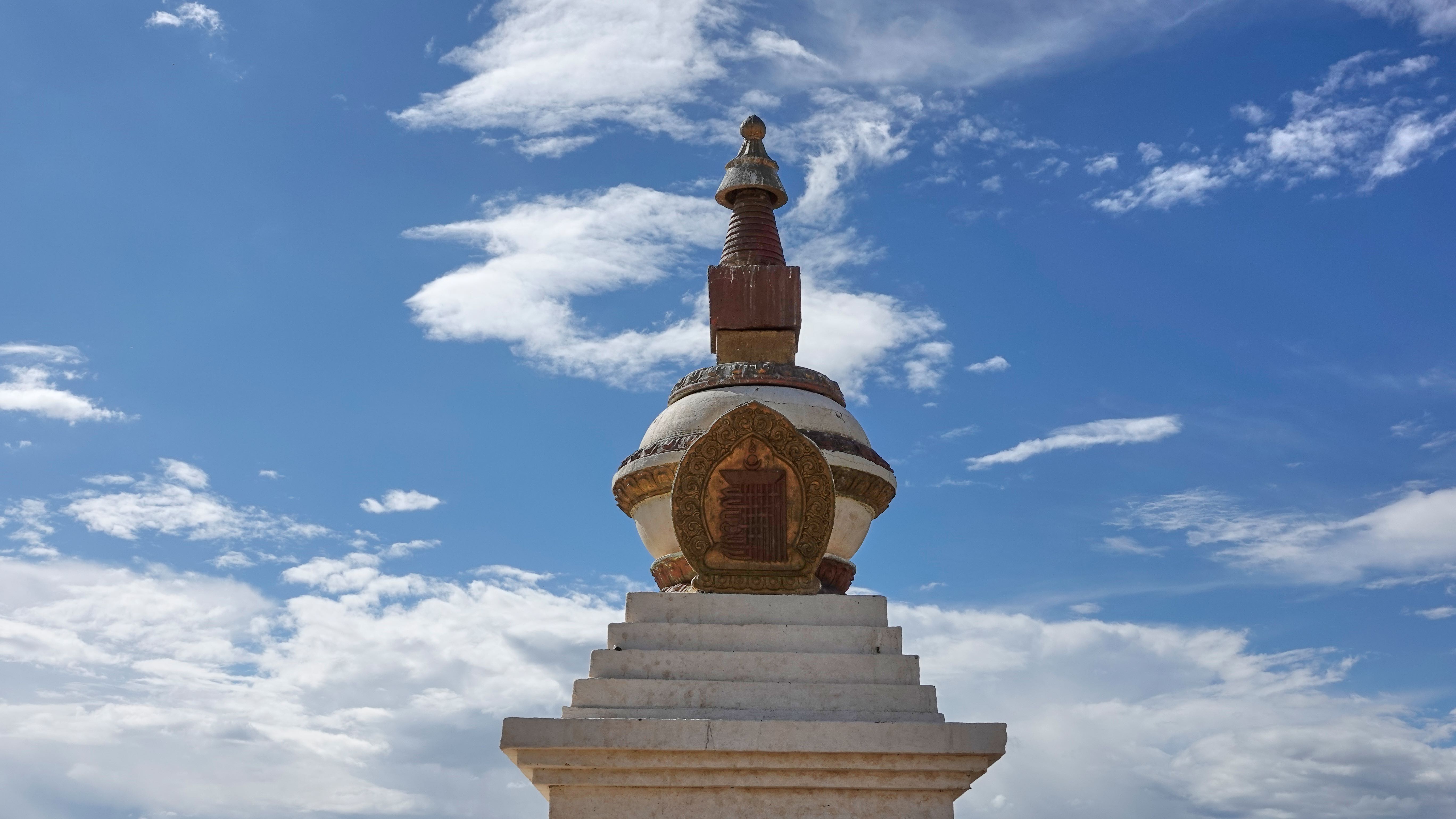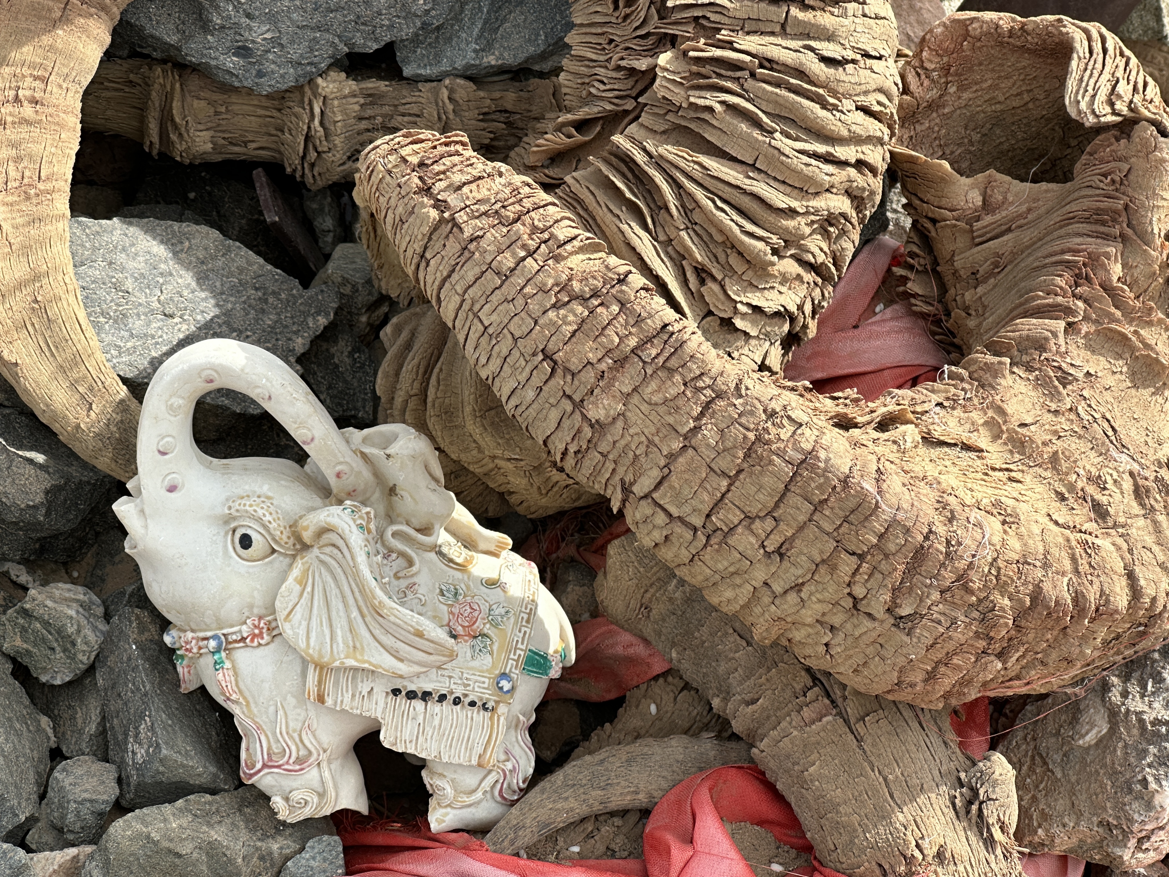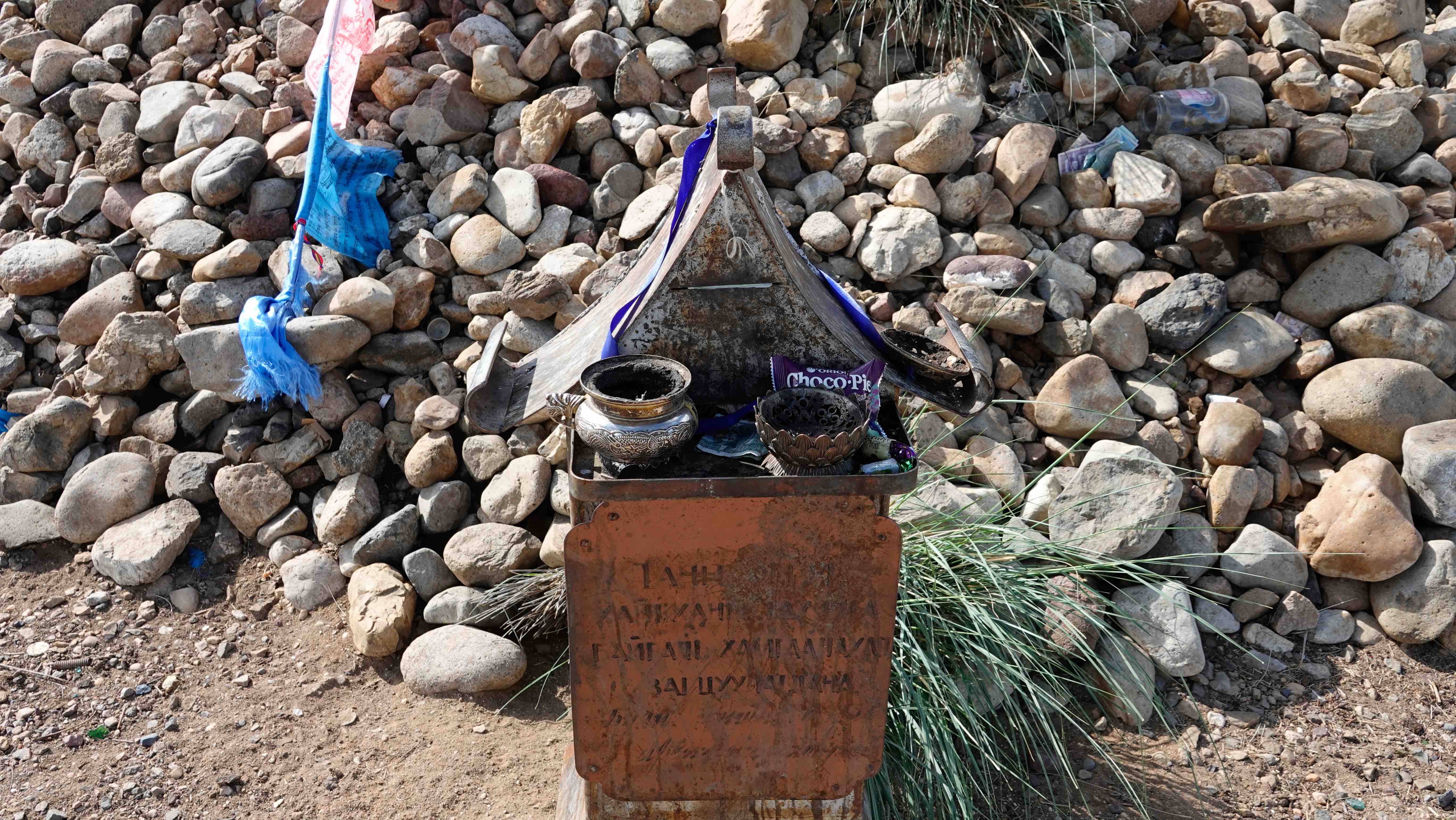 Am Wegesrand findet man immer mal wieder große Steinhaufen mit Bändern und Fahnen bestückt, sogenannte Oovos. Sie sind schamanischen Ursprungs und sollen die Reisenden beschützen, wenn man sie 3 mal umrundet. Im Vorbeifahren Hupen soll allerdings die gleiche Wirkung haben. In den Steinen sind Opfergaben deponiert: Geldscheine, Wasserflaschen, mehr oder wenige hübsche Gegenstände, Hörner etc. In der Nachbarschaft befinden sich häufig auch kleine Buddhistische Stupas mit einem Altar und den typischen Gebetsfahnen.