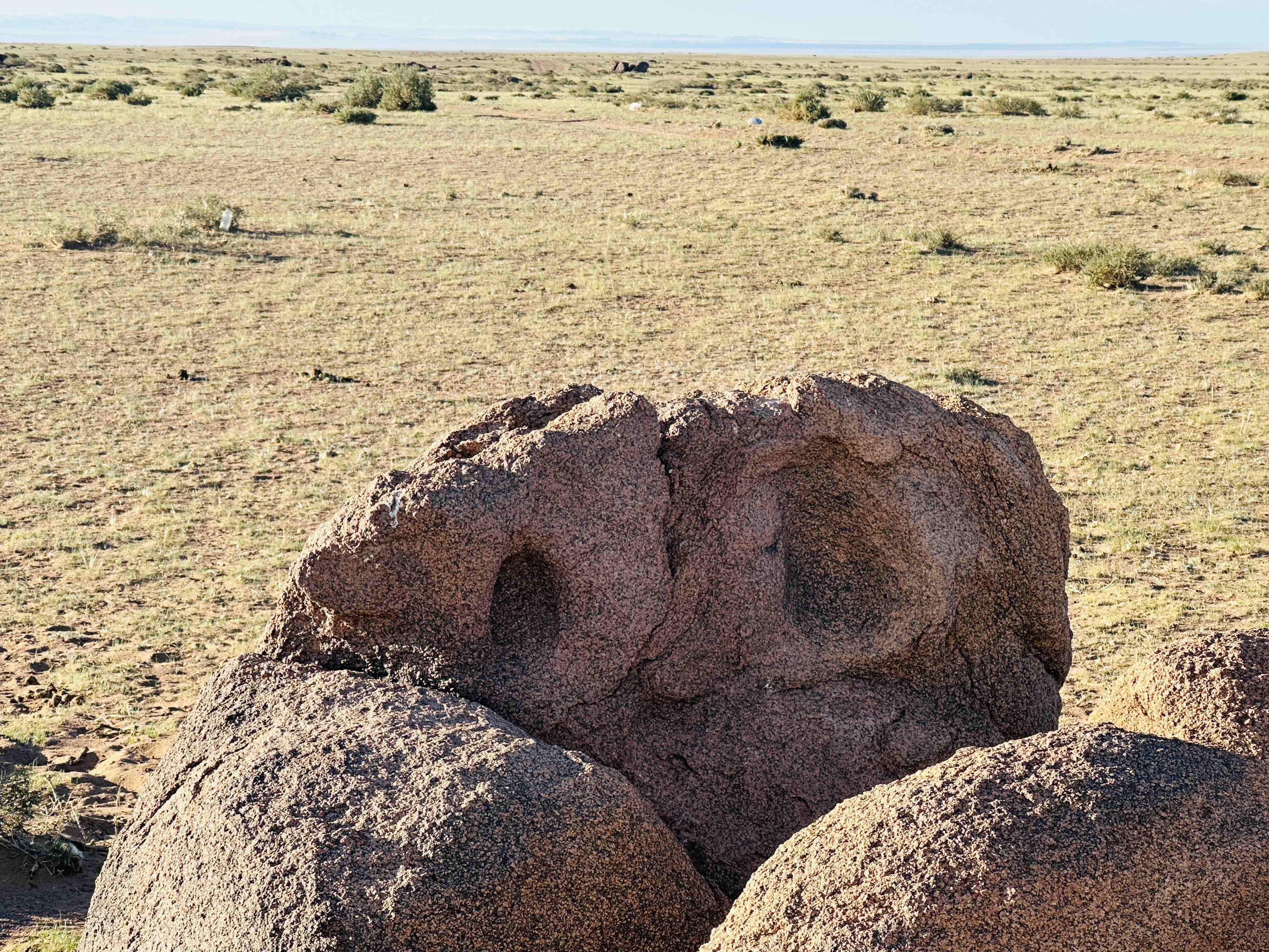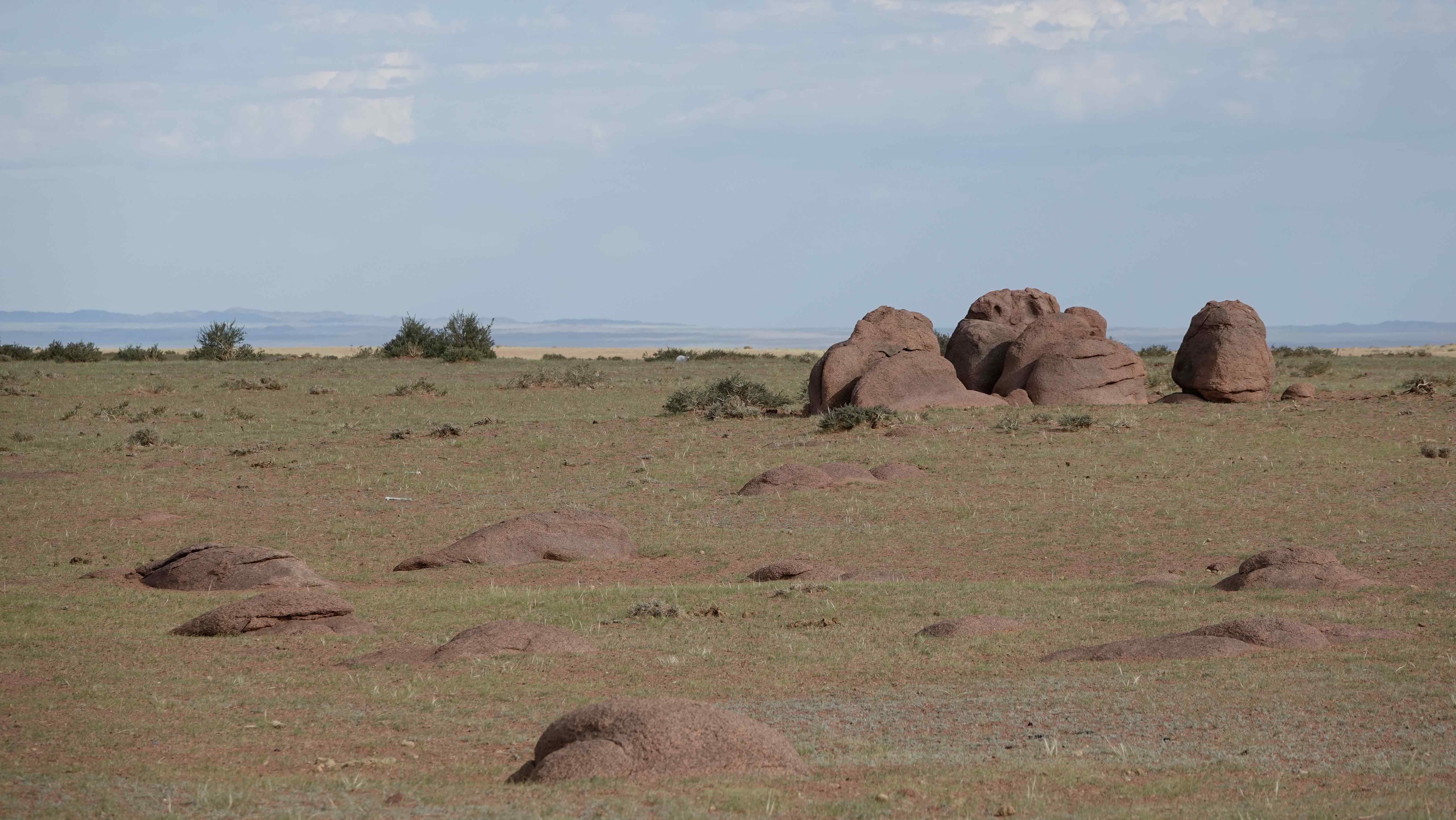 Auch der weitere Weg nach Khökhmorit ist nicht einfach, aber diesmal vor allem wegen des tiefen Sandes auf der Piste. Wir haben erst mal wieder genug vom Pistenfahren und wollen möglichst schnell auf die Hauptstraße gelangen. Luftlinie sind es höchstens 50 km – aber wir können trotz intensiver Bemühungen keinen Weg durch die Berge finden und müssen wieder zurück nach Bayan Uul, nochmal 245 km Piste! Wir nehmen eine etwas andere Route als auf der Hinfahrt, die sich als deutlich komfortabler erweist. Wir fahren durch weites, flaches Land, nur manchmal durch tiefe Senken unterbrochen, in die wir steil bergab hinuntergleiten. Wir übernachten auf einem Plateau, welches mit skurilen Felsen und kugelförmigen Steinen gespickt ist, die wie Pilze aus dem Boden sprießen.